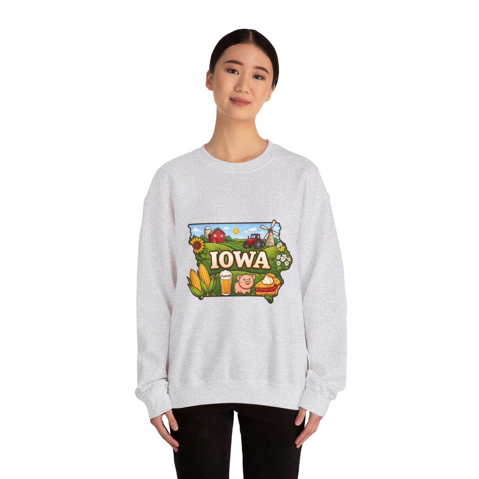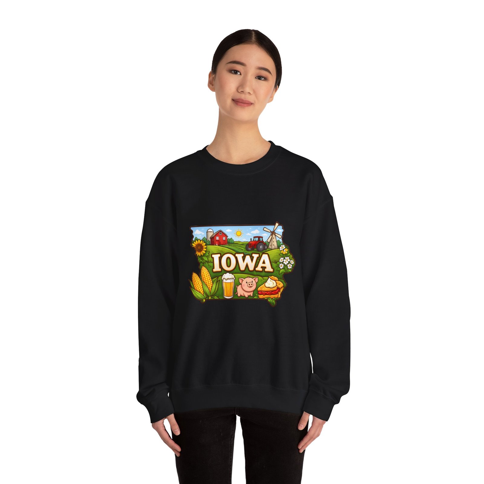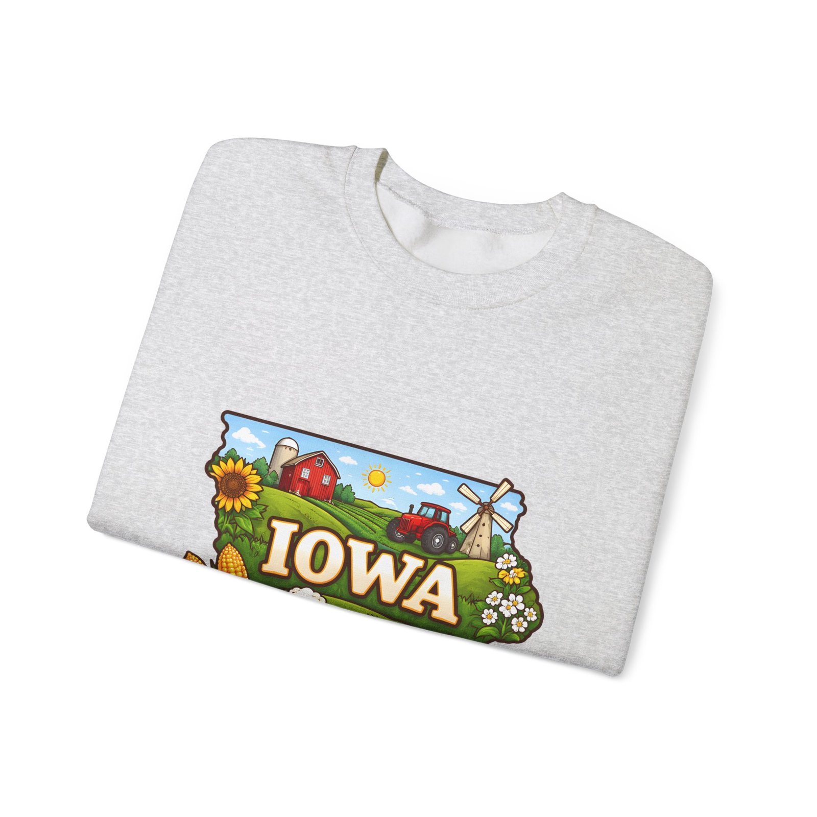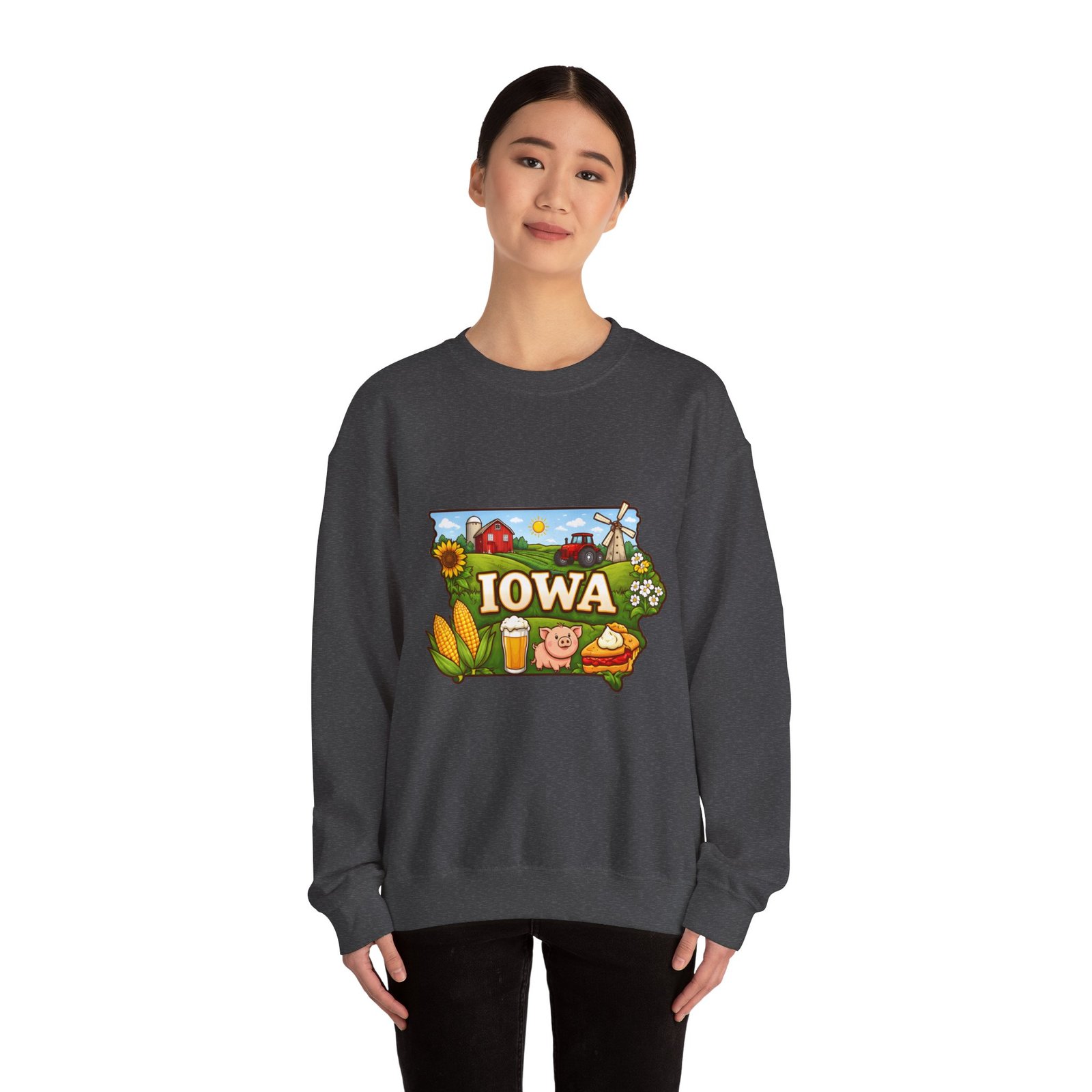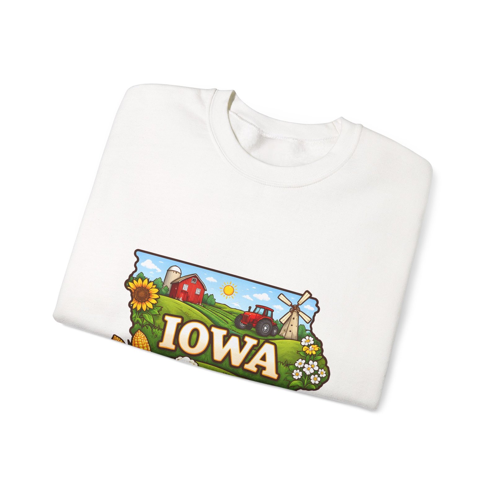 This cozy crewneck celebrates Iowa with a warm, homegrown illustration stitched into the front — barns, corn, a windmill, and friendly farm icons come together in a cheerful map-shaped design. The midweight 50/50 cotton-poly blend feels soft against the skin while the ribbed collar and double-needle stitching keep the silhouette neat wash after wash. Wear it on cool mornings watching the sunrise over the fields, at local fairs, or while showing state pride on casual days out. The embroidered options and printed wrist details add a handcrafted touch that reads like a quiet nod to small-town life and honest, agrarian roots.
