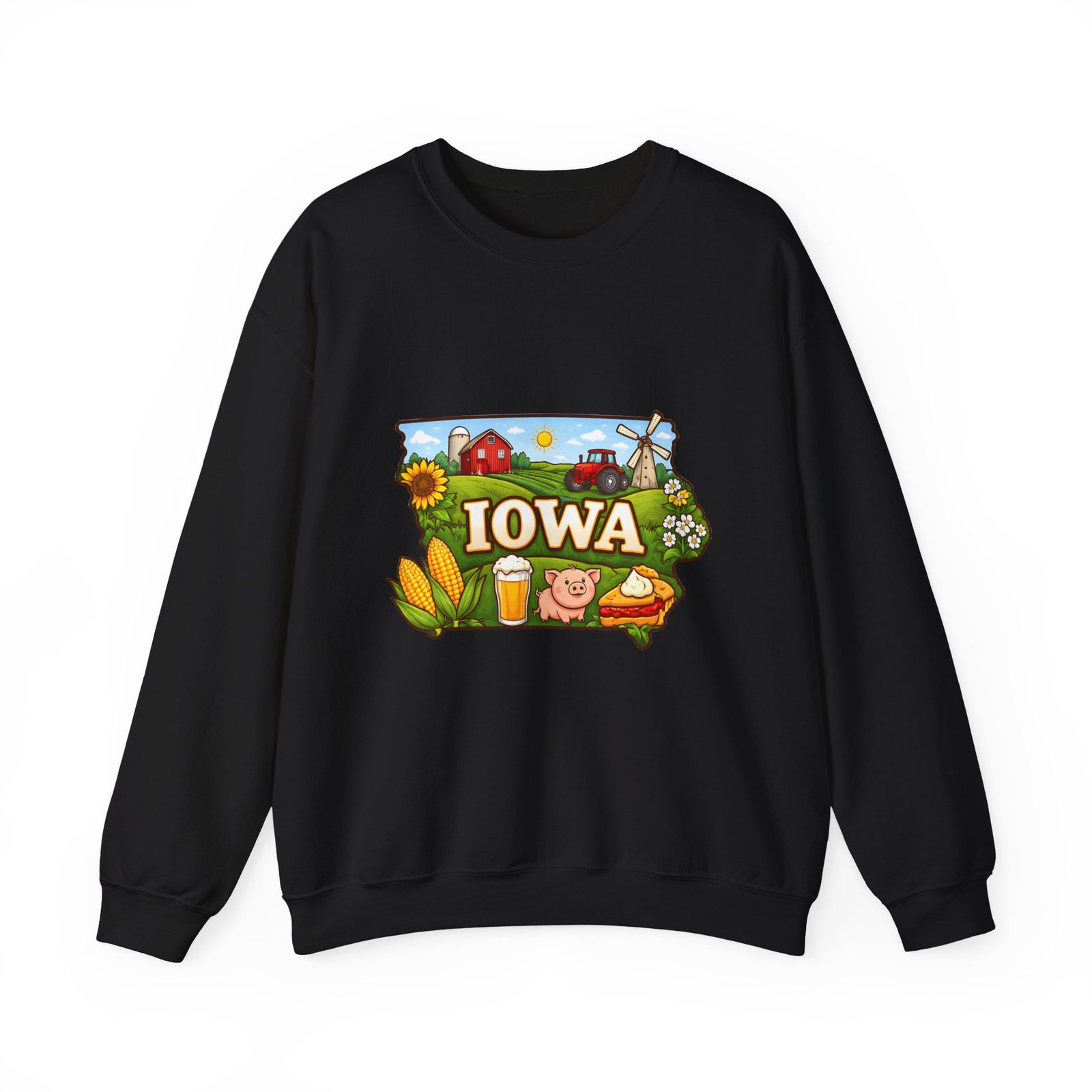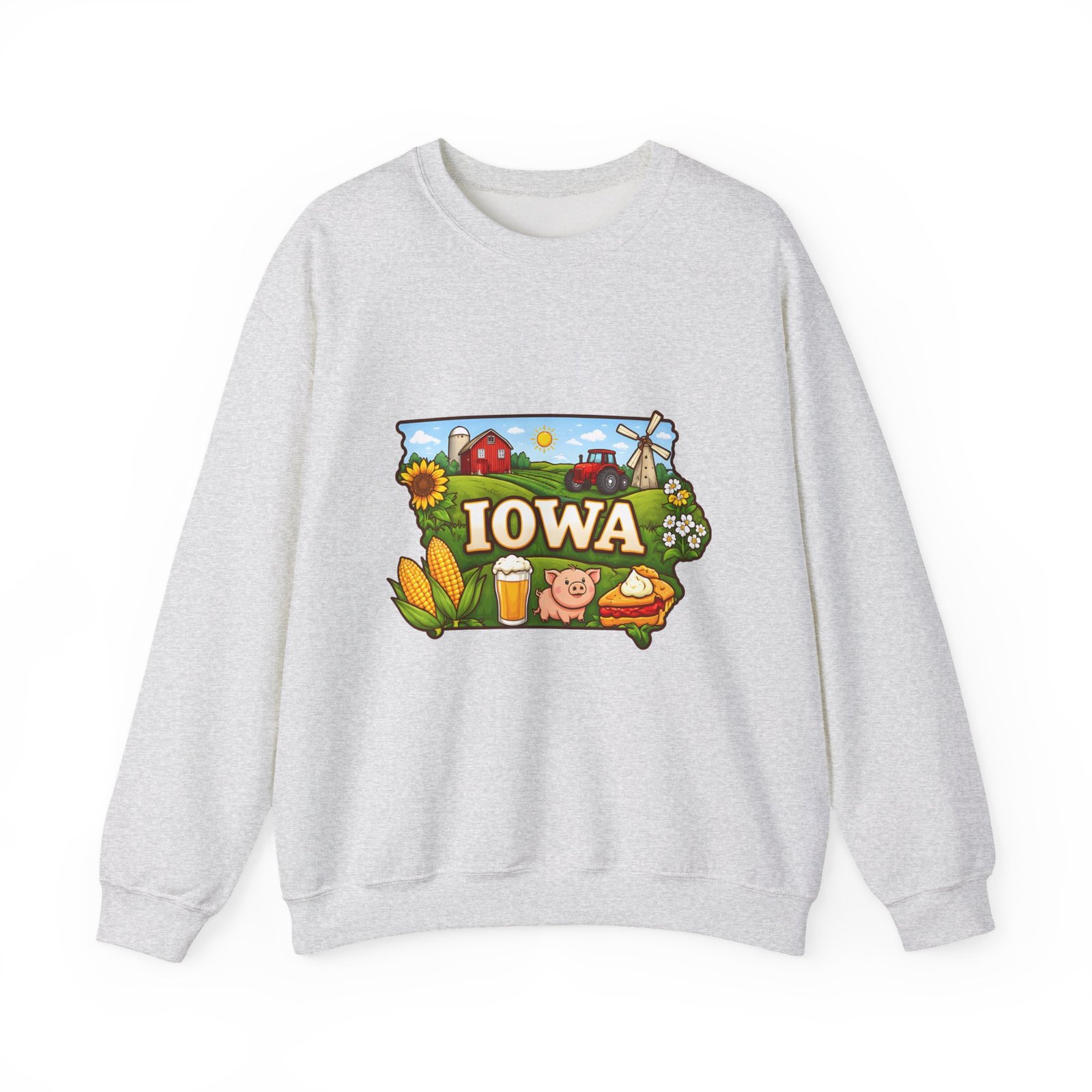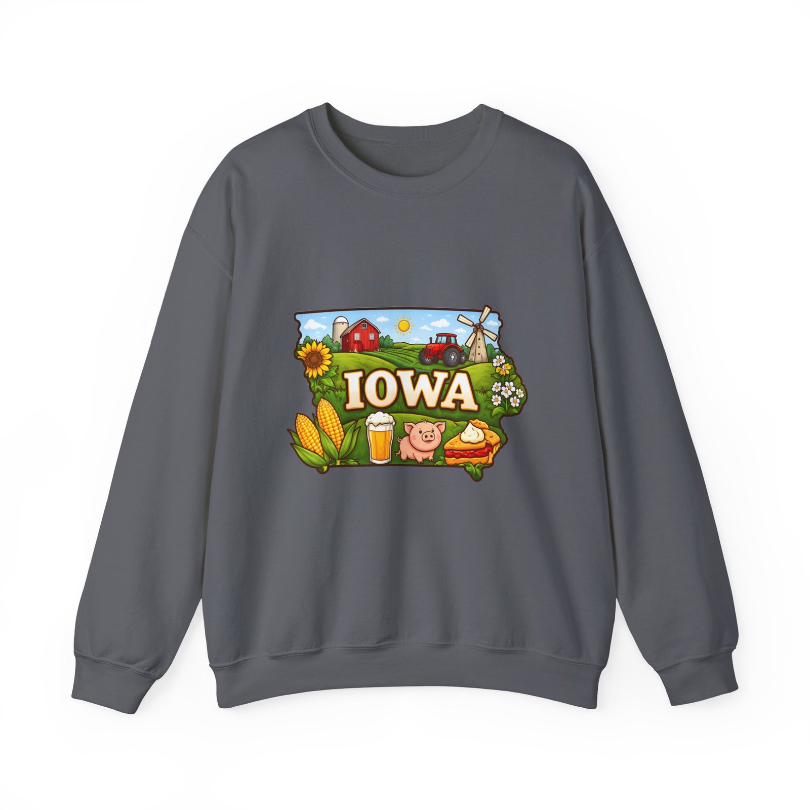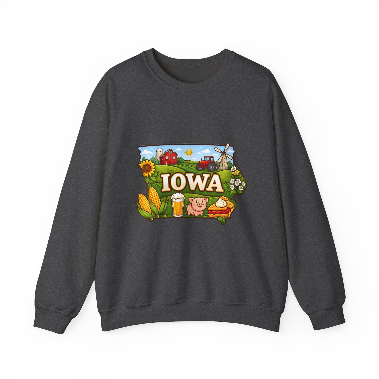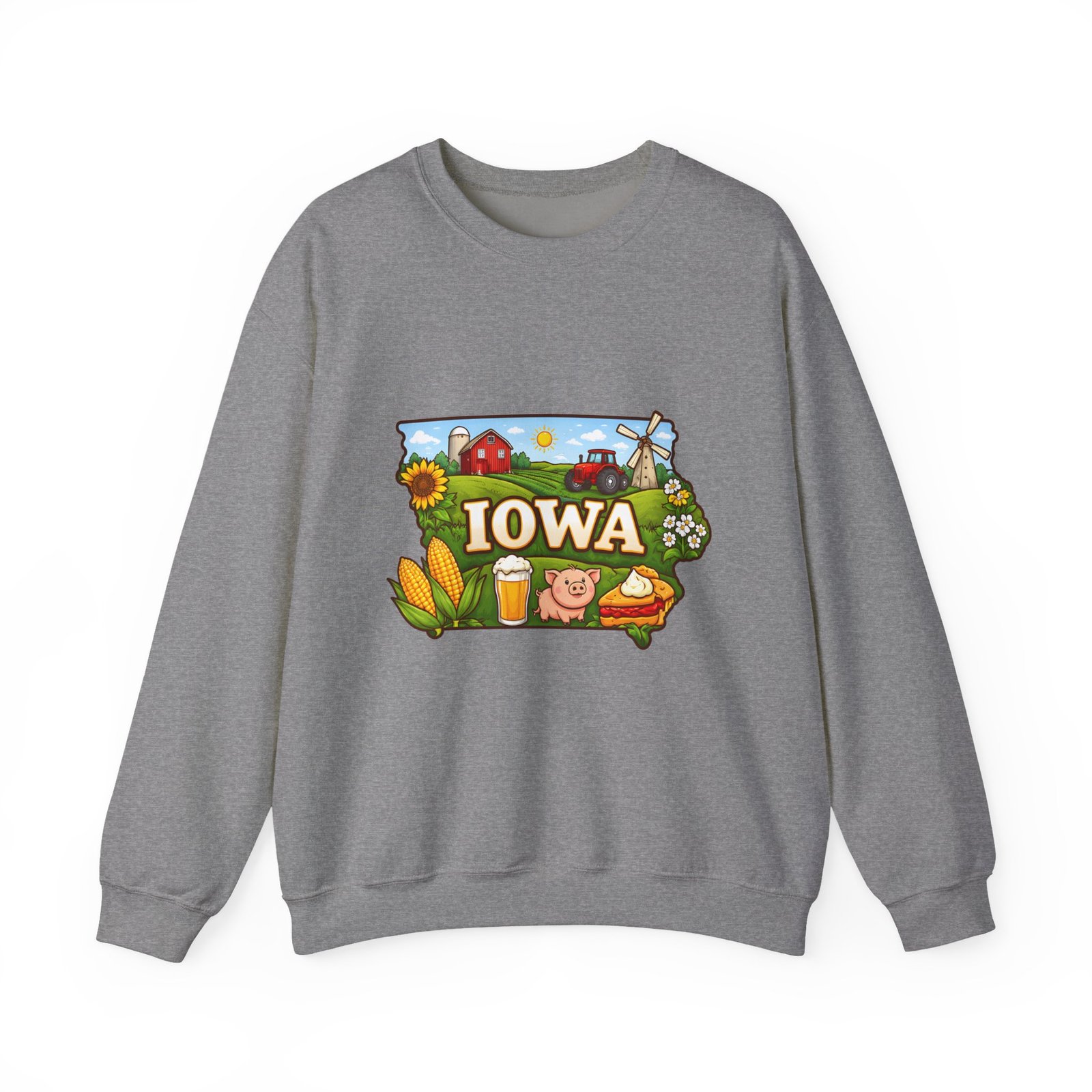 This cozy crewneck celebrates Iowa with a warm, homegrown illustration stitched into the front — barns, corn, a windmill, and friendly farm icons come together in a cheerful map-shaped design. The midweight 50/50 cotton-poly blend feels soft against the skin while the ribbed collar and double-needle stitching keep the silhouette neat wash after wash. Wear it on cool mornings watching the sunrise over the fields, at local fairs, or while showing state pride on casual days out. The embroidered options and printed wrist details add a handcrafted touch that reads like a quiet nod to small-town life and honest, agrarian roots.