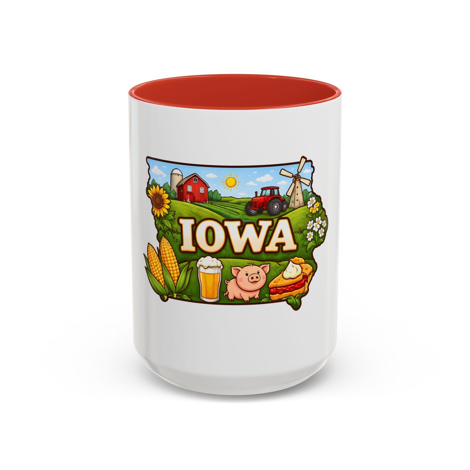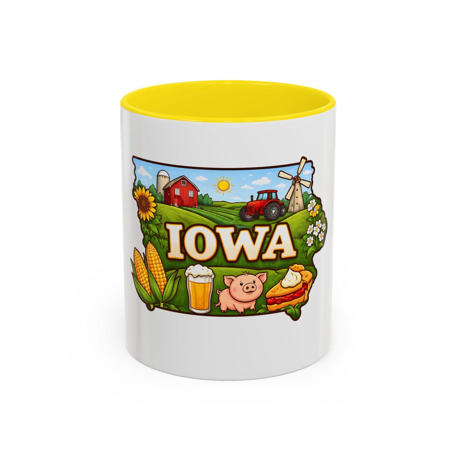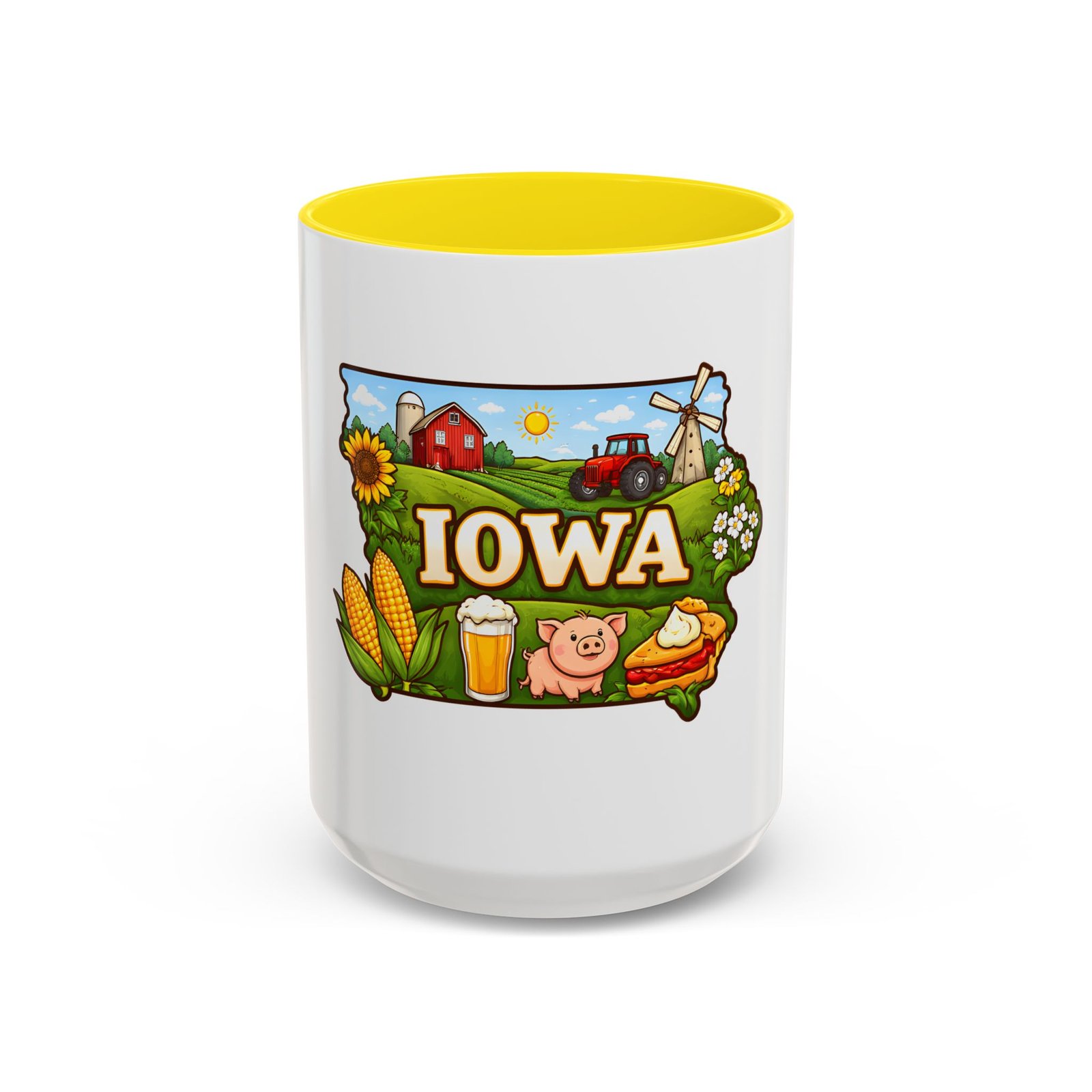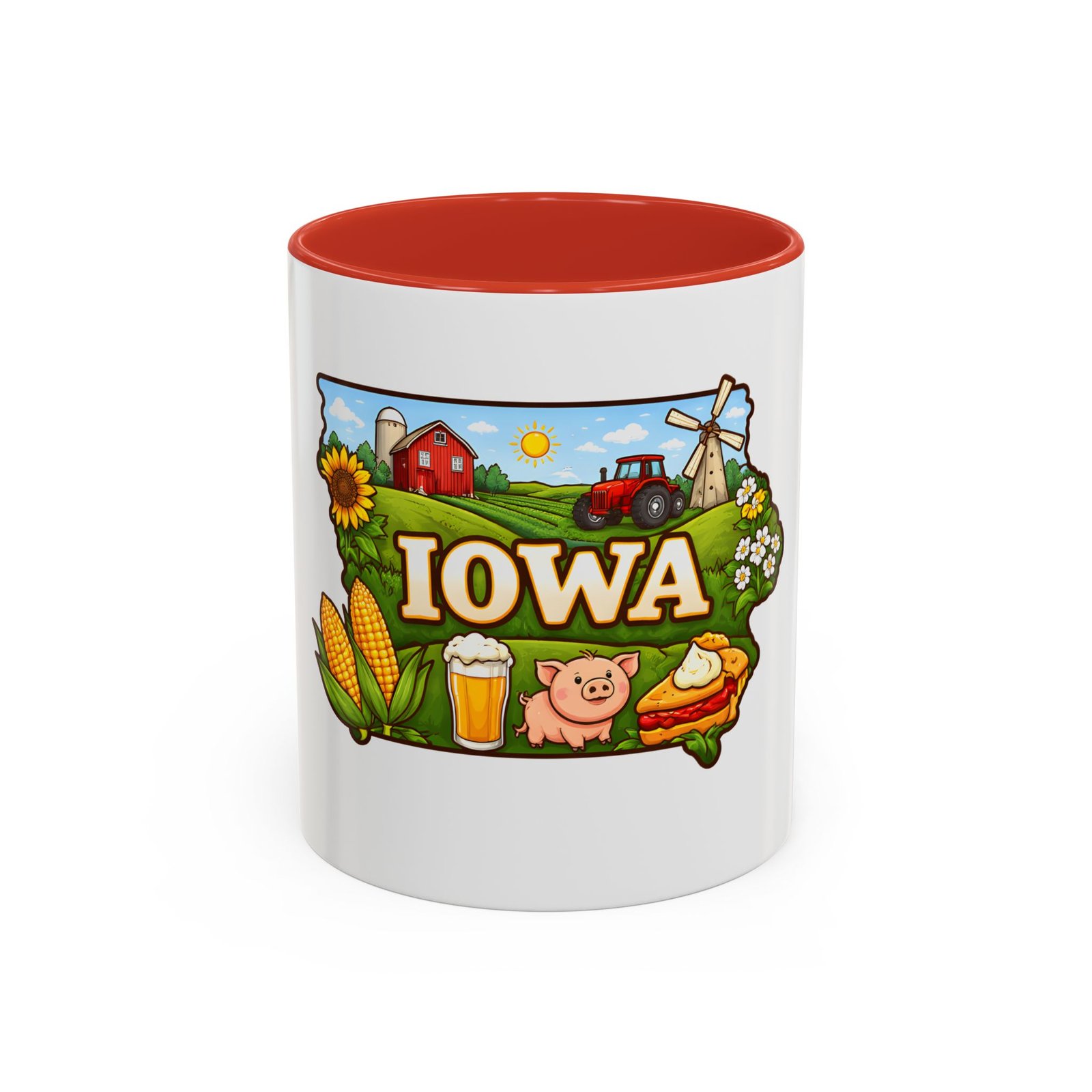 This ceramic accent mug brings a slice of Iowa warmth to every morning. Bright, cartoon-style artwork wraps around the white exterior: rolling fields, a red barn and tractor, sunflowers, corn, a windmill, and friendly icons of local life—a pig, a slice of pie, and a frothy beer—framed around the bold “IOWA” lettering. The colored interior and matching handle add lively contrast that lifts the design and feels homey in hand. Use it for coffee, cocoa, or an afternoon tea while remembering lazy summer afternoons on the farm or swapping stories at the kitchen table.