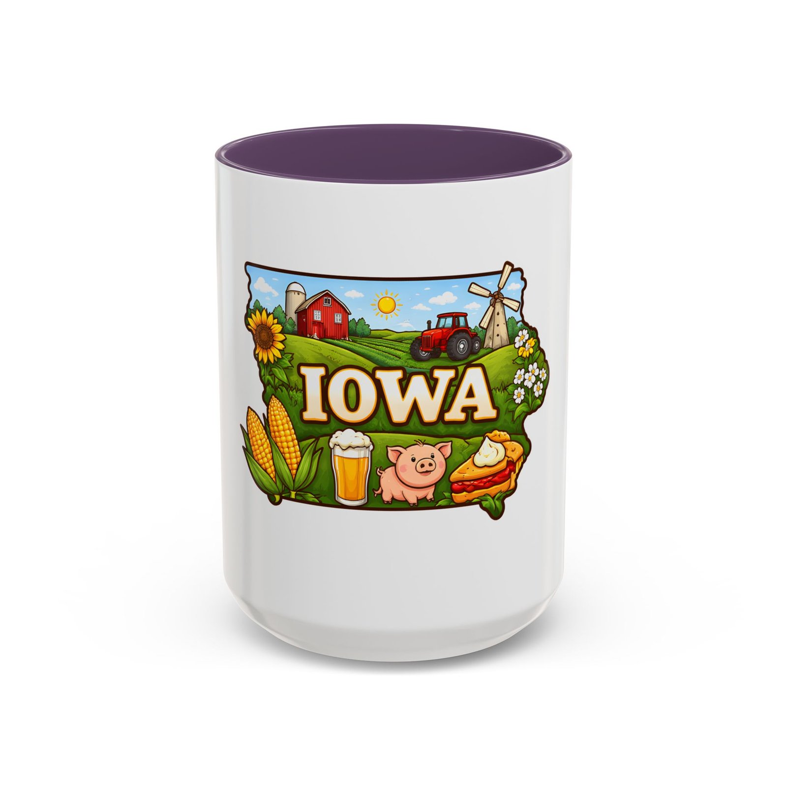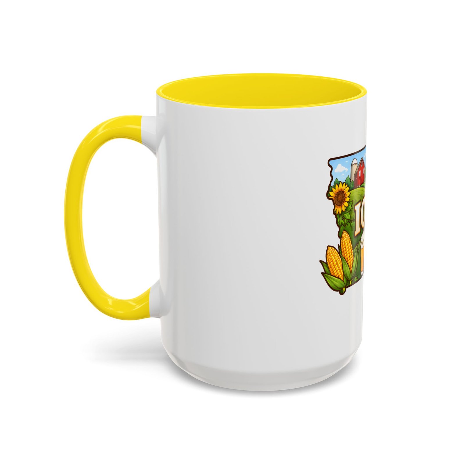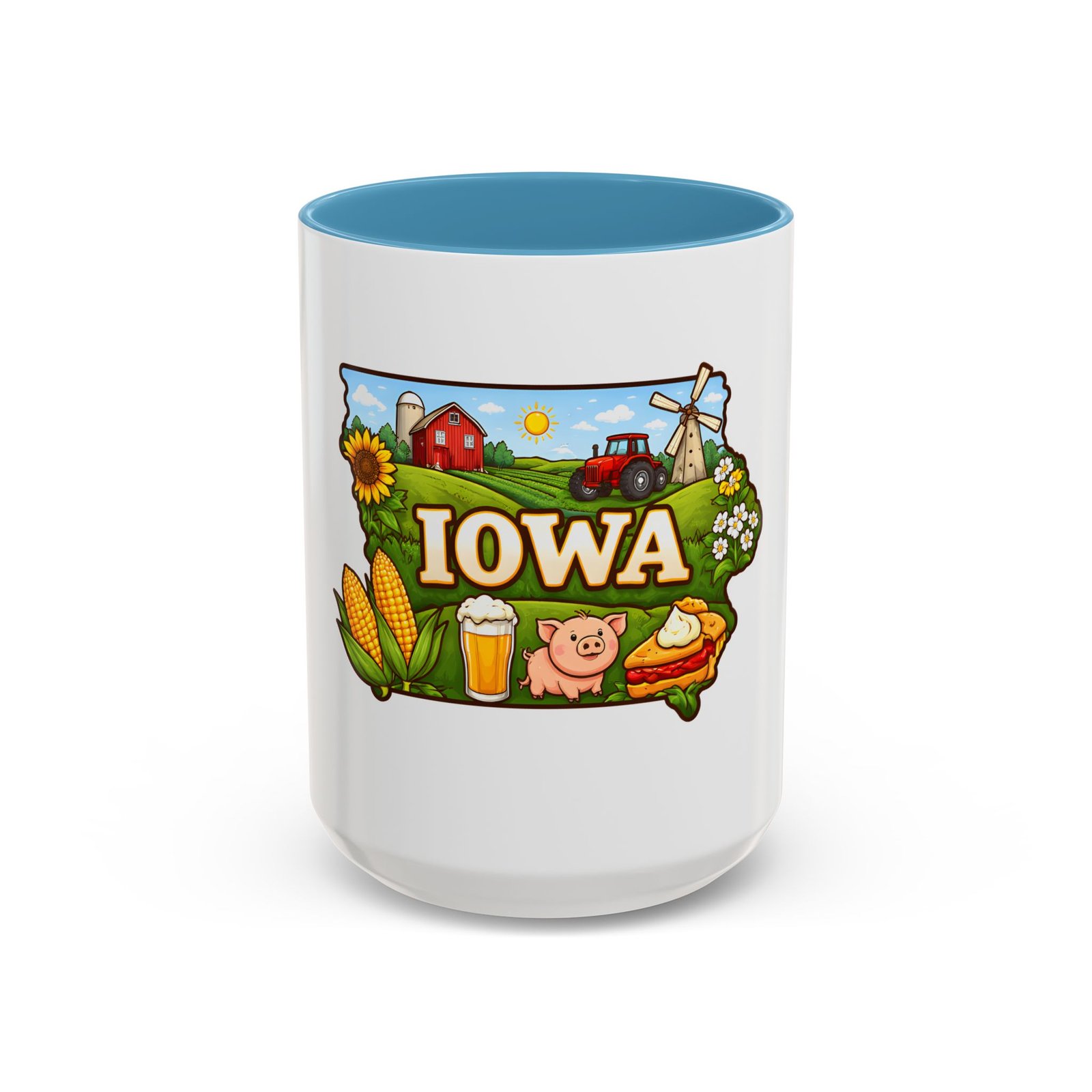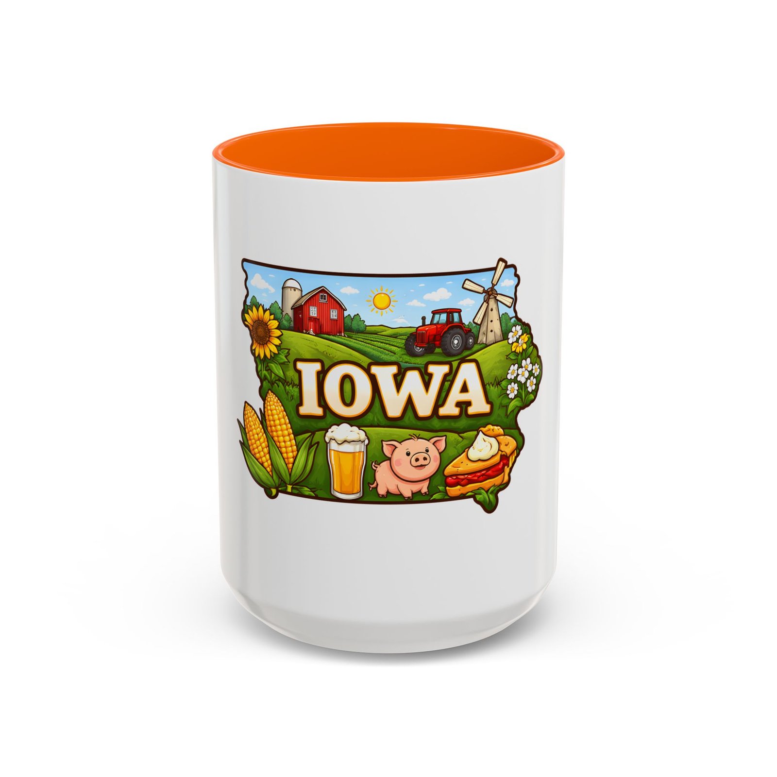 This ceramic accent mug brings a slice of Iowa warmth to every morning. Bright, cartoon-style artwork wraps around the white exterior: rolling fields, a red barn and tractor, sunflowers, corn, a windmill, and friendly icons of local life—a pig, a slice of pie, and a frothy beer—framed around the bold “IOWA” lettering. The colored interior and matching handle add lively contrast that lifts the design and feels homey in hand. Use it for coffee, cocoa, or an afternoon tea while remembering lazy summer afternoons on the farm or swapping stories at the kitchen table.
