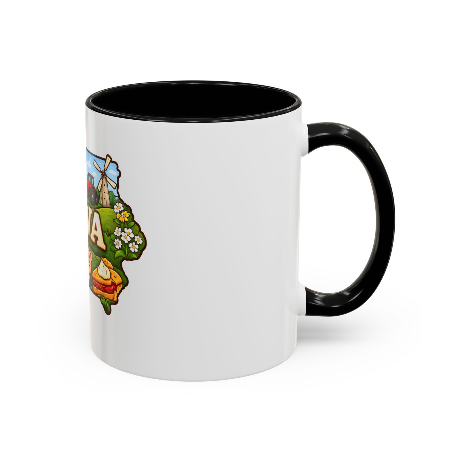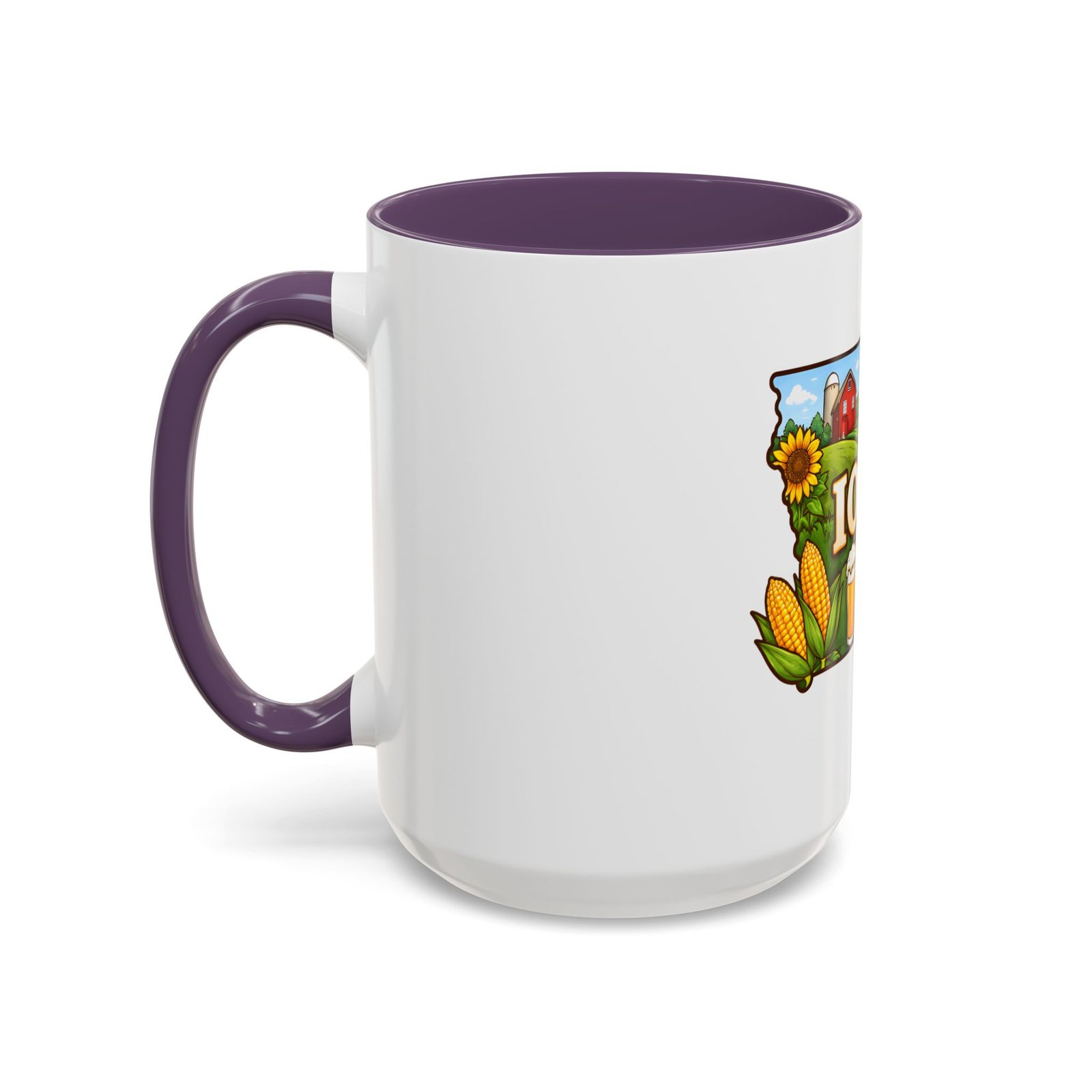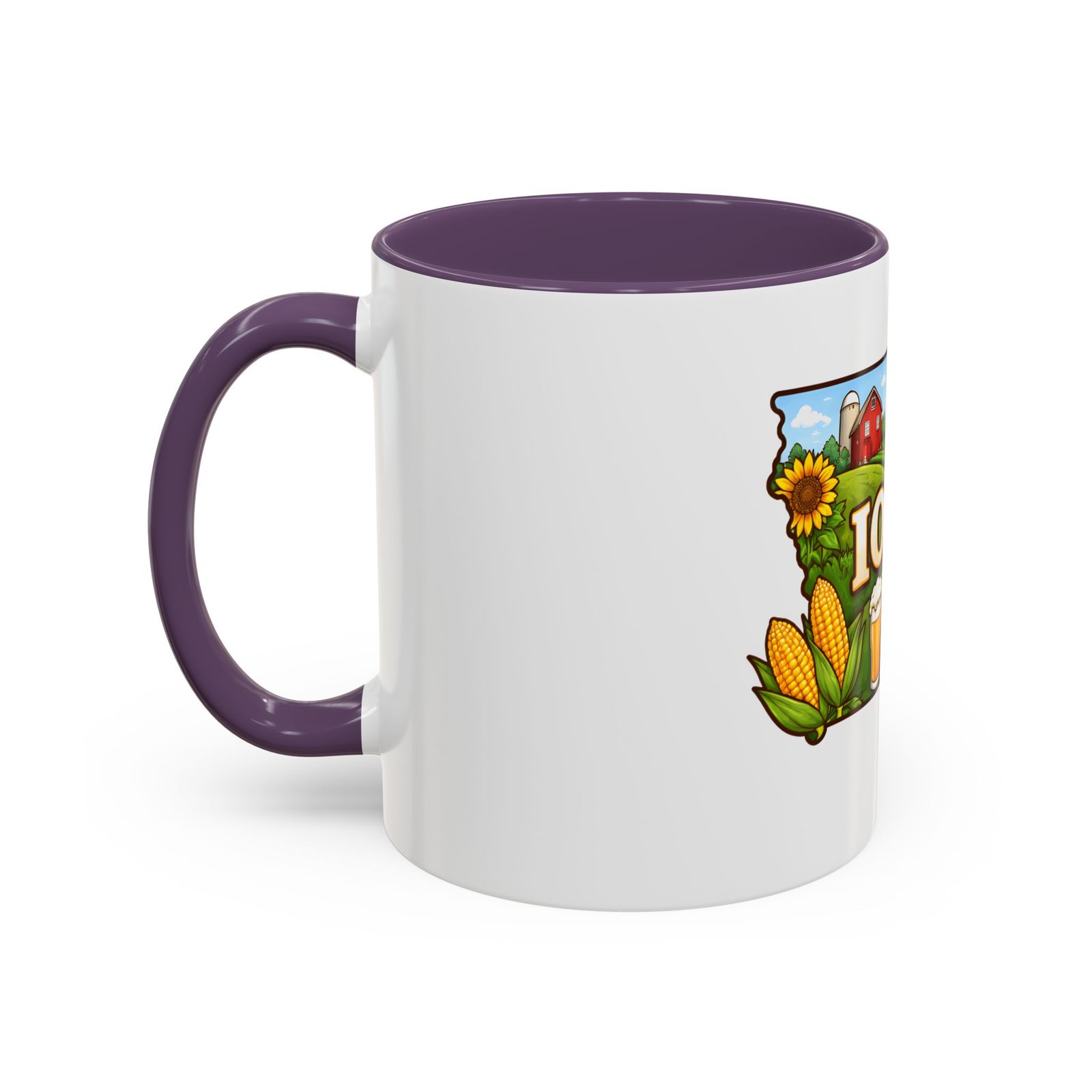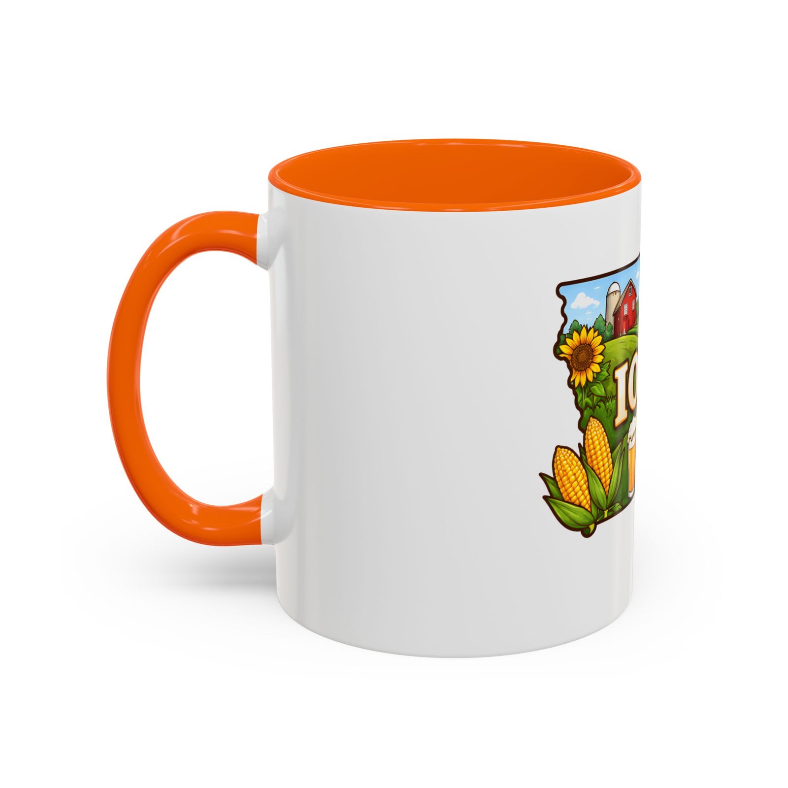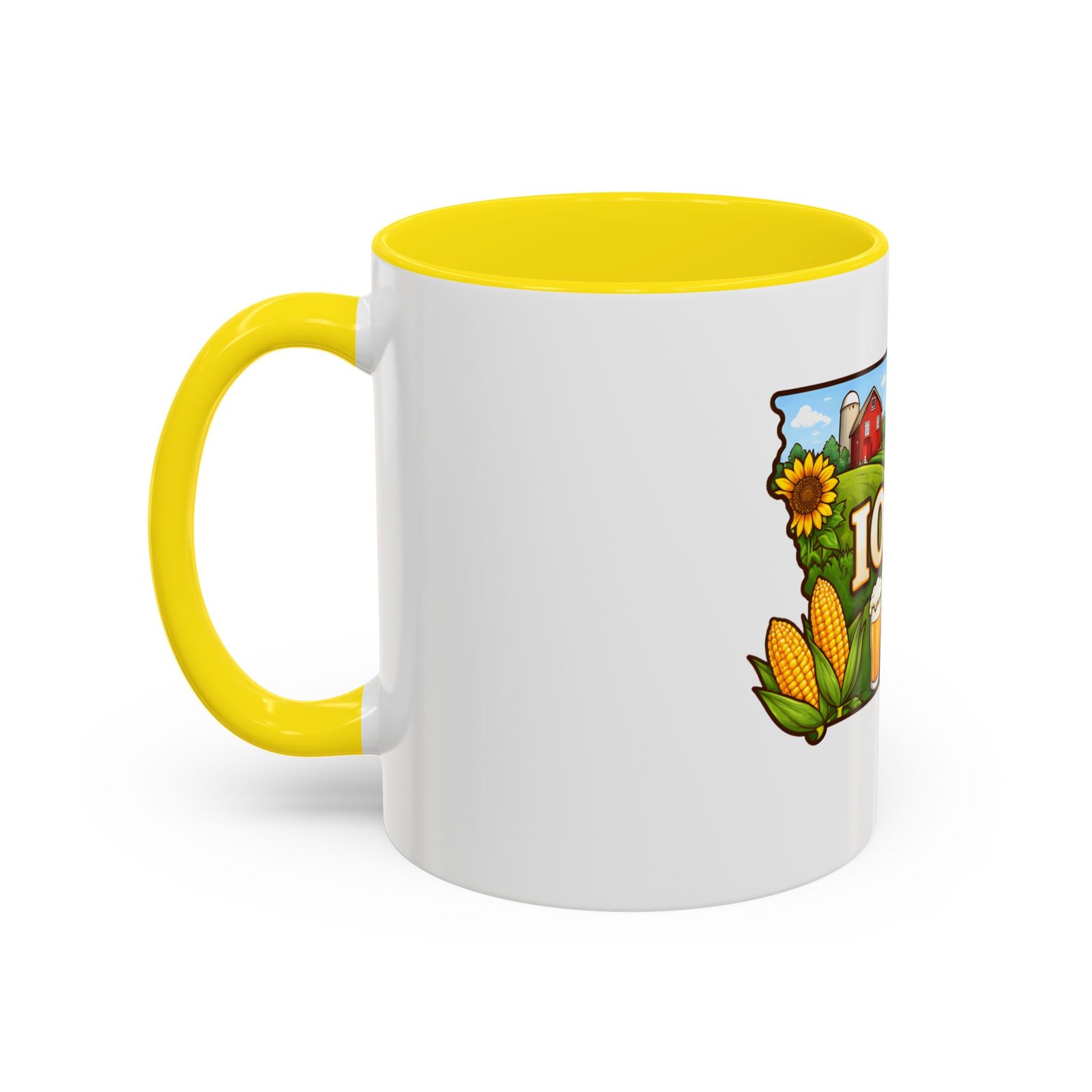 This ceramic accent mug brings a slice of Iowa warmth to every morning. Bright, cartoon-style artwork wraps around the white exterior: rolling fields, a red barn and tractor, sunflowers, corn, a windmill, and friendly icons of local life—a pig, a slice of pie, and a frothy beer—framed around the bold “IOWA” lettering. The colored interior and matching handle add lively contrast that lifts the design and feels homey in hand. Use it for coffee, cocoa, or an afternoon tea while remembering lazy summer afternoons on the farm or swapping stories at the kitchen table.