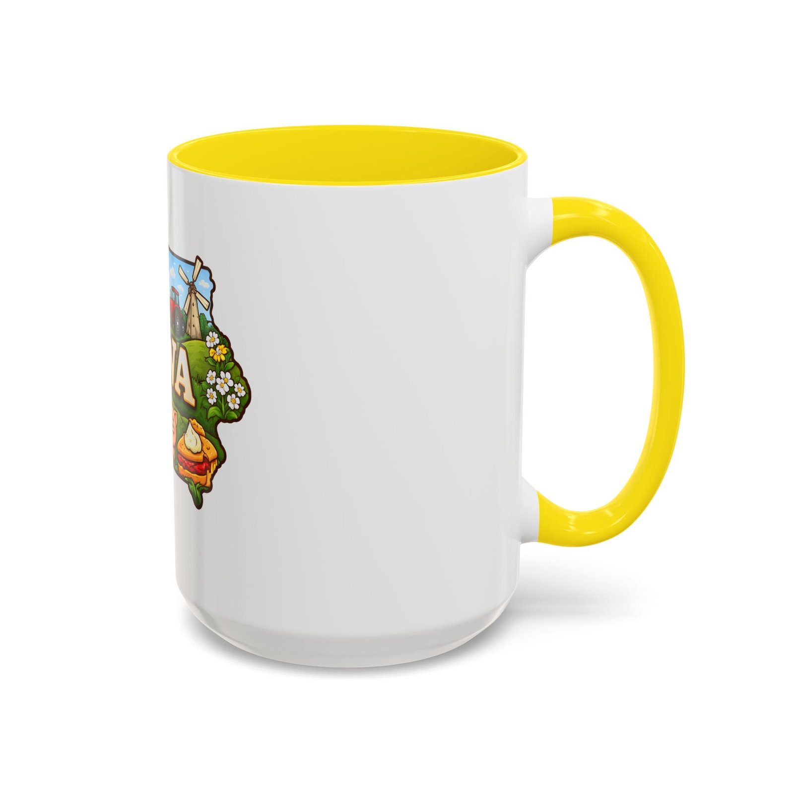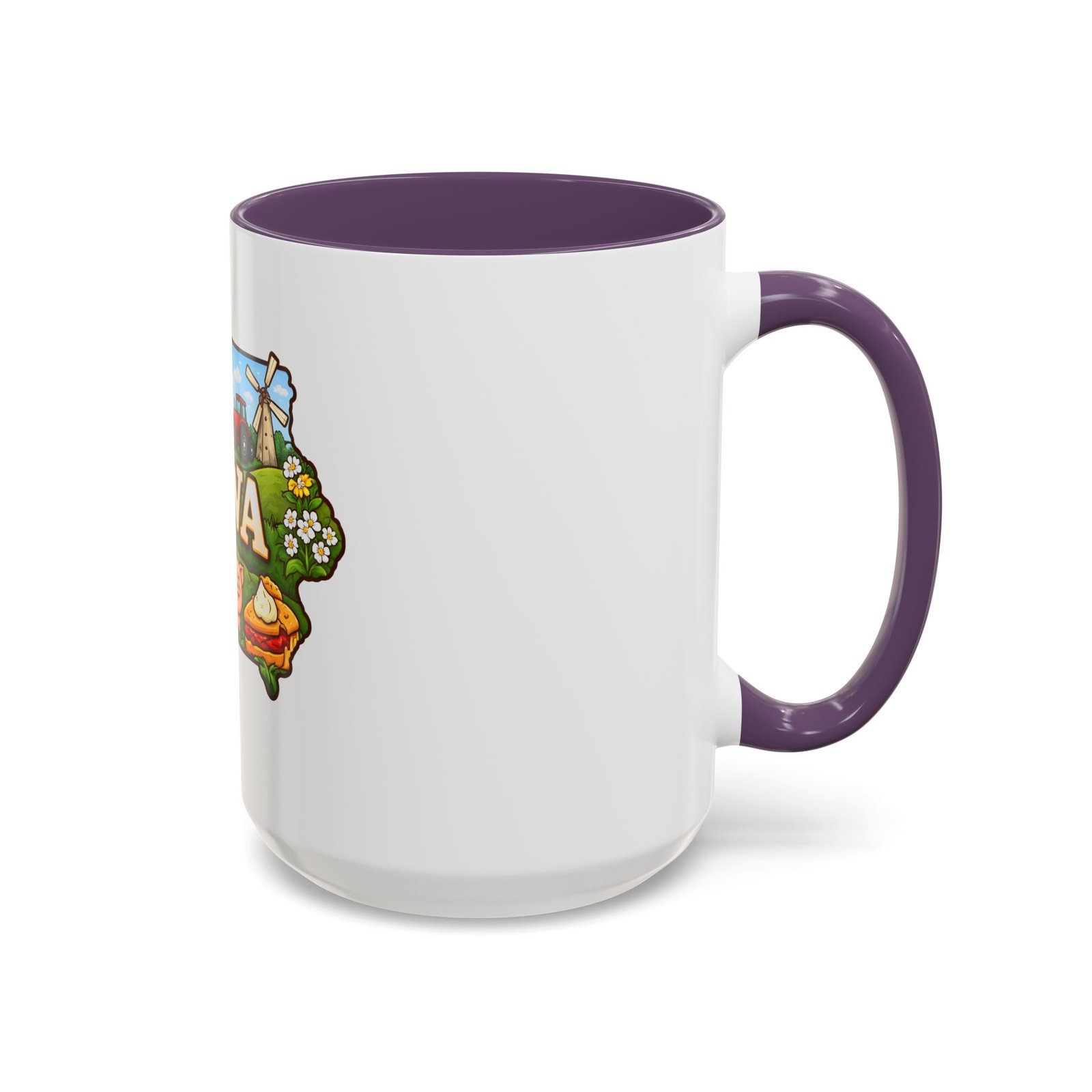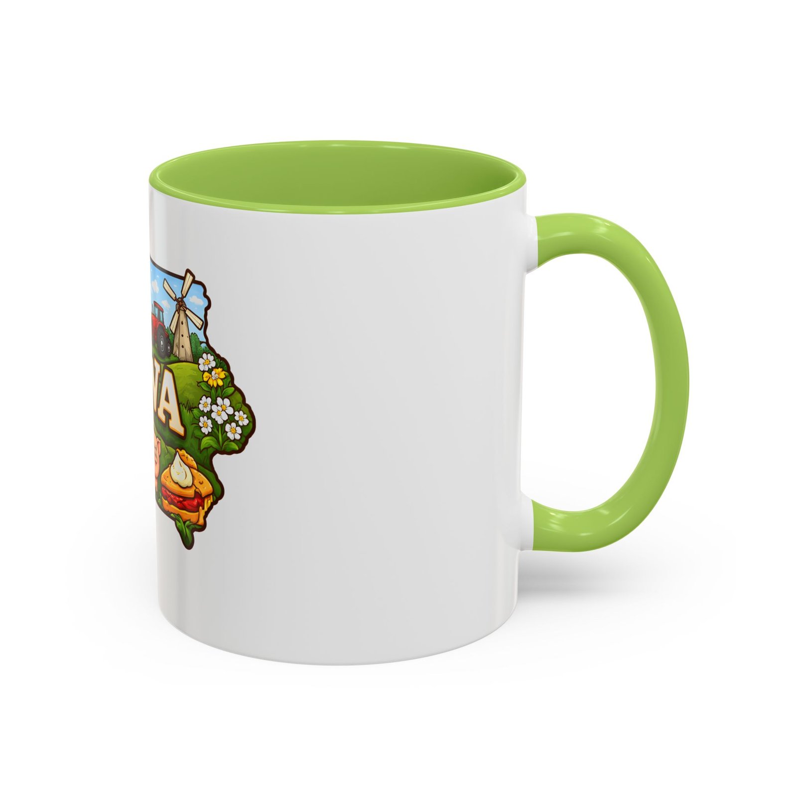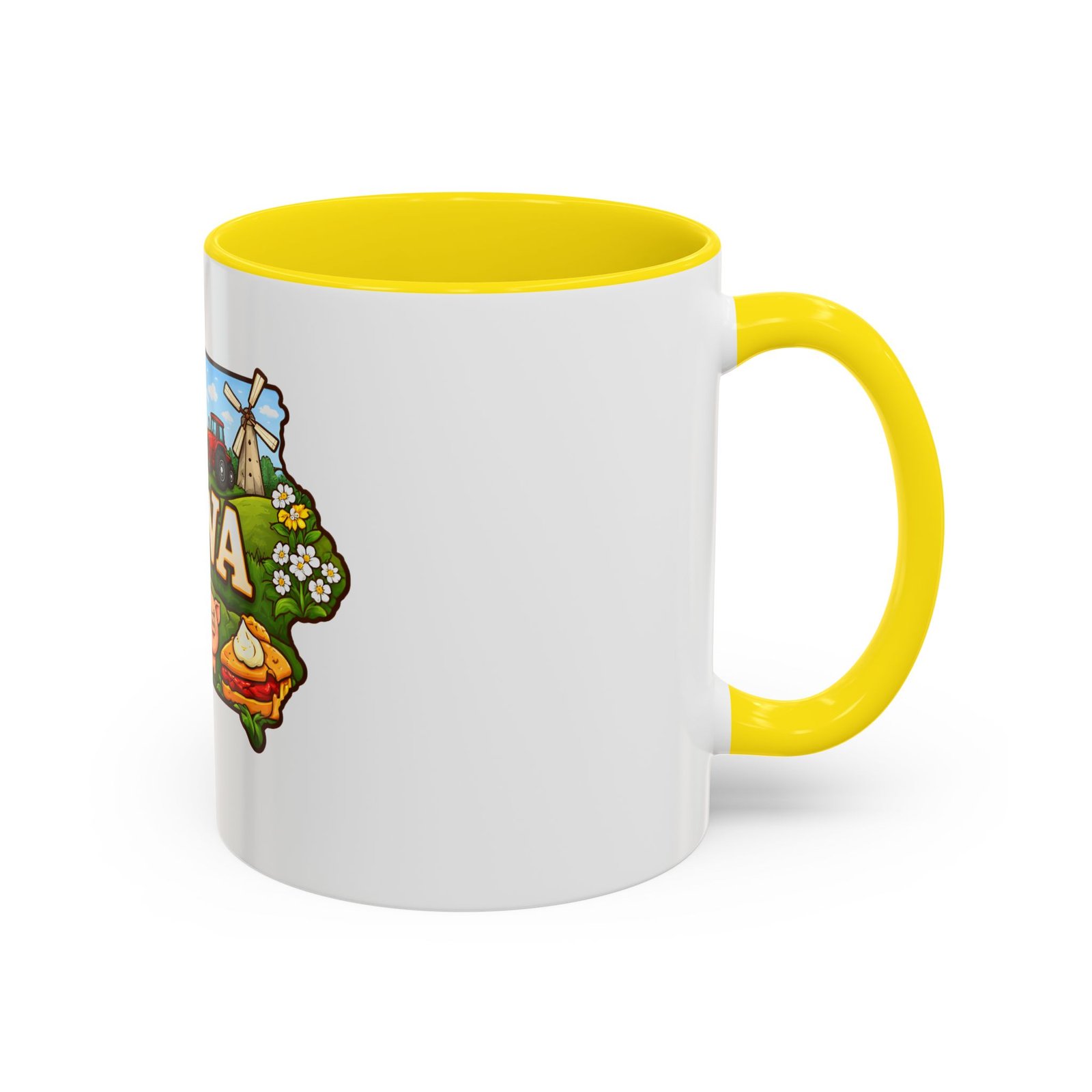 This ceramic accent mug brings a slice of Iowa warmth to every morning. Bright, cartoon-style artwork wraps around the white exterior: rolling fields, a red barn and tractor, sunflowers, corn, a windmill, and friendly icons of local life—a pig, a slice of pie, and a frothy beer—framed around the bold “IOWA” lettering. The colored interior and matching handle add lively contrast that lifts the design and feels homey in hand. Use it for coffee, cocoa, or an afternoon tea while remembering lazy summer afternoons on the farm or swapping stories at the kitchen table.