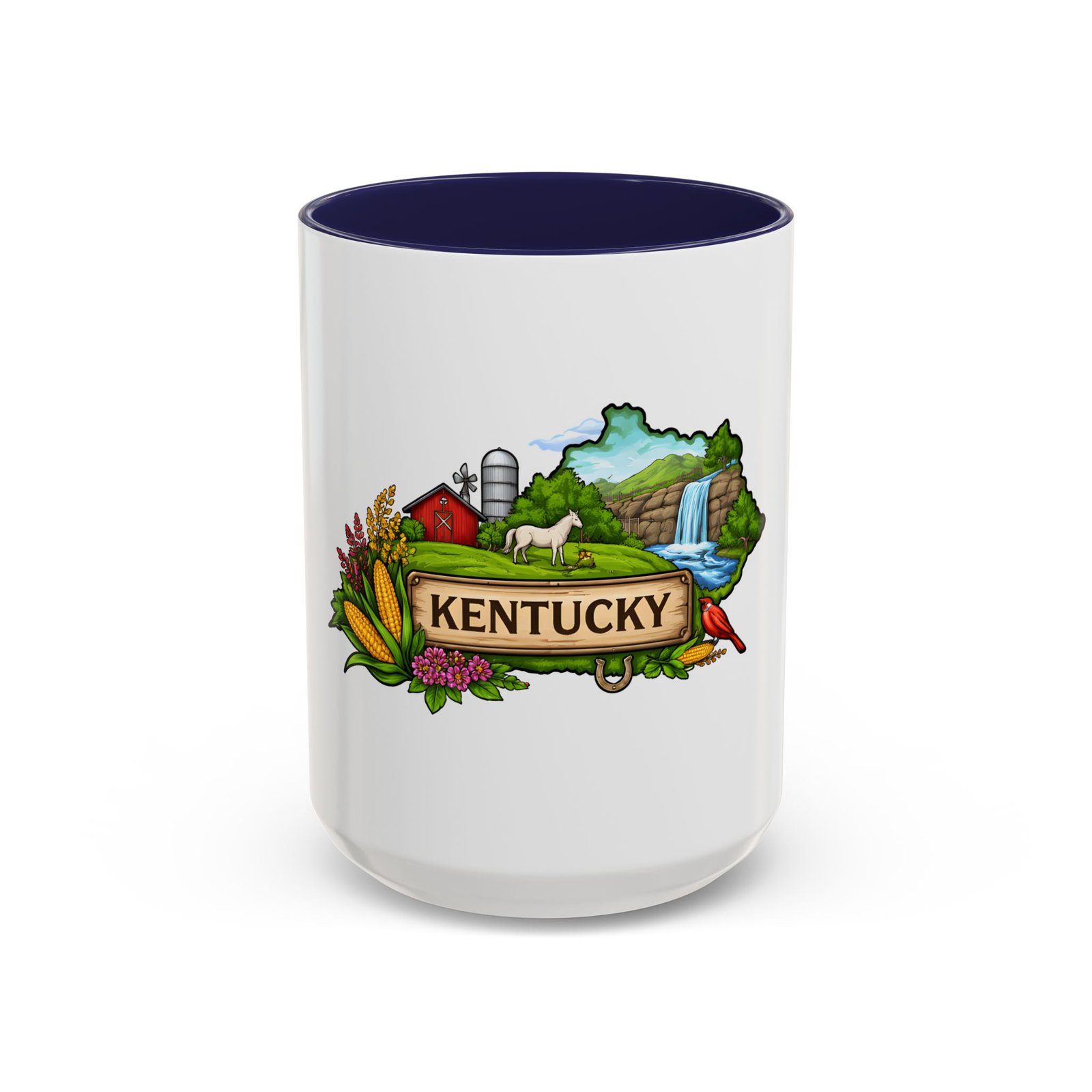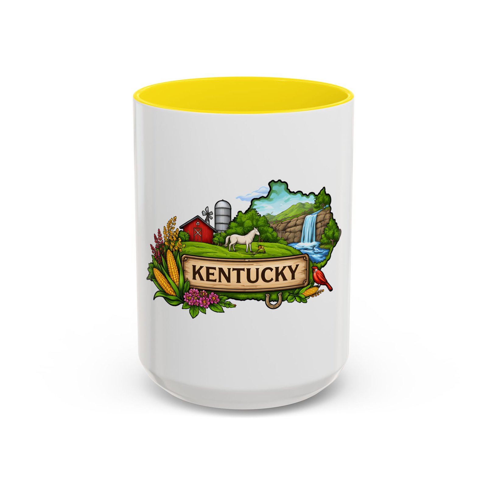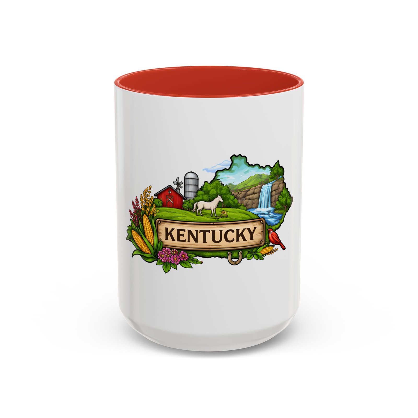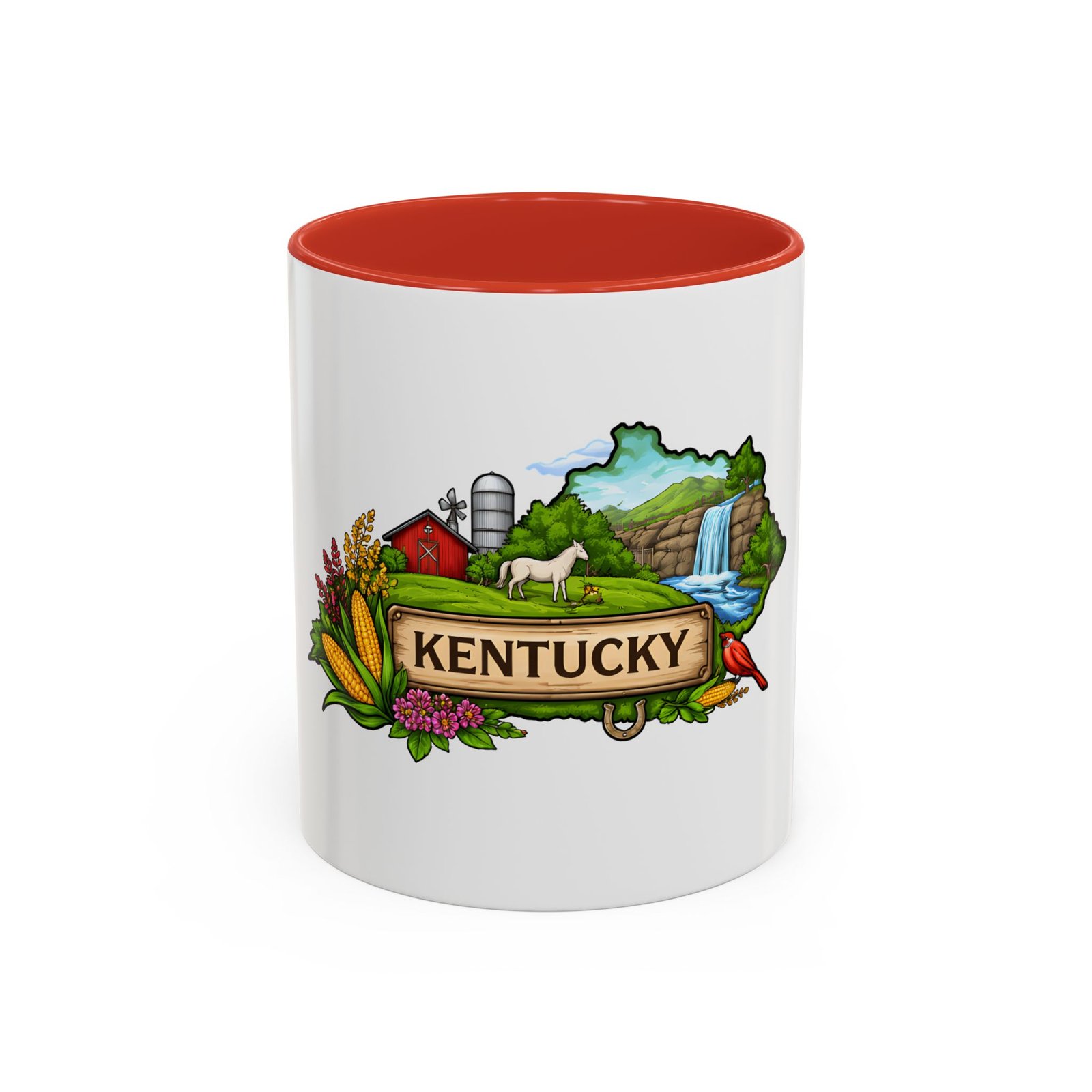 Start your morning with a cup that celebrates home-state pride. This ceramic accent mug pairs a bright, glossy white exterior with a bold colored interior and handle to make the rich Kentucky illustration pop—rolling hills, a red barn, cascading waterfall, corn stalks and a cardinal woven into a rustic sign. It feels warm and familiar in hand, like a slow sunrise over farmland. Durable and low-effort care means this mug joins weekday routines and weekend slow-sips alike, adding a small, joyful moment to coffee, tea, or hot chocolate.