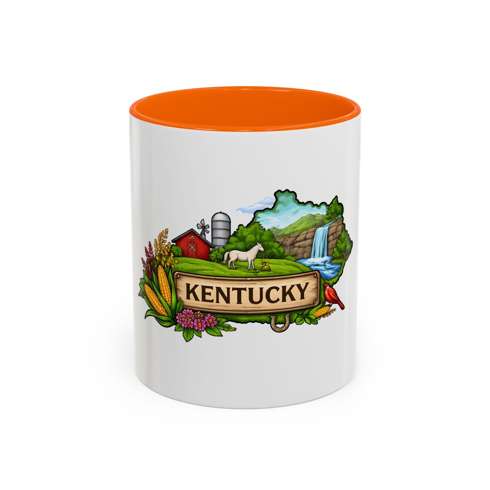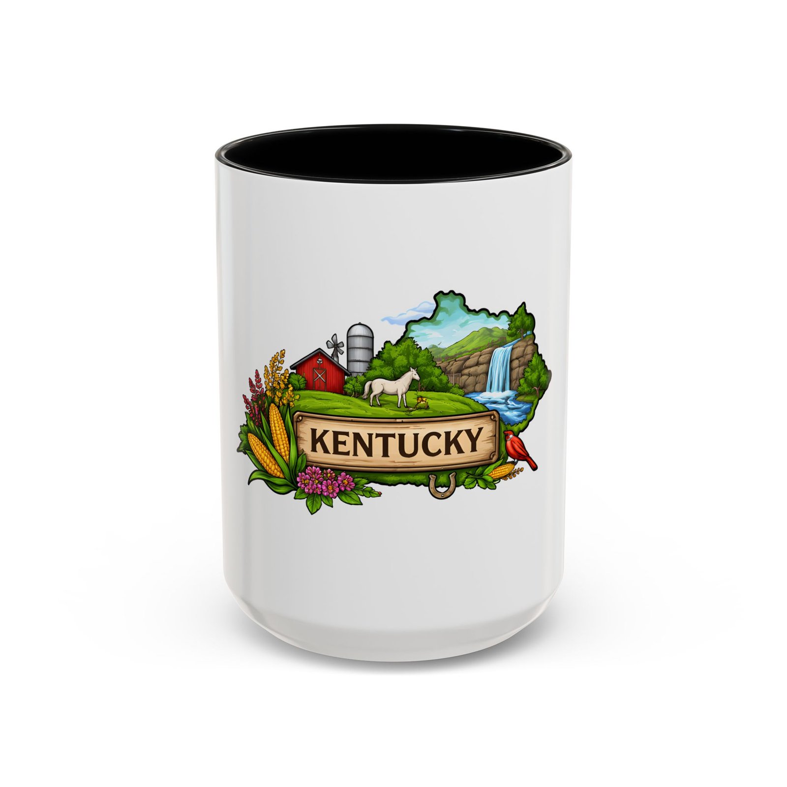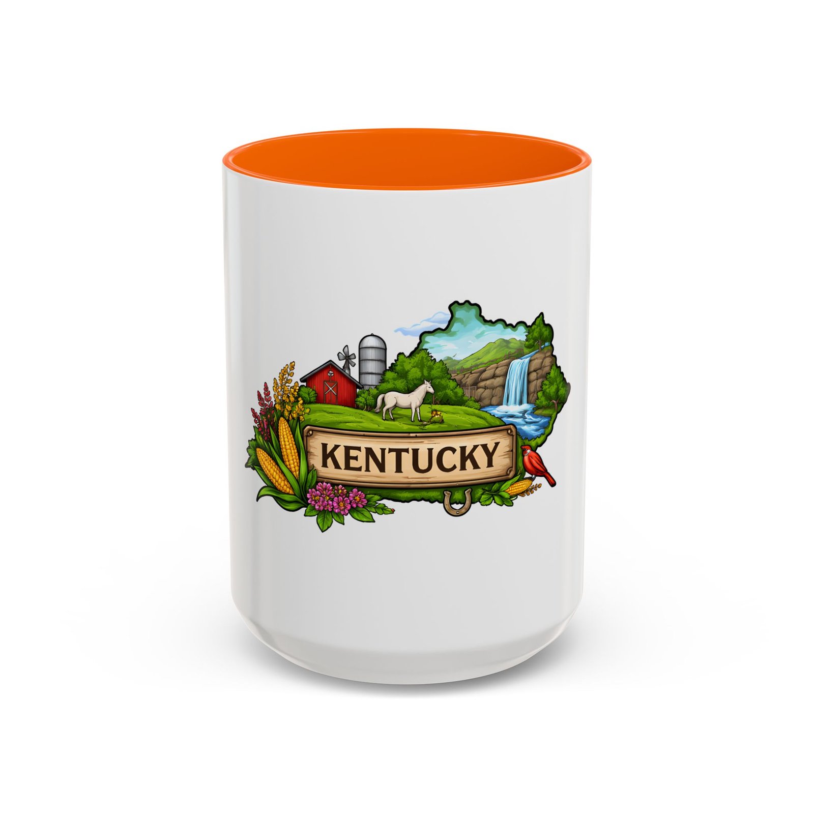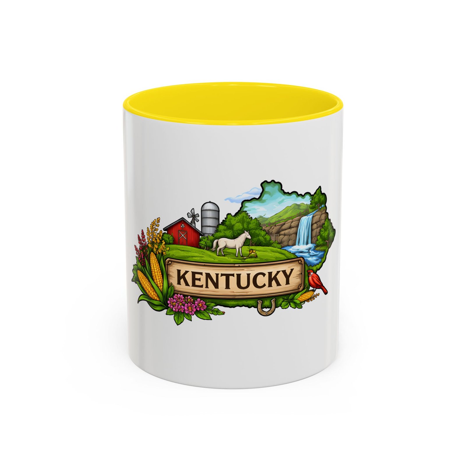 Start your morning with a cup that celebrates home-state pride. This ceramic accent mug pairs a bright, glossy white exterior with a bold colored interior and handle to make the rich Kentucky illustration pop—rolling hills, a red barn, cascading waterfall, corn stalks and a cardinal woven into a rustic sign. It feels warm and familiar in hand, like a slow sunrise over farmland. Durable and low-effort care means this mug joins weekday routines and weekend slow-sips alike, adding a small, joyful moment to coffee, tea, or hot chocolate.