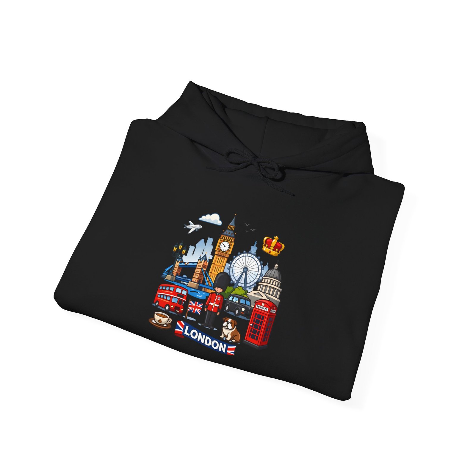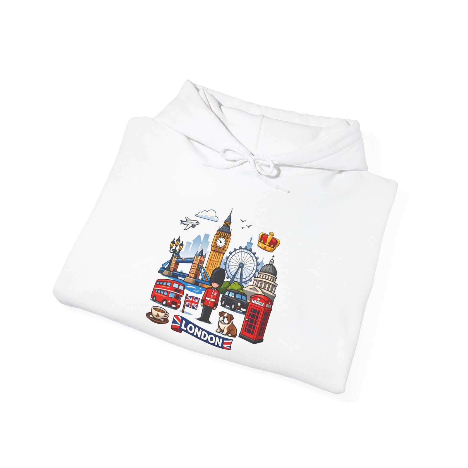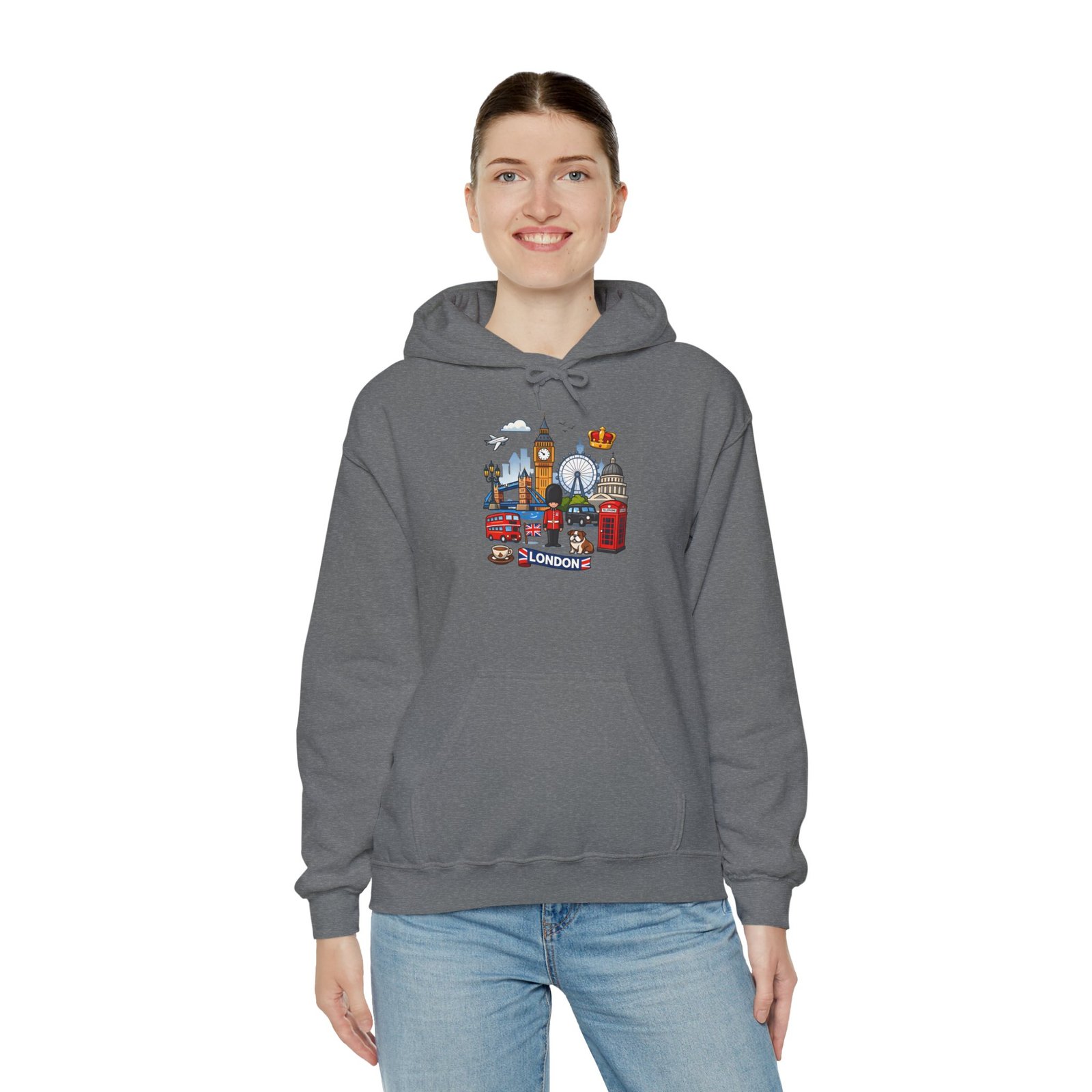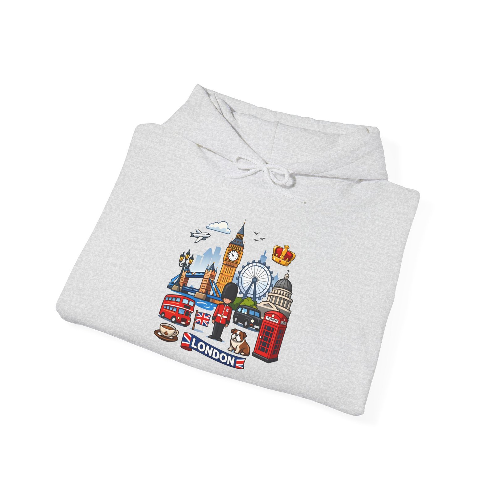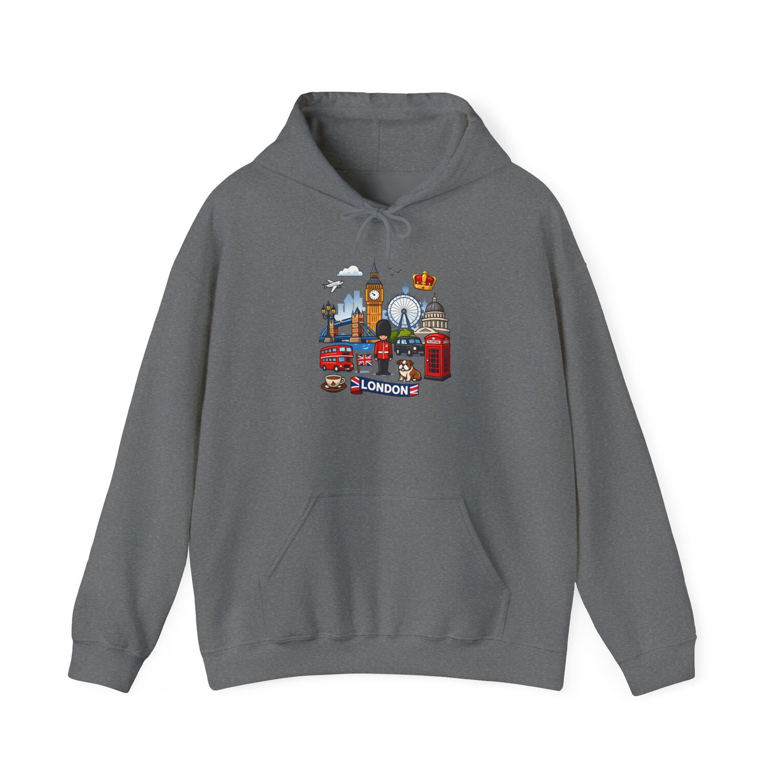 This cozy hoodie carries a playful London skyline across the chest — red phone booth, double-decker bus, Big Ben, the London Eye and tiny classic details arranged like a traveler’s scrapbook. The medium-heavy 50/50 cotton-poly blend feels warm and soft on cool mornings. The double-lined, color-matched hood and roomy kangaroo pocket make it a comfortable layer for wandering city streets, waiting for the tube, or sipping tea inside a cafe. The compact, colorful print keeps the look cheerful and wearable every day, while durable print and embroidery options mean this piece will stay bright through many washes and adventures.