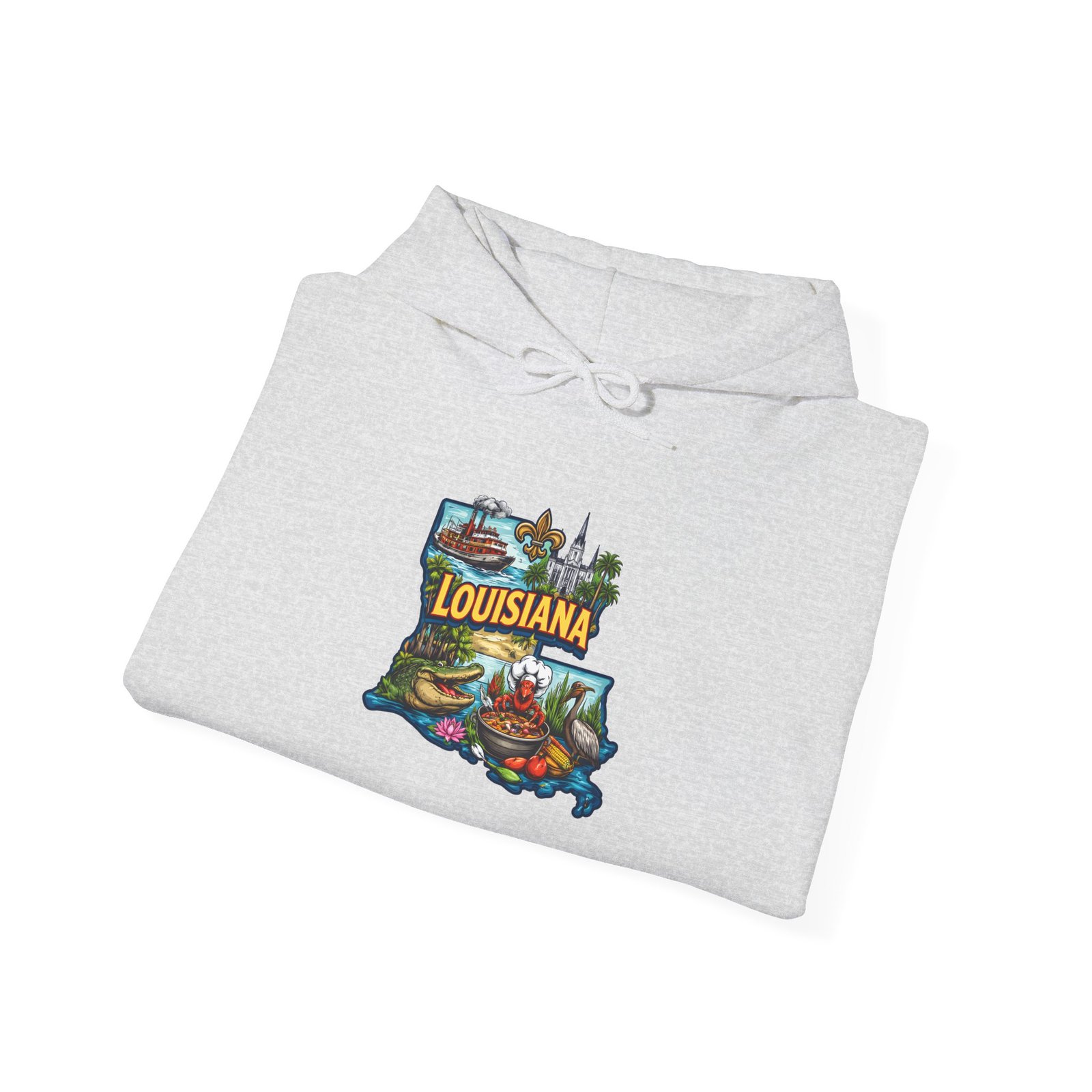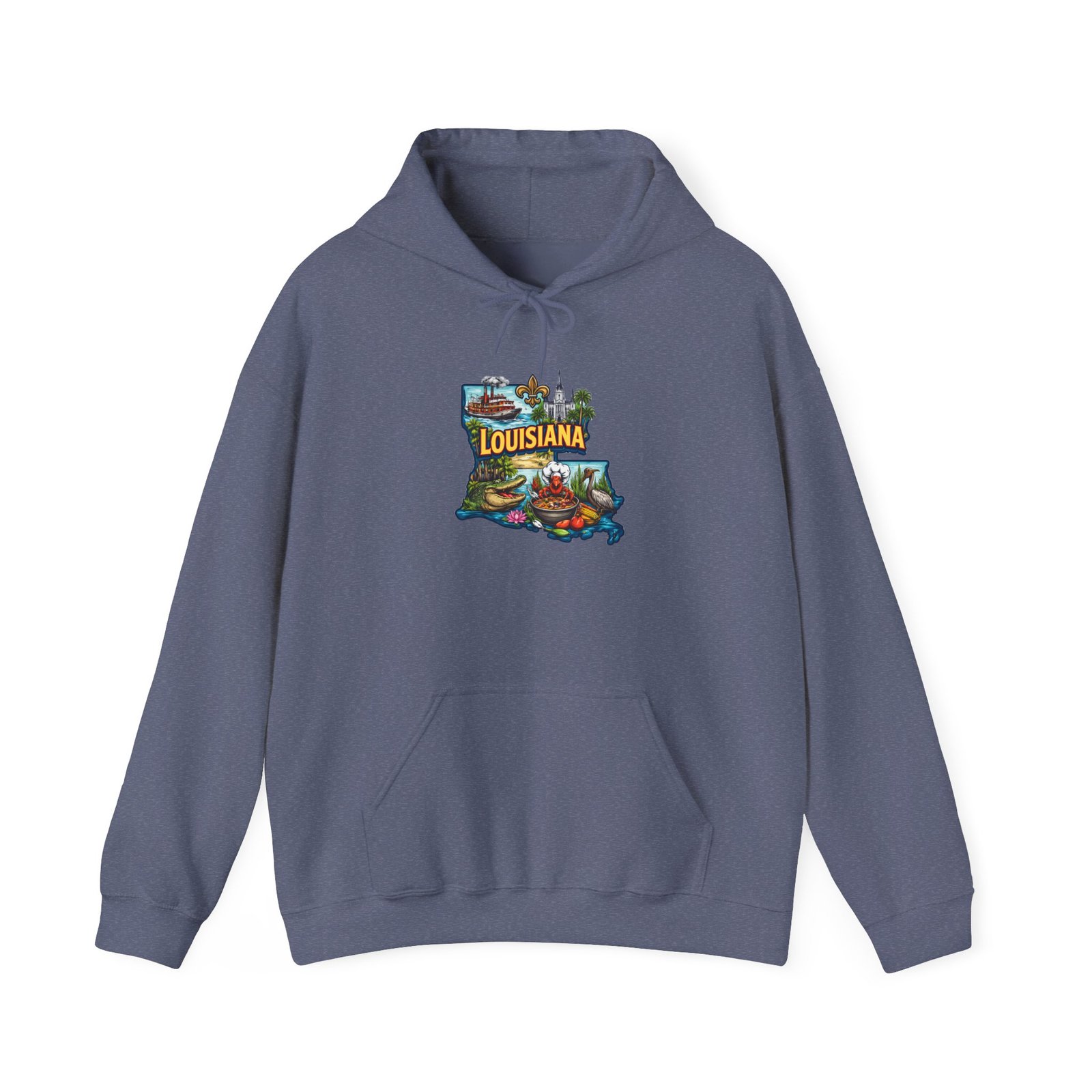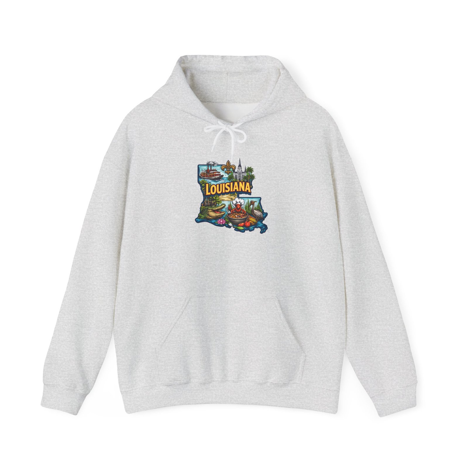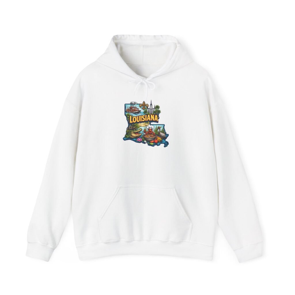 Slip into a cozy, lived-in layer that carries Louisiana with it. This soft mid-weight hoodie wears like a warm memory—cushy fleece, a double-lined hood, and a roomy kangaroo pocket to tuck cold hands or concert tickets. The colorful Louisiana map artwork sits on the chest like a postcard: swamp cypress, a steamboat, spicy crawfish and neon city hints, each detail printed with durable DTF/DTG inks that stay vivid through washes. It’s built to travel from dusk bonfires to late-night drives on Bayou roads, and to feel like home when you pull it over your head.