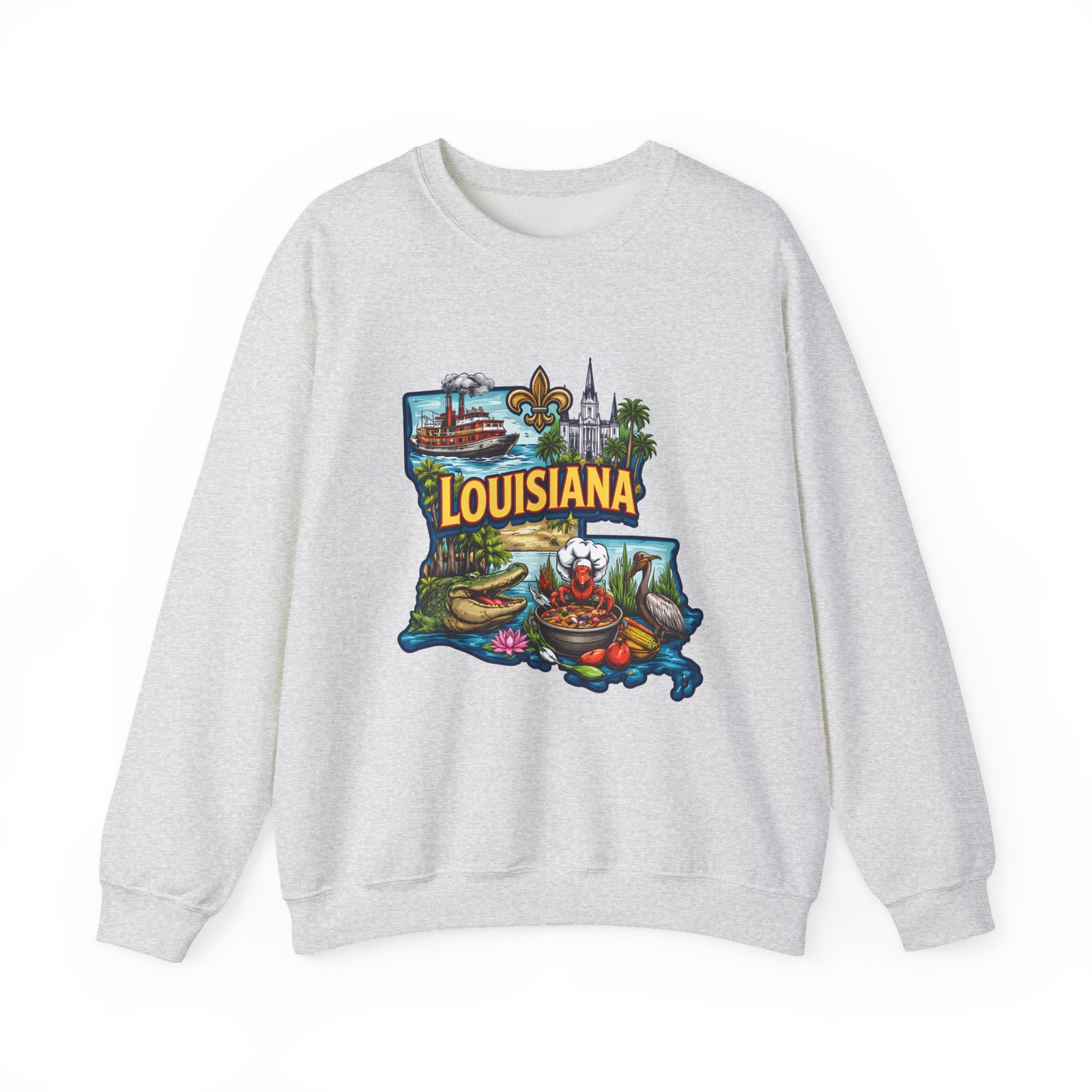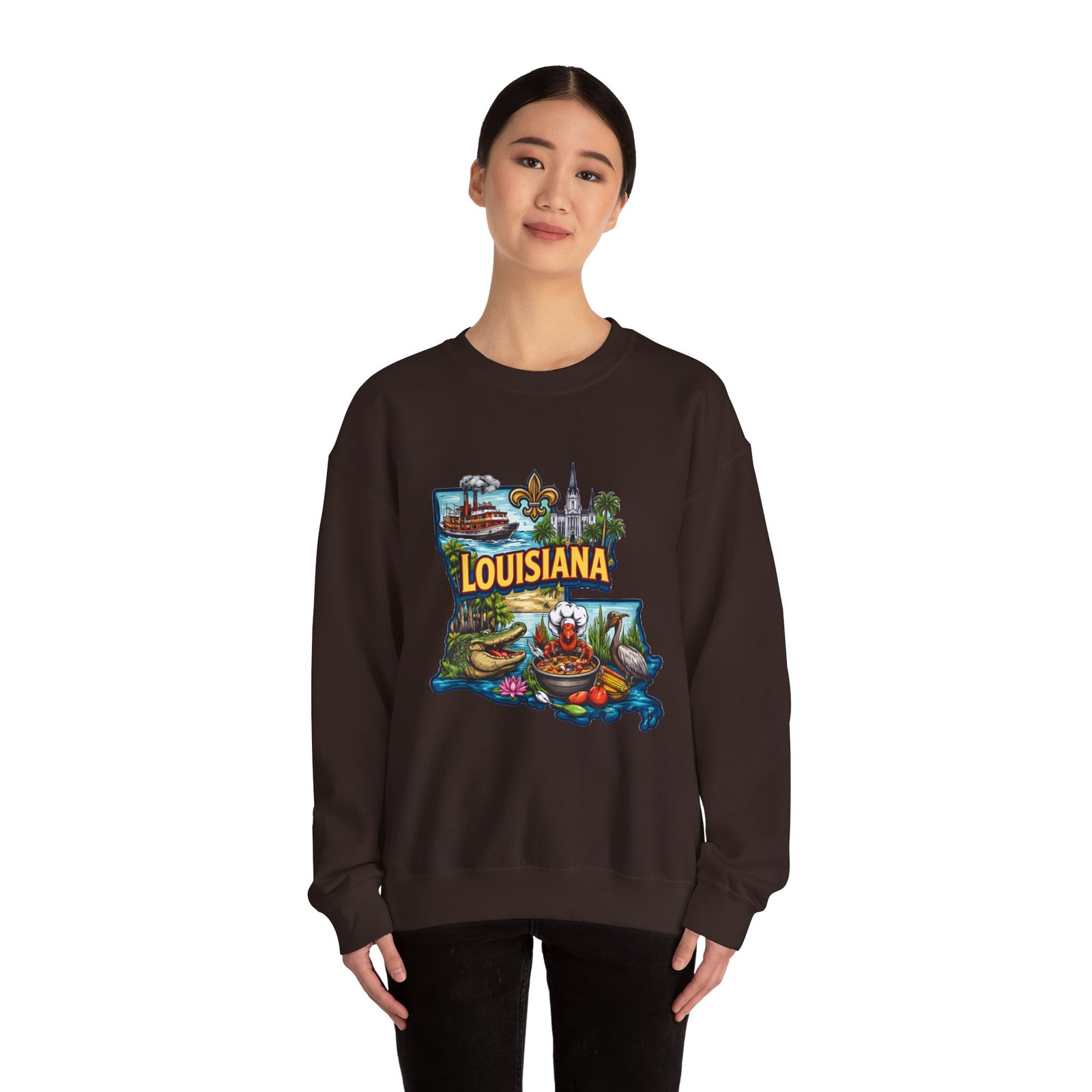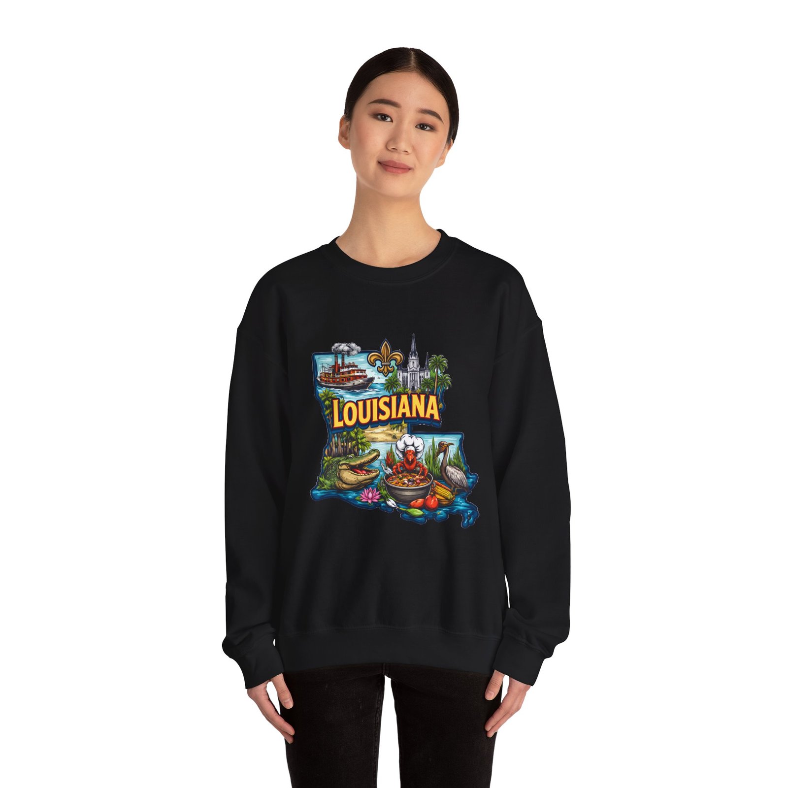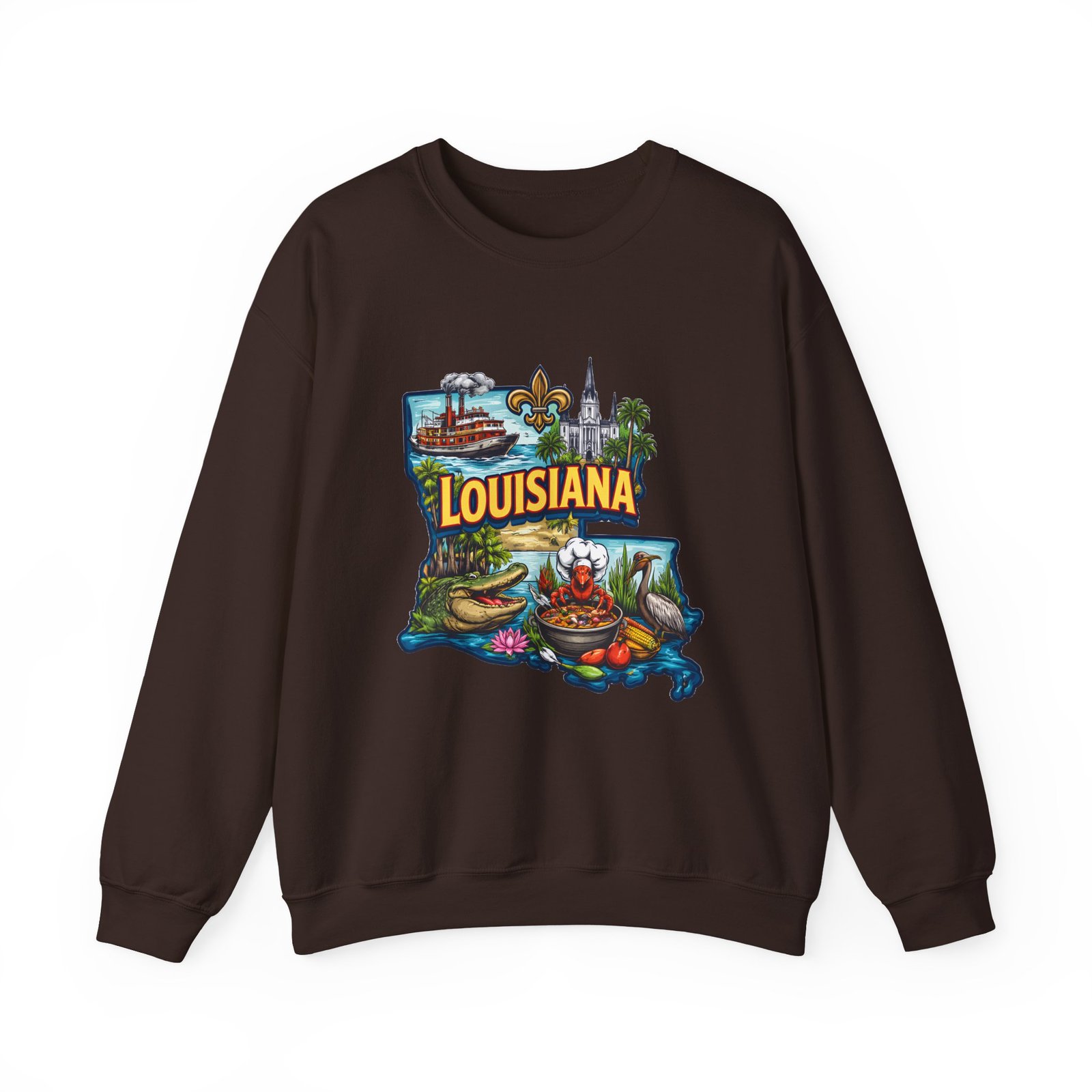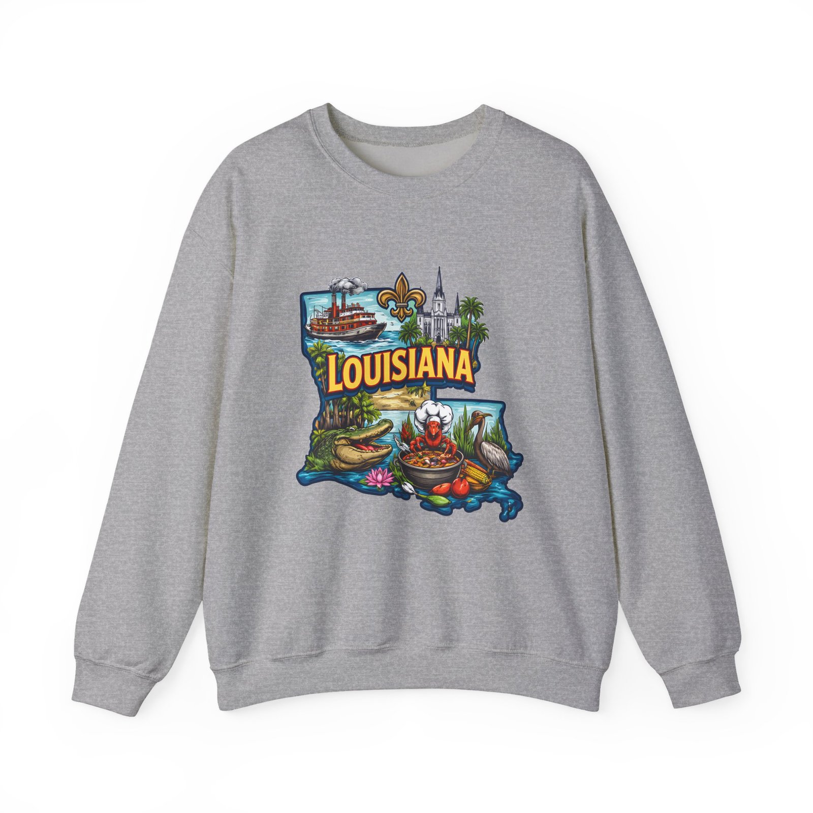 Wrap yourself in slow Sundays, crawfish boils, and moss-draped oaks. This cozy crewneck carries a vibrant Louisiana map print—steamed poboys, a steamboat, cathedral spires, and bayou wildlife—so every wear feels like a road trip down River Road. The medium-heavy 50/50 cotton-poly fabric and ribbed collar give it a lived-in comfort that holds its shape. Thoughtful construction—tubular knit with no side seams and double-needle stitching—means this sweatshirt stays soft and durable through season after season. Subtle DTF inner labels and optional embroidery placements let you add a personal touch without losing the artwork’s bold colors. Slip it on for cool mornings at the market, late-night porch hangs, or the next festival parade; it settles like a familiar soundtrack to the moments you already love.