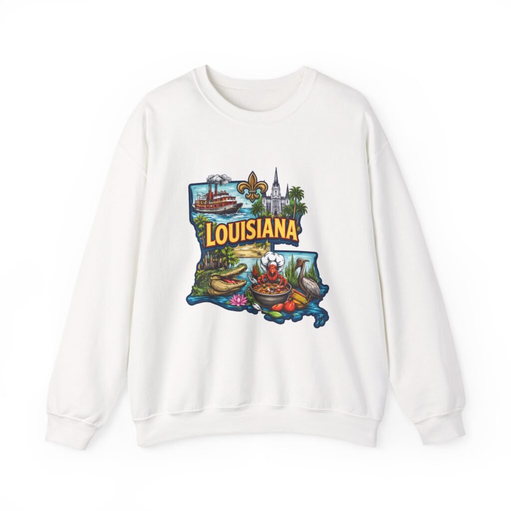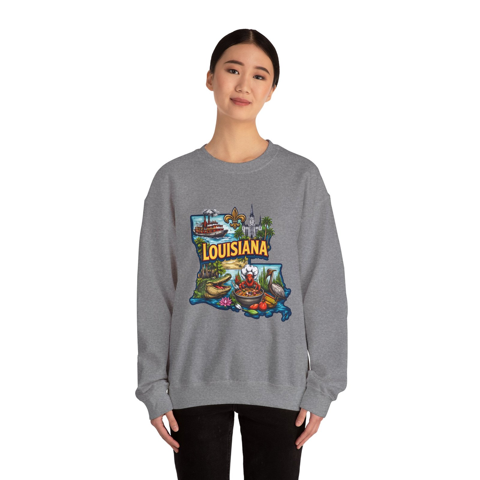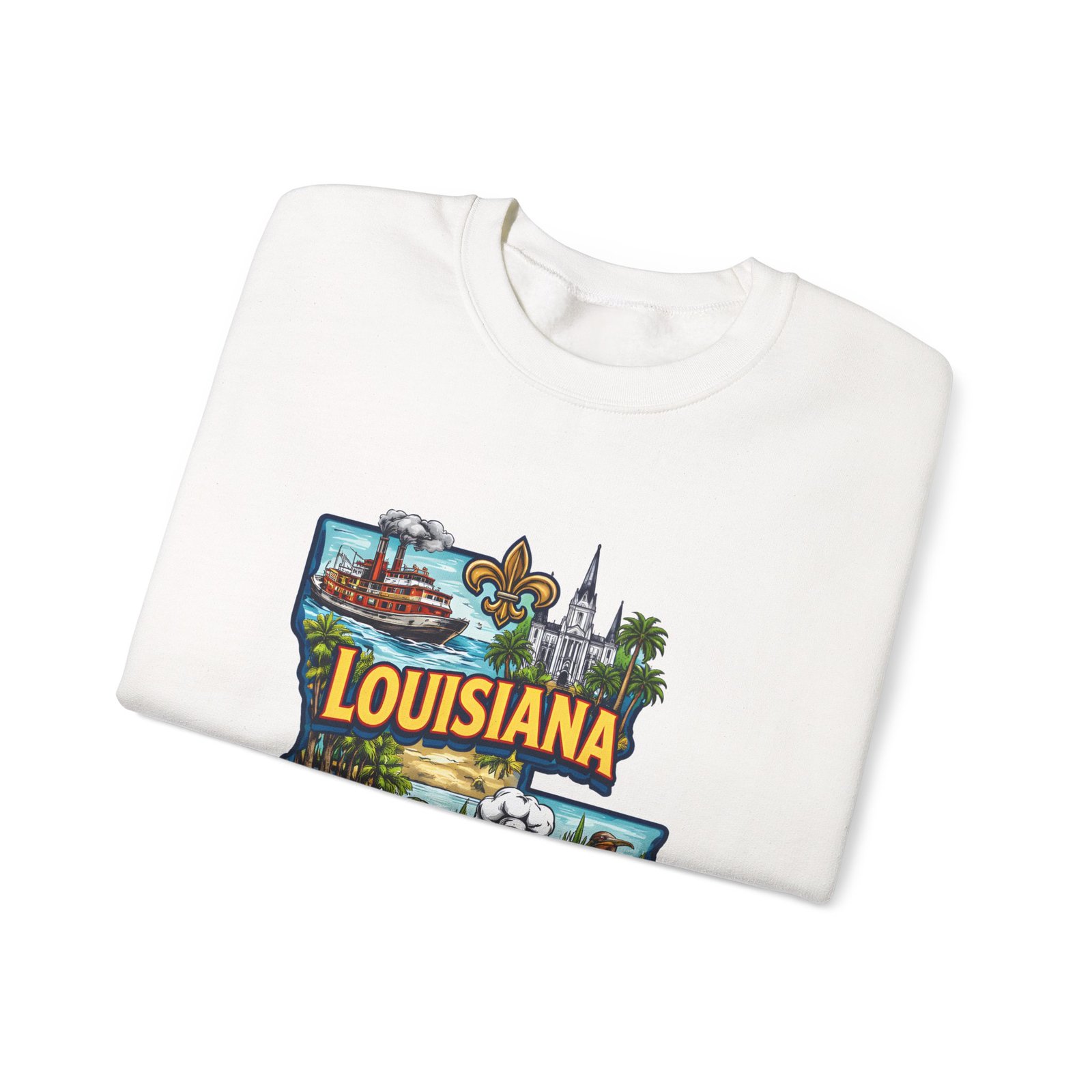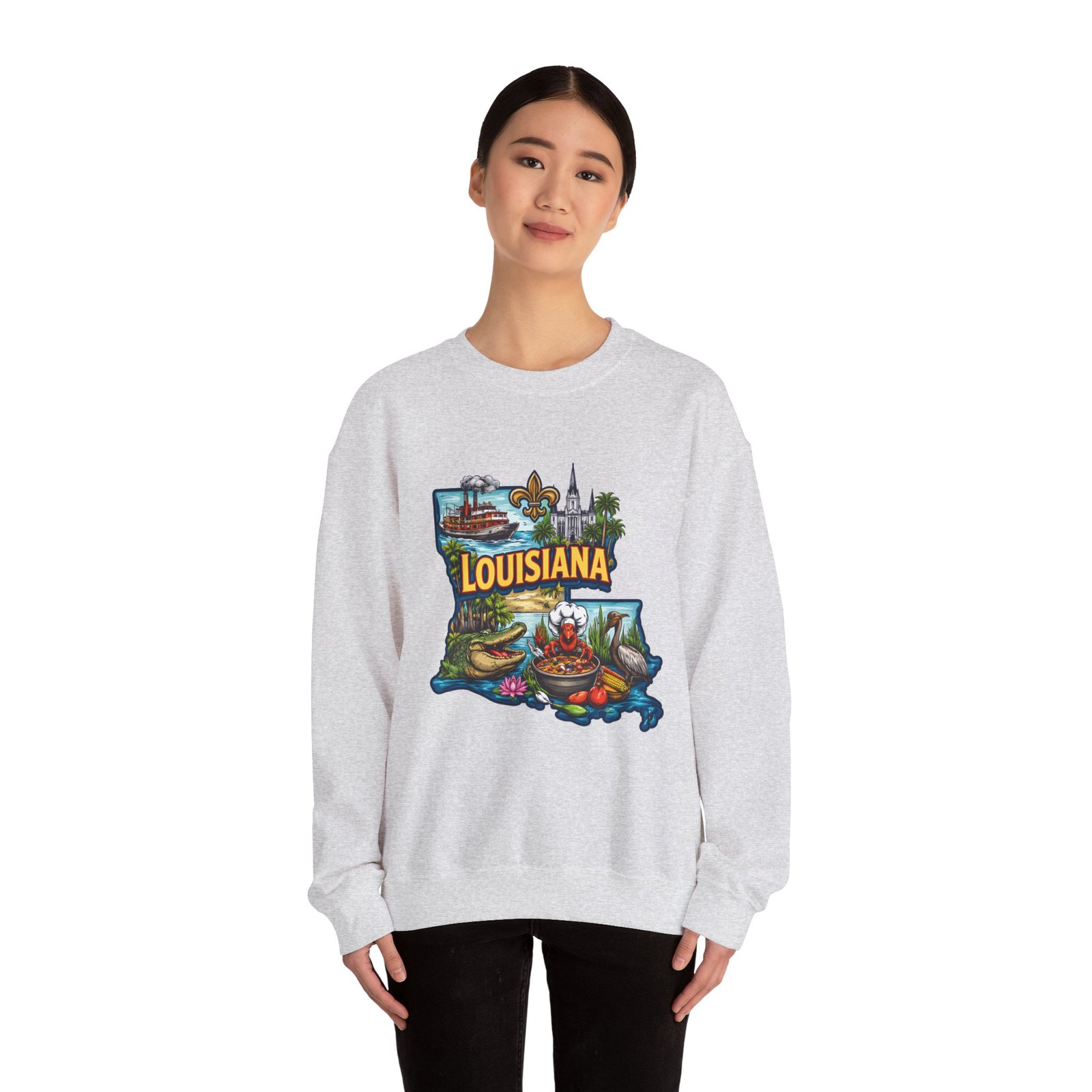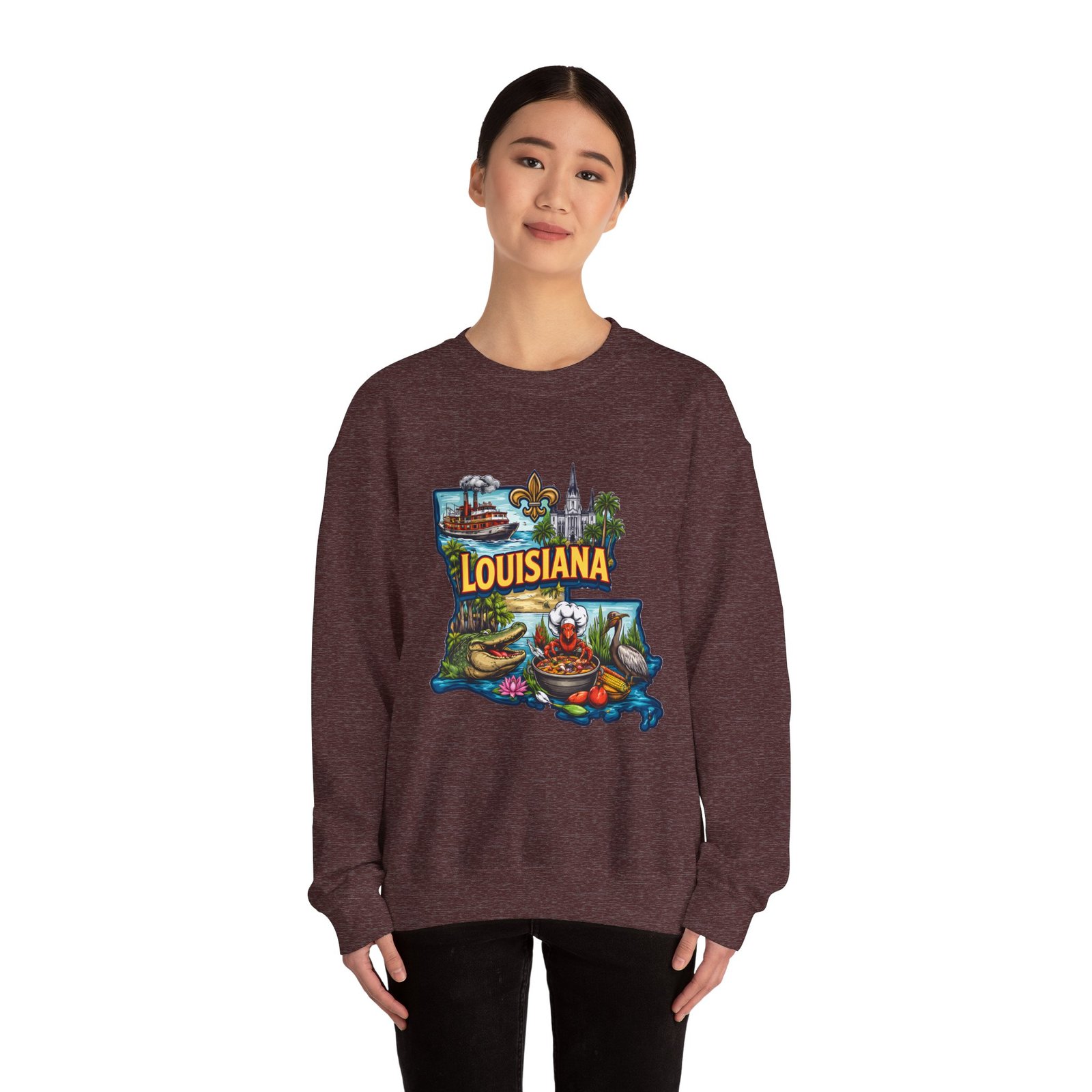 Wrap yourself in slow Sundays, crawfish boils, and moss-draped oaks. This cozy crewneck carries a vibrant Louisiana map print—steamed poboys, a steamboat, cathedral spires, and bayou wildlife—so every wear feels like a road trip down River Road. The medium-heavy 50/50 cotton-poly fabric and ribbed collar give it a lived-in comfort that holds its shape. Thoughtful construction—tubular knit with no side seams and double-needle stitching—means this sweatshirt stays soft and durable through season after season. Subtle DTF inner labels and optional embroidery placements let you add a personal touch without losing the artwork’s bold colors. Slip it on for cool mornings at the market, late-night porch hangs, or the next festival parade; it settles like a familiar soundtrack to the moments you already love.