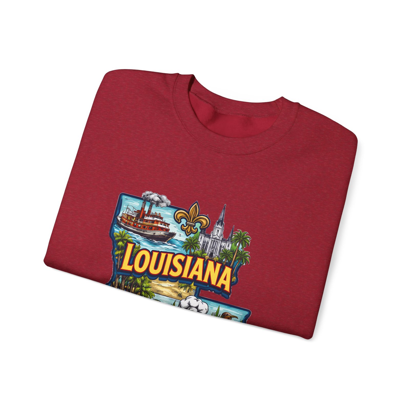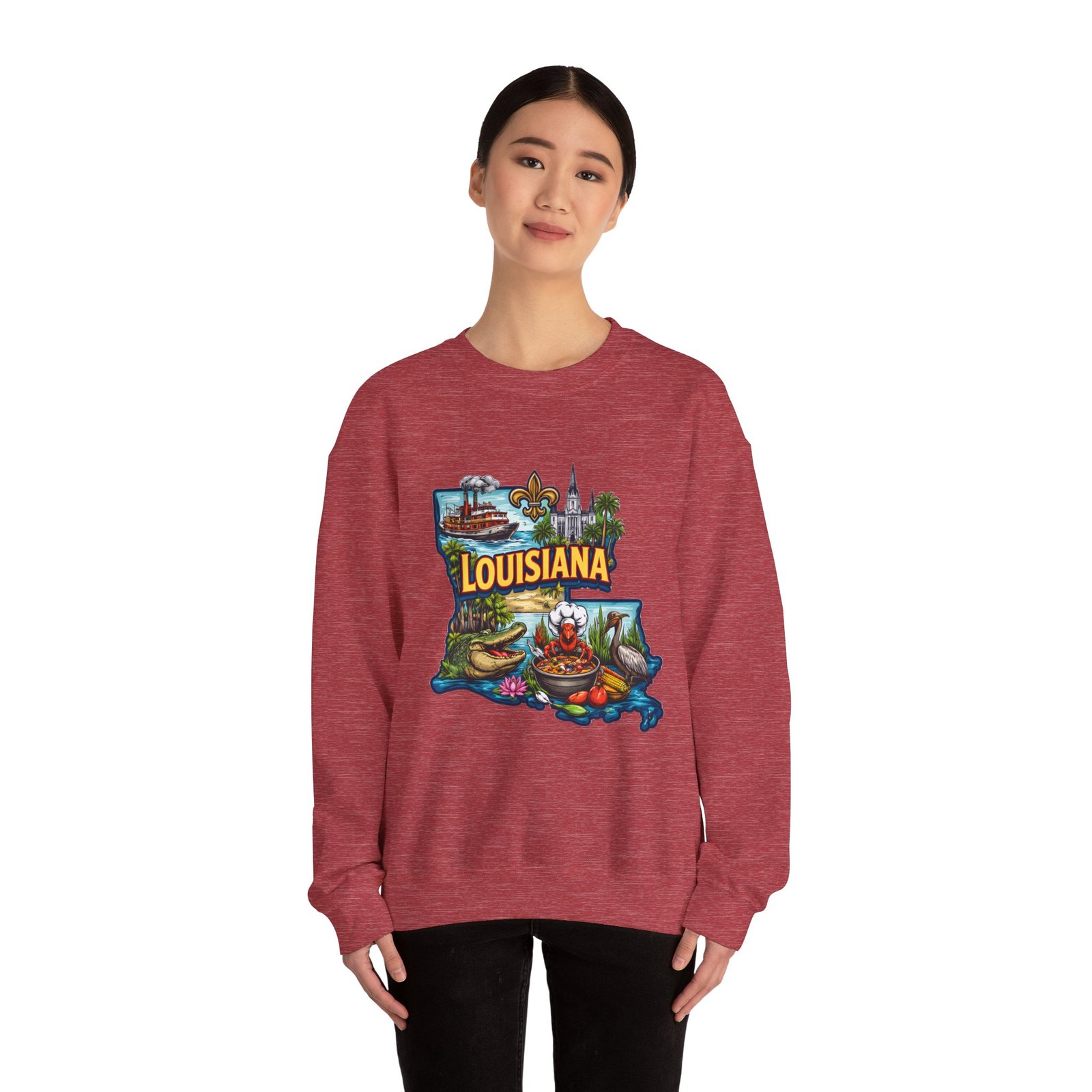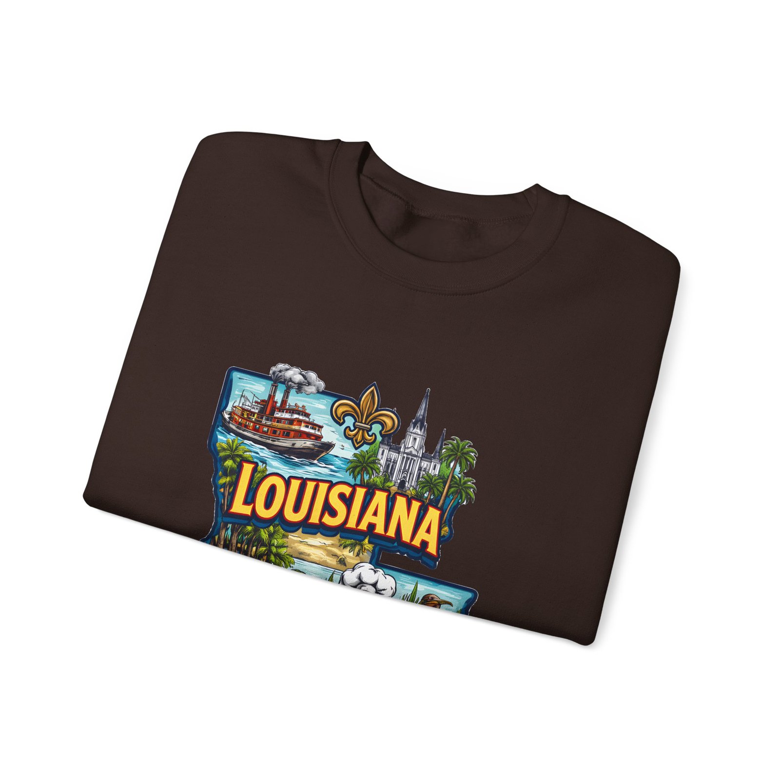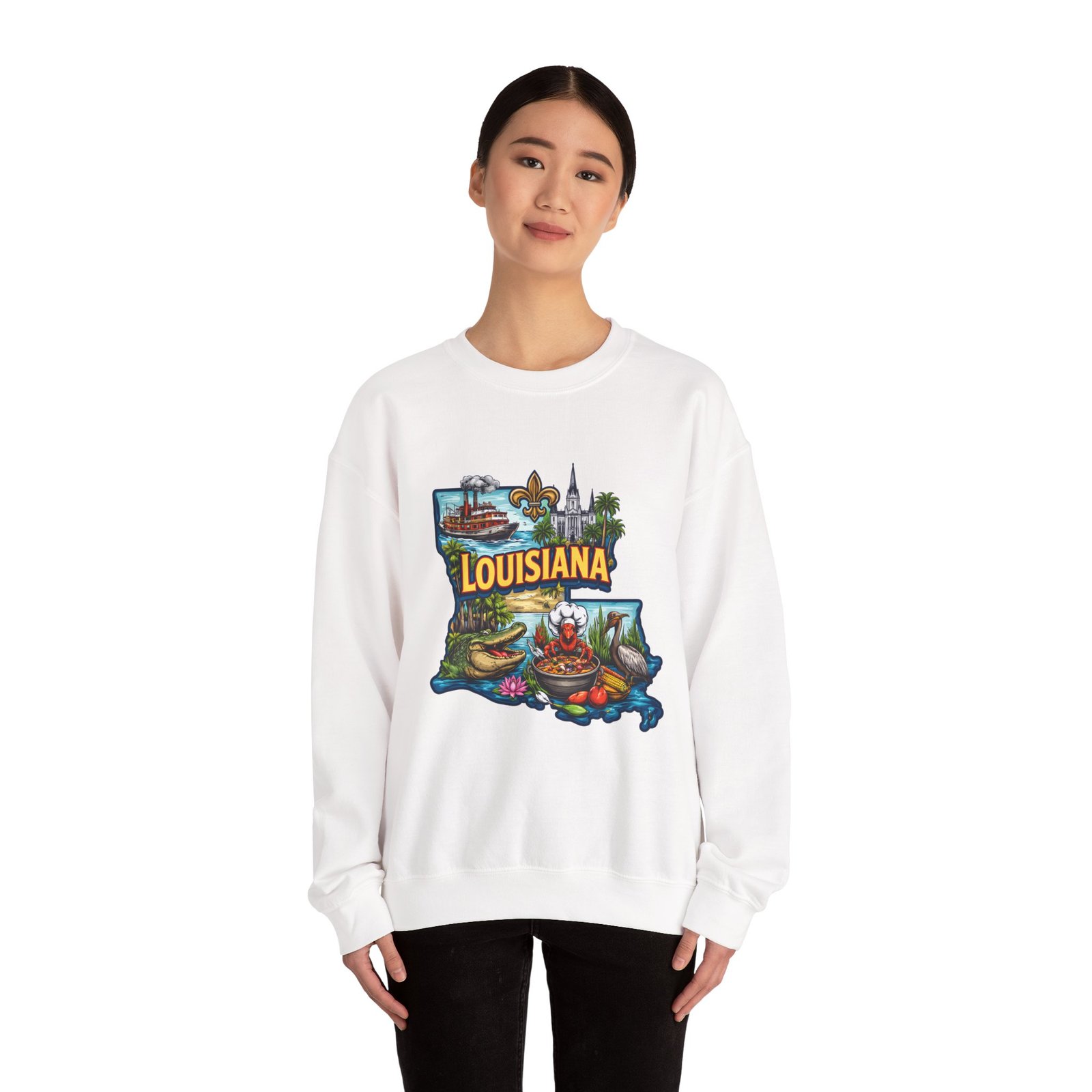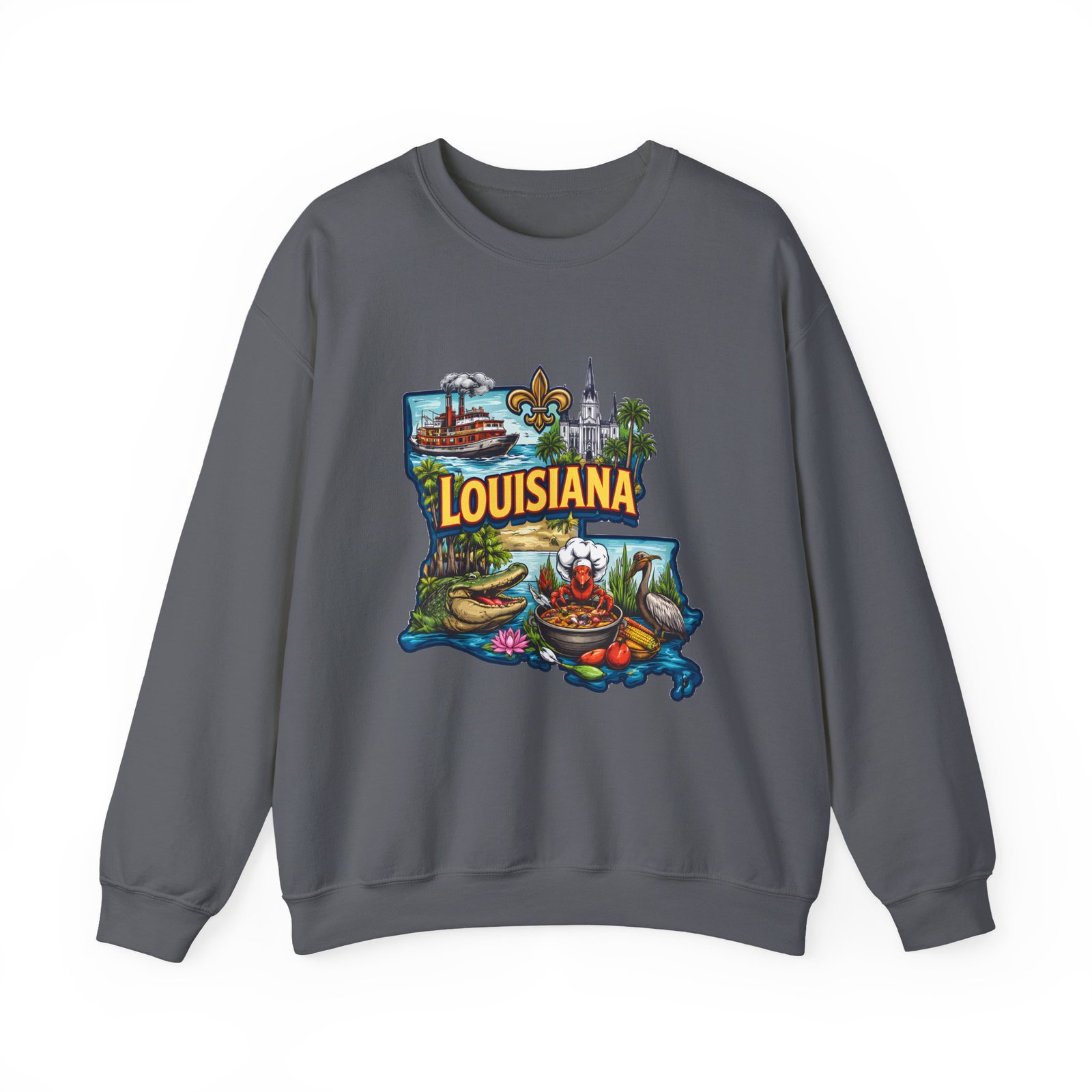 Wrap yourself in slow Sundays, crawfish boils, and moss-draped oaks. This cozy crewneck carries a vibrant Louisiana map print—steamed poboys, a steamboat, cathedral spires, and bayou wildlife—so every wear feels like a road trip down River Road. The medium-heavy 50/50 cotton-poly fabric and ribbed collar give it a lived-in comfort that holds its shape. Thoughtful construction—tubular knit with no side seams and double-needle stitching—means this sweatshirt stays soft and durable through season after season. Subtle DTF inner labels and optional embroidery placements let you add a personal touch without losing the artwork’s bold colors. Slip it on for cool mornings at the market, late-night porch hangs, or the next festival parade; it settles like a familiar soundtrack to the moments you already love.