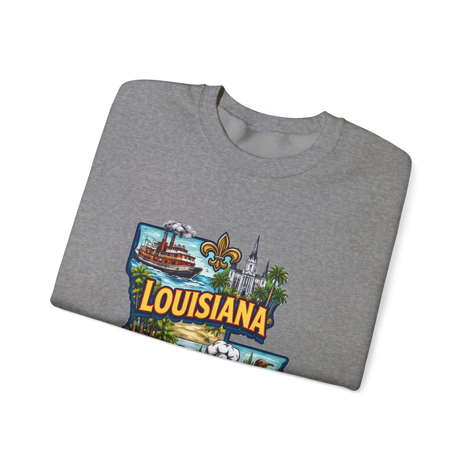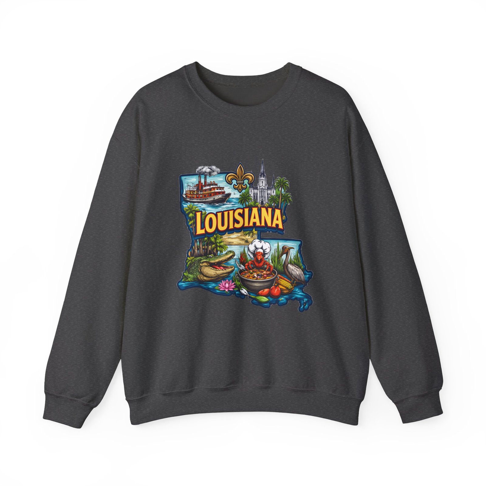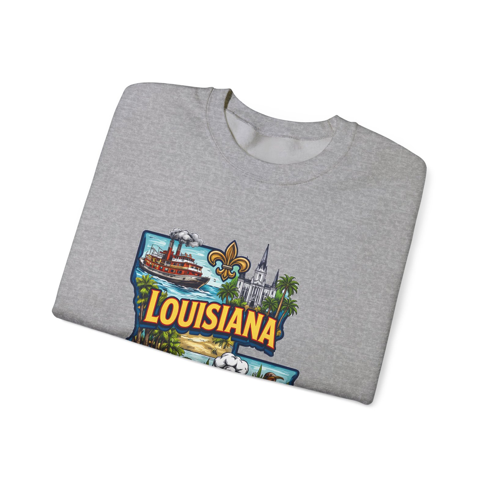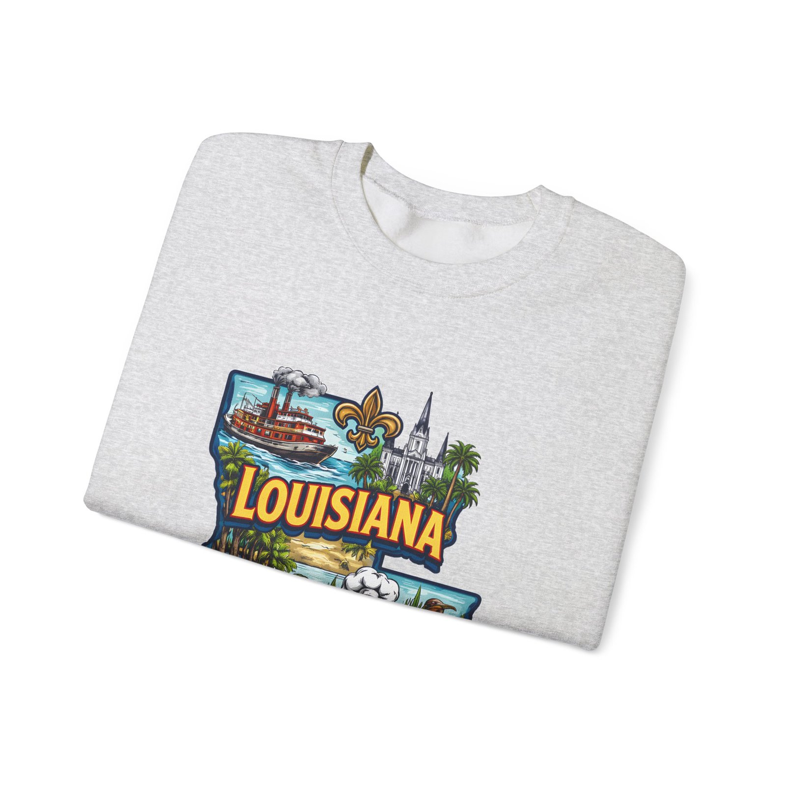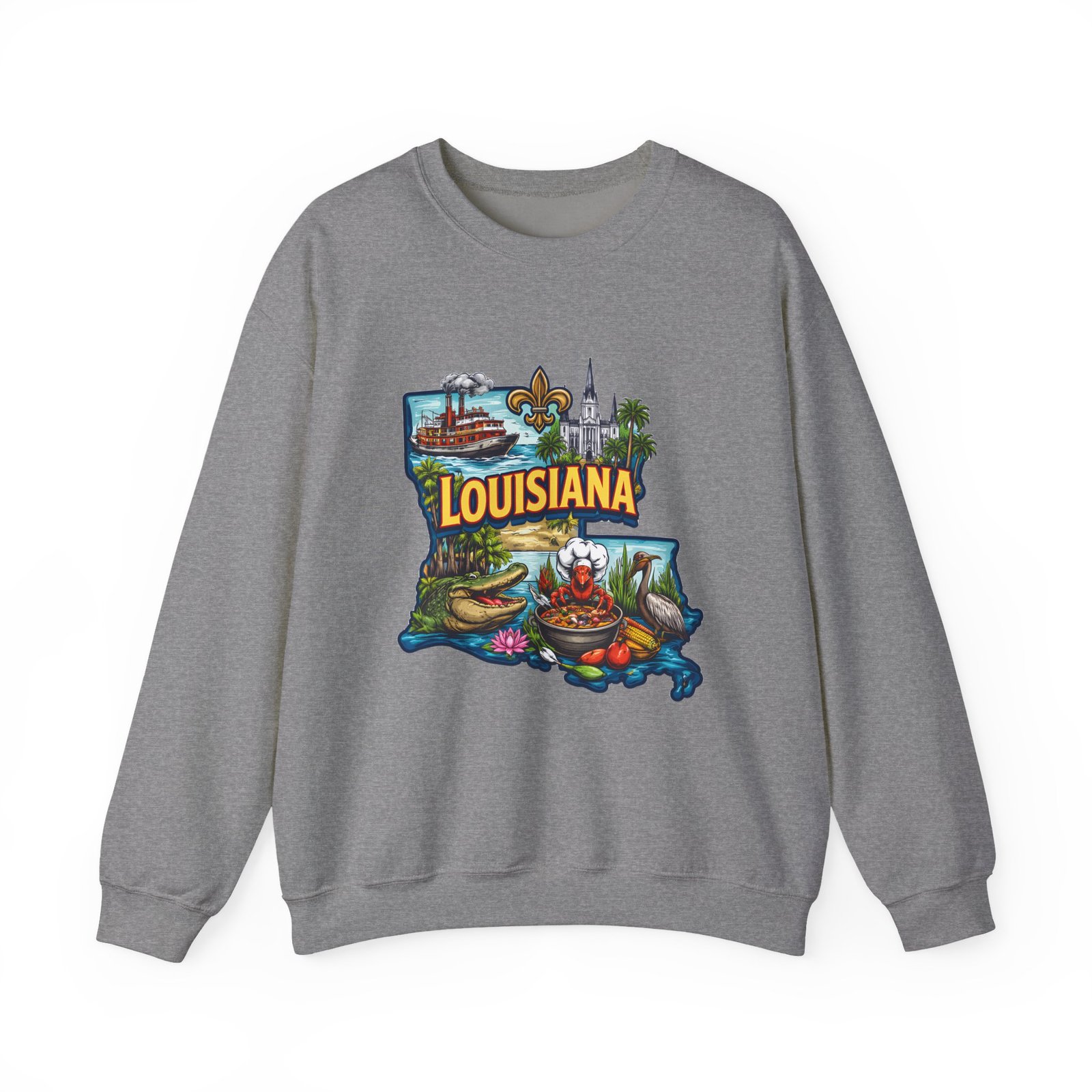 Wrap yourself in slow Sundays, crawfish boils, and moss-draped oaks. This cozy crewneck carries a vibrant Louisiana map print—steamed poboys, a steamboat, cathedral spires, and bayou wildlife—so every wear feels like a road trip down River Road. The medium-heavy 50/50 cotton-poly fabric and ribbed collar give it a lived-in comfort that holds its shape. Thoughtful construction—tubular knit with no side seams and double-needle stitching—means this sweatshirt stays soft and durable through season after season. Subtle DTF inner labels and optional embroidery placements let you add a personal touch without losing the artwork’s bold colors. Slip it on for cool mornings at the market, late-night porch hangs, or the next festival parade; it settles like a familiar soundtrack to the moments you already love.