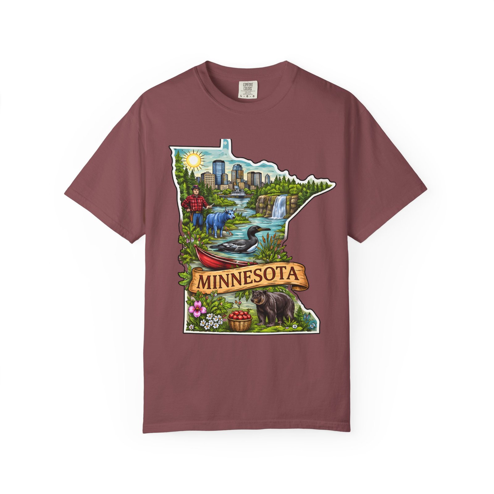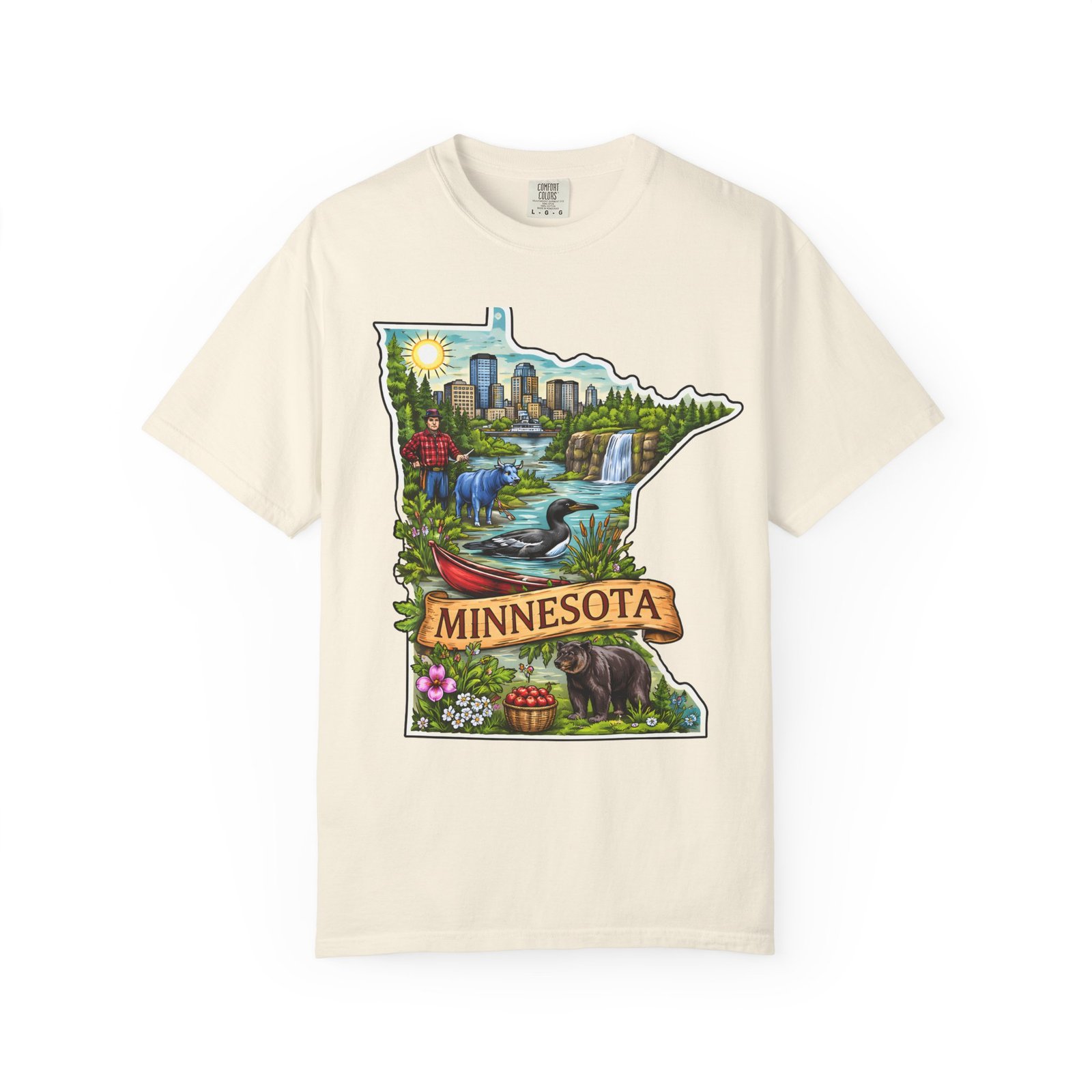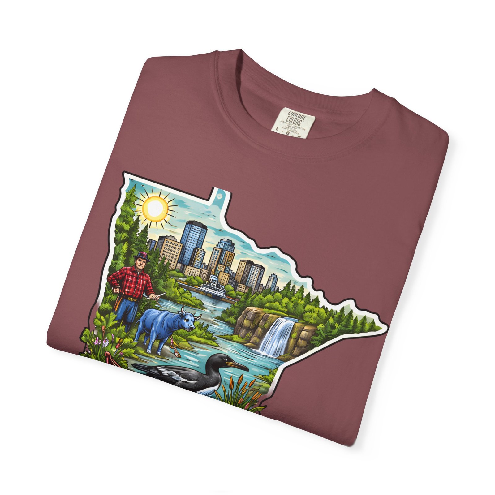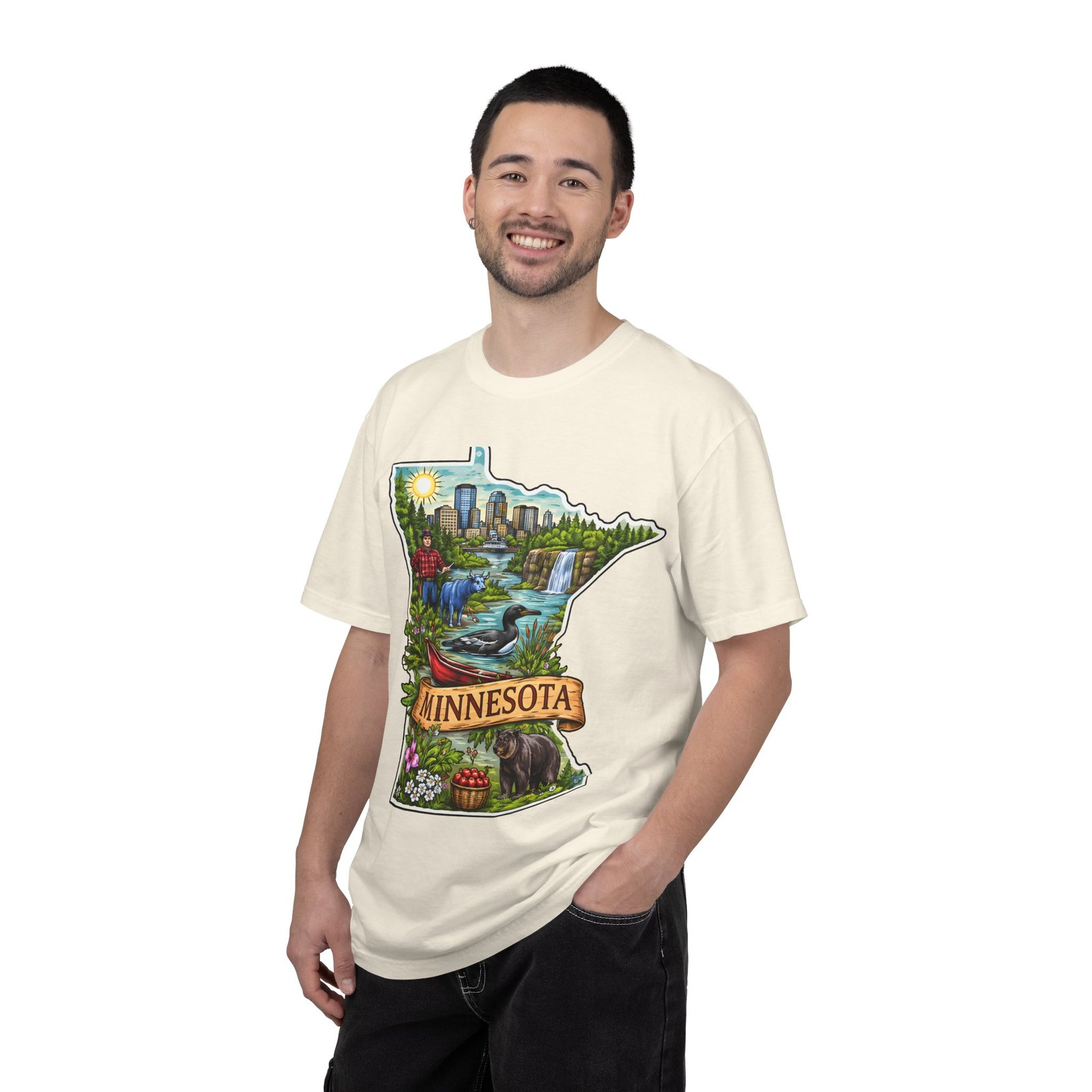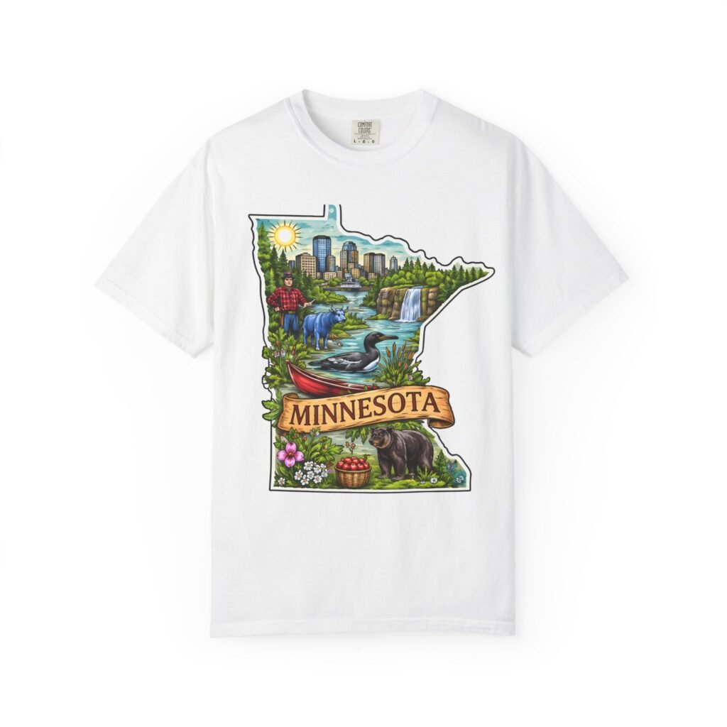 This garment-dyed tee carries Minnesota on its chest — a small landscape that feels like home. The state-shaped art blends city skyline, lakes, waterfalls and woods into a warm, hand-illustrated scene. Wear it on cool mornings by the lake, while exploring river trails, or at neighborhood gatherings to quietly show where your roots (or wanderlust) belong. The soft, slightly faded color from the garment-dye and the relaxed, heavyweight cut make this shirt feel lived-in from day one. It layers easily under jackets for crisp fall outings and stands up to weekend wear without losing its comfortable drape.