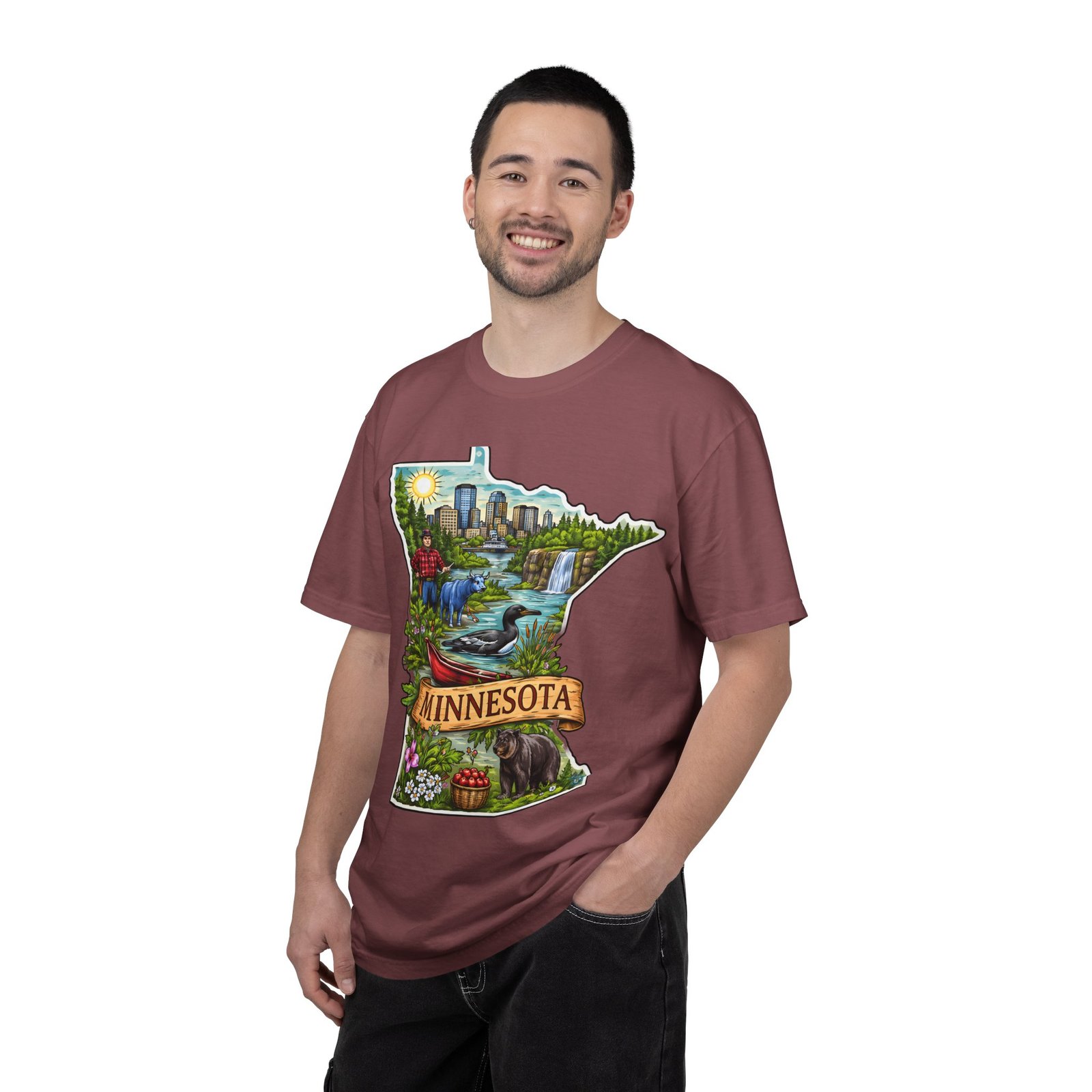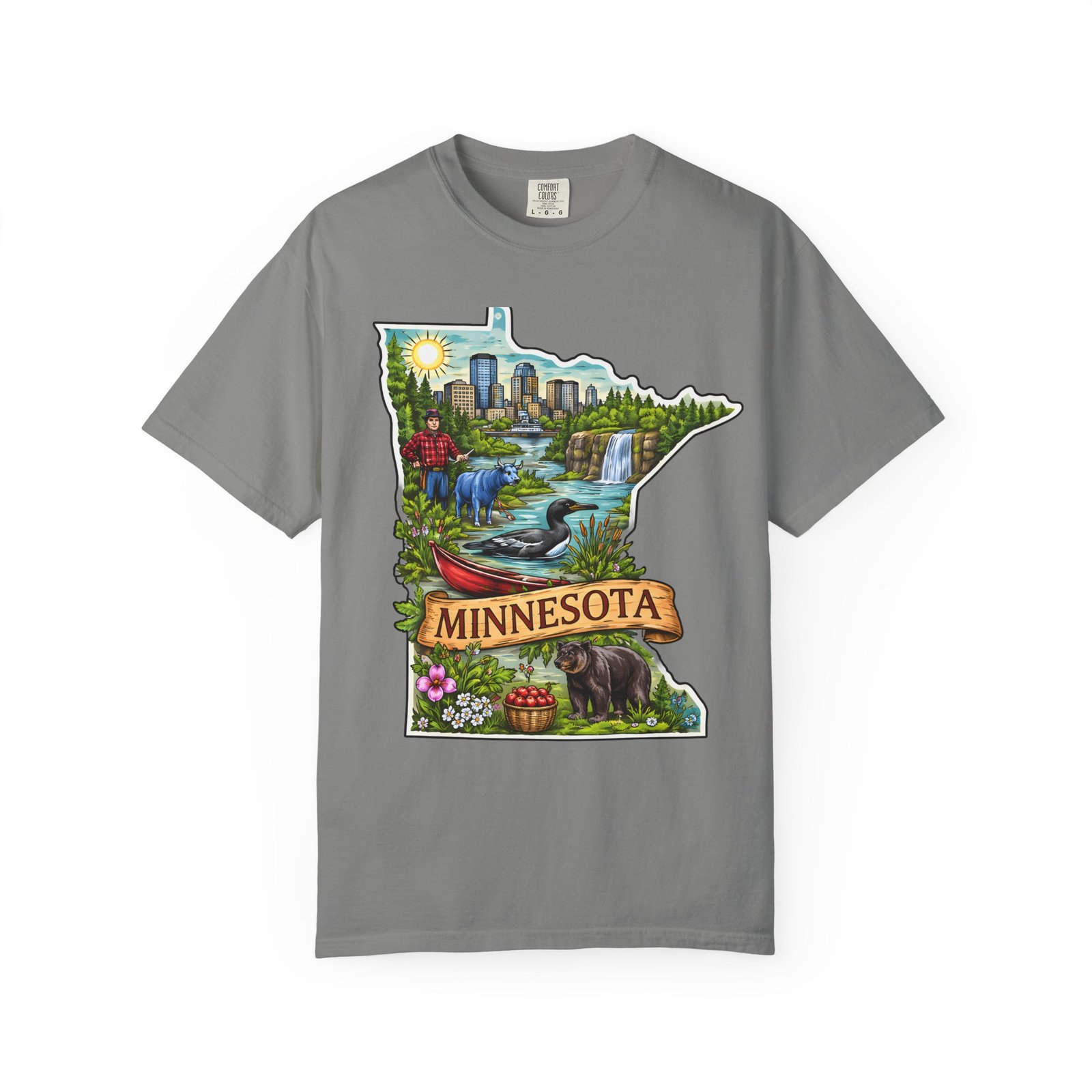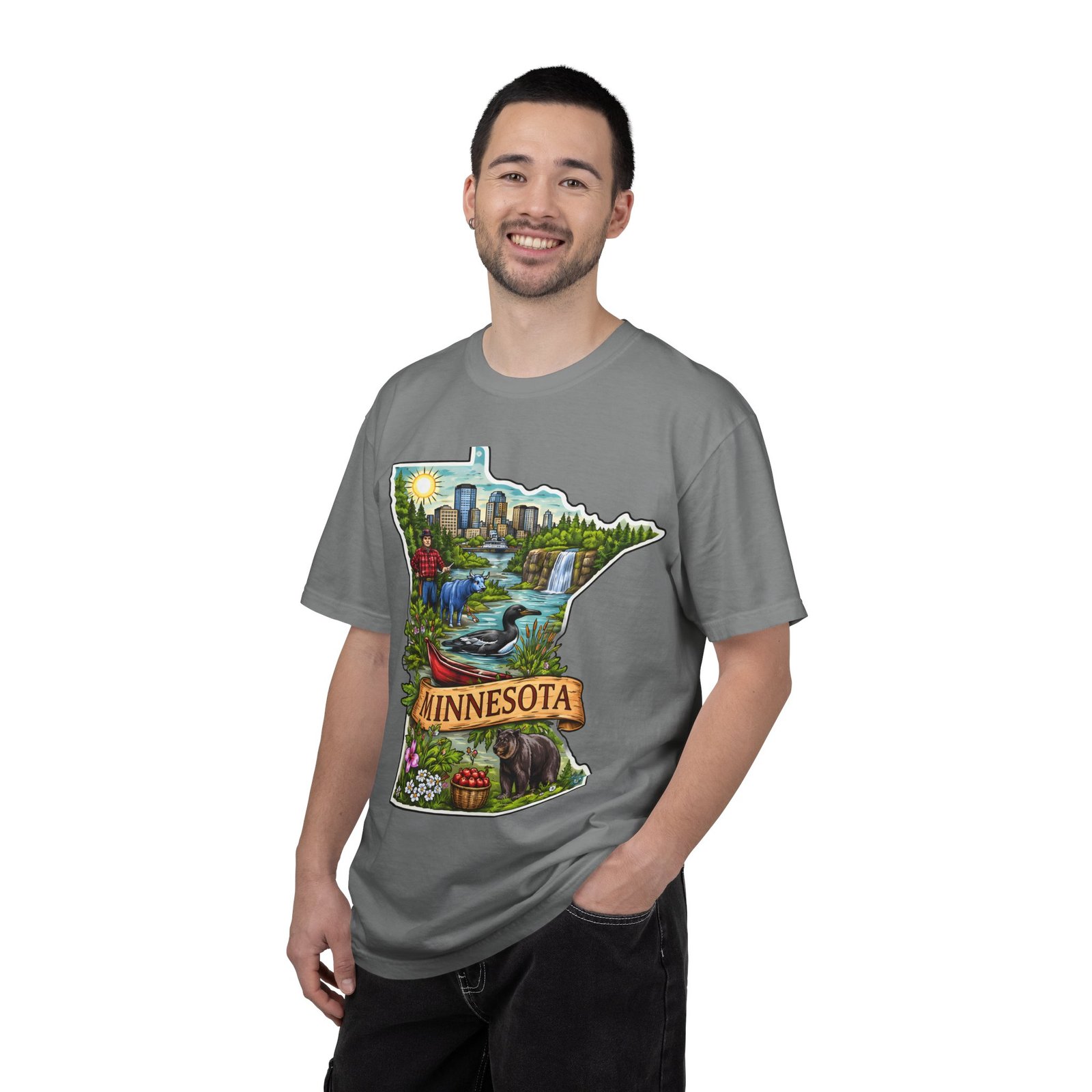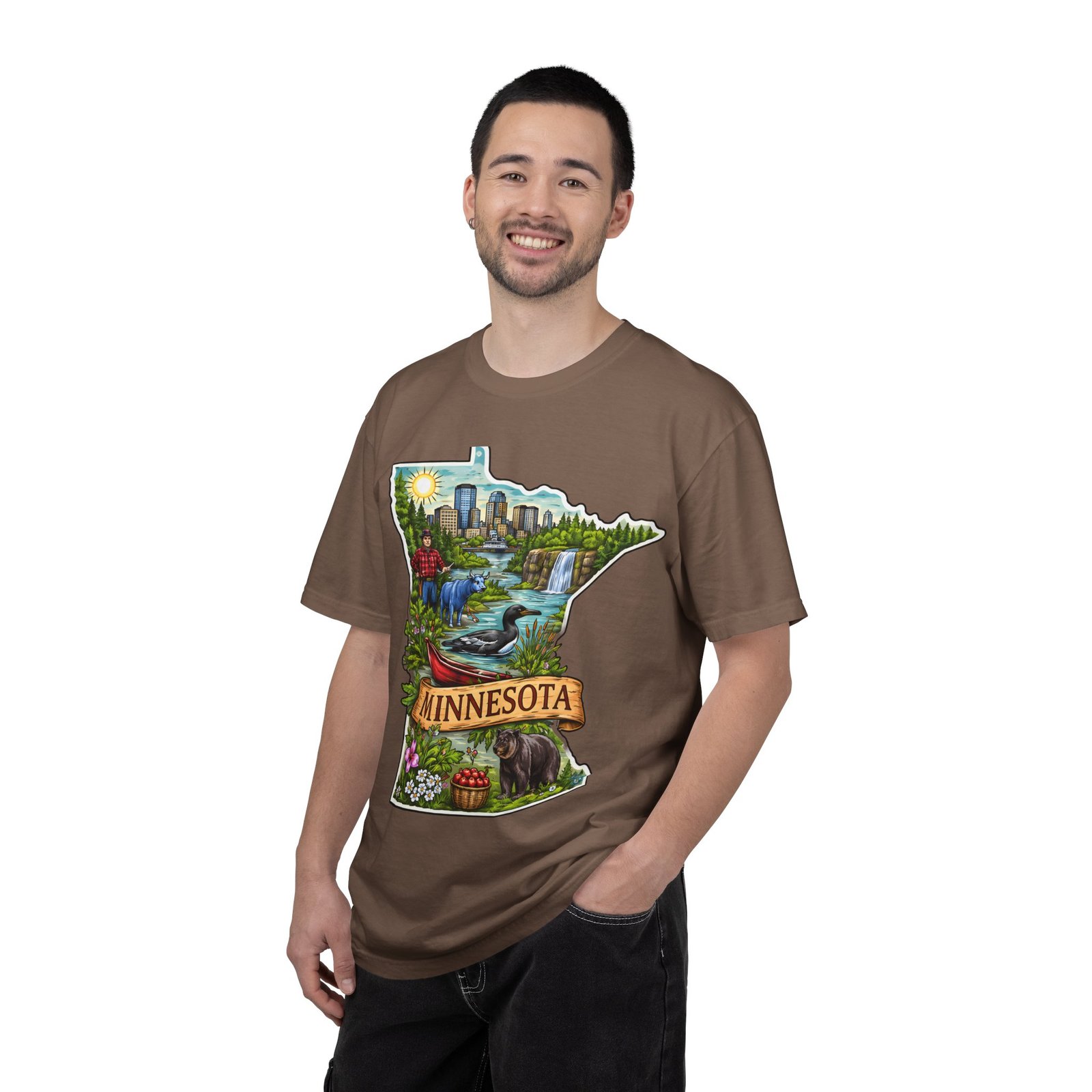 This garment-dyed tee carries Minnesota on its chest — a small landscape that feels like home. The state-shaped art blends city skyline, lakes, waterfalls and woods into a warm, hand-illustrated scene. Wear it on cool mornings by the lake, while exploring river trails, or at neighborhood gatherings to quietly show where your roots (or wanderlust) belong. The soft, slightly faded color from the garment-dye and the relaxed, heavyweight cut make this shirt feel lived-in from day one. It layers easily under jackets for crisp fall outings and stands up to weekend wear without losing its comfortable drape.