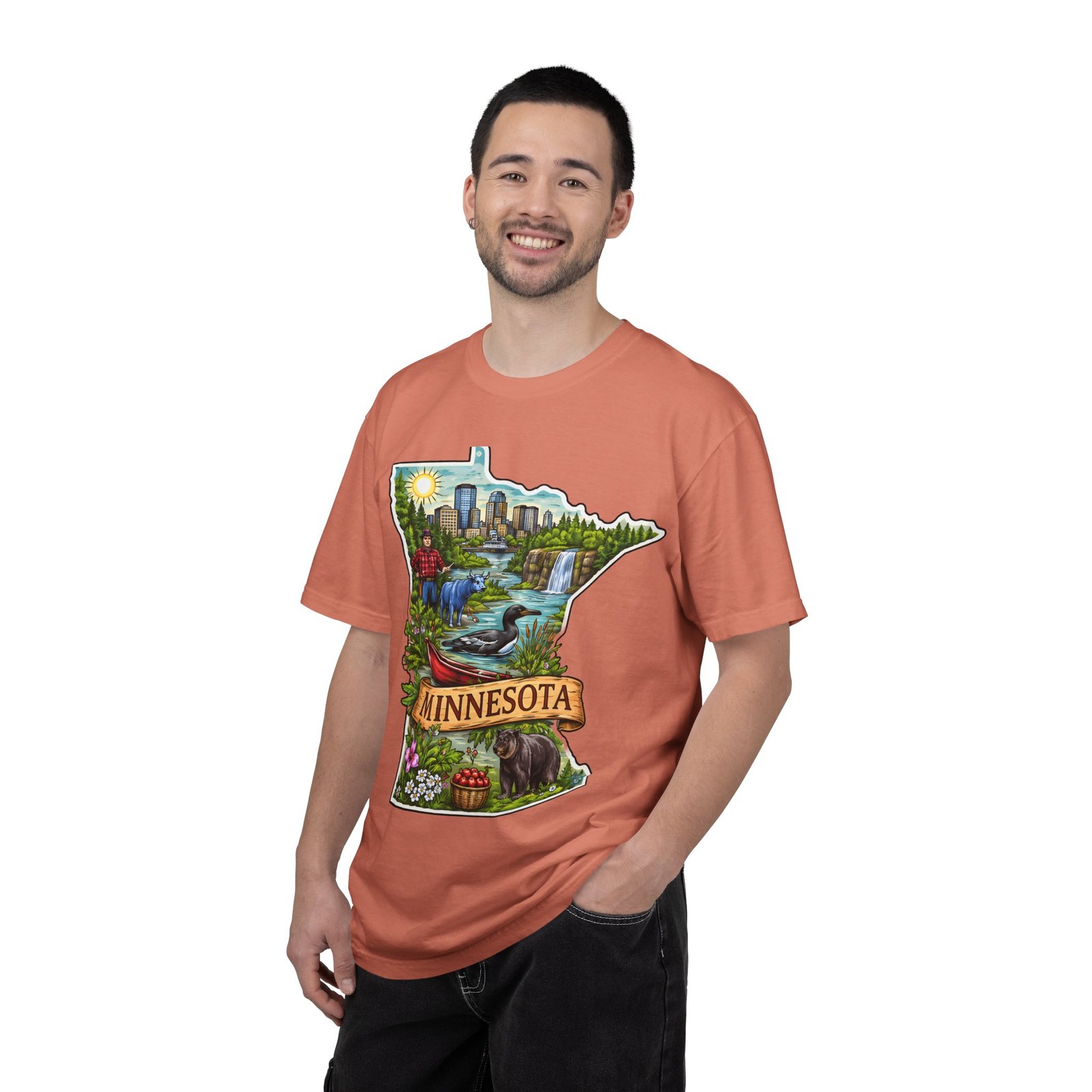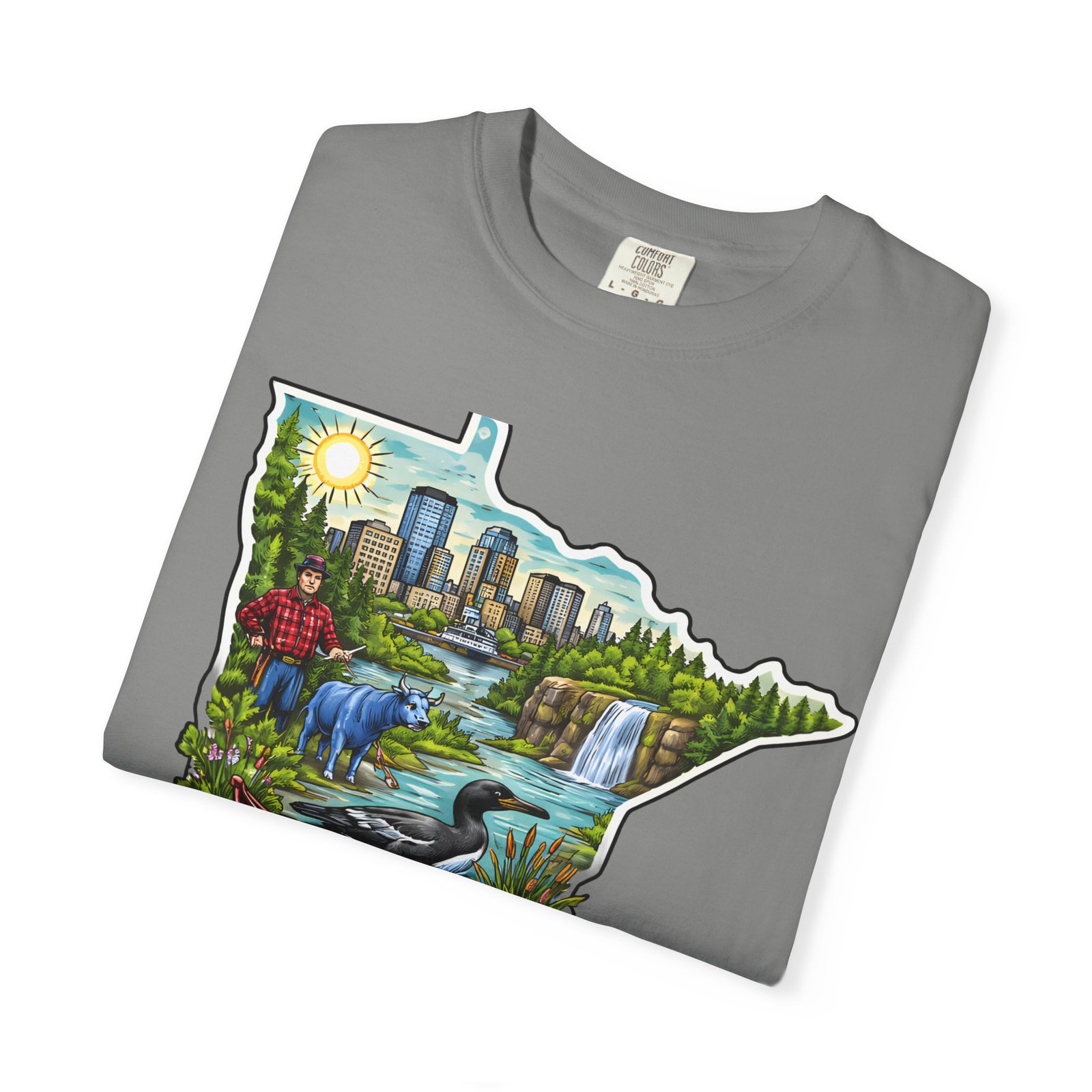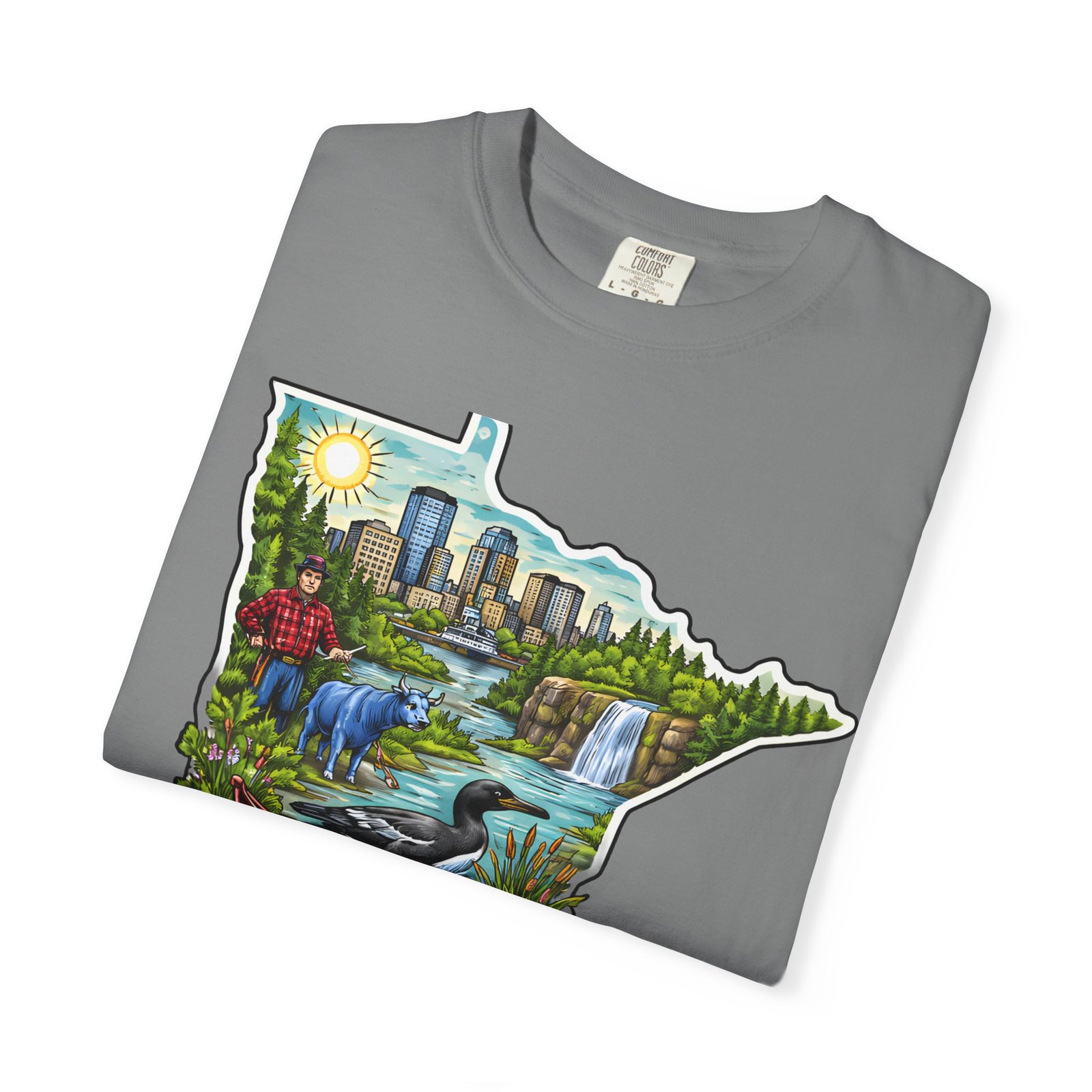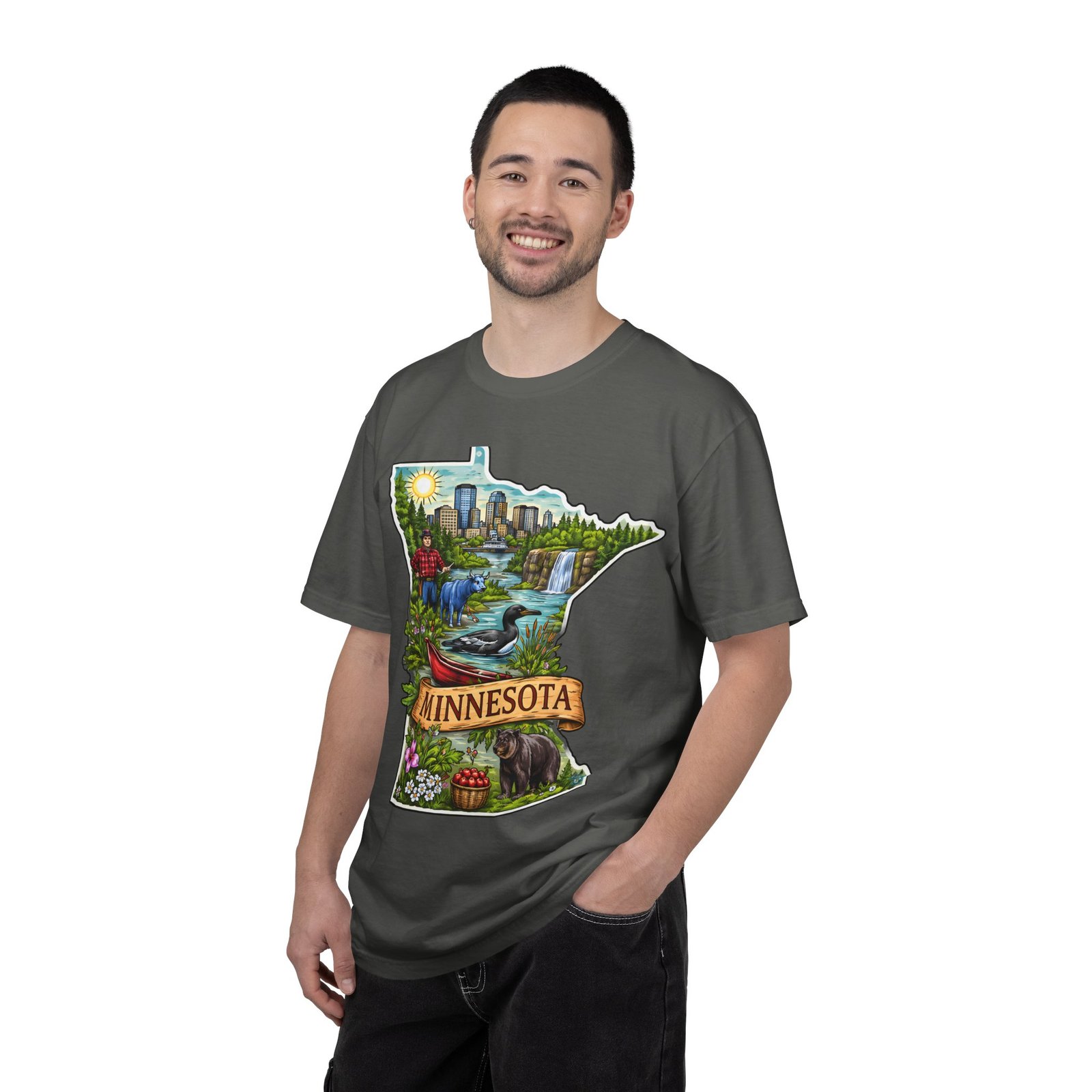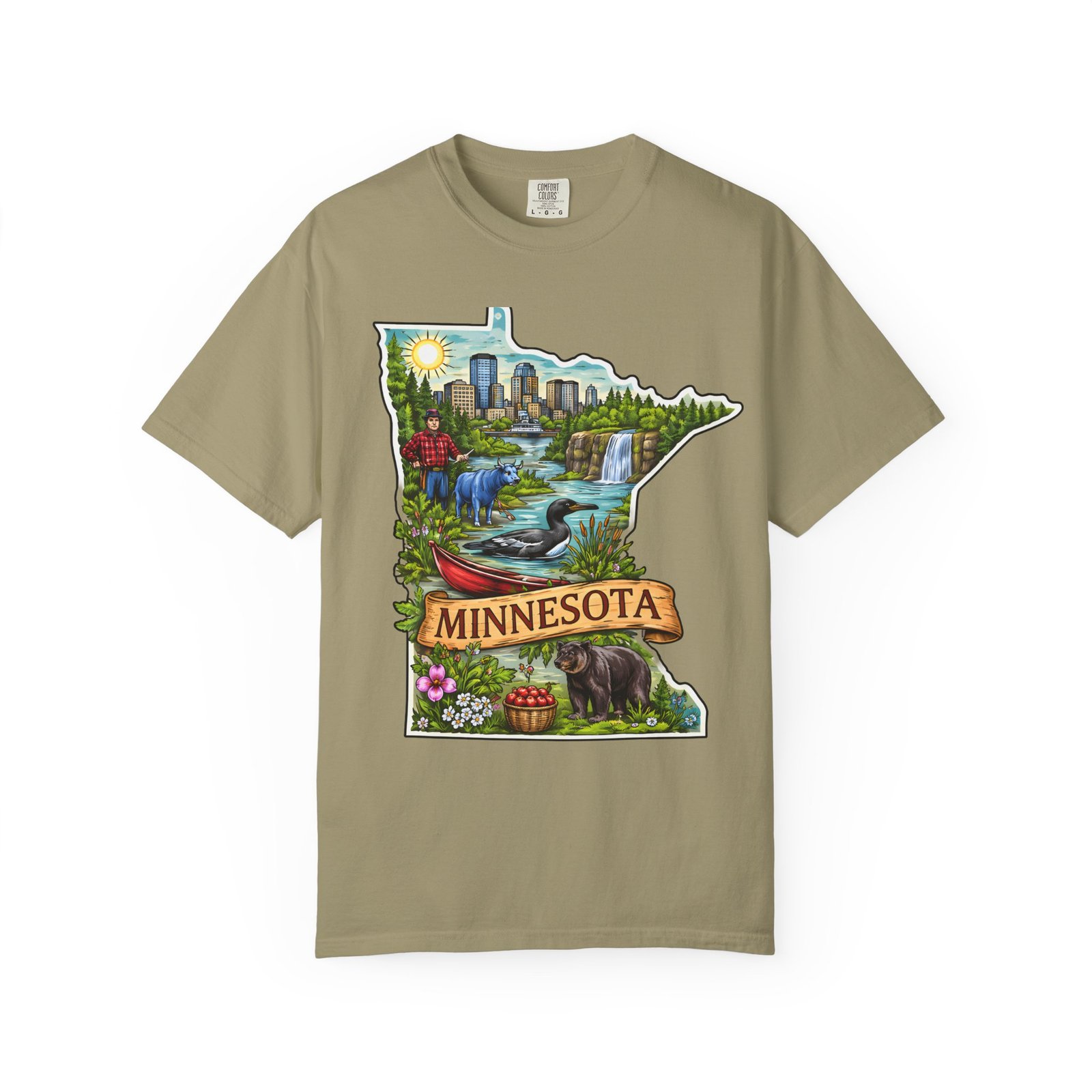 This garment-dyed tee carries Minnesota on its chest — a small landscape that feels like home. The state-shaped art blends city skyline, lakes, waterfalls and woods into a warm, hand-illustrated scene. Wear it on cool mornings by the lake, while exploring river trails, or at neighborhood gatherings to quietly show where your roots (or wanderlust) belong. The soft, slightly faded color from the garment-dye and the relaxed, heavyweight cut make this shirt feel lived-in from day one. It layers easily under jackets for crisp fall outings and stands up to weekend wear without losing its comfortable drape.