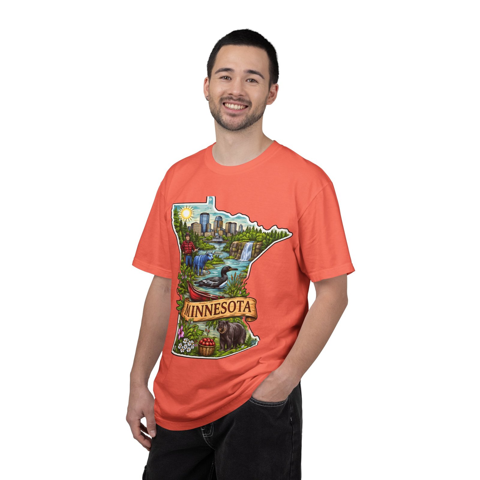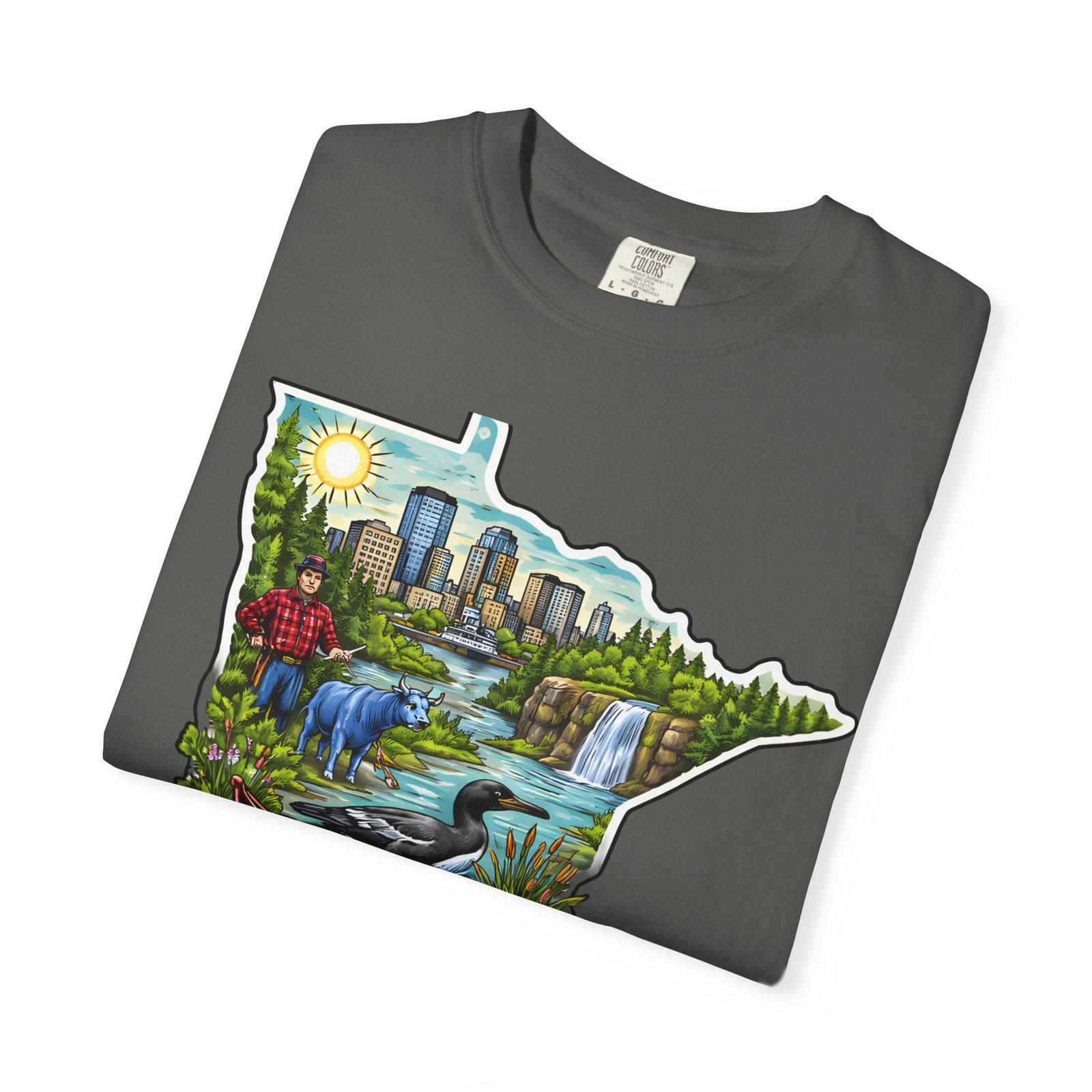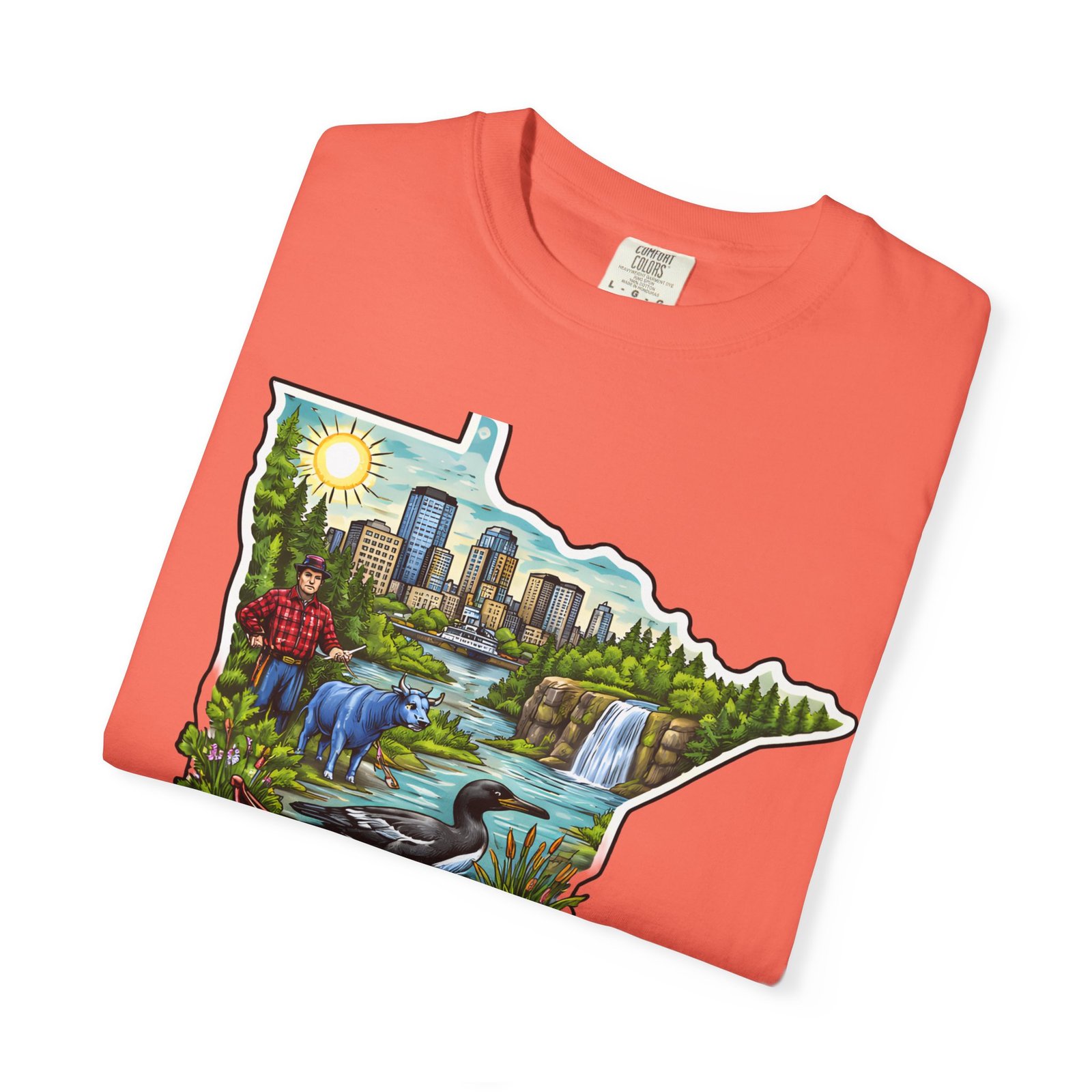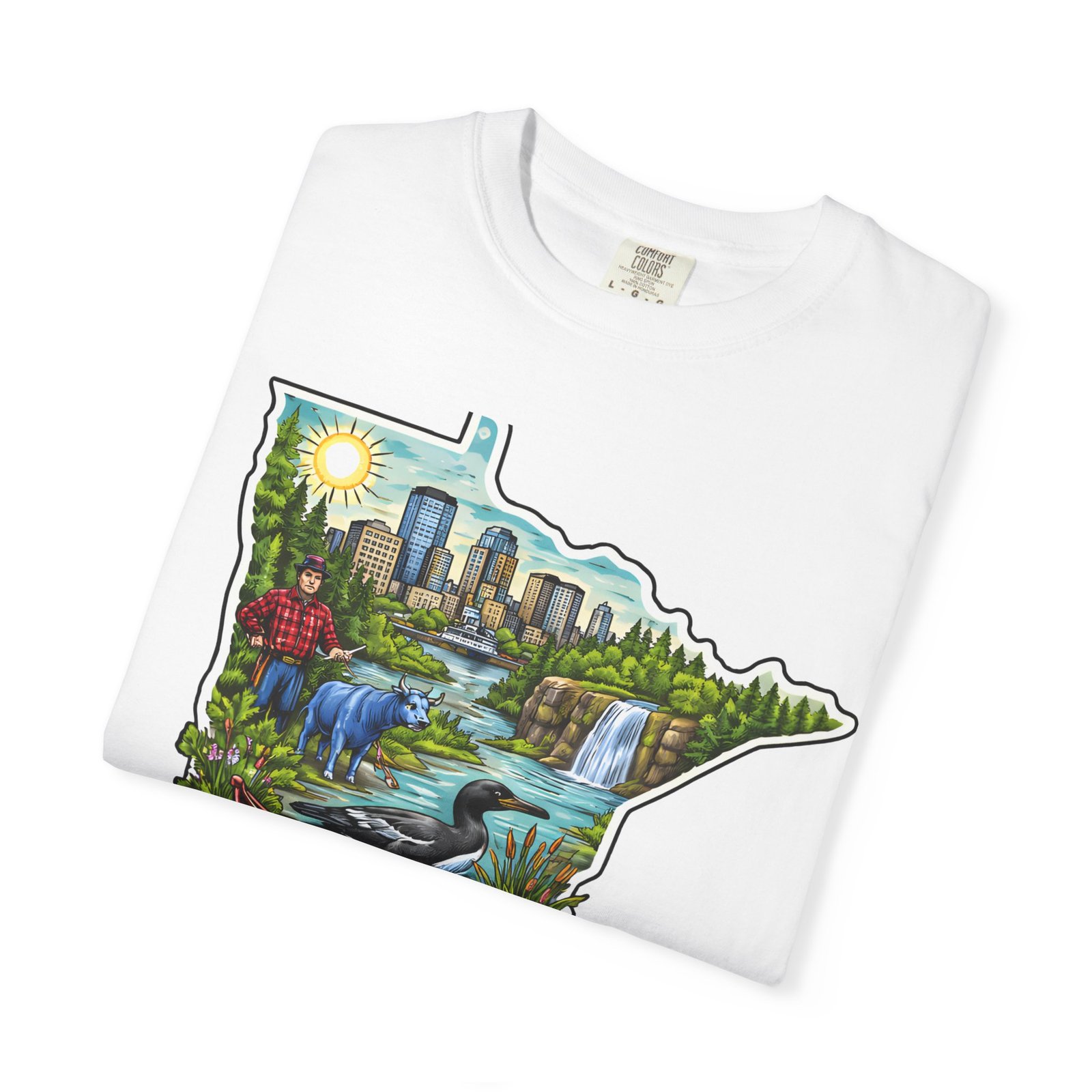 This garment-dyed tee carries Minnesota on its chest — a small landscape that feels like home. The state-shaped art blends city skyline, lakes, waterfalls and woods into a warm, hand-illustrated scene. Wear it on cool mornings by the lake, while exploring river trails, or at neighborhood gatherings to quietly show where your roots (or wanderlust) belong. The soft, slightly faded color from the garment-dye and the relaxed, heavyweight cut make this shirt feel lived-in from day one. It layers easily under jackets for crisp fall outings and stands up to weekend wear without losing its comfortable drape.