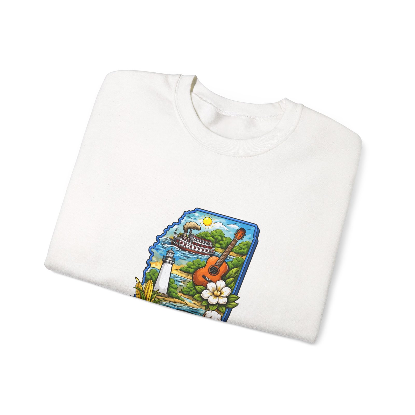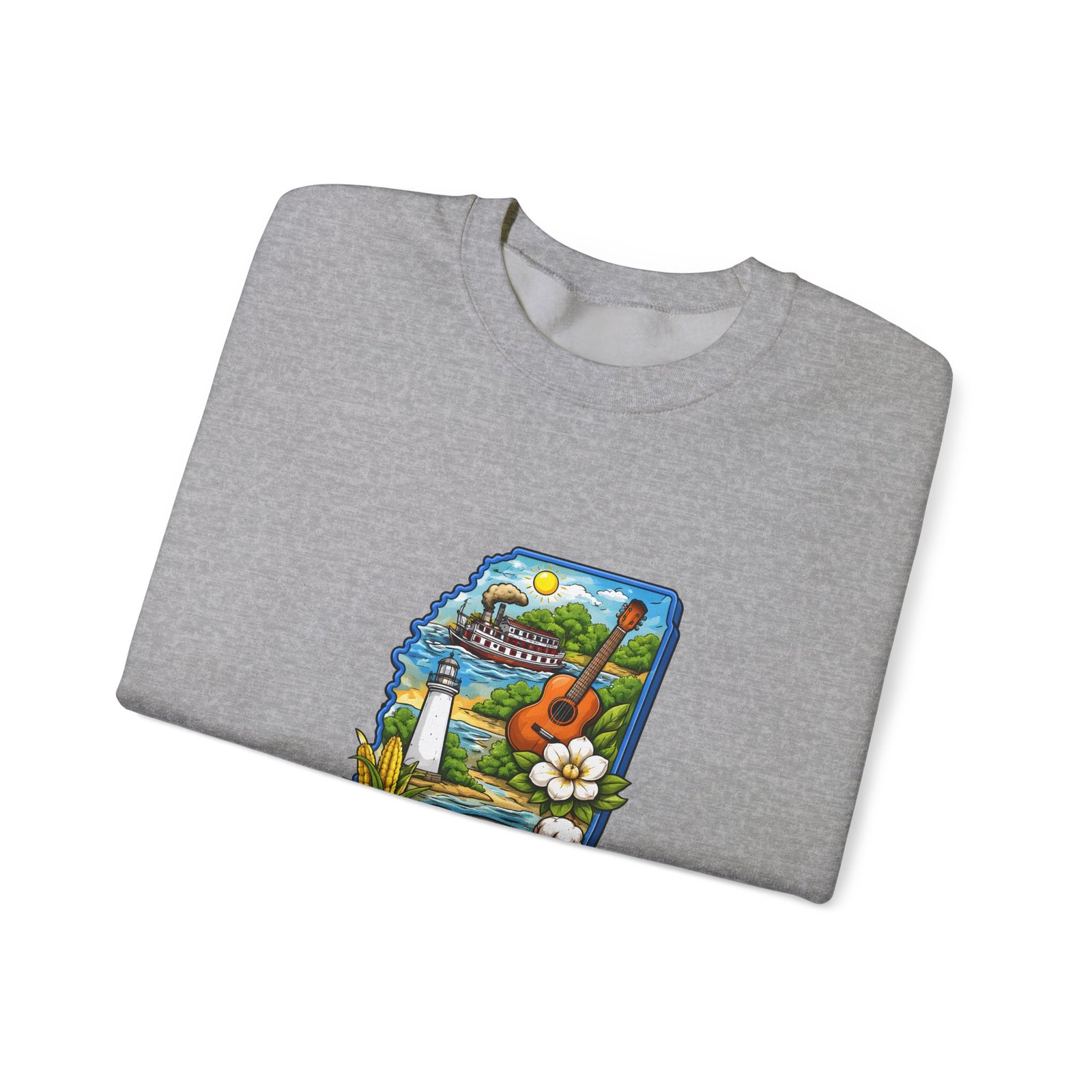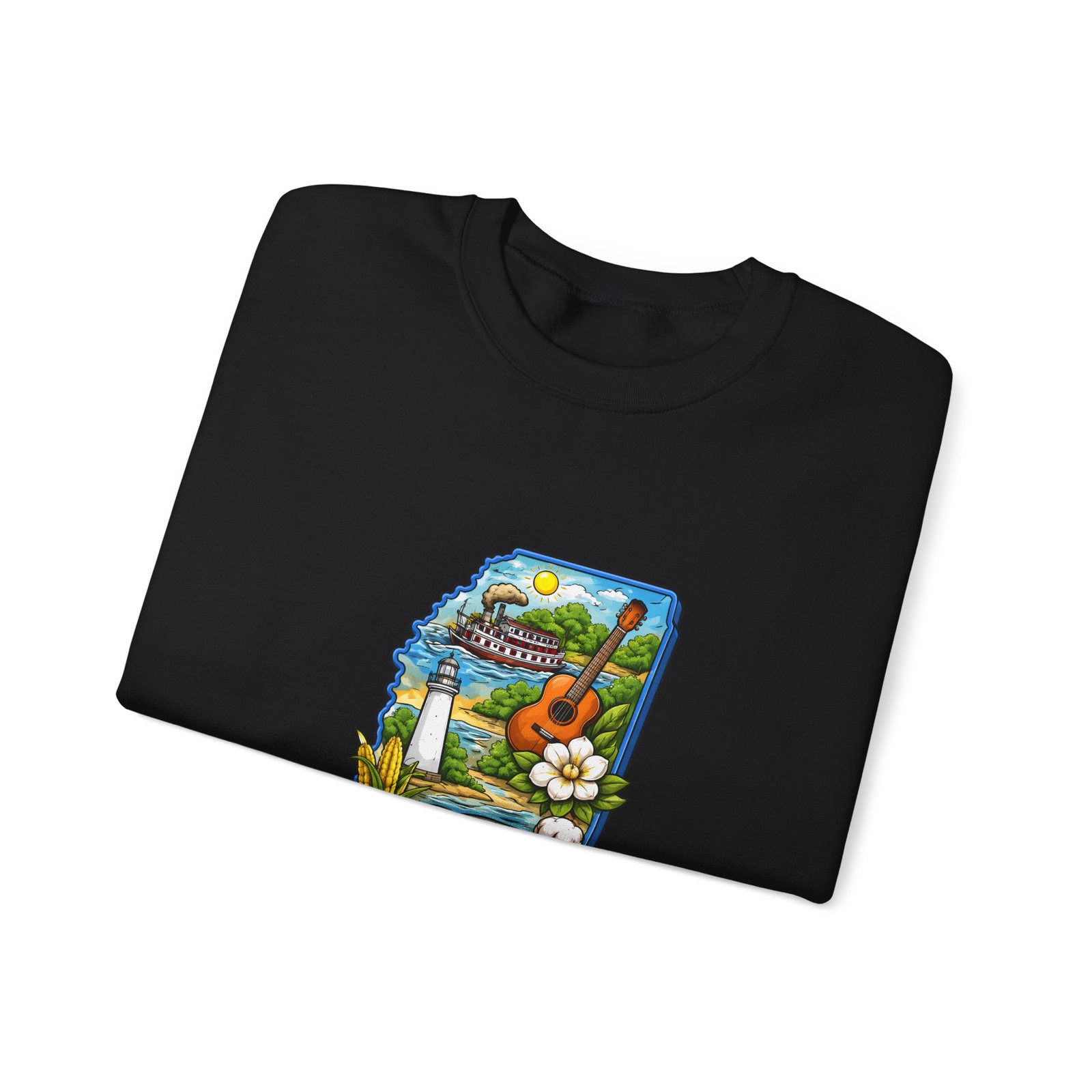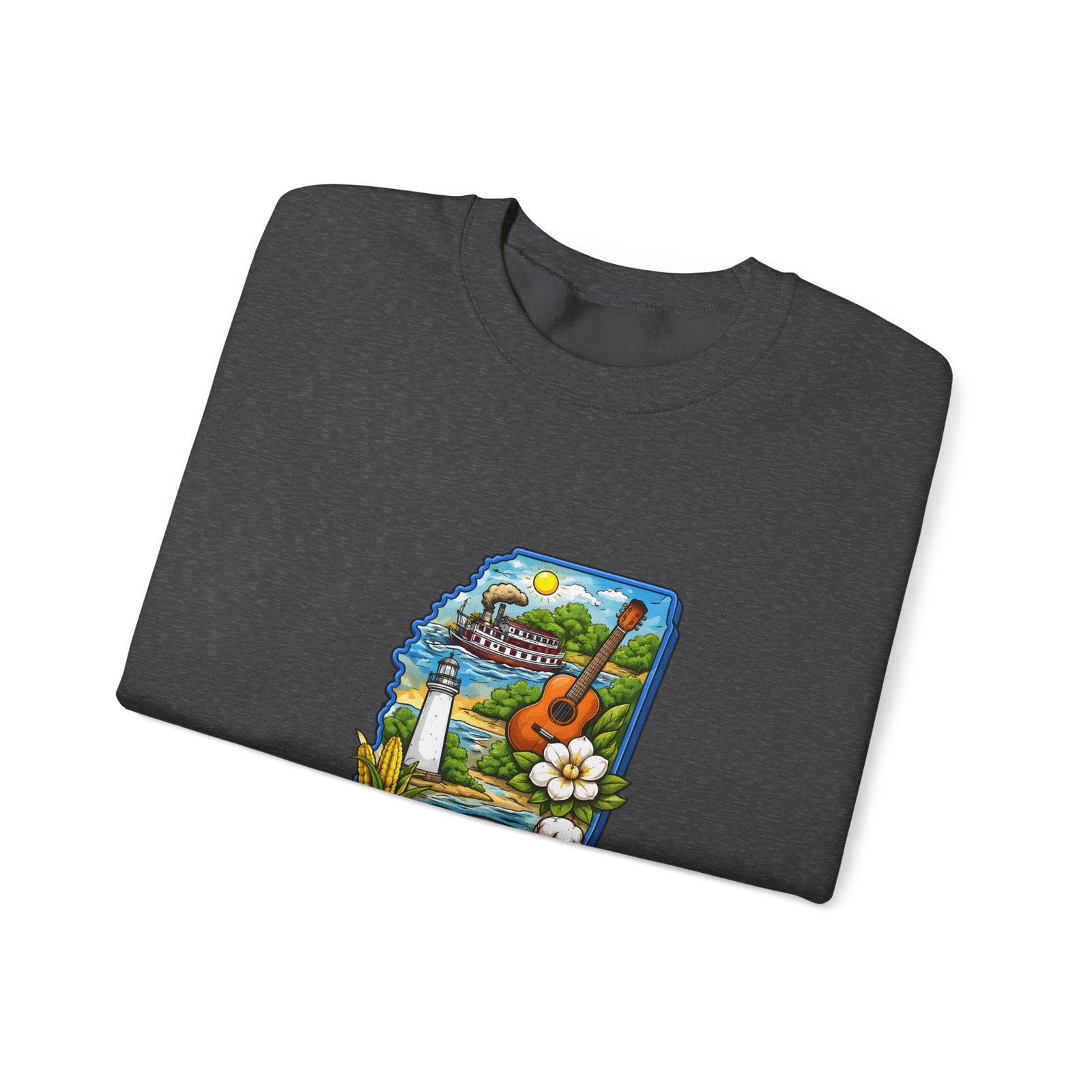 A cozy, midweight sweatshirt that feels like a calm afternoon on the river. The soft cotton-poly blend holds a vibrant, park-like illustration of Mississippi—complete with magnolias, river scenes, and a small guitar—so your state pride reads like a quiet memory rather than loud branding. Ribbed collar and double-needle stitching keep the shape through repeated wear and washes. The tubular knit body and tear-away label make it comfortable for all-day lounging, roadside coffee stops, and easy layering on cool evenings. Embroidery placement options and DTF neck labeling add subtle, premium details for a polished finish.