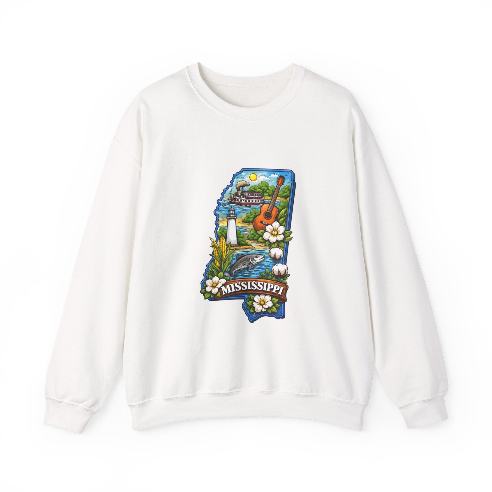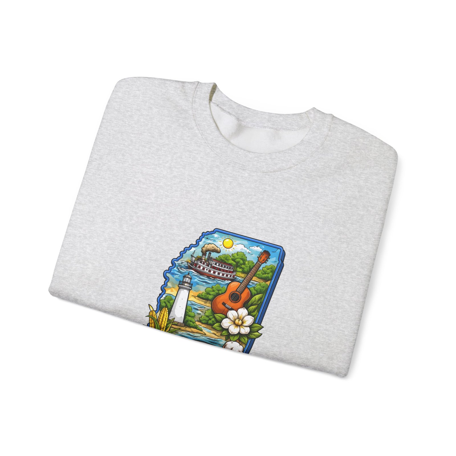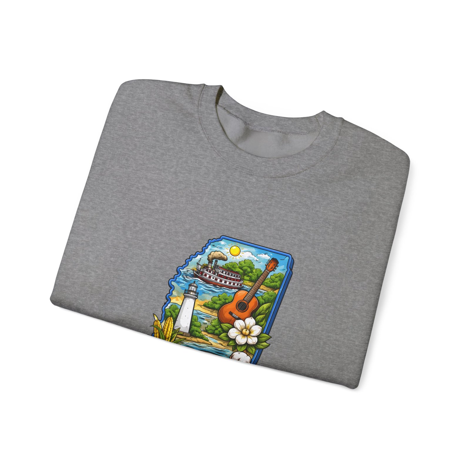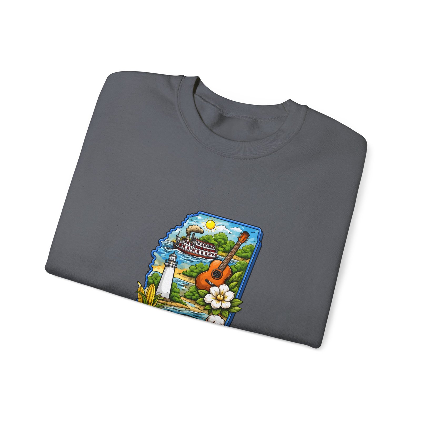 A cozy, midweight sweatshirt that feels like a calm afternoon on the river. The soft cotton-poly blend holds a vibrant, park-like illustration of Mississippi—complete with magnolias, river scenes, and a small guitar—so your state pride reads like a quiet memory rather than loud branding. Ribbed collar and double-needle stitching keep the shape through repeated wear and washes. The tubular knit body and tear-away label make it comfortable for all-day lounging, roadside coffee stops, and easy layering on cool evenings. Embroidery placement options and DTF neck labeling add subtle, premium details for a polished finish.