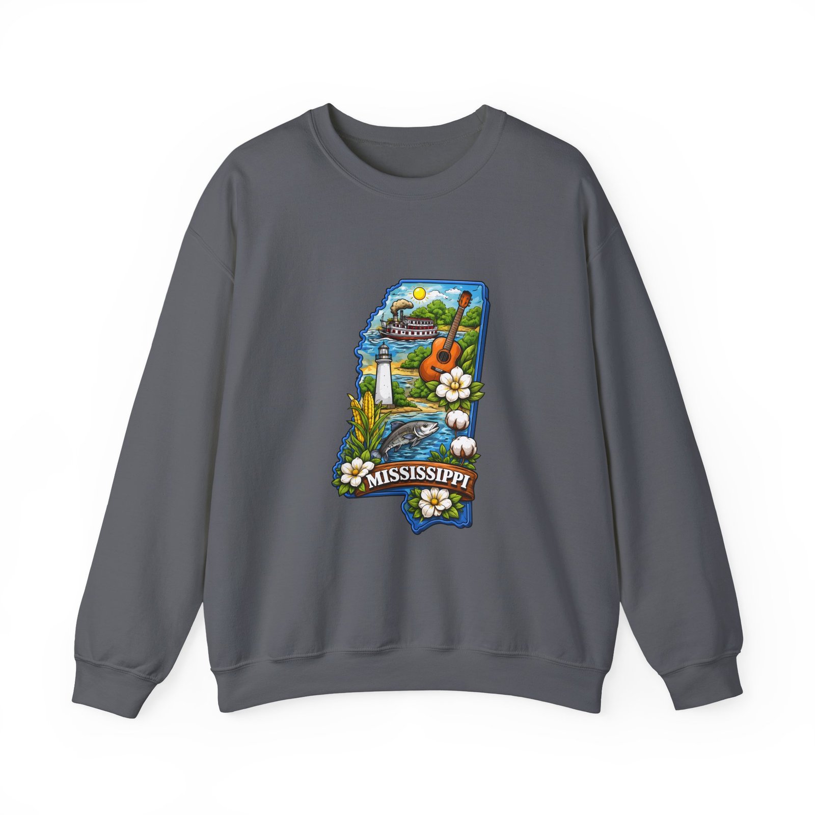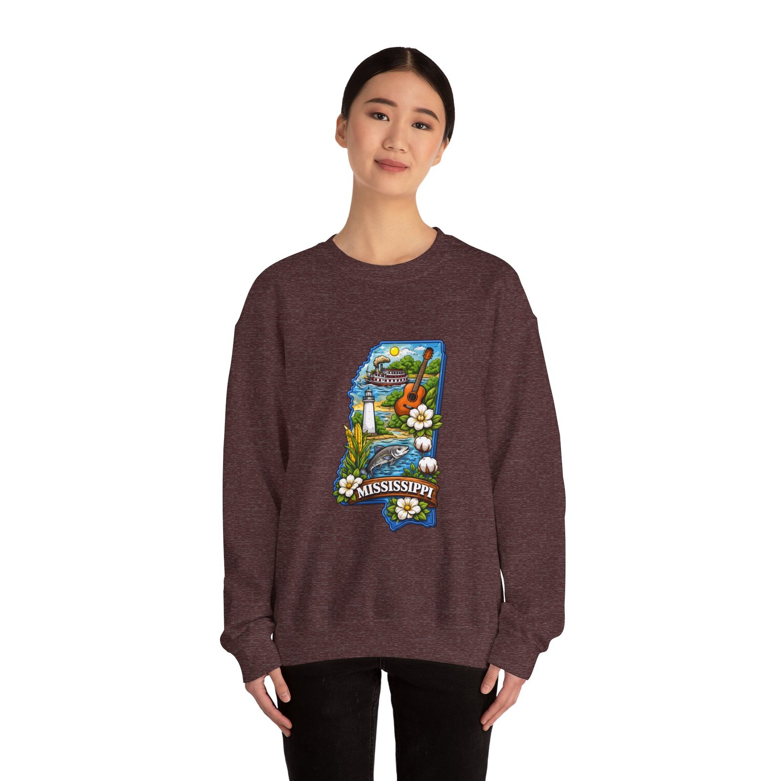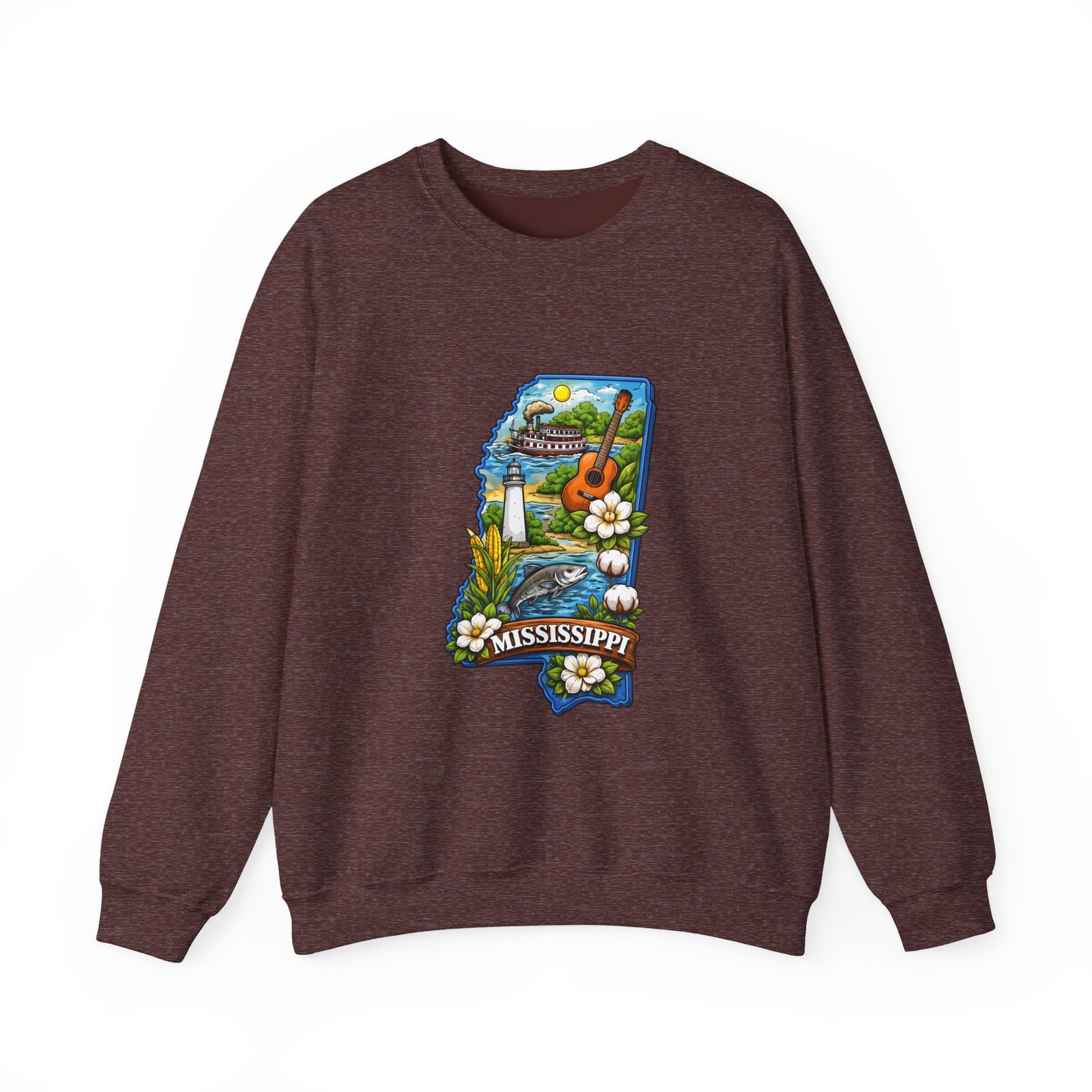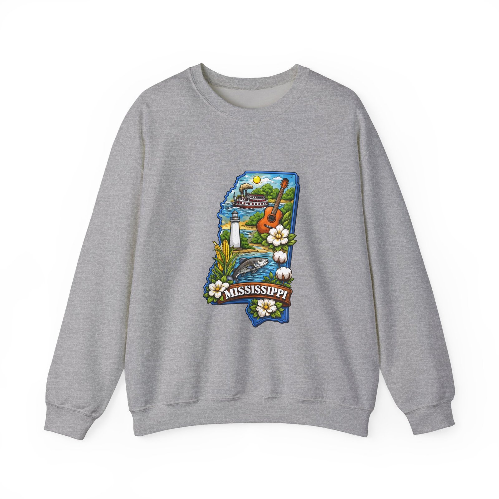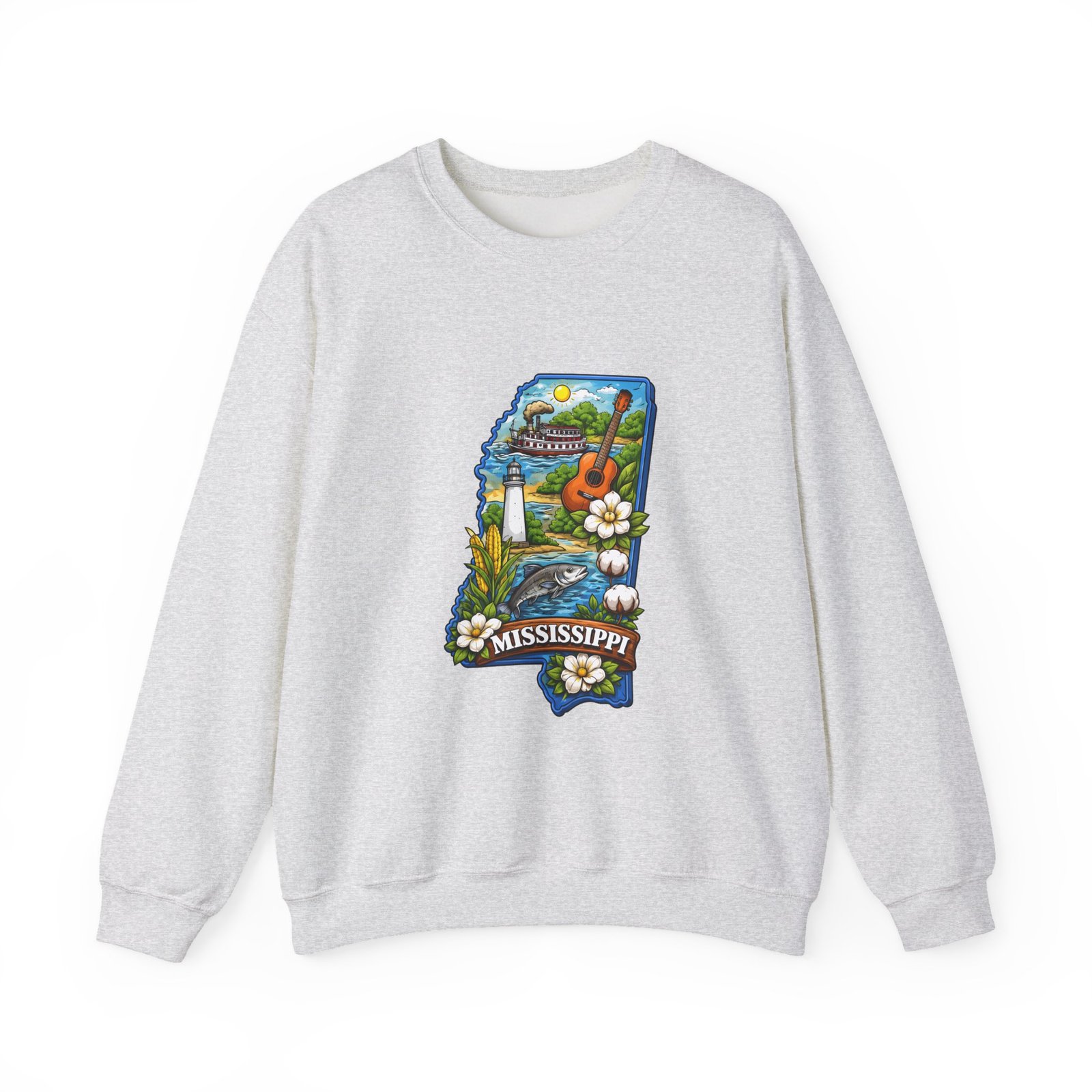 A cozy, midweight sweatshirt that feels like a calm afternoon on the river. The soft cotton-poly blend holds a vibrant, park-like illustration of Mississippi—complete with magnolias, river scenes, and a small guitar—so your state pride reads like a quiet memory rather than loud branding. Ribbed collar and double-needle stitching keep the shape through repeated wear and washes. The tubular knit body and tear-away label make it comfortable for all-day lounging, roadside coffee stops, and easy layering on cool evenings. Embroidery placement options and DTF neck labeling add subtle, premium details for a polished finish.