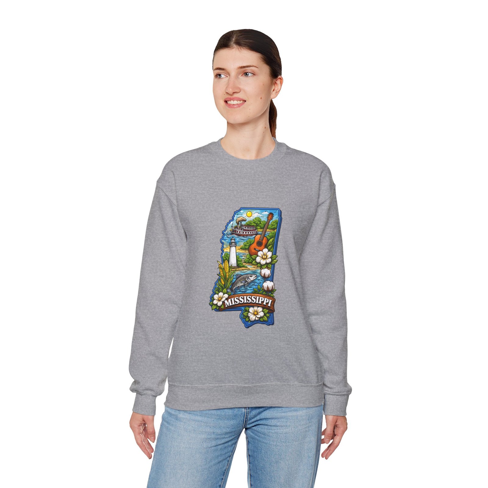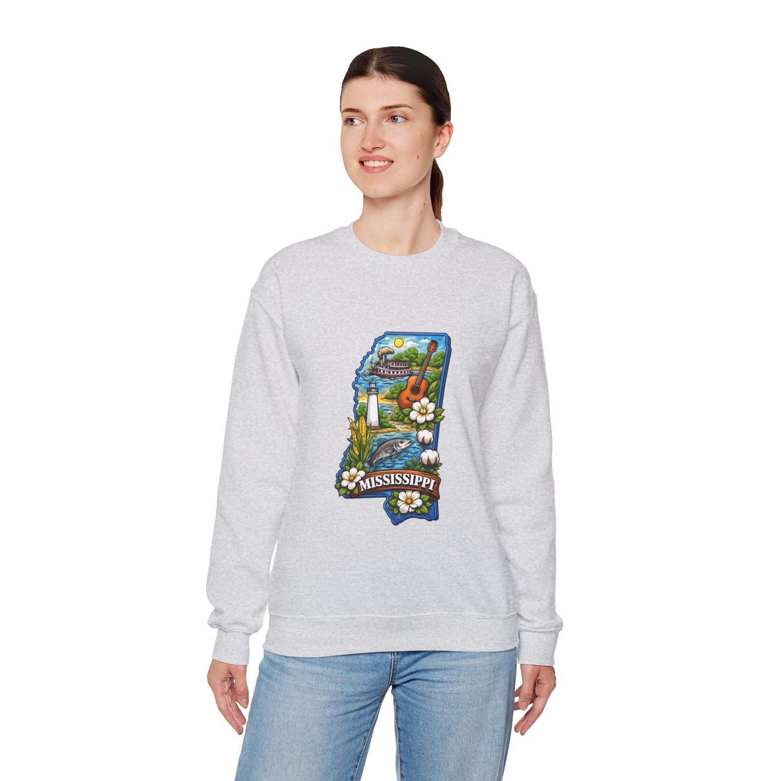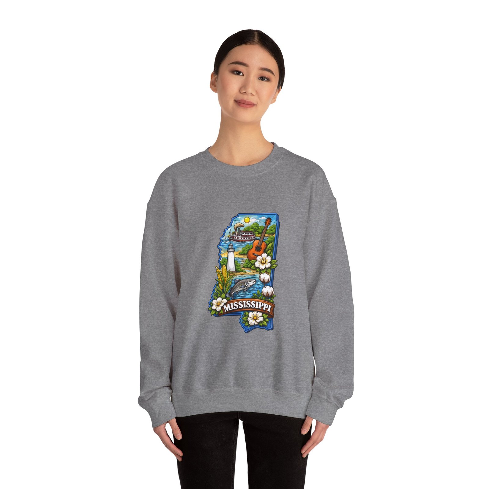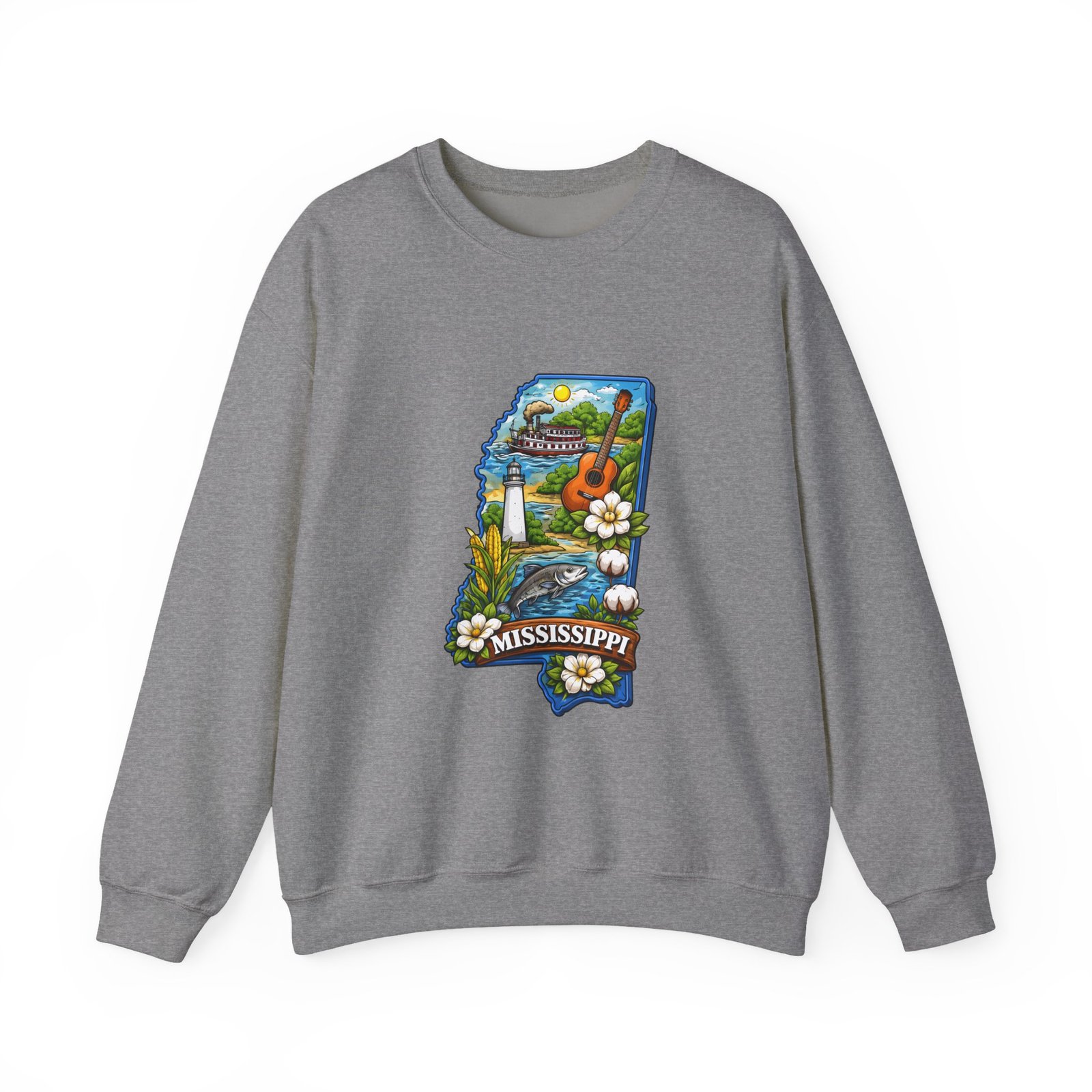 A cozy, midweight sweatshirt that feels like a calm afternoon on the river. The soft cotton-poly blend holds a vibrant, park-like illustration of Mississippi—complete with magnolias, river scenes, and a small guitar—so your state pride reads like a quiet memory rather than loud branding. Ribbed collar and double-needle stitching keep the shape through repeated wear and washes. The tubular knit body and tear-away label make it comfortable for all-day lounging, roadside coffee stops, and easy layering on cool evenings. Embroidery placement options and DTF neck labeling add subtle, premium details for a polished finish.