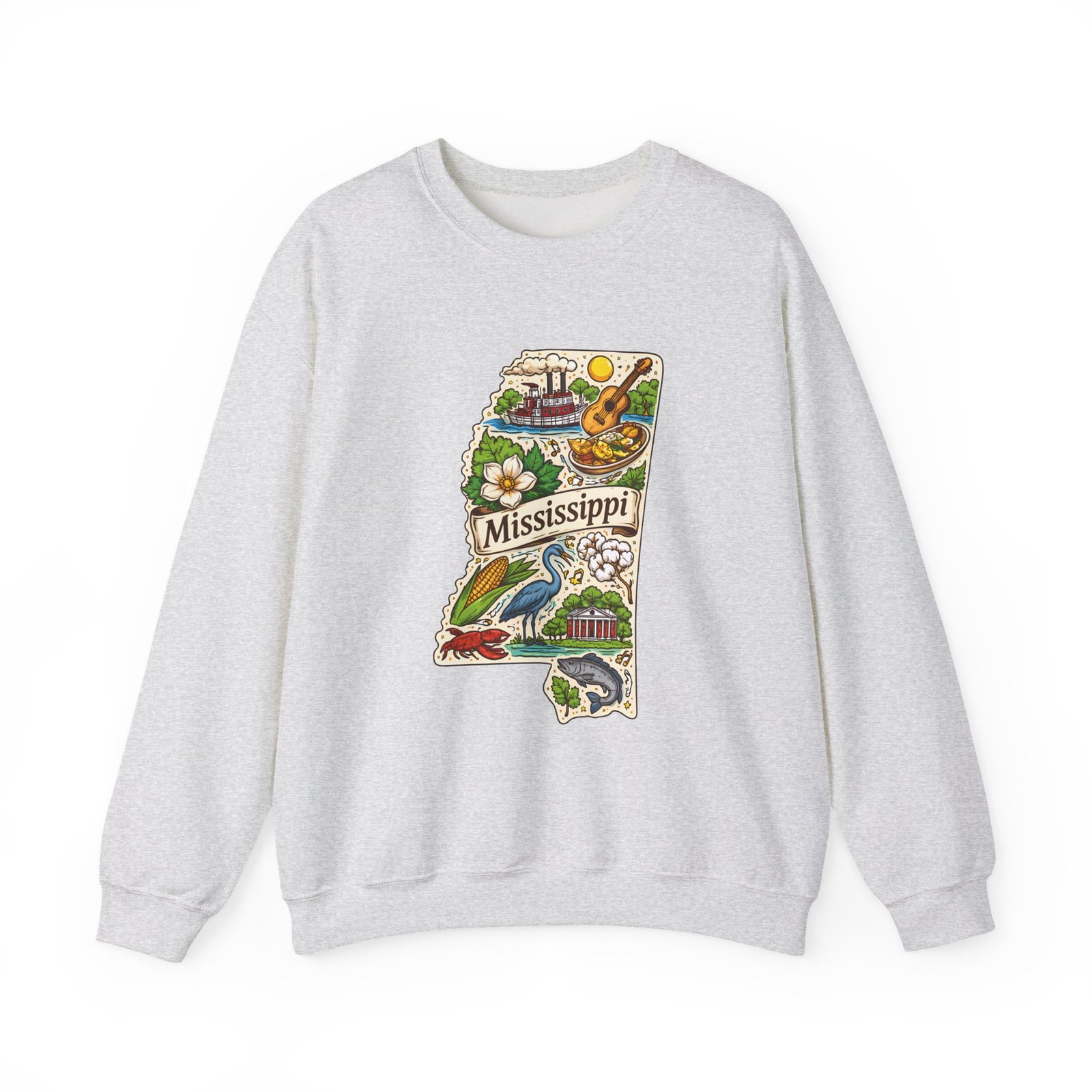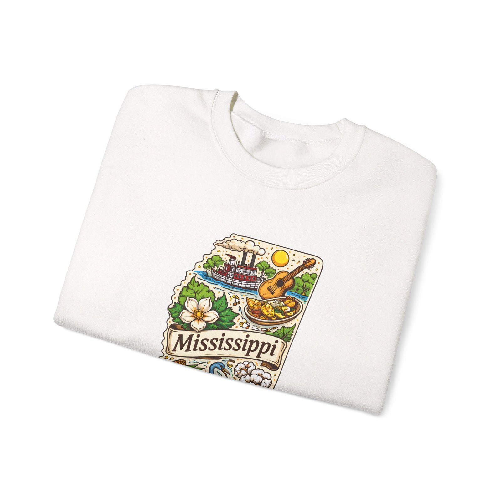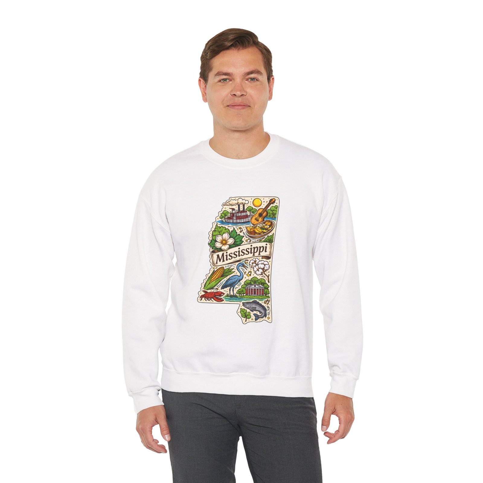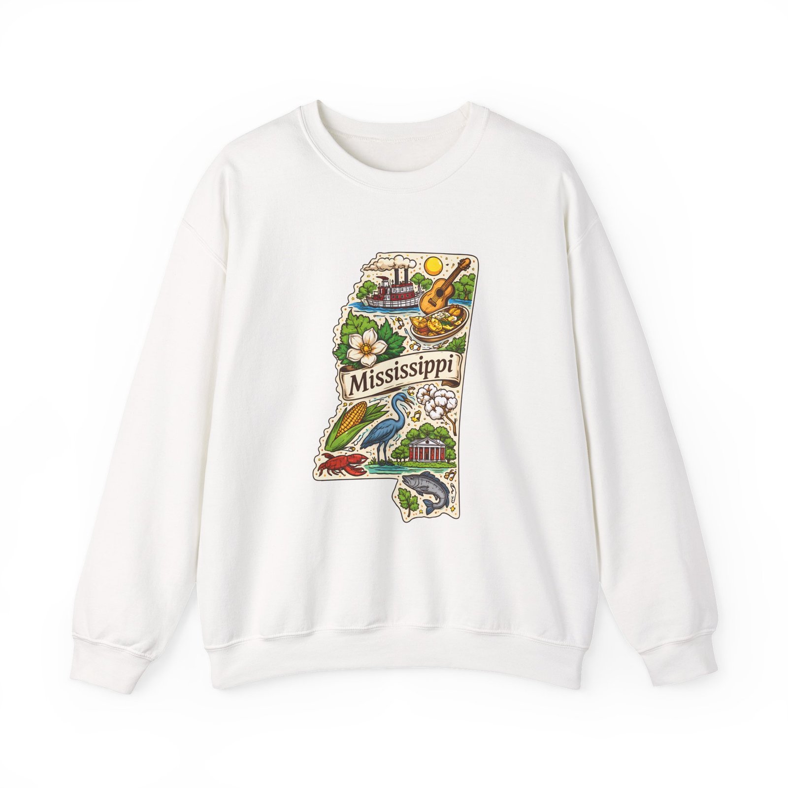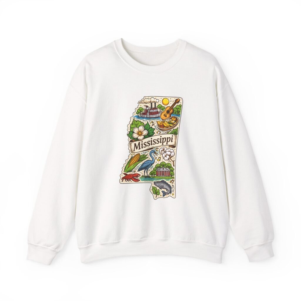 This cozy crewneck carries a hand-drawn map of Mississippi stitched onto a medium‑weight sweatshirt — warm, a little nostalgic, and quietly proud. The embroidered state-shaped artwork mixes local icons and natural details in muted, earthy tones that sit gently against the soft white fleece. It wears like a well-loved travel memory: layered over a tee for cool mornings, paired with jeans for errands, or draped over shoulders at bonfires. The fit is classic and roomy without feeling bulky, and the ribbed collar and reinforced seams keep the shape through regular wear. For anyone who treasures hometown roots, road‑trip stories, or slow afternoons by the river, this sweatshirt reads like a familiar postcard you can put on and go.