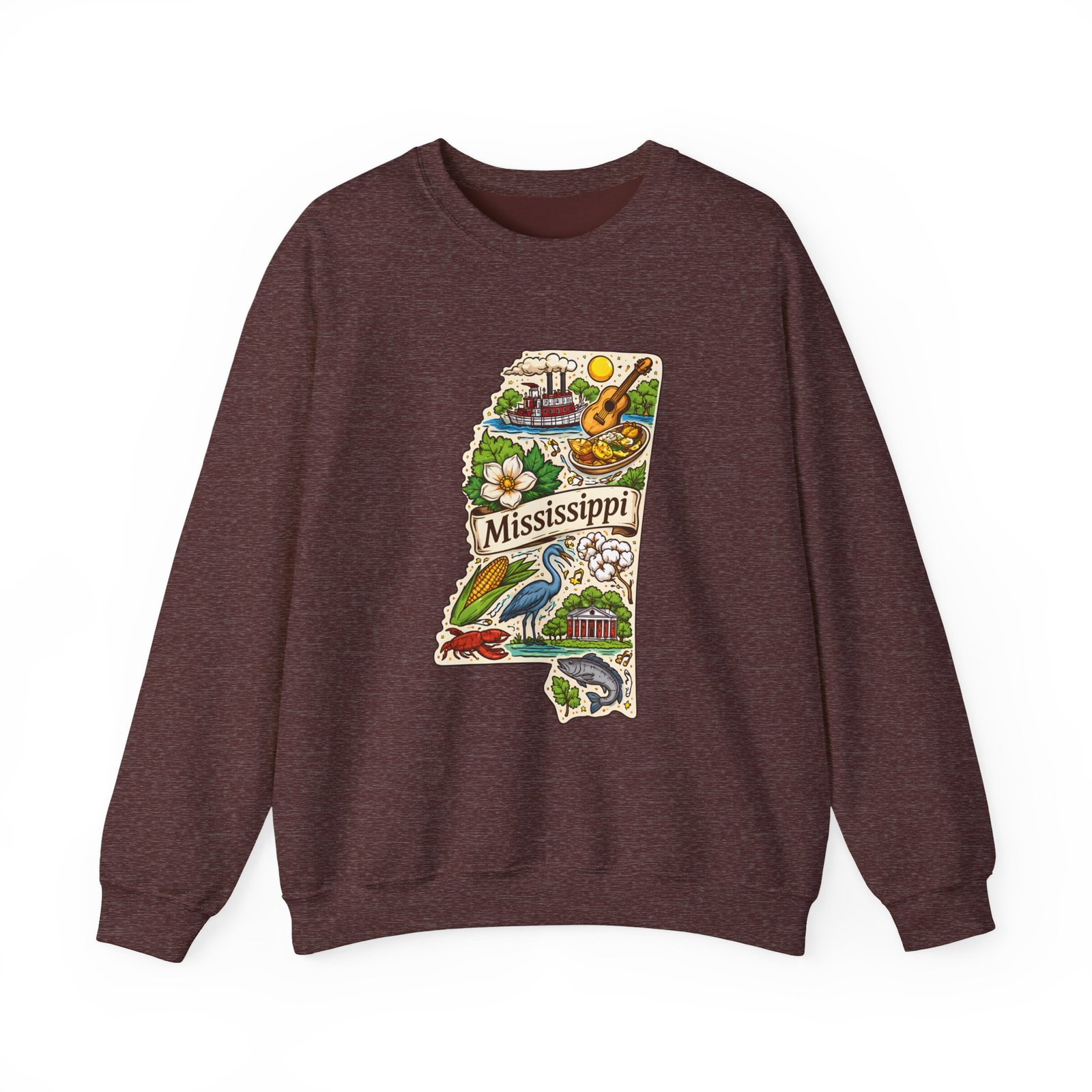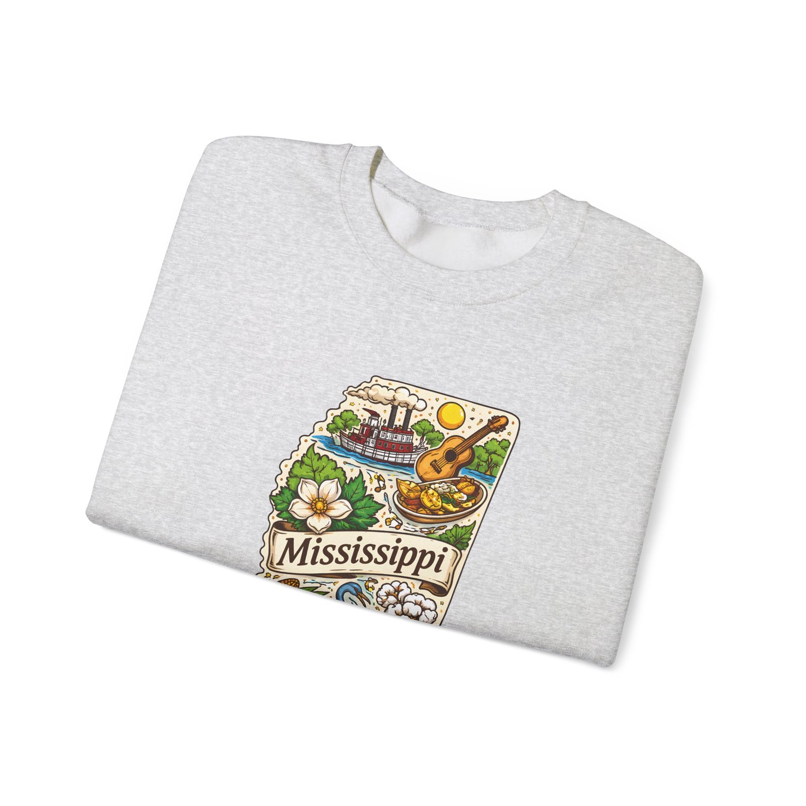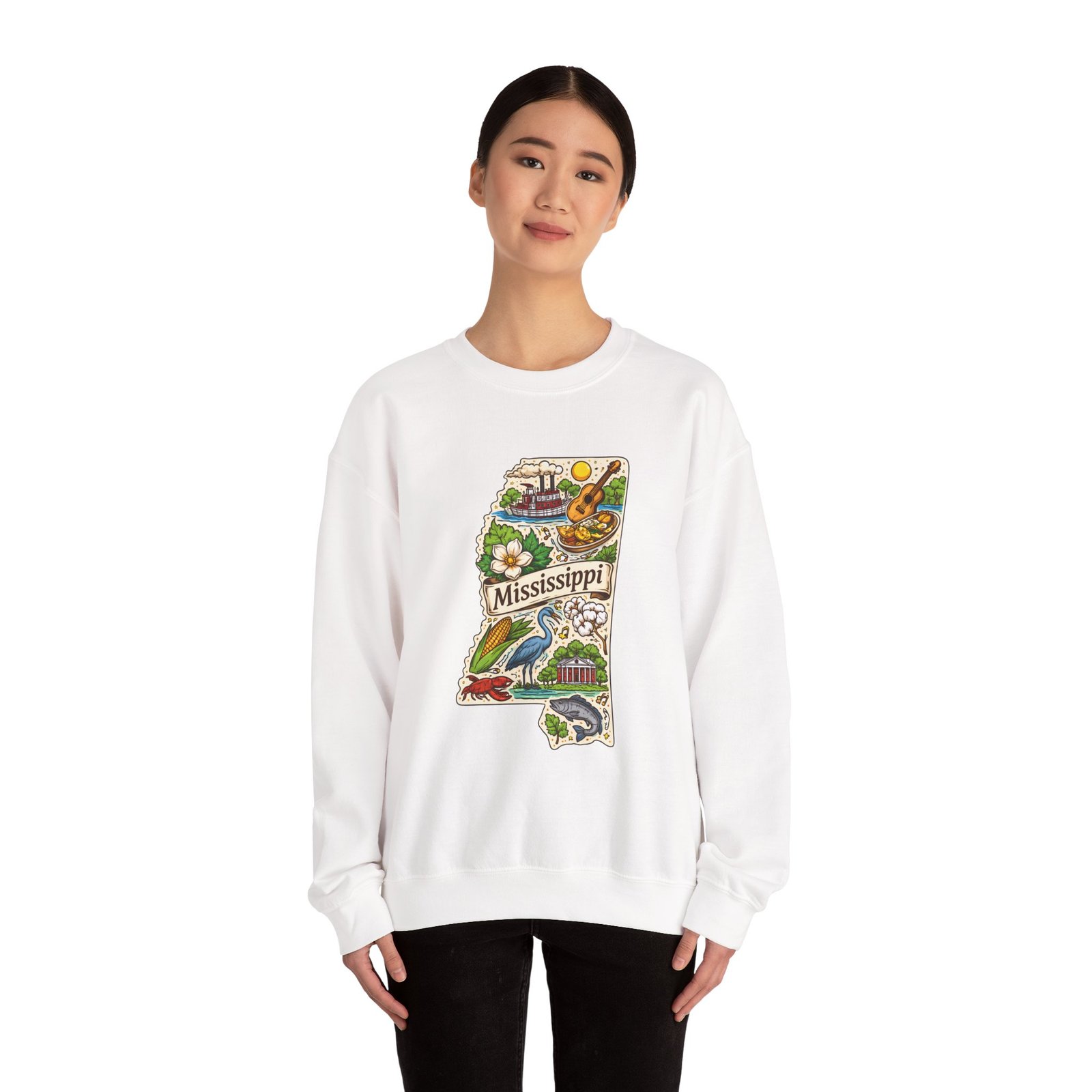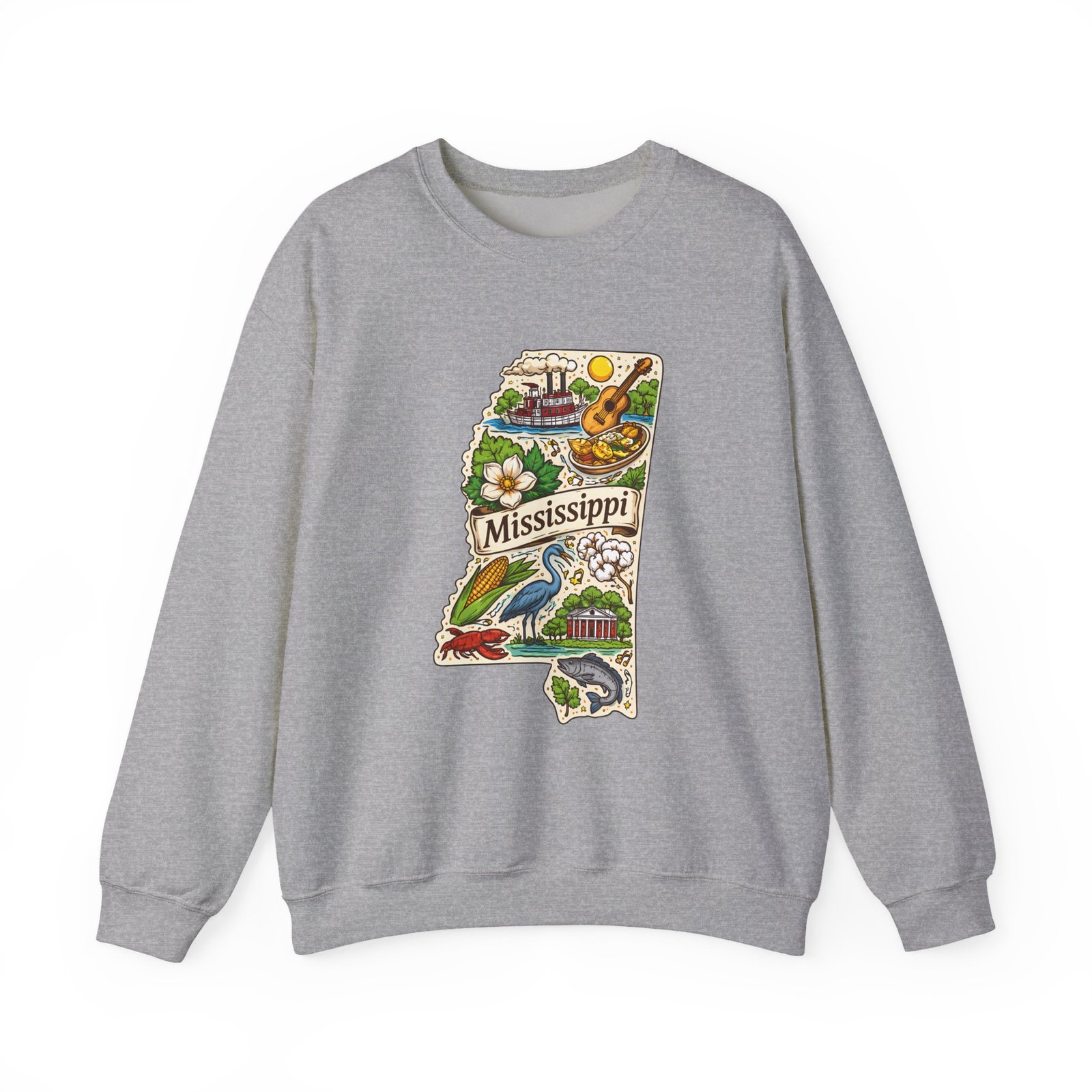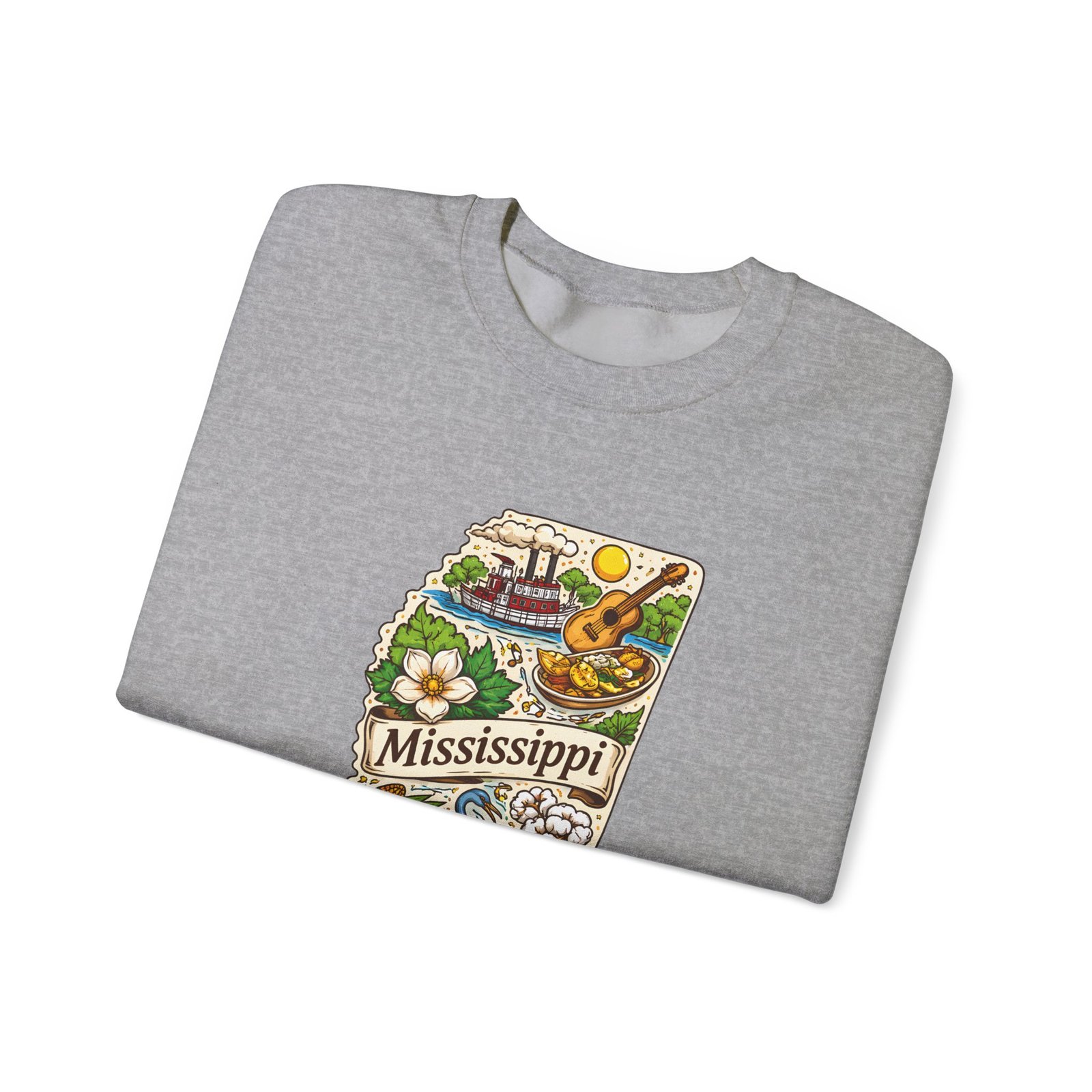 This cozy crewneck carries a hand-drawn map of Mississippi stitched onto a medium‑weight sweatshirt — warm, a little nostalgic, and quietly proud. The embroidered state-shaped artwork mixes local icons and natural details in muted, earthy tones that sit gently against the soft white fleece. It wears like a well-loved travel memory: layered over a tee for cool mornings, paired with jeans for errands, or draped over shoulders at bonfires. The fit is classic and roomy without feeling bulky, and the ribbed collar and reinforced seams keep the shape through regular wear. For anyone who treasures hometown roots, road‑trip stories, or slow afternoons by the river, this sweatshirt reads like a familiar postcard you can put on and go.
