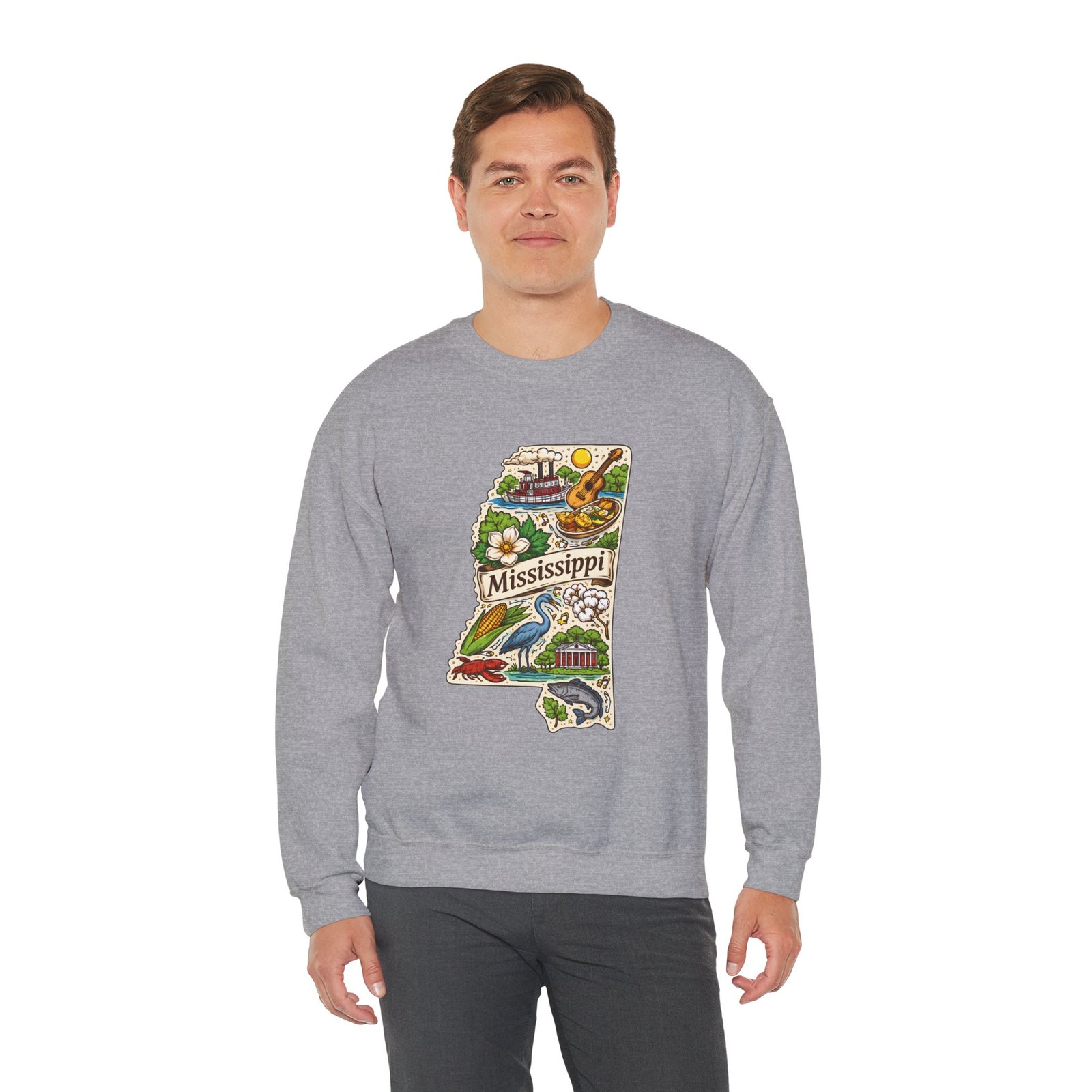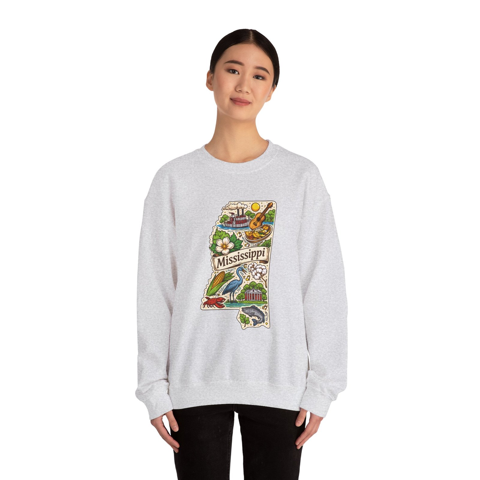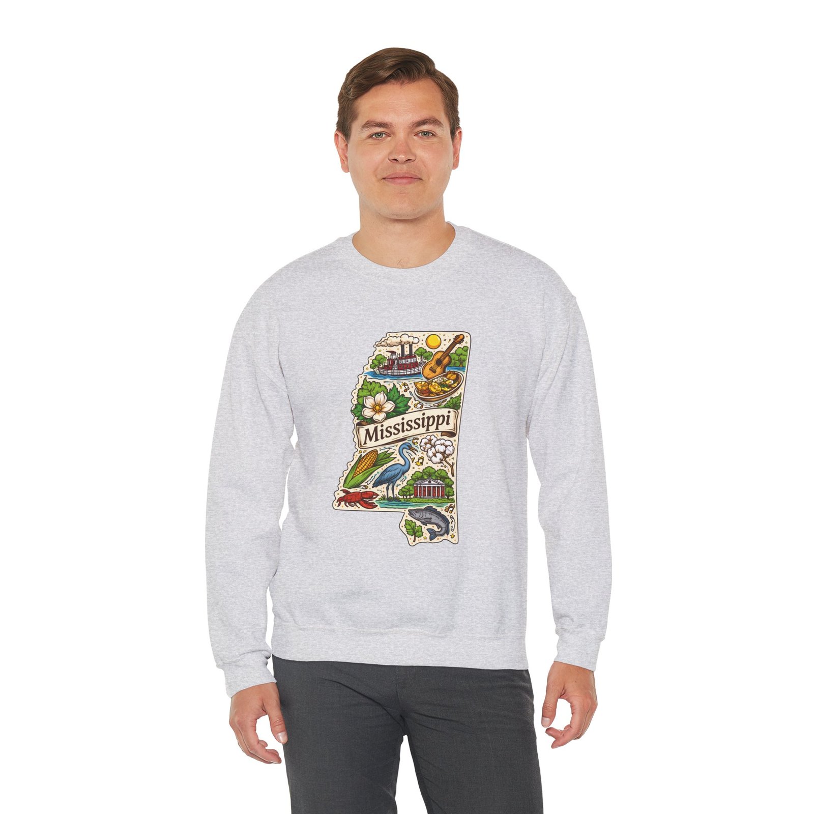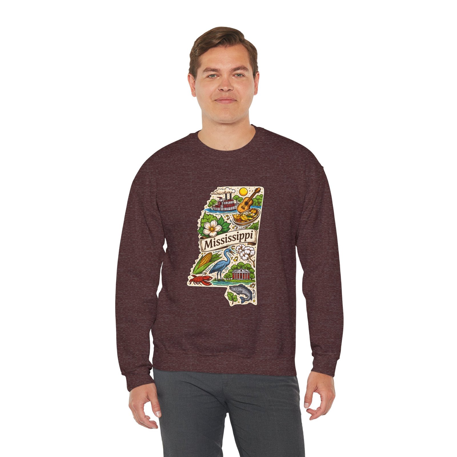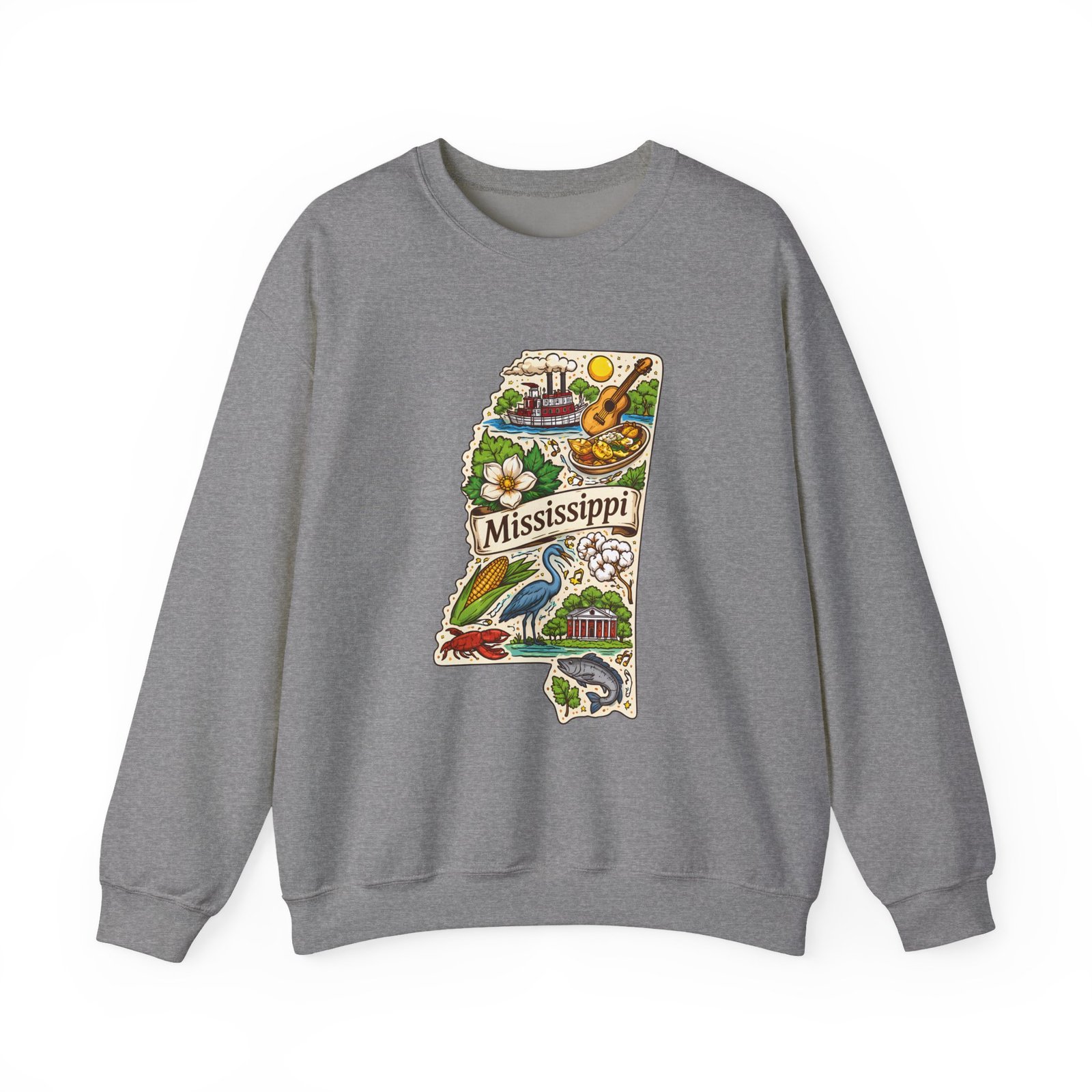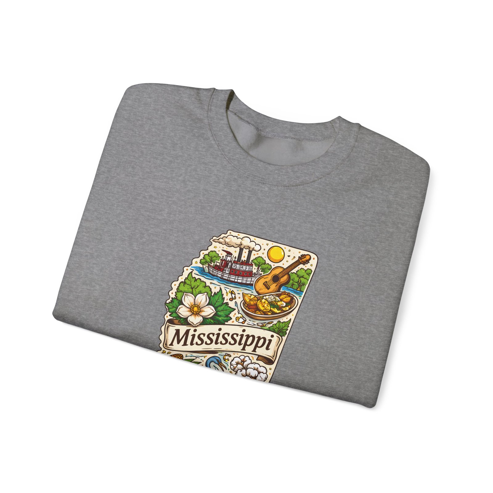 This cozy crewneck carries a hand-drawn map of Mississippi stitched onto a medium‑weight sweatshirt — warm, a little nostalgic, and quietly proud. The embroidered state-shaped artwork mixes local icons and natural details in muted, earthy tones that sit gently against the soft white fleece. It wears like a well-loved travel memory: layered over a tee for cool mornings, paired with jeans for errands, or draped over shoulders at bonfires. The fit is classic and roomy without feeling bulky, and the ribbed collar and reinforced seams keep the shape through regular wear. For anyone who treasures hometown roots, road‑trip stories, or slow afternoons by the river, this sweatshirt reads like a familiar postcard you can put on and go.