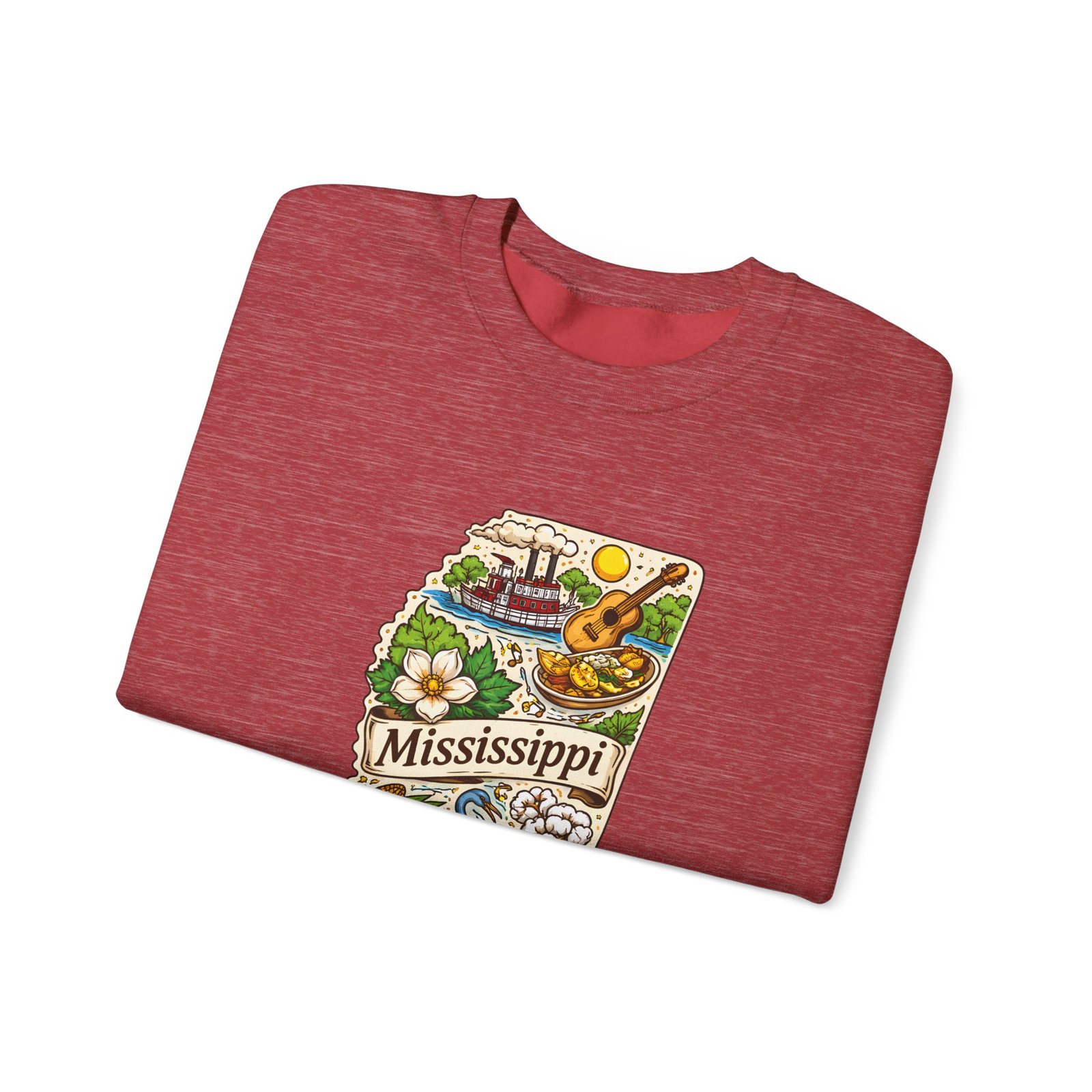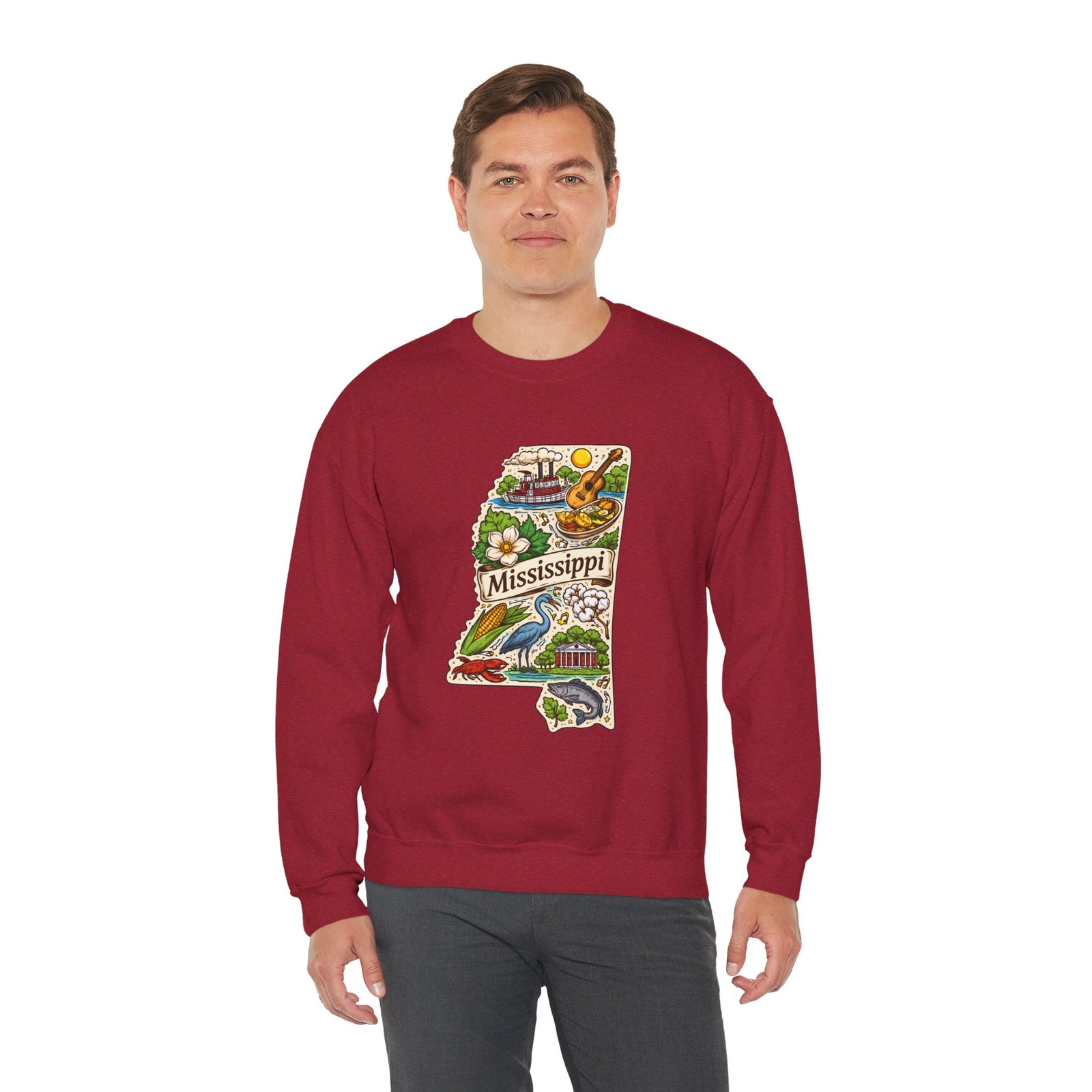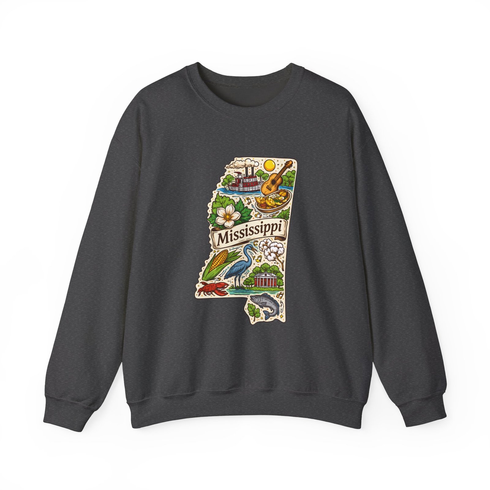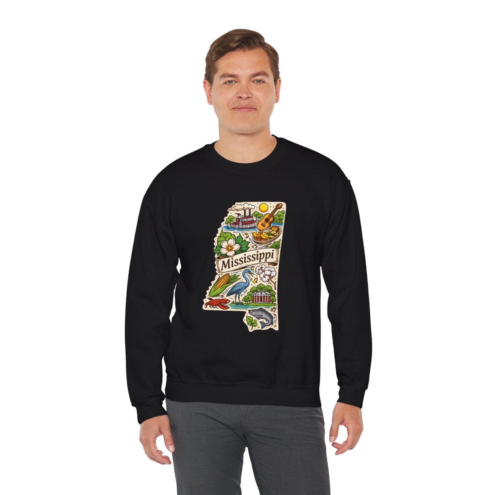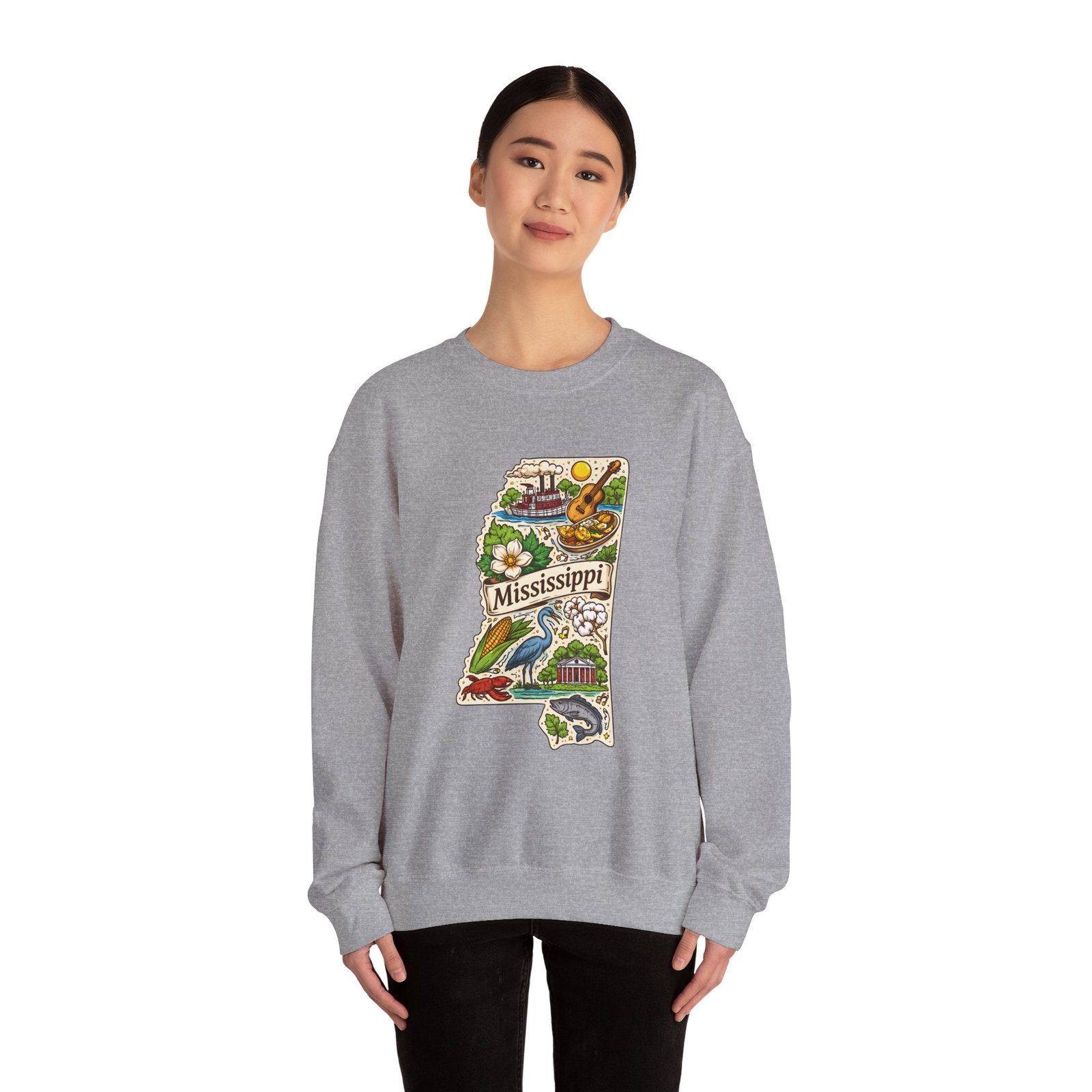 This cozy crewneck carries a hand-drawn map of Mississippi stitched onto a medium‑weight sweatshirt — warm, a little nostalgic, and quietly proud. The embroidered state-shaped artwork mixes local icons and natural details in muted, earthy tones that sit gently against the soft white fleece. It wears like a well-loved travel memory: layered over a tee for cool mornings, paired with jeans for errands, or draped over shoulders at bonfires. The fit is classic and roomy without feeling bulky, and the ribbed collar and reinforced seams keep the shape through regular wear. For anyone who treasures hometown roots, road‑trip stories, or slow afternoons by the river, this sweatshirt reads like a familiar postcard you can put on and go.