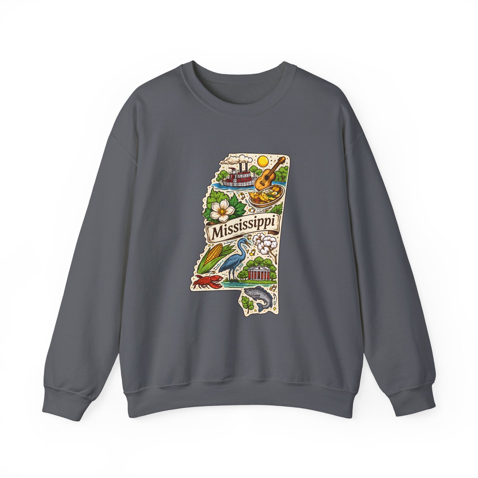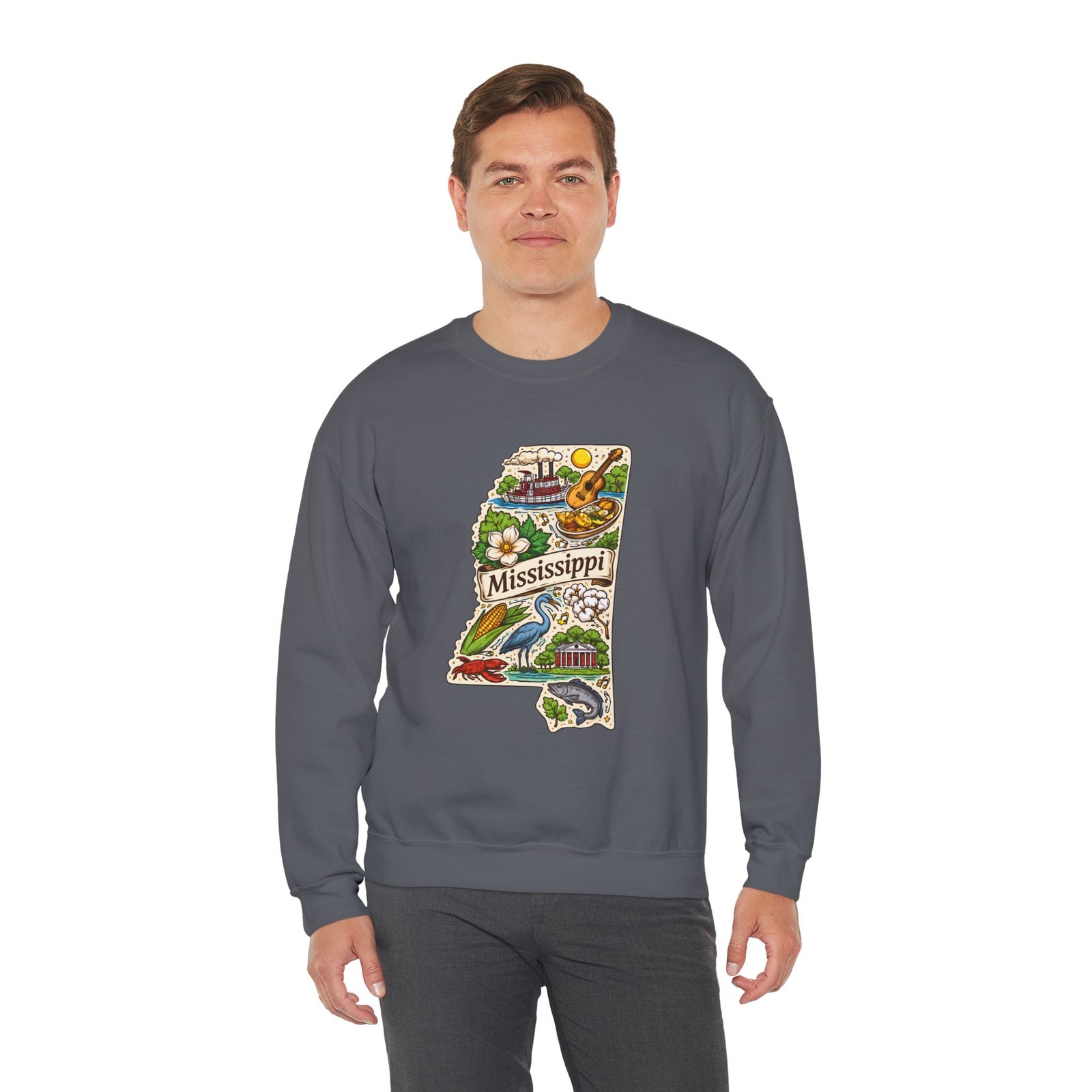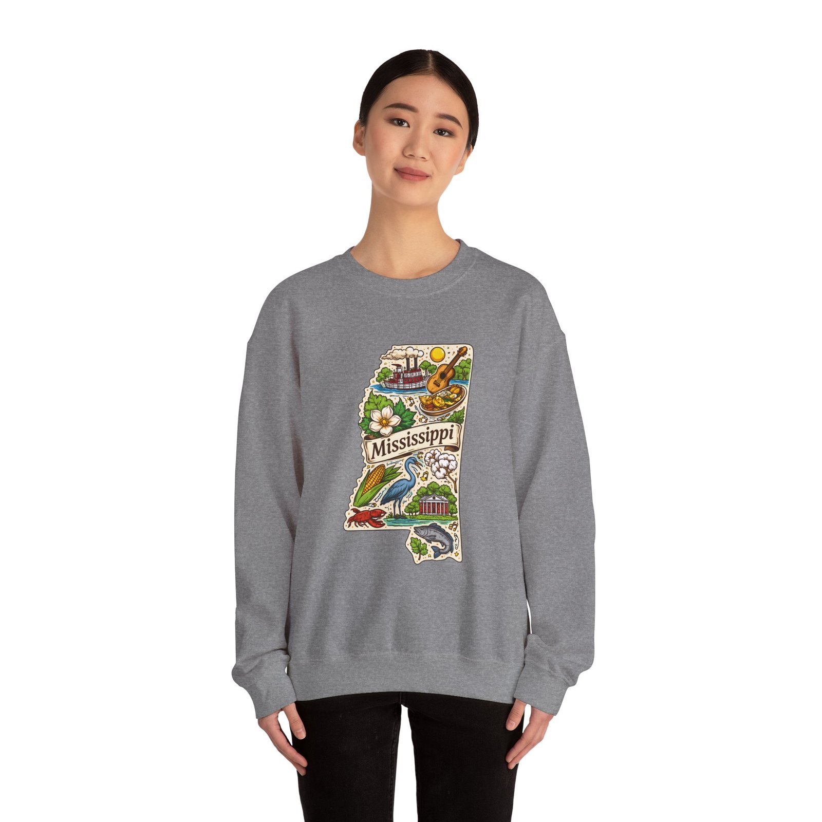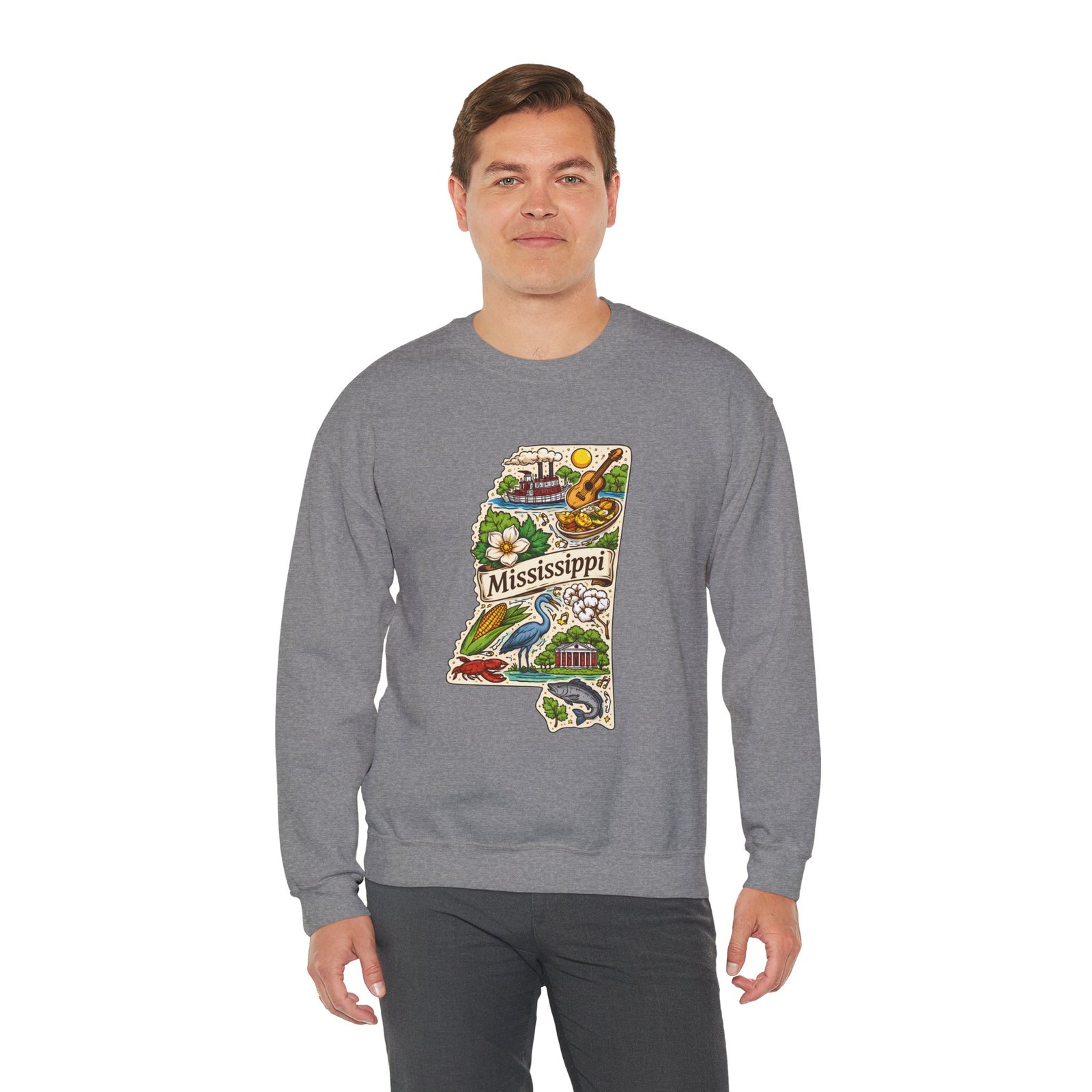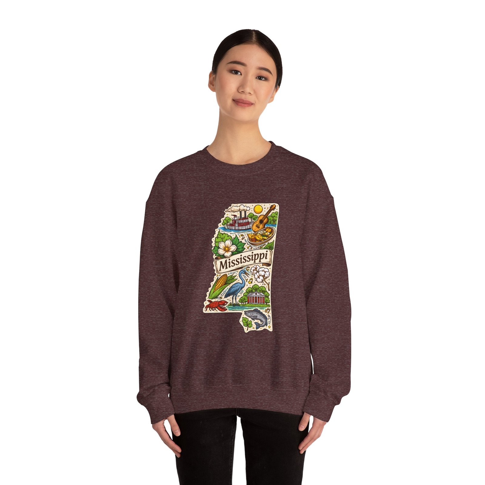 This cozy crewneck carries a hand-drawn map of Mississippi stitched onto a medium‑weight sweatshirt — warm, a little nostalgic, and quietly proud. The embroidered state-shaped artwork mixes local icons and natural details in muted, earthy tones that sit gently against the soft white fleece. It wears like a well-loved travel memory: layered over a tee for cool mornings, paired with jeans for errands, or draped over shoulders at bonfires. The fit is classic and roomy without feeling bulky, and the ribbed collar and reinforced seams keep the shape through regular wear. For anyone who treasures hometown roots, road‑trip stories, or slow afternoons by the river, this sweatshirt reads like a familiar postcard you can put on and go.