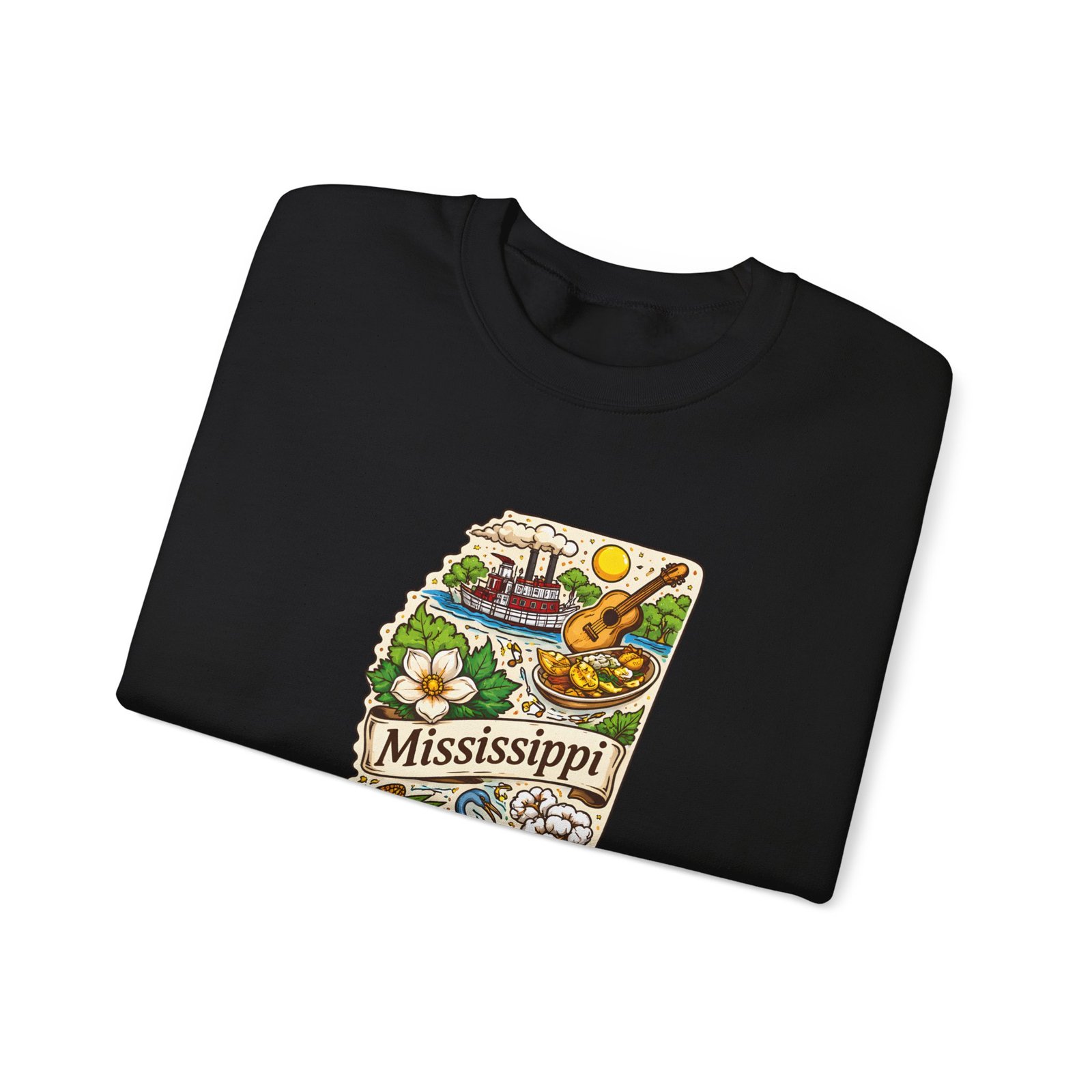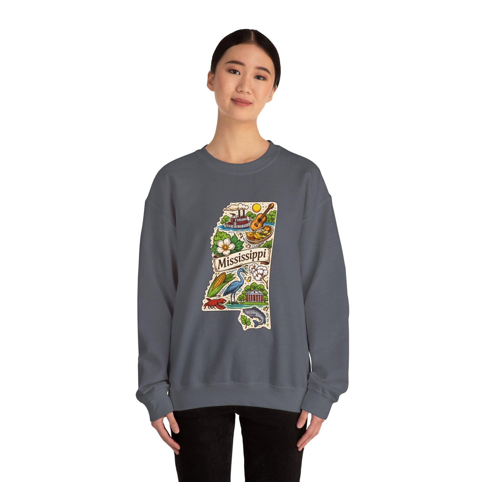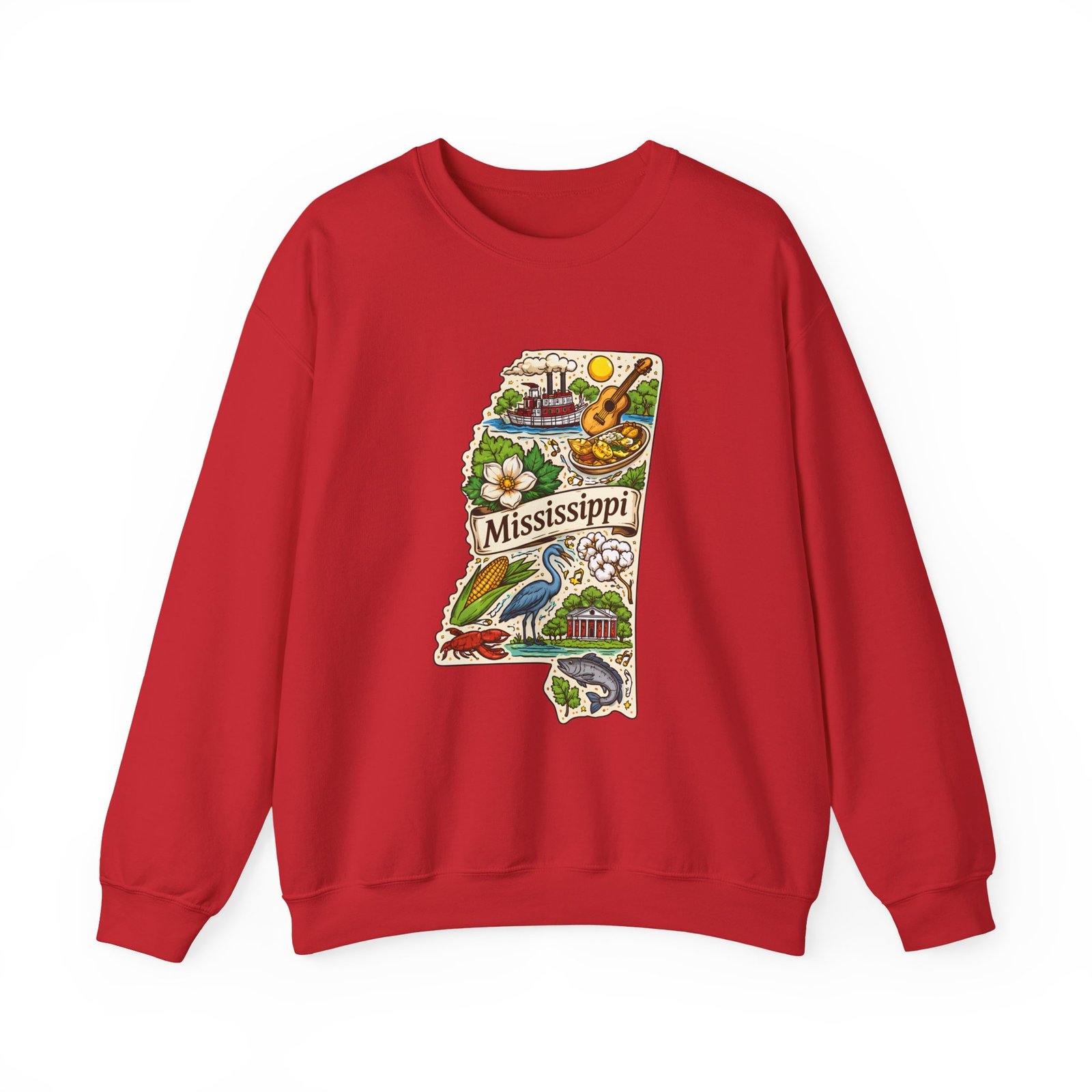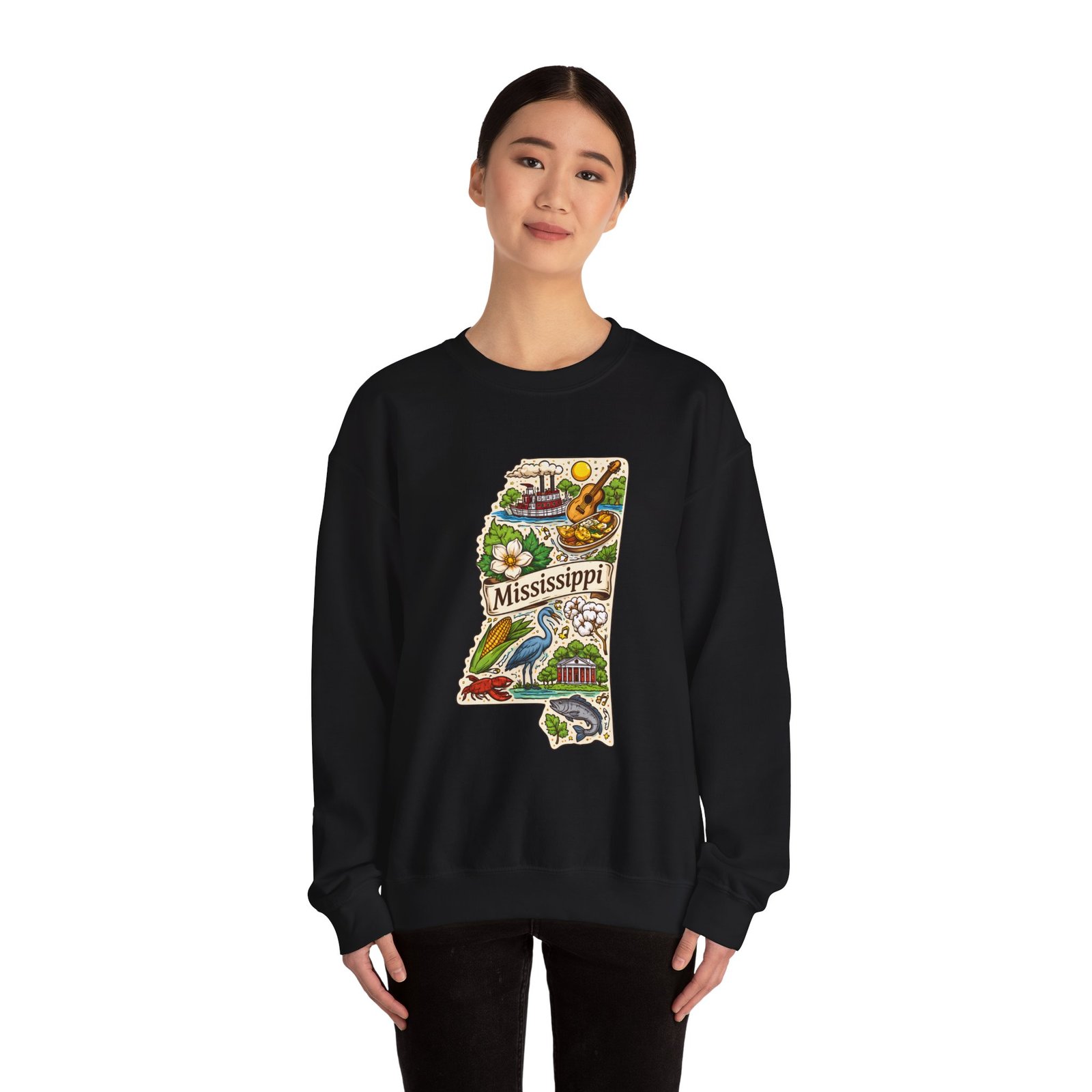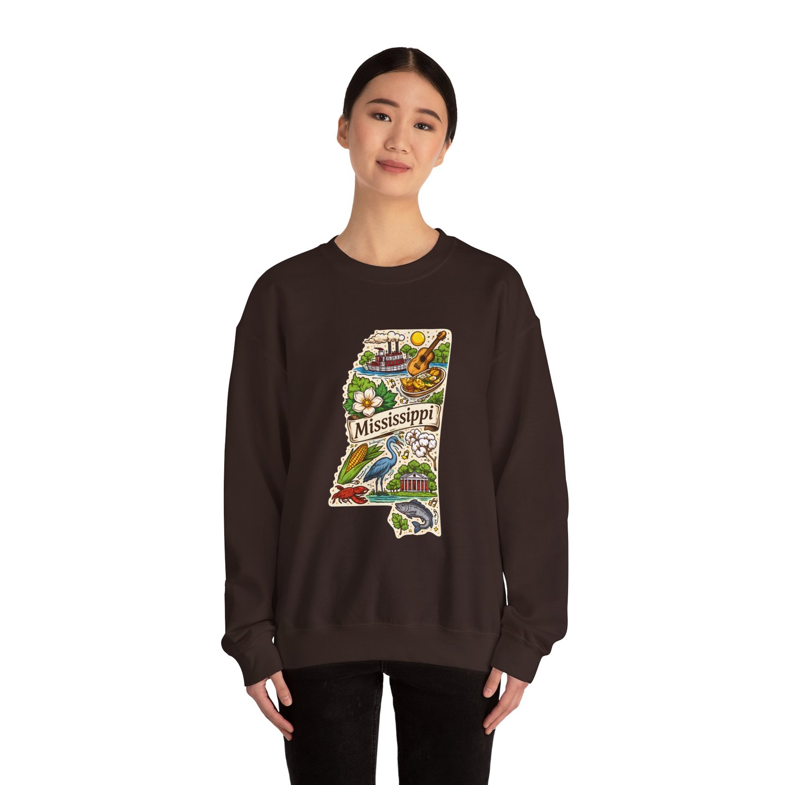 This cozy crewneck carries a hand-drawn map of Mississippi stitched onto a medium‑weight sweatshirt — warm, a little nostalgic, and quietly proud. The embroidered state-shaped artwork mixes local icons and natural details in muted, earthy tones that sit gently against the soft white fleece. It wears like a well-loved travel memory: layered over a tee for cool mornings, paired with jeans for errands, or draped over shoulders at bonfires. The fit is classic and roomy without feeling bulky, and the ribbed collar and reinforced seams keep the shape through regular wear. For anyone who treasures hometown roots, road‑trip stories, or slow afternoons by the river, this sweatshirt reads like a familiar postcard you can put on and go.