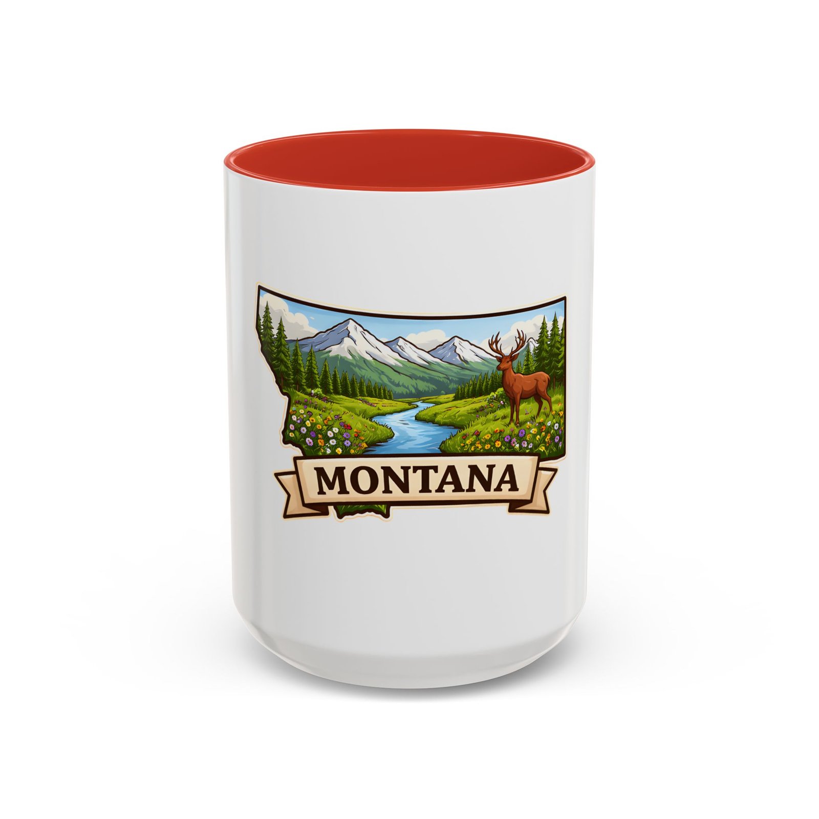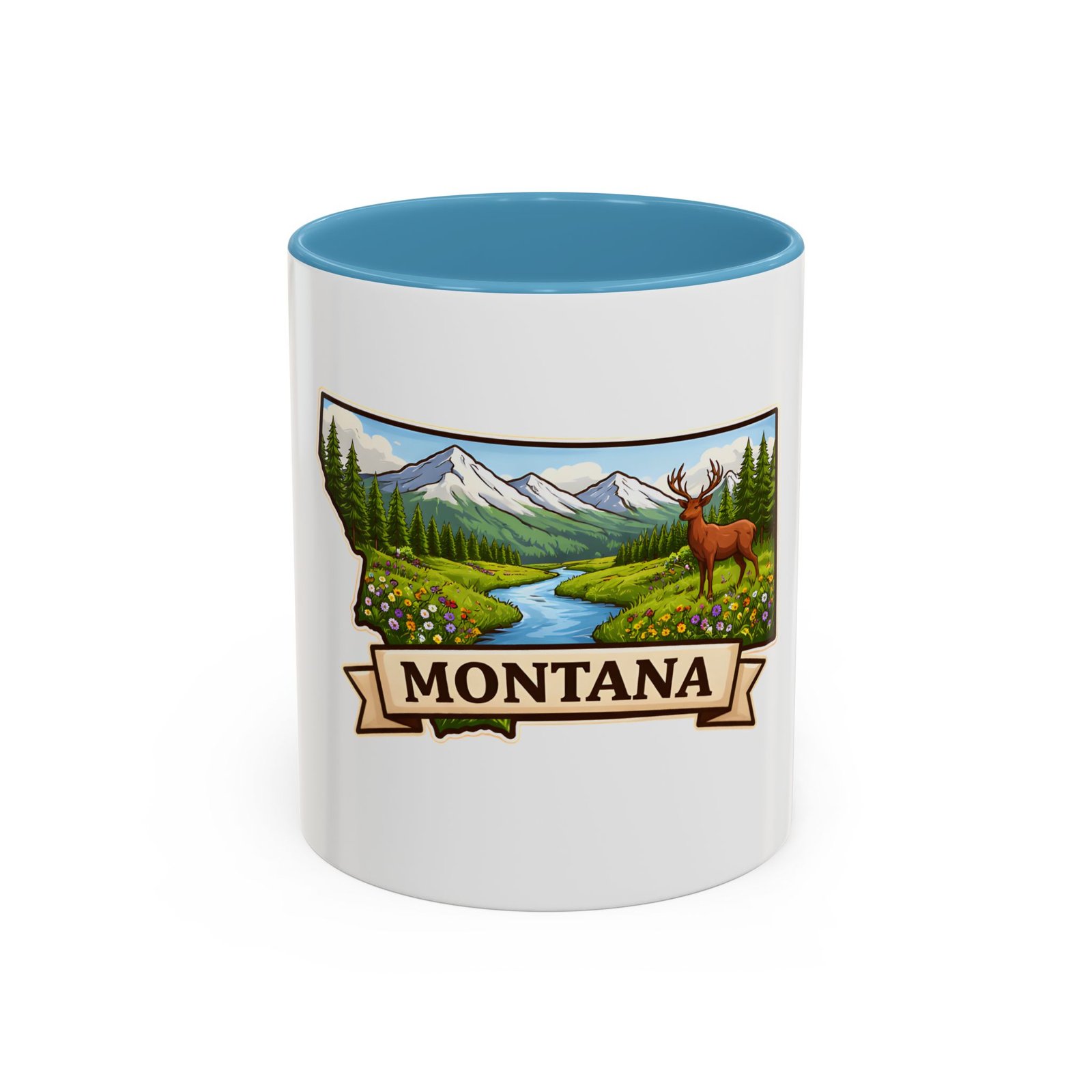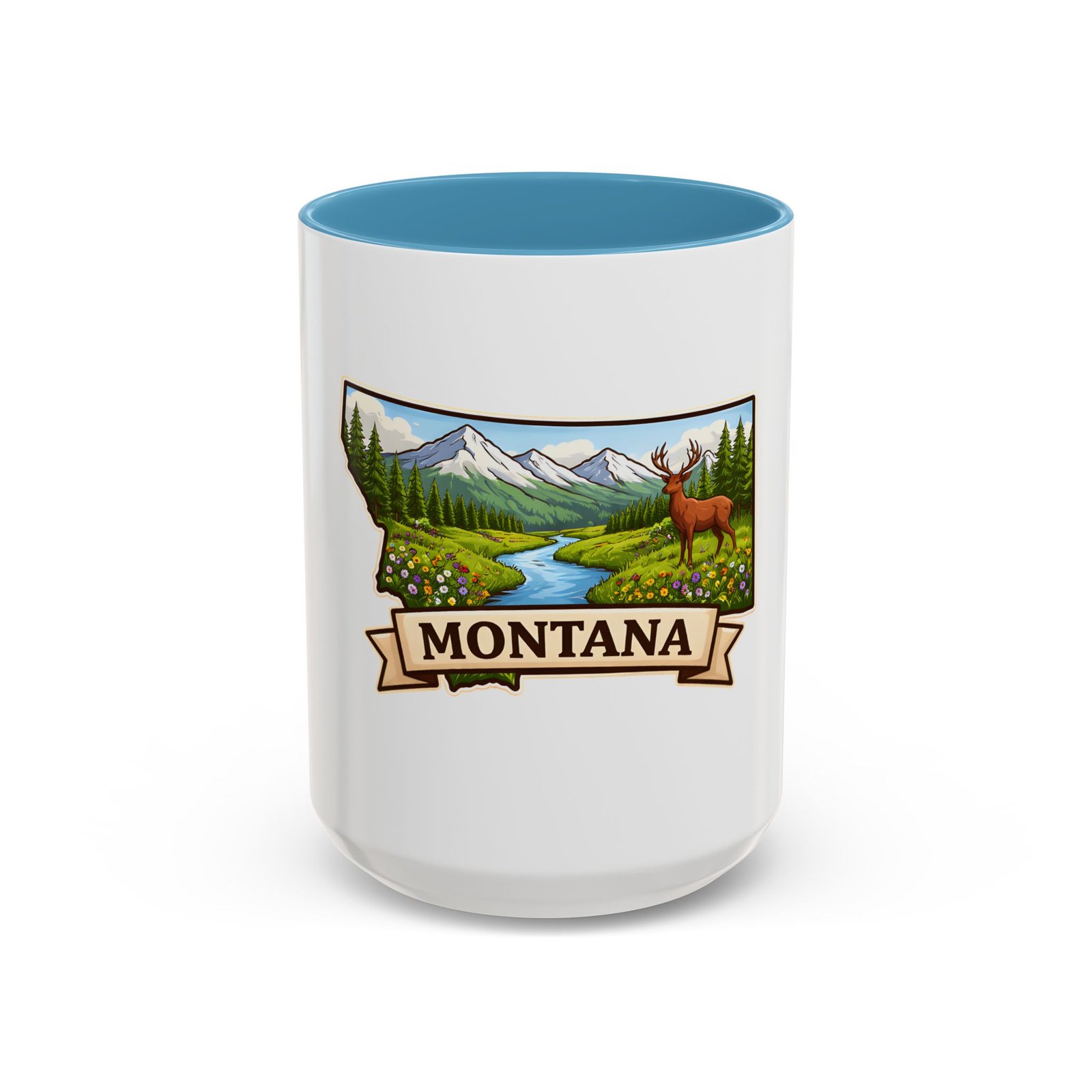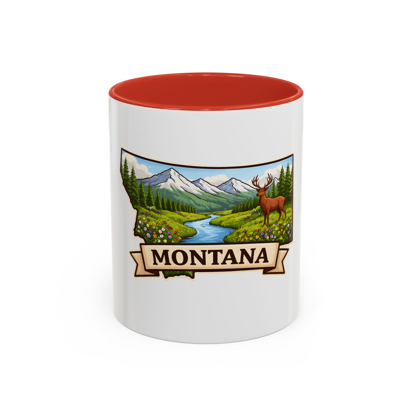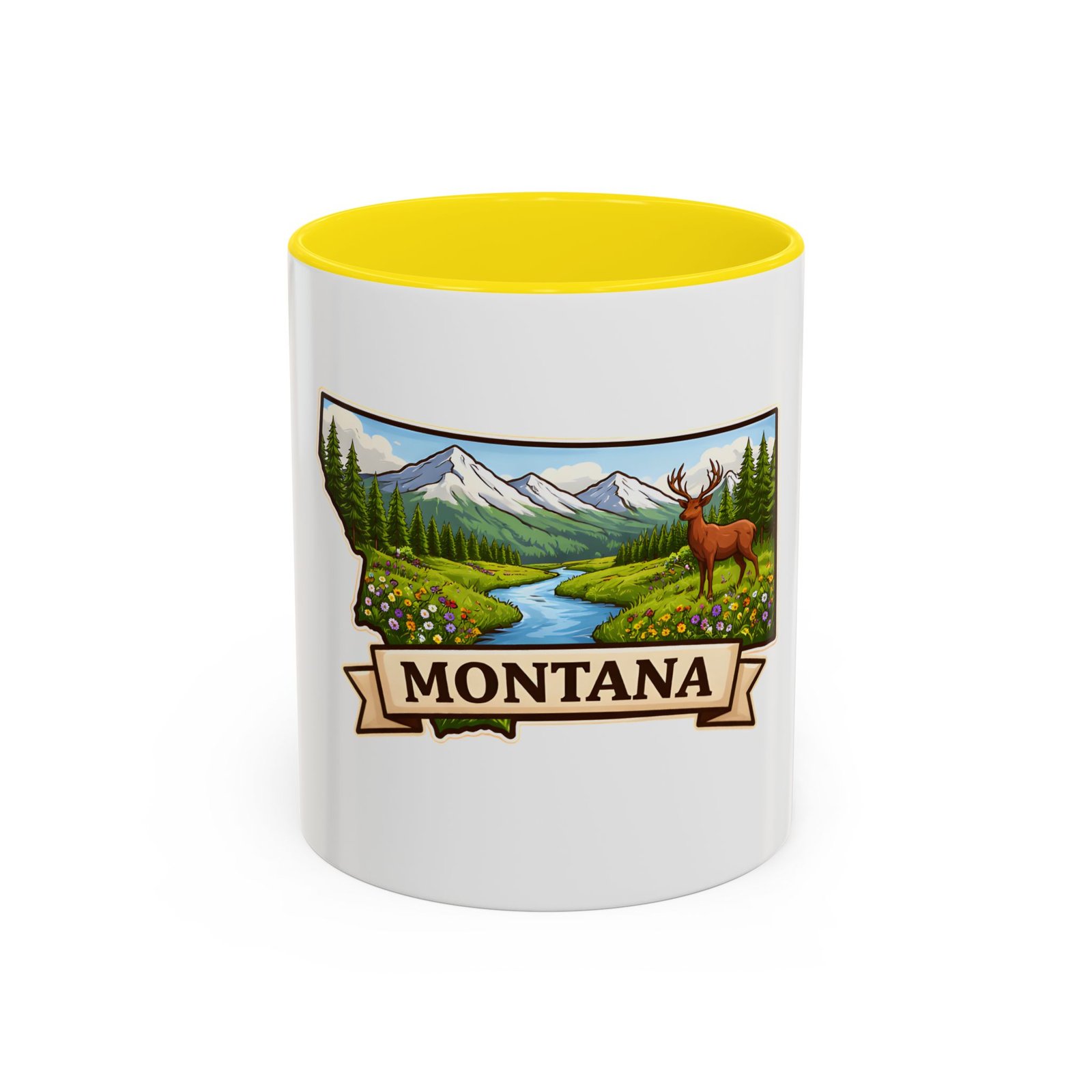 Wake to a crisp, big-sky morning with this Montana accent mug. Bright, detailed artwork wraps the white ceramic body — a winding blue river, wildflower meadows, evergreen pines, snow-capped peaks and a proud elk framed by a vintage banner that reads “Montana.” The colored interior and handle add a bold contrast that makes the scene pop while the glossy finish keeps the image lively through daily use. Hold it on chilly porch mornings, beside a stack of maps, or as you plan the next trail. This mug feels like a quiet moment in the West: clear, grounded, and ready for whatever the day brings.