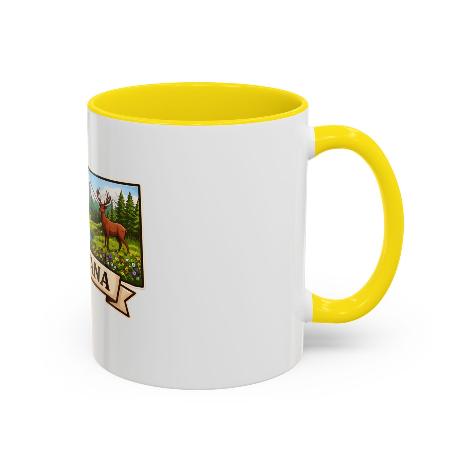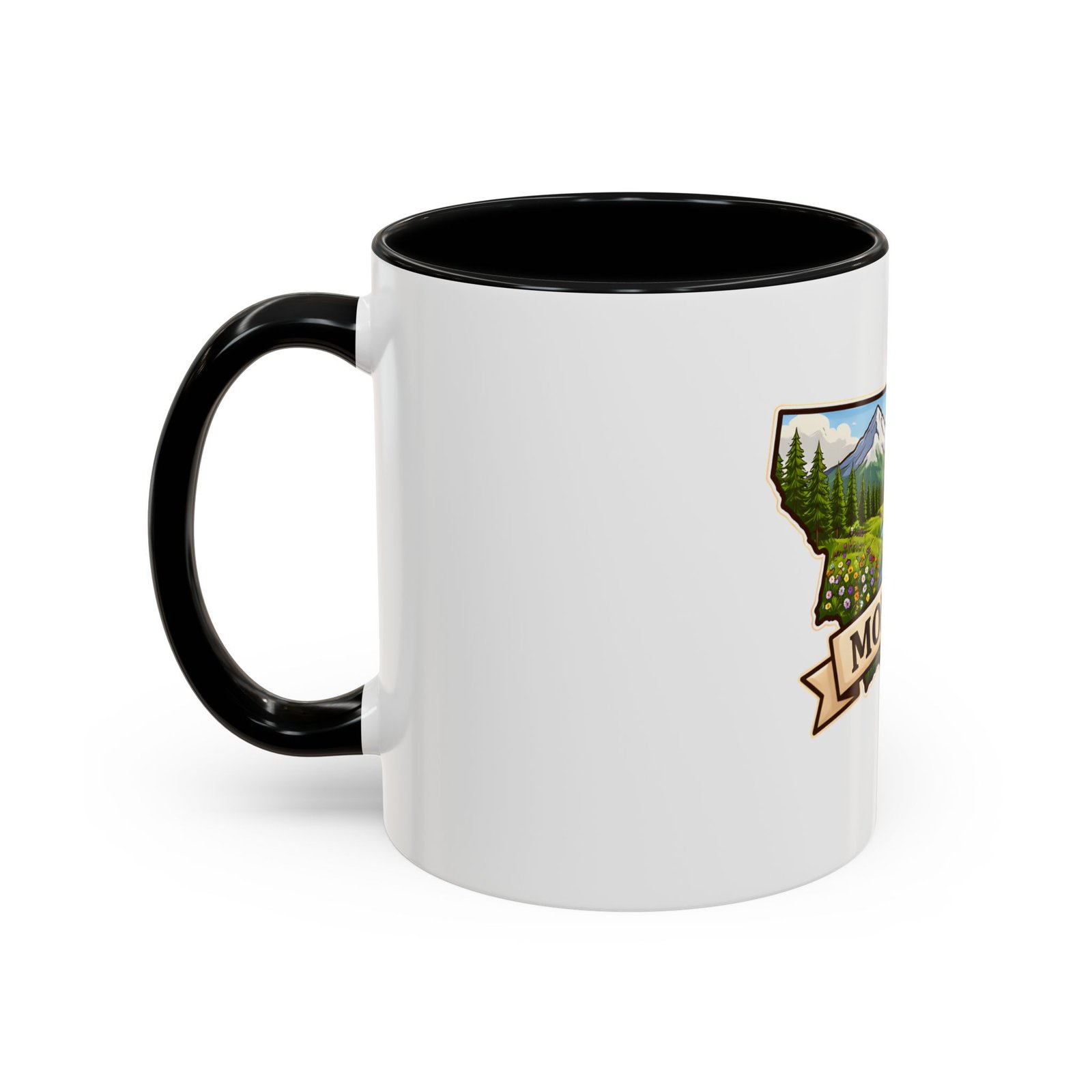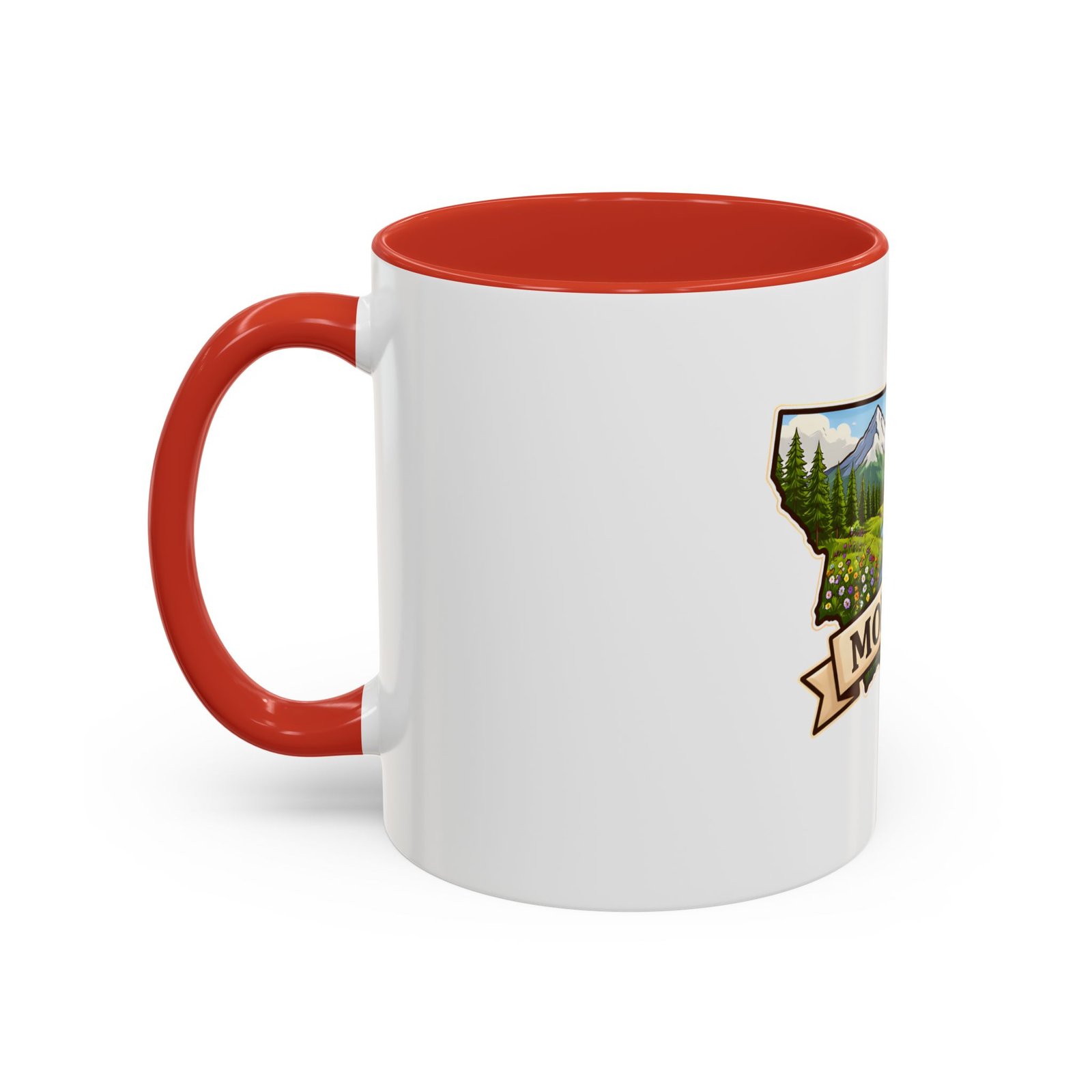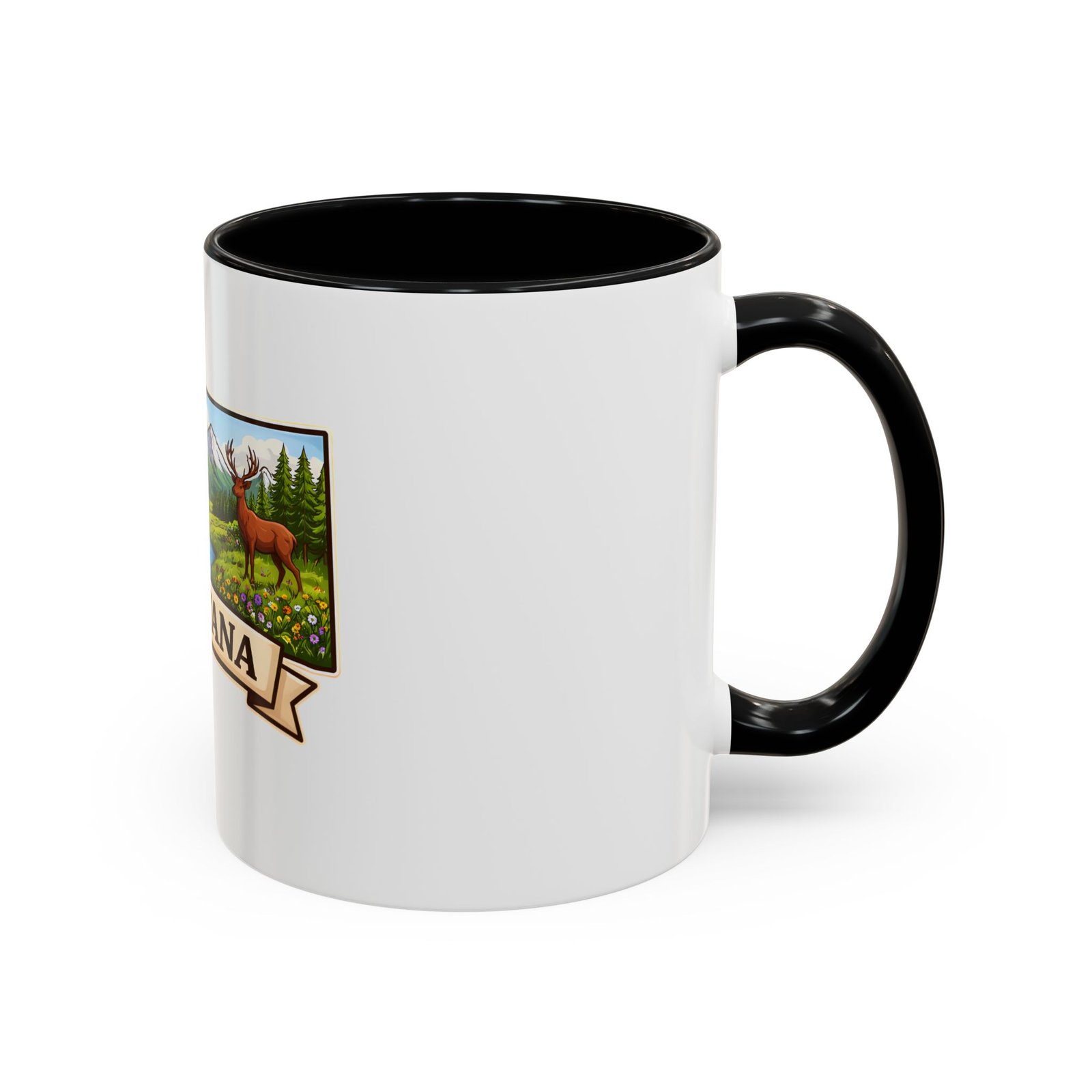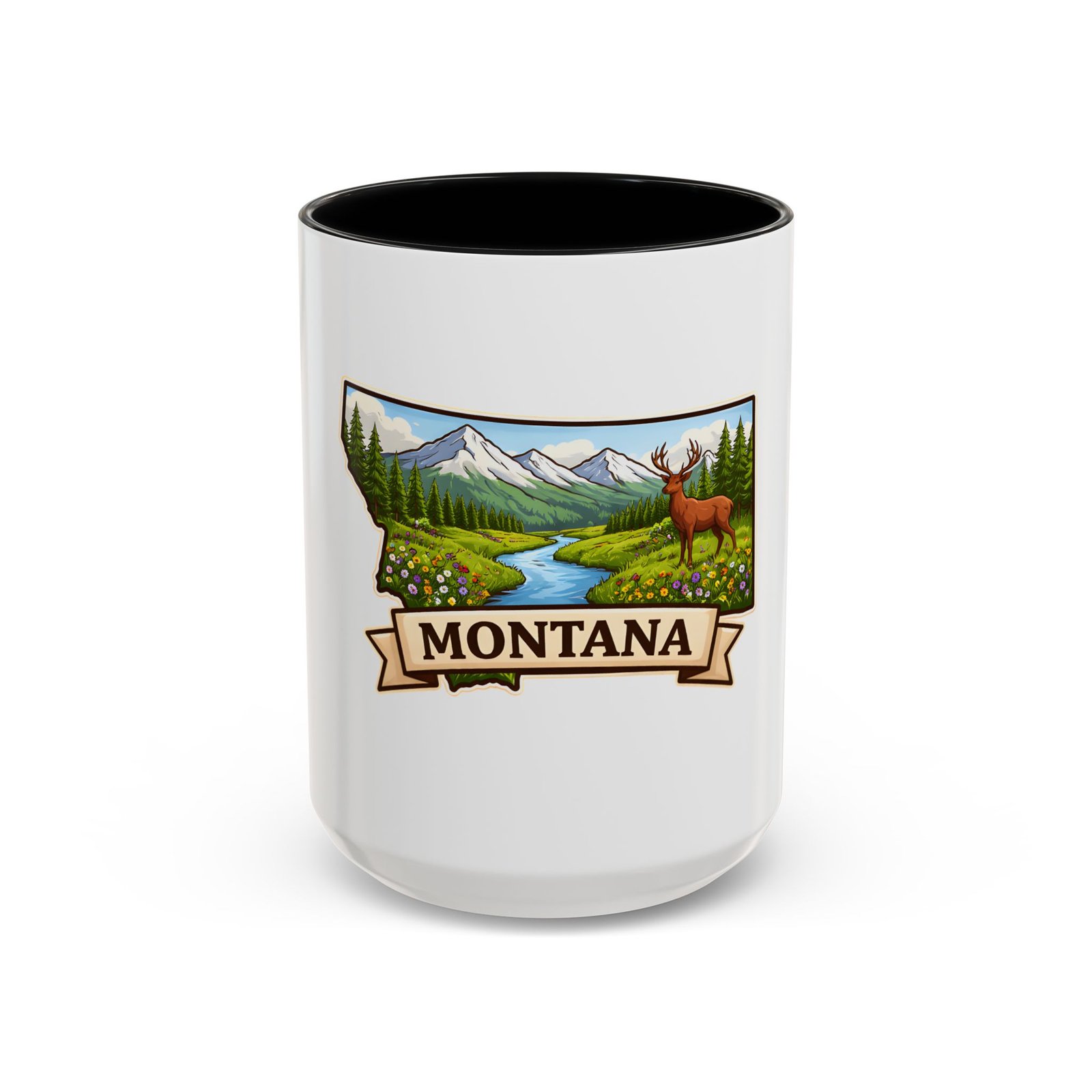 Wake to a crisp, big-sky morning with this Montana accent mug. Bright, detailed artwork wraps the white ceramic body — a winding blue river, wildflower meadows, evergreen pines, snow-capped peaks and a proud elk framed by a vintage banner that reads “Montana.” The colored interior and handle add a bold contrast that makes the scene pop while the glossy finish keeps the image lively through daily use. Hold it on chilly porch mornings, beside a stack of maps, or as you plan the next trail. This mug feels like a quiet moment in the West: clear, grounded, and ready for whatever the day brings.