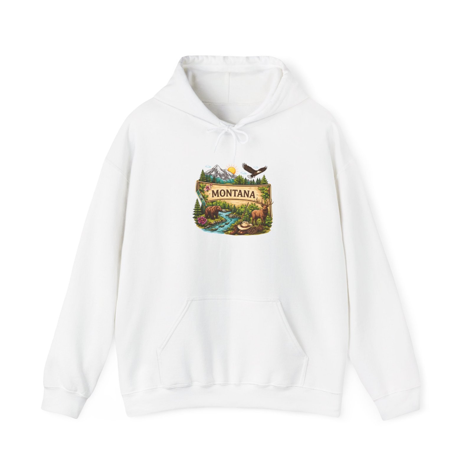 This cozy hoodie carries a slice of Montana with it — crisp mountain peaks, winding rivers, evergreens, and a soaring eagle rendered in rich, vintage-inspired color. The midweight fabric and double-lined hood make it comfortable on cool mornings by the lake or layered for an evening by the campfire. Wear it on road trips through wide-open skies, at the trailhead while lacing boots, or curled up at home remembering long summer drives along two-lane highways. The design speaks to folks who savor wide spaces, slow coffee, and the kind of quiet that makes you breathe deeper. The relaxed fit and roomy kangaroo pocket keep hands warm and essentials close. Subtle, durable printing sits centered on the chest so the art reads like a worn patch of memory—nostalgic, outdoorsy, and unapologetically Montanan.
