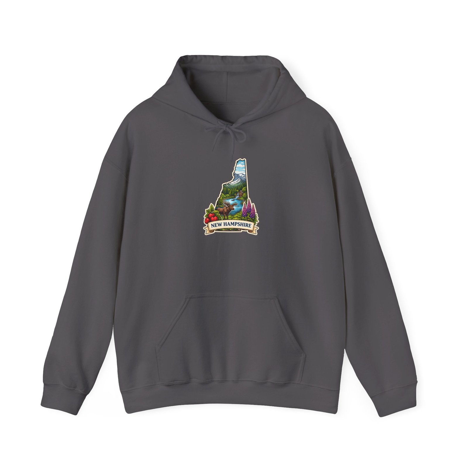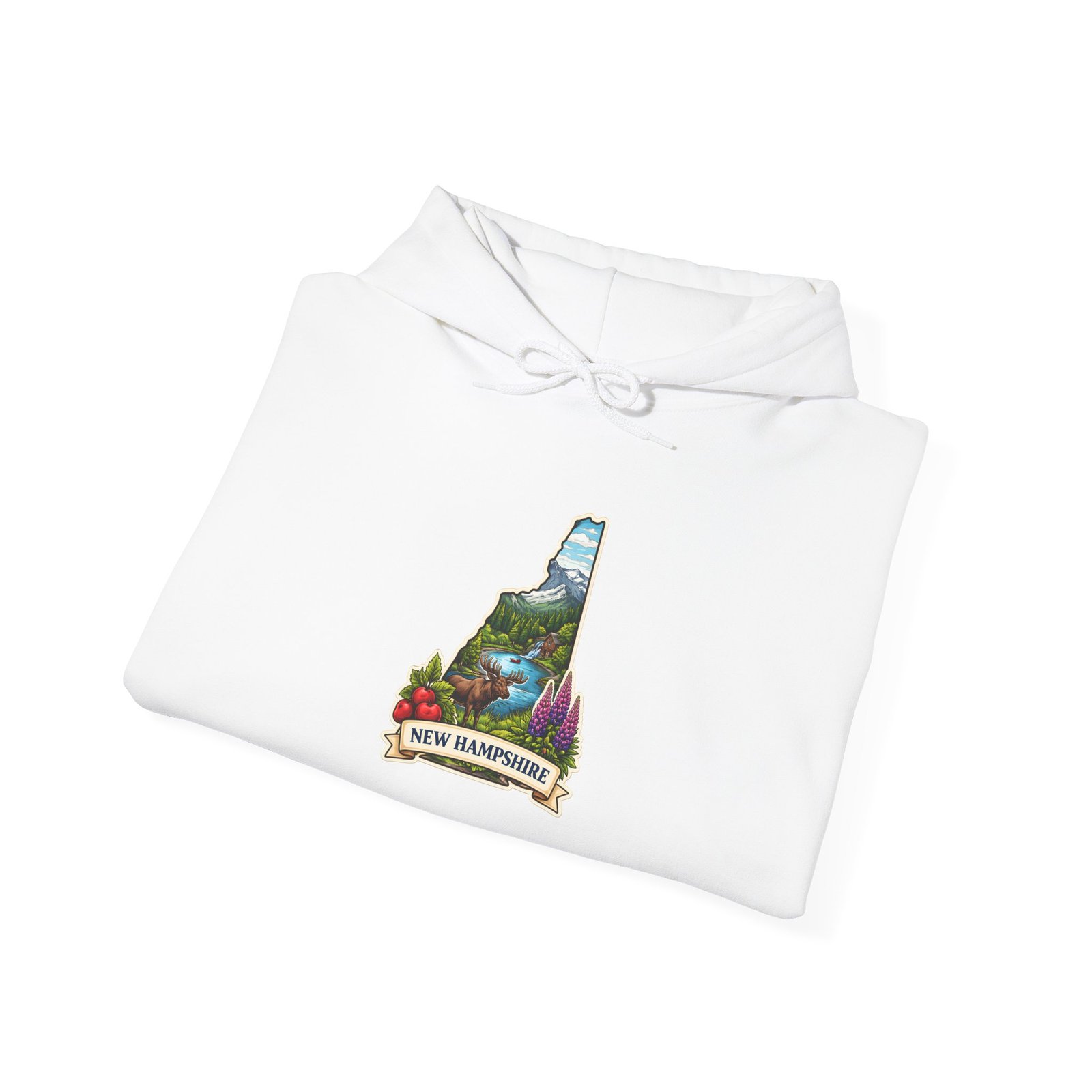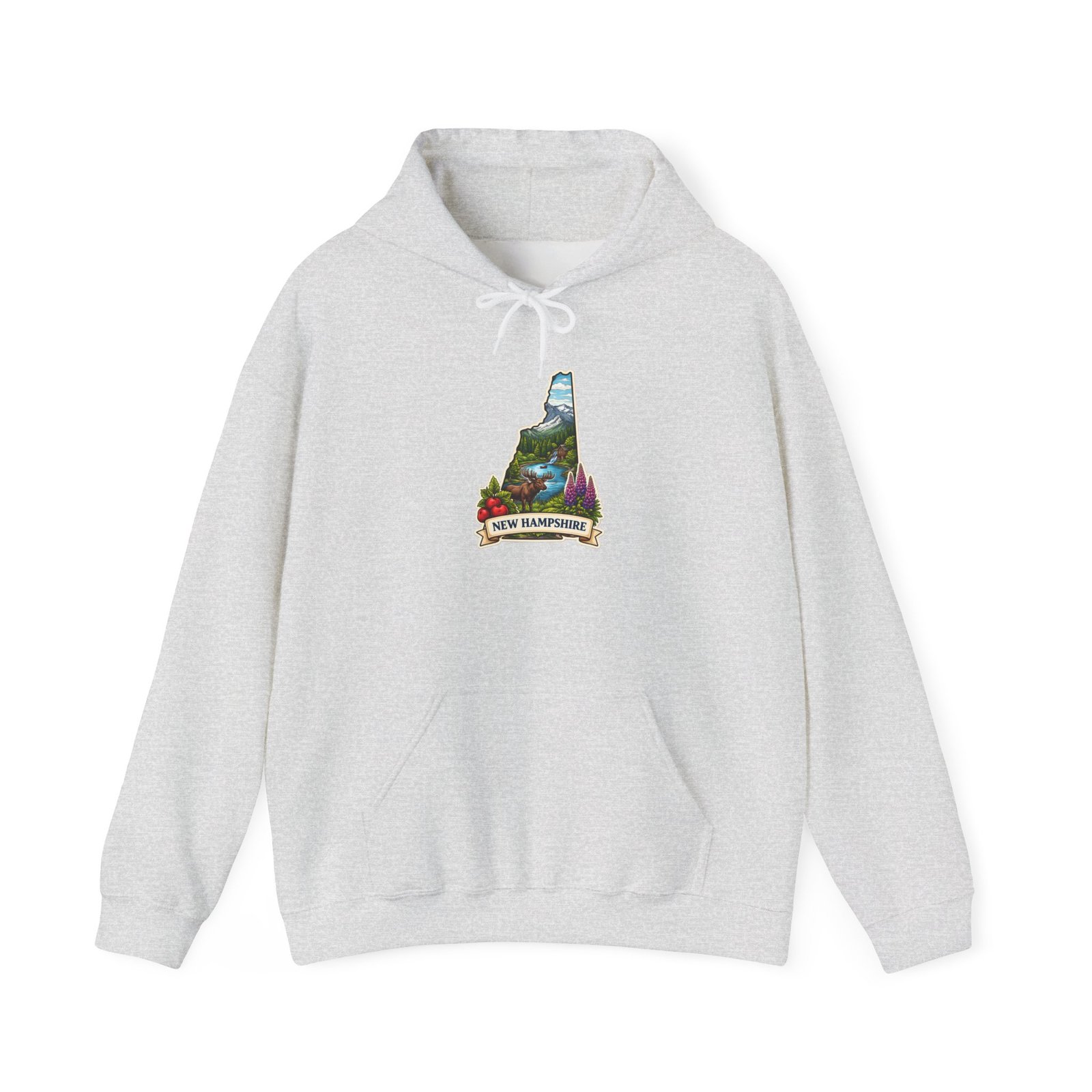 This cozy hooded sweatshirt carries a quiet, outdoorsy soul—soft, warm, and built to be lived in. A detailed state-shaped illustration sits on the chest, layered with mountain ridgelines, evergreen forests, and wildflowers that feel like a carried memory of a day hiked and a stream crossed. The roomy kangaroo pocket and double-lined hood add practical comfort while the neutral white ground lets the colorful artwork pop. Wear it on cool mornings, by a campfire, or when you want to bring a little familiar landscape into your everyday routine.