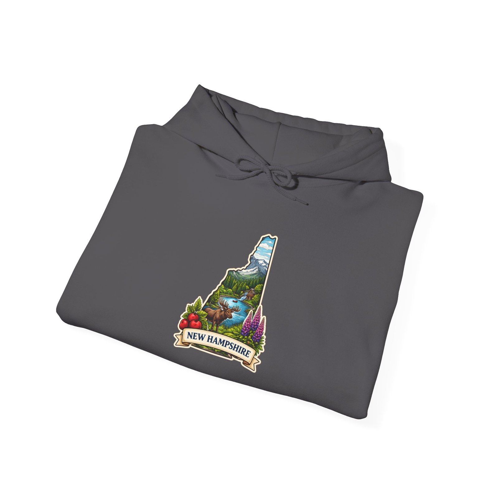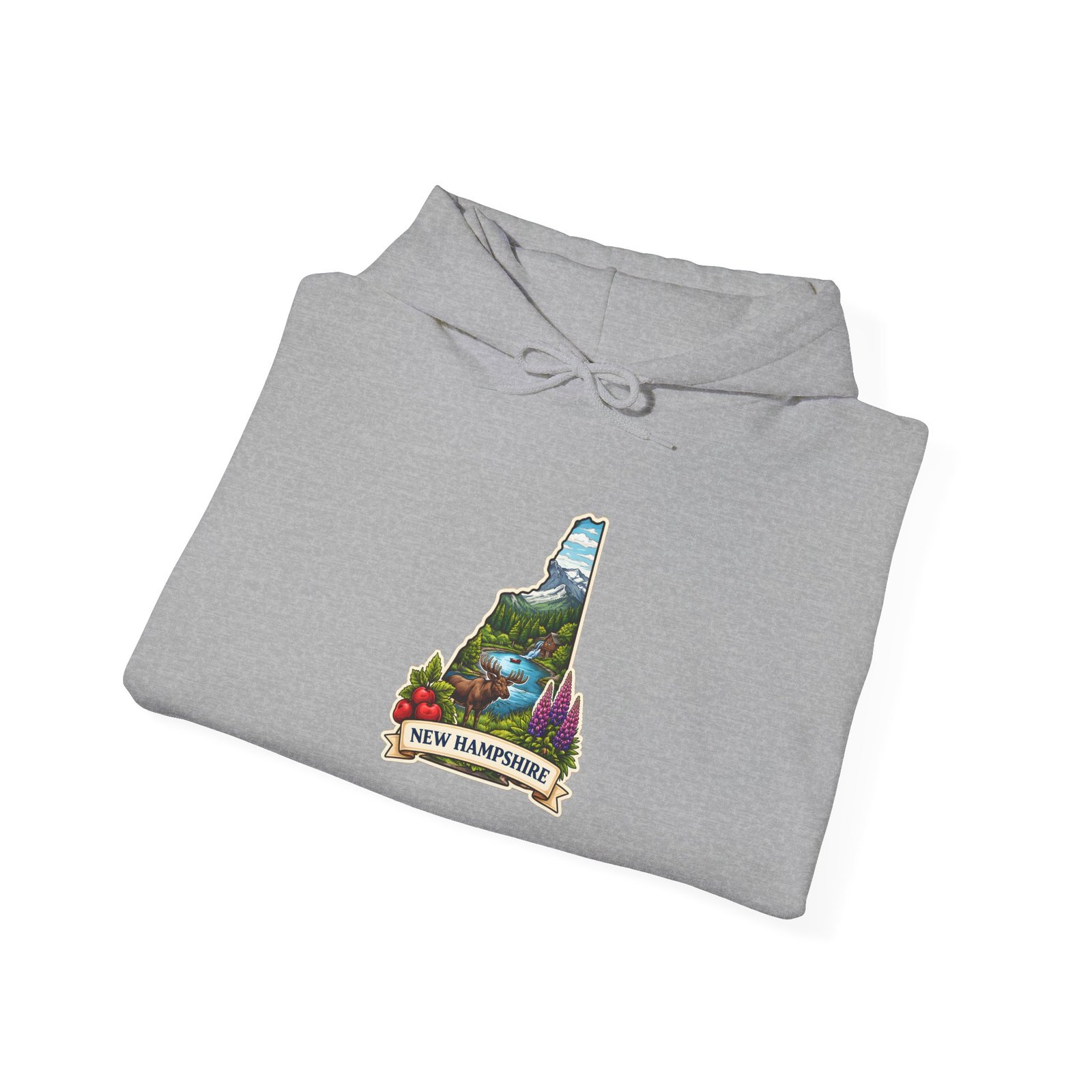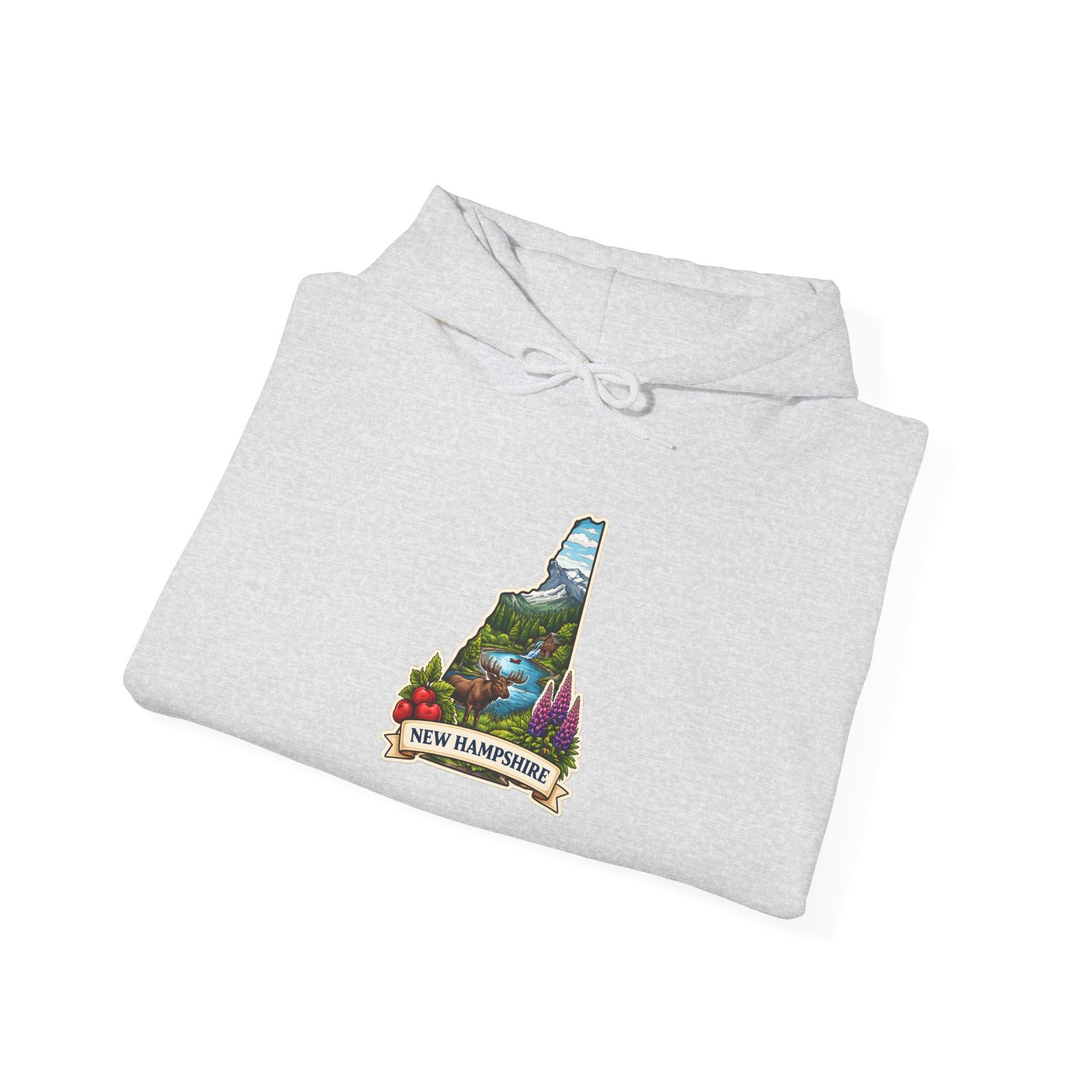This cozy hooded sweatshirt carries a quiet, outdoorsy soul—soft, warm, and built to be lived in. A detailed state-shaped illustration sits on the chest, layered with mountain ridgelines, evergreen forests, and wildflowers that feel like a carried memory of a day hiked and a stream crossed. The roomy kangaroo pocket and double-lined hood add practical comfort while the neutral white ground lets the colorful artwork pop. Wear it on cool mornings, by a campfire, or when you want to bring a little familiar landscape into your everyday routine.