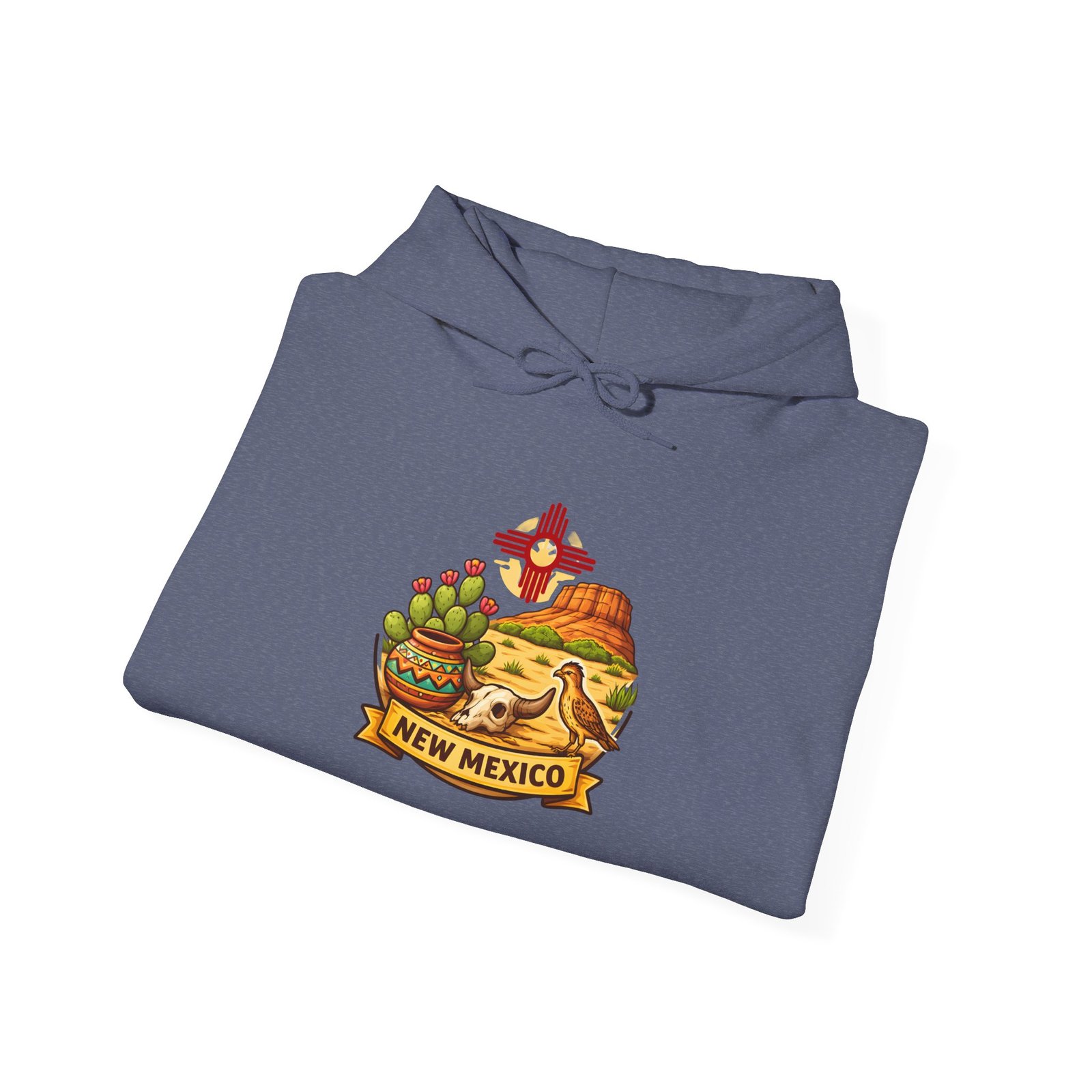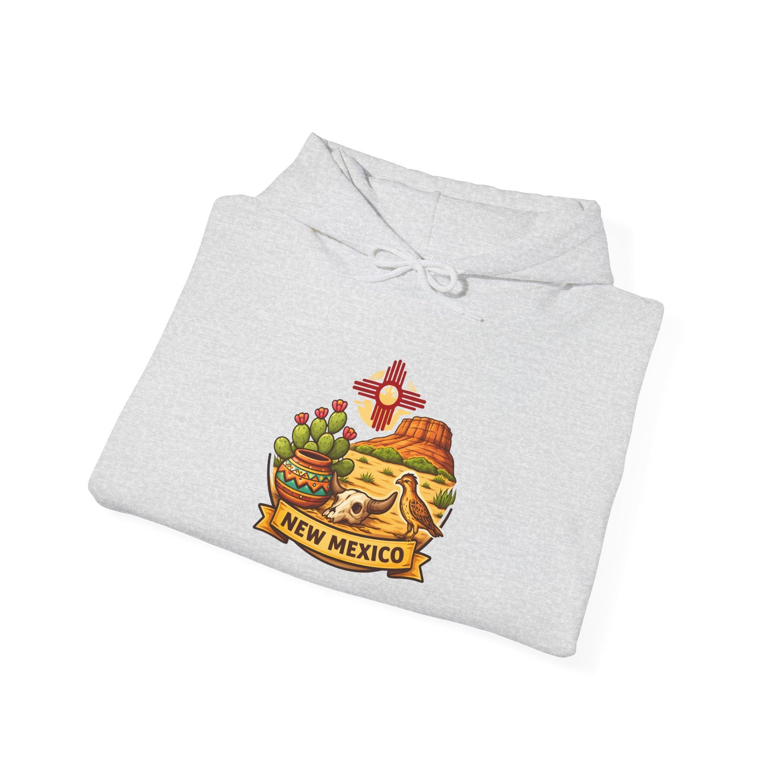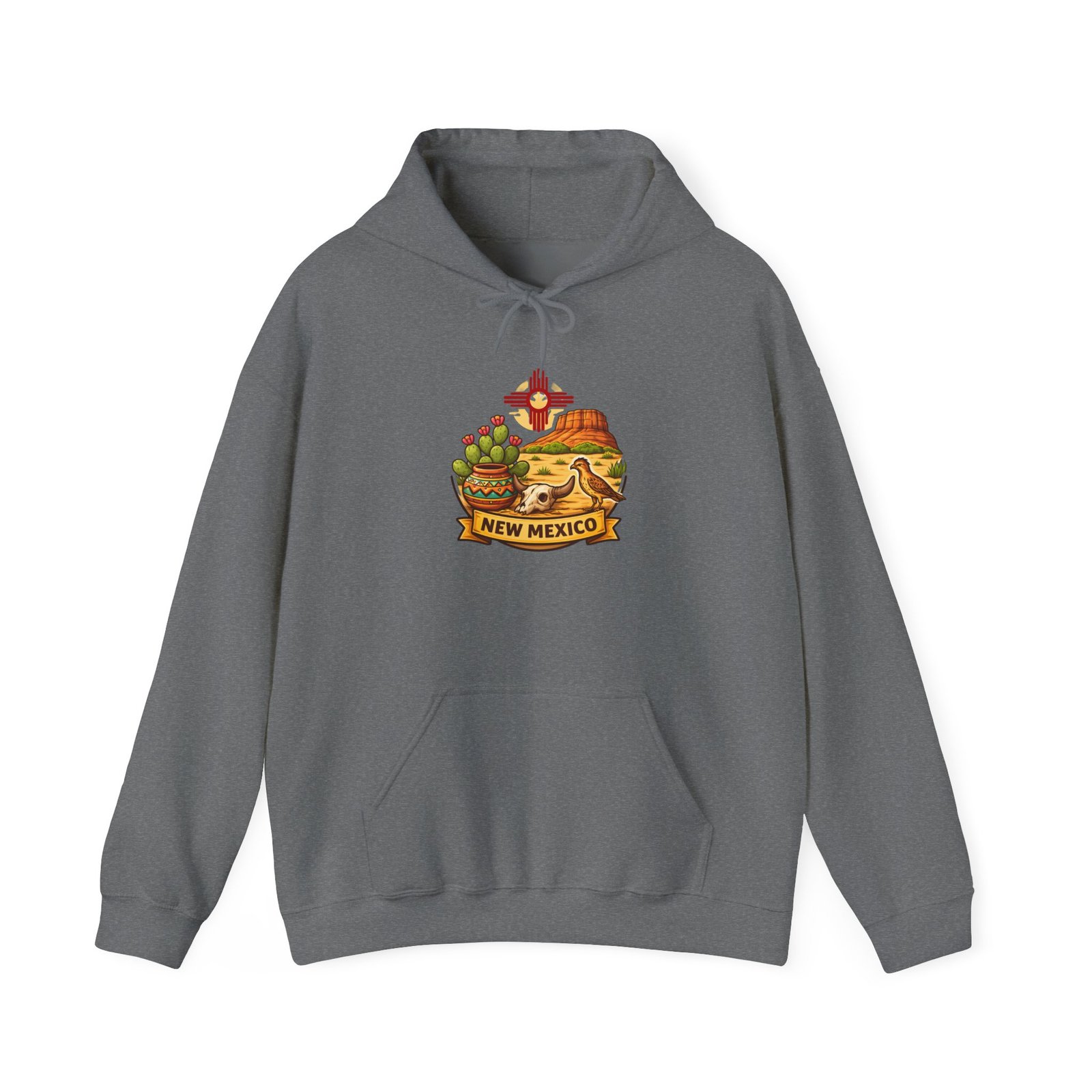 This cozy hoodie brings a slice of New Mexico warmth to everyday wear. Soft, medium-weight fabric and a double-lined hood wrap you in easy comfort while the small, colorful chest graphic—desert landscape, succulents, and a traditional Zia-inspired emblem—adds quiet Southwestern charm. Wear it on cool mornings at the farmers’ market, layered for road trips through red-rock canyons, or around a small backyard bonfire with friends. The kangaroo pocket keeps hands warm; clean, stitched details keep the look simple so the artwork can speak. For anyone who collects places, memories, or low-key travel style, this hoodie feels like a familiar stop on the map.