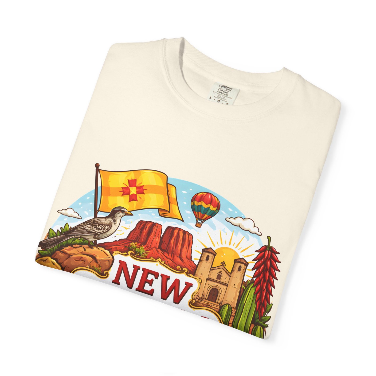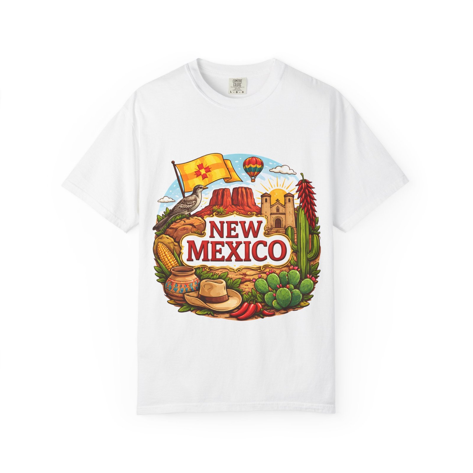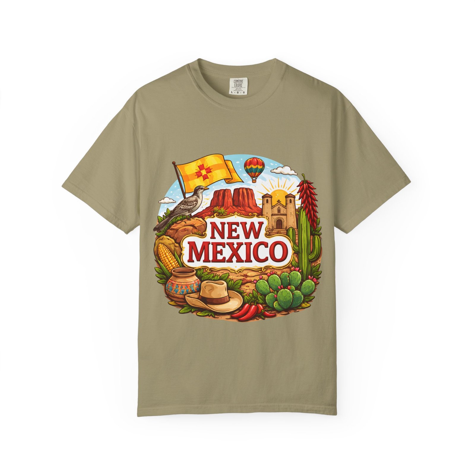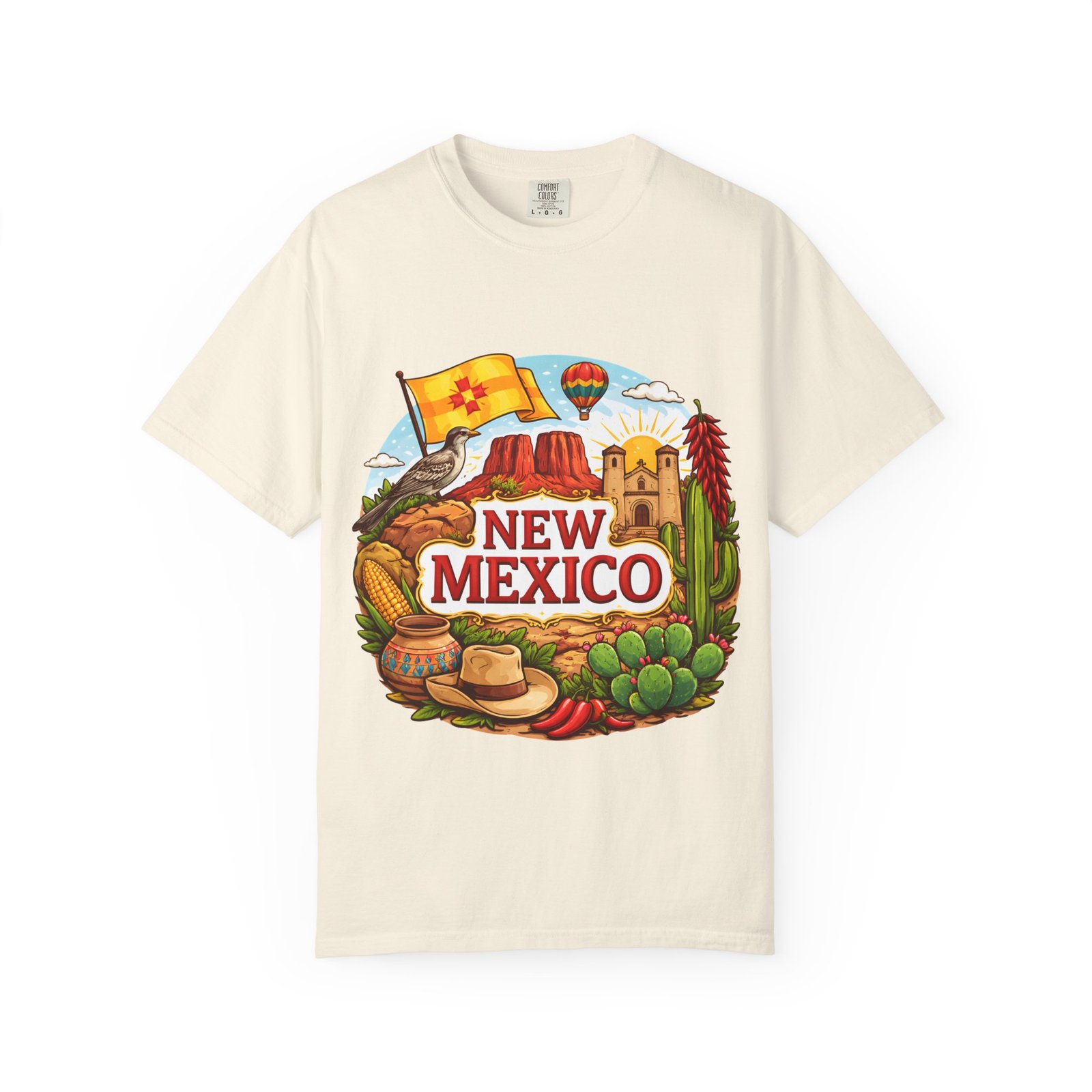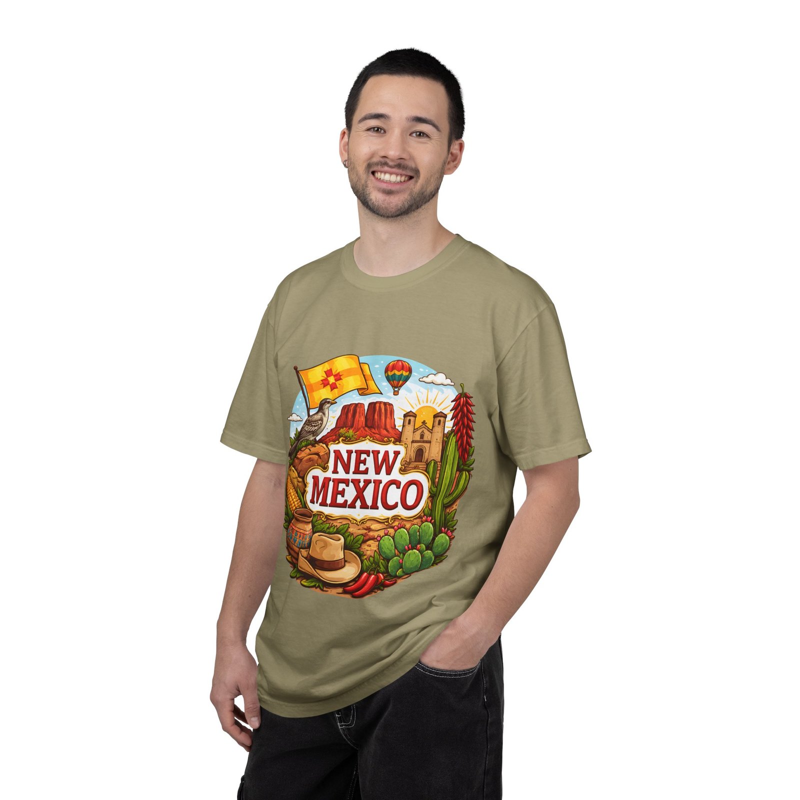 This relaxed, garment-dyed tee carries a sunbaked New Mexico scene — mesas, cacti, hot-air balloons and pottery — printed with warm, hand-illustrated color. The heavyweight cotton feels substantial and broken-in at the same time, draping casually over jeans or layered under a flannel for cool mornings on the trail. Wear it on road trips through desert highways, at local markets, or whenever you want a quiet reminder of wide skies and adobe sunsets. The soft, washed-in color from the post-construction dyeing gives each shirt subtle depth and lived-in character, so it looks like an old favorite from the first wear.