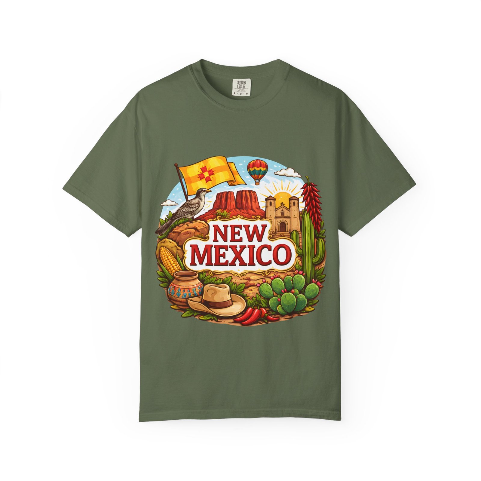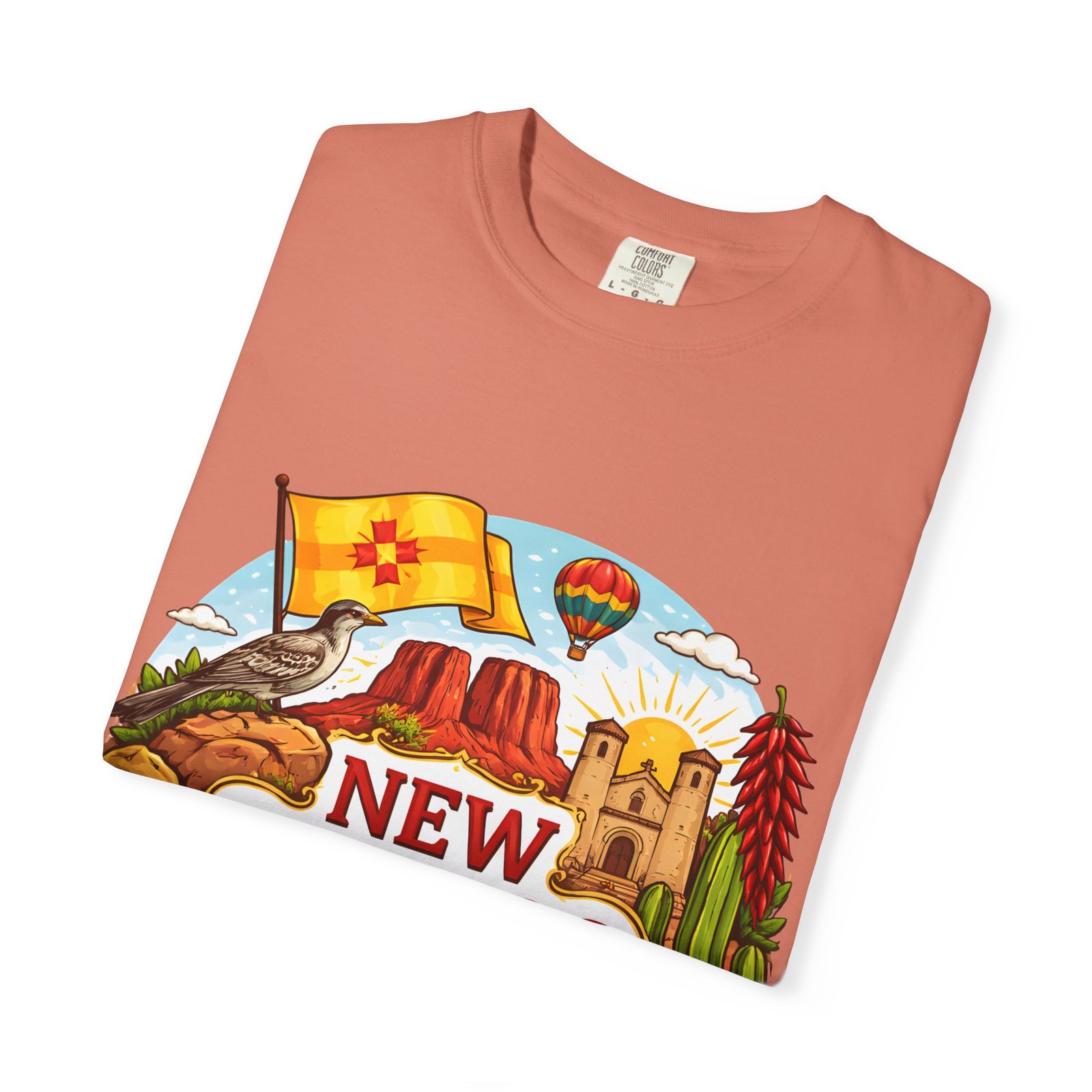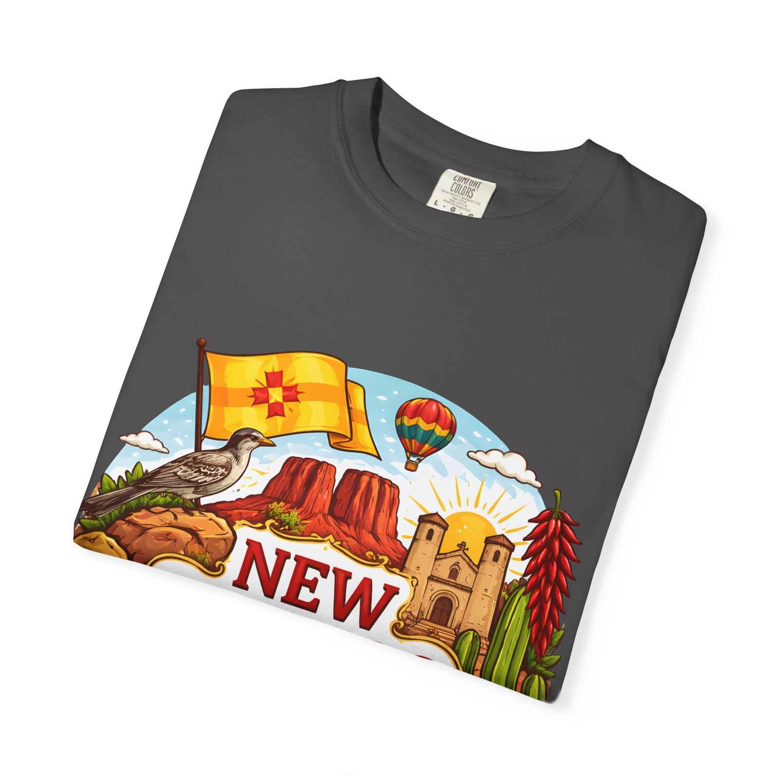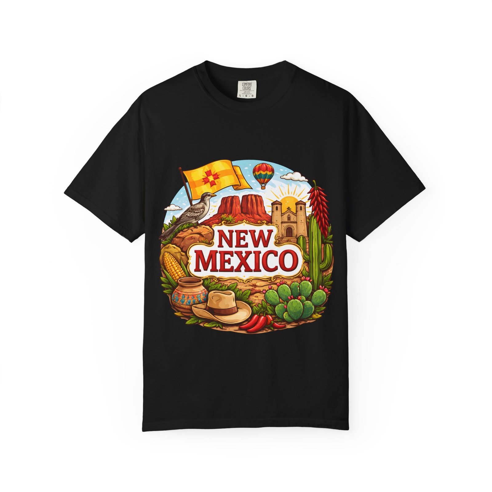 This relaxed, garment-dyed tee carries a sunbaked New Mexico scene — mesas, cacti, hot-air balloons and pottery — printed with warm, hand-illustrated color. The heavyweight cotton feels substantial and broken-in at the same time, draping casually over jeans or layered under a flannel for cool mornings on the trail. Wear it on road trips through desert highways, at local markets, or whenever you want a quiet reminder of wide skies and adobe sunsets. The soft, washed-in color from the post-construction dyeing gives each shirt subtle depth and lived-in character, so it looks like an old favorite from the first wear.