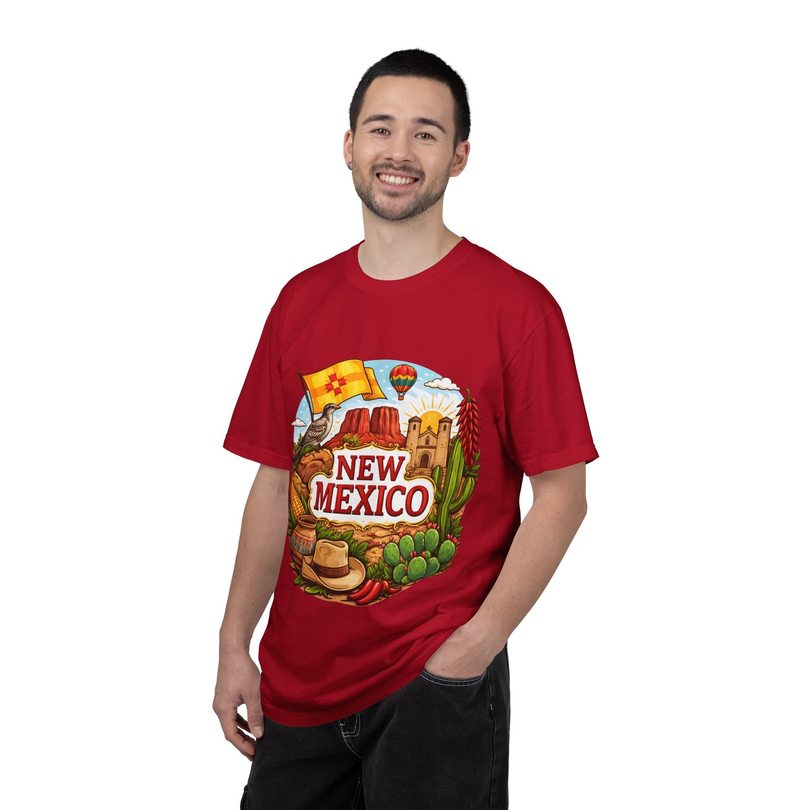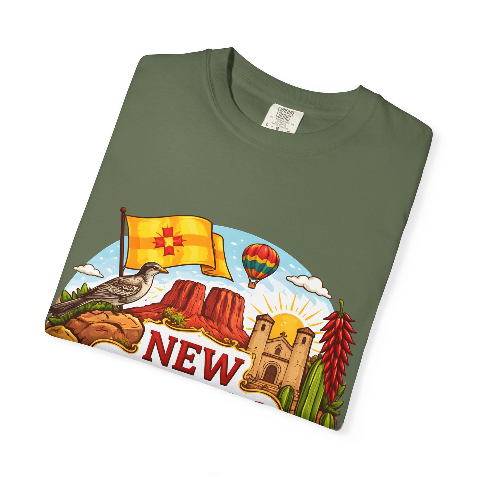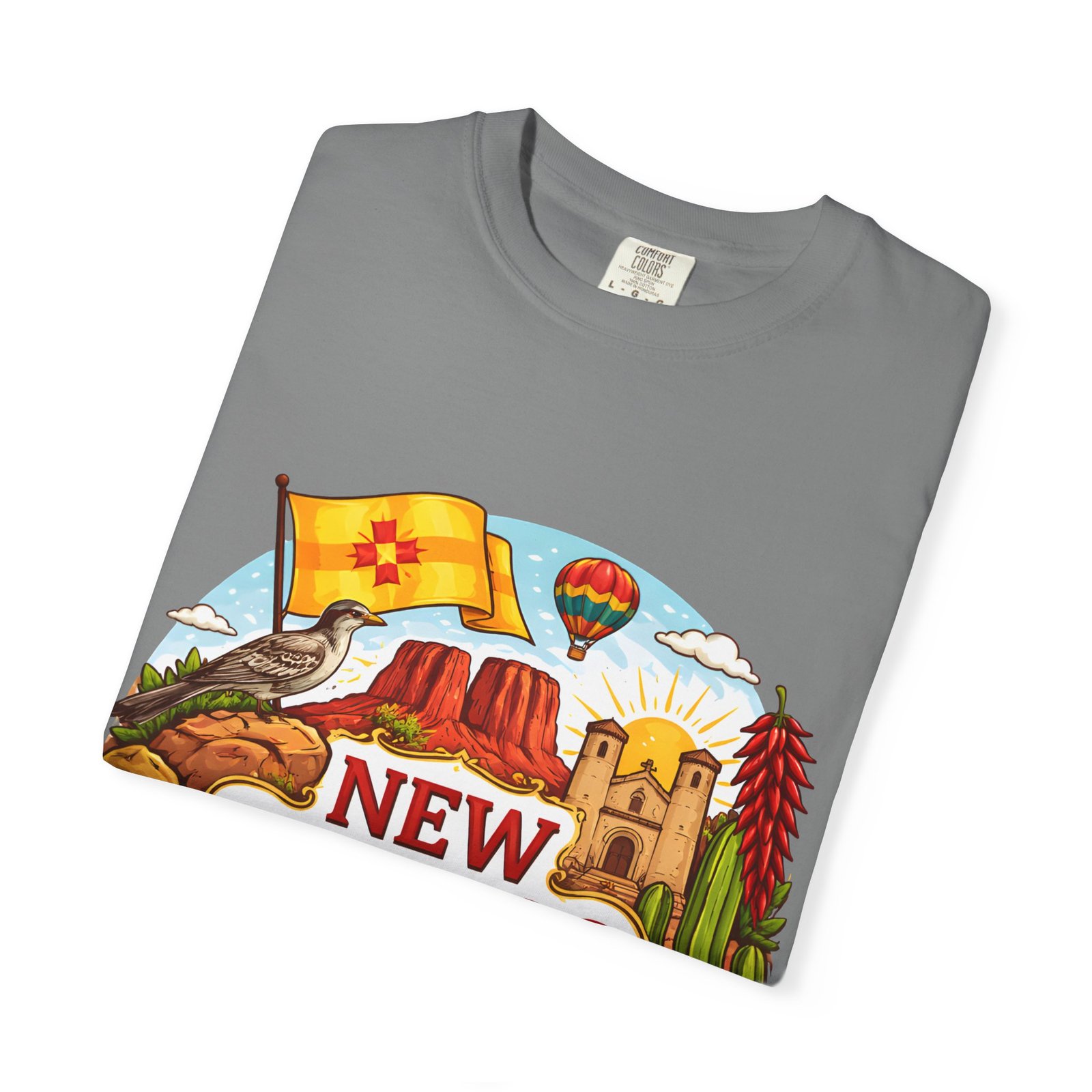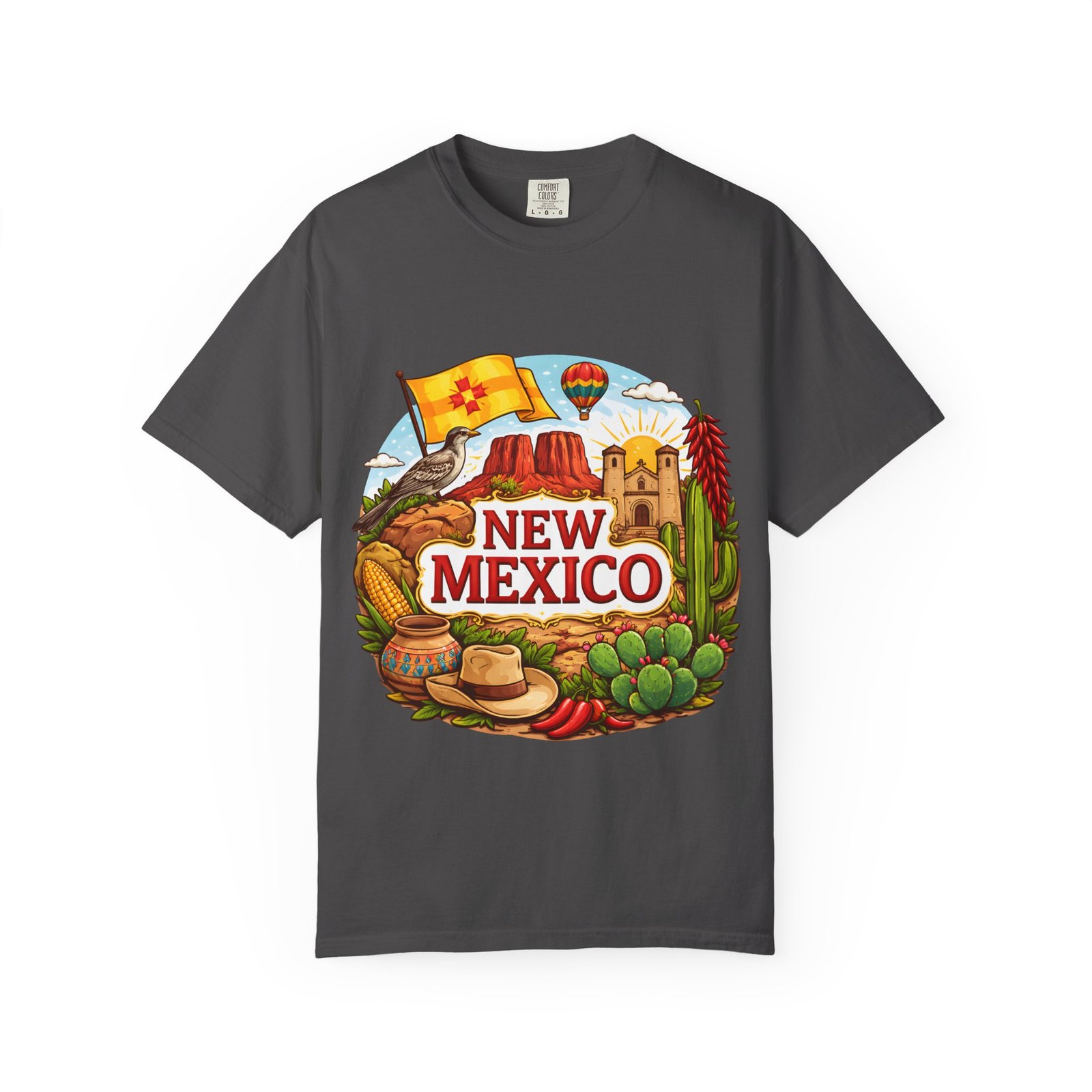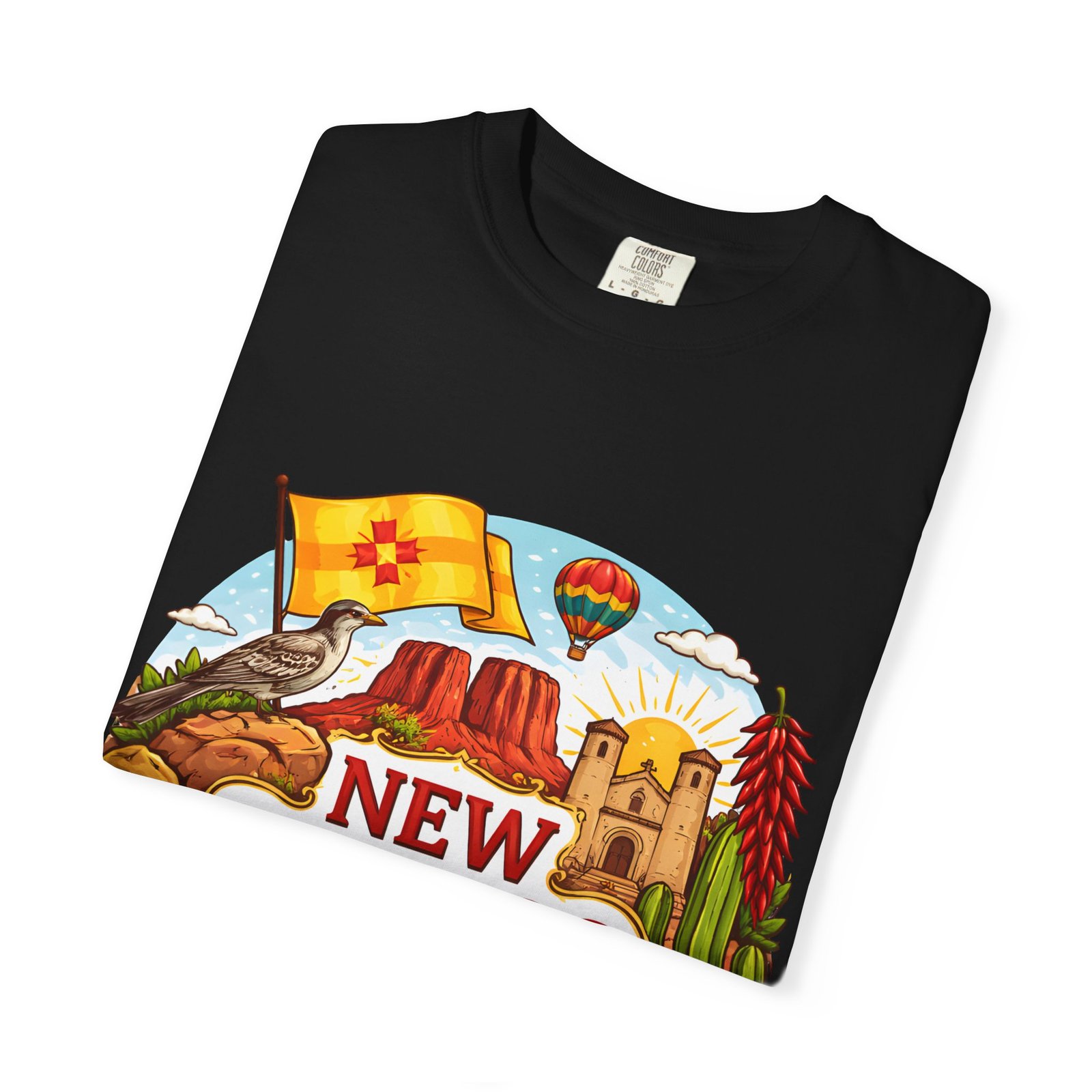 This relaxed, garment-dyed tee carries a sunbaked New Mexico scene — mesas, cacti, hot-air balloons and pottery — printed with warm, hand-illustrated color. The heavyweight cotton feels substantial and broken-in at the same time, draping casually over jeans or layered under a flannel for cool mornings on the trail. Wear it on road trips through desert highways, at local markets, or whenever you want a quiet reminder of wide skies and adobe sunsets. The soft, washed-in color from the post-construction dyeing gives each shirt subtle depth and lived-in character, so it looks like an old favorite from the first wear.