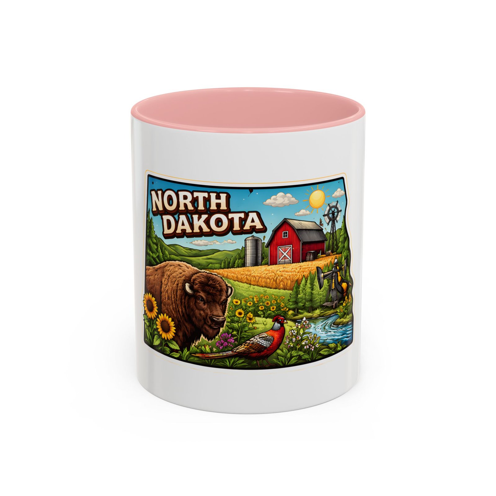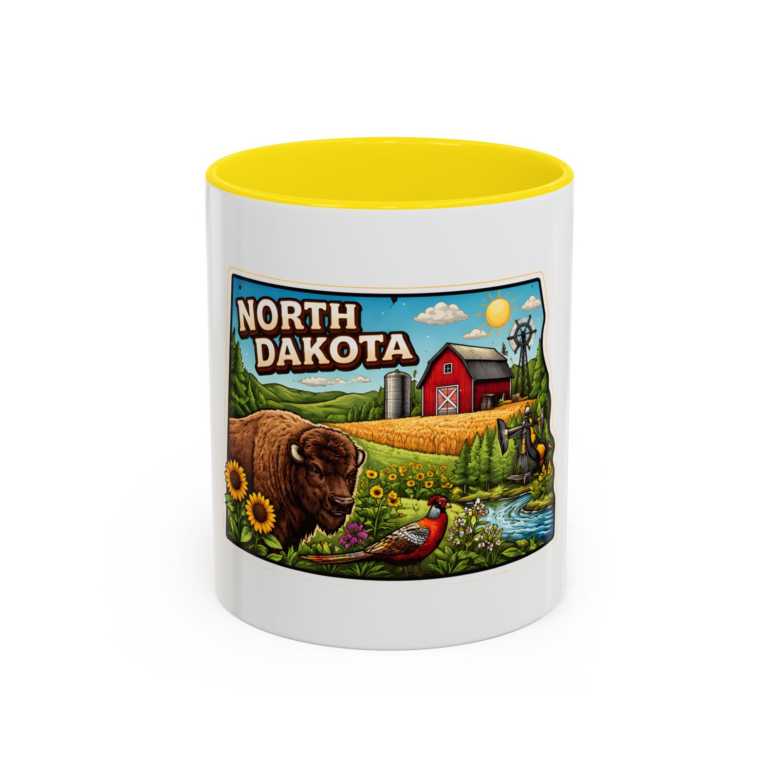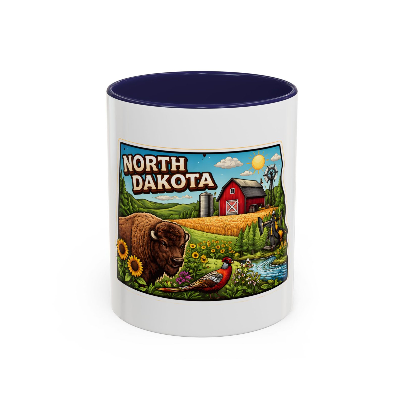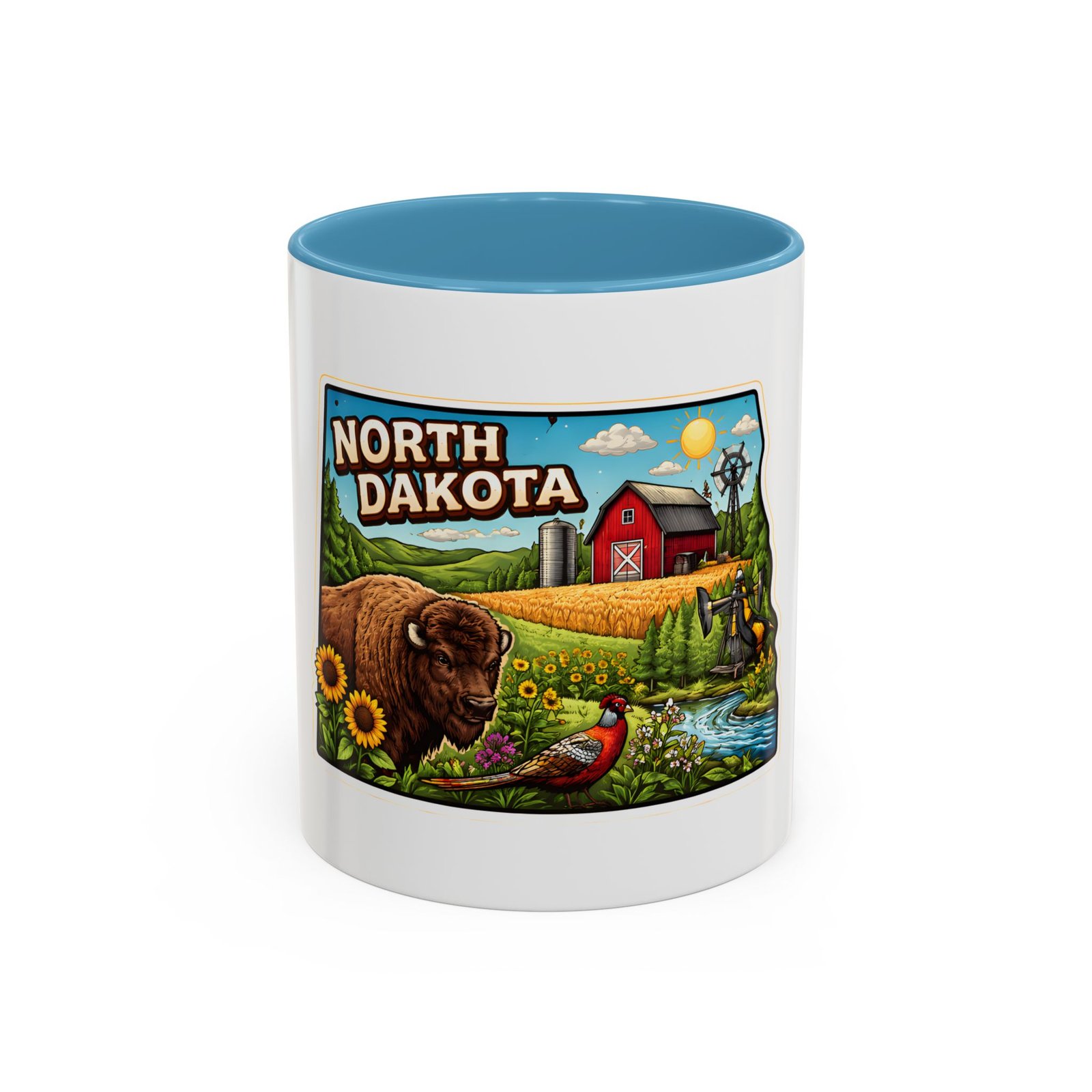 Wake up with a little slice of the Northern Plains in your hands. This ceramic mug wears a lively, colorful illustration of North Dakota — rolling wheat fields, a red barn, a grazing bison, wild sunflowers and a bright sky — all framed like a postcard. It invites slow mornings on the porch, maps spread out on the table, and conversations that start with “remember when.” The contrast of the colored interior and handle gives the artwork room to pop while keeping the feel warm and familiar. Whether it’s the first cup before a day on the land or a cozy evening drink, this mug brings a cheerful, grounded moment that feels like home.
