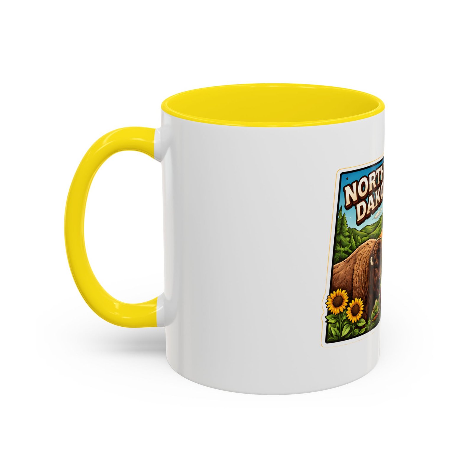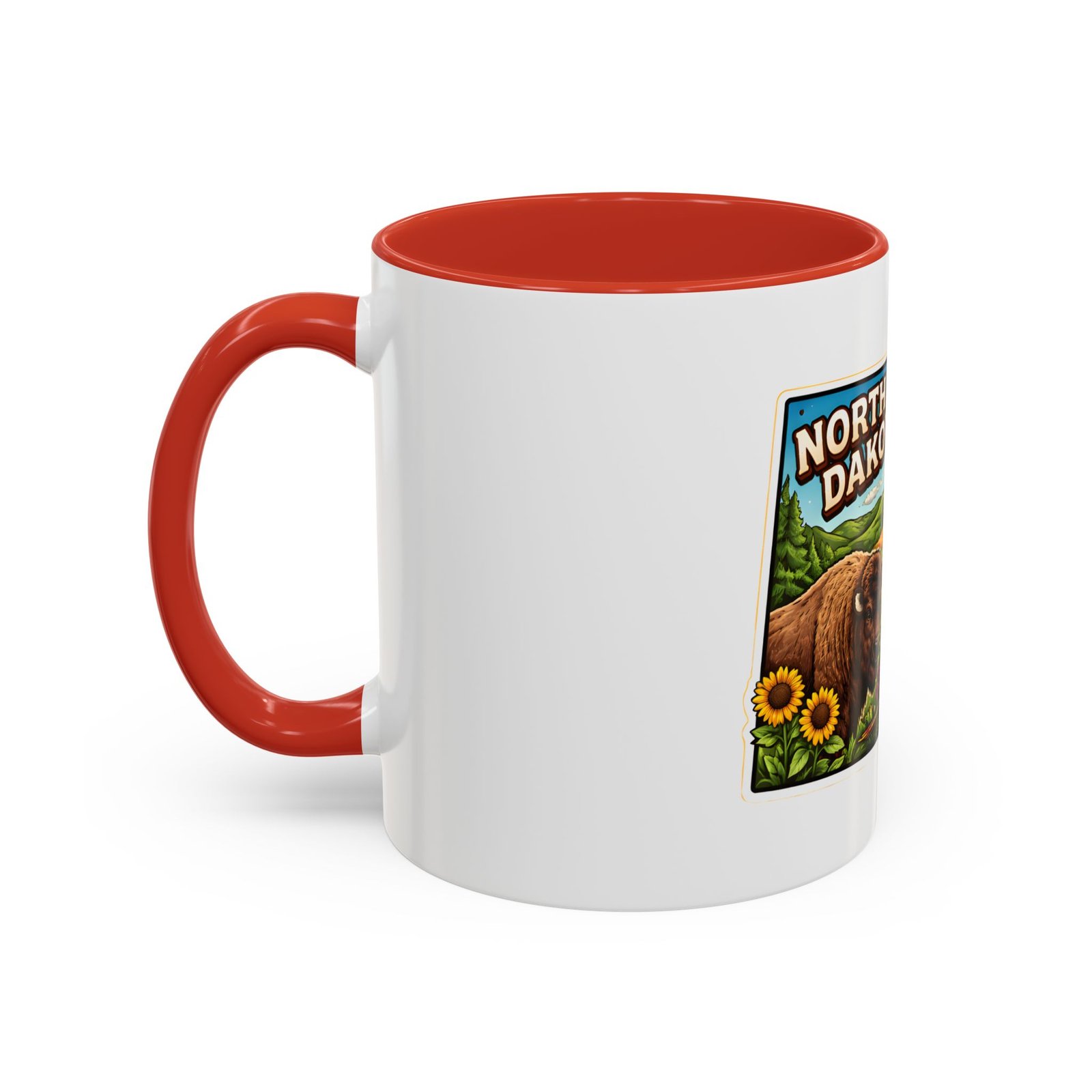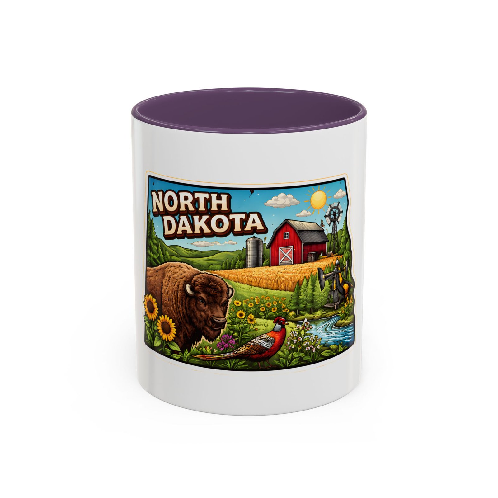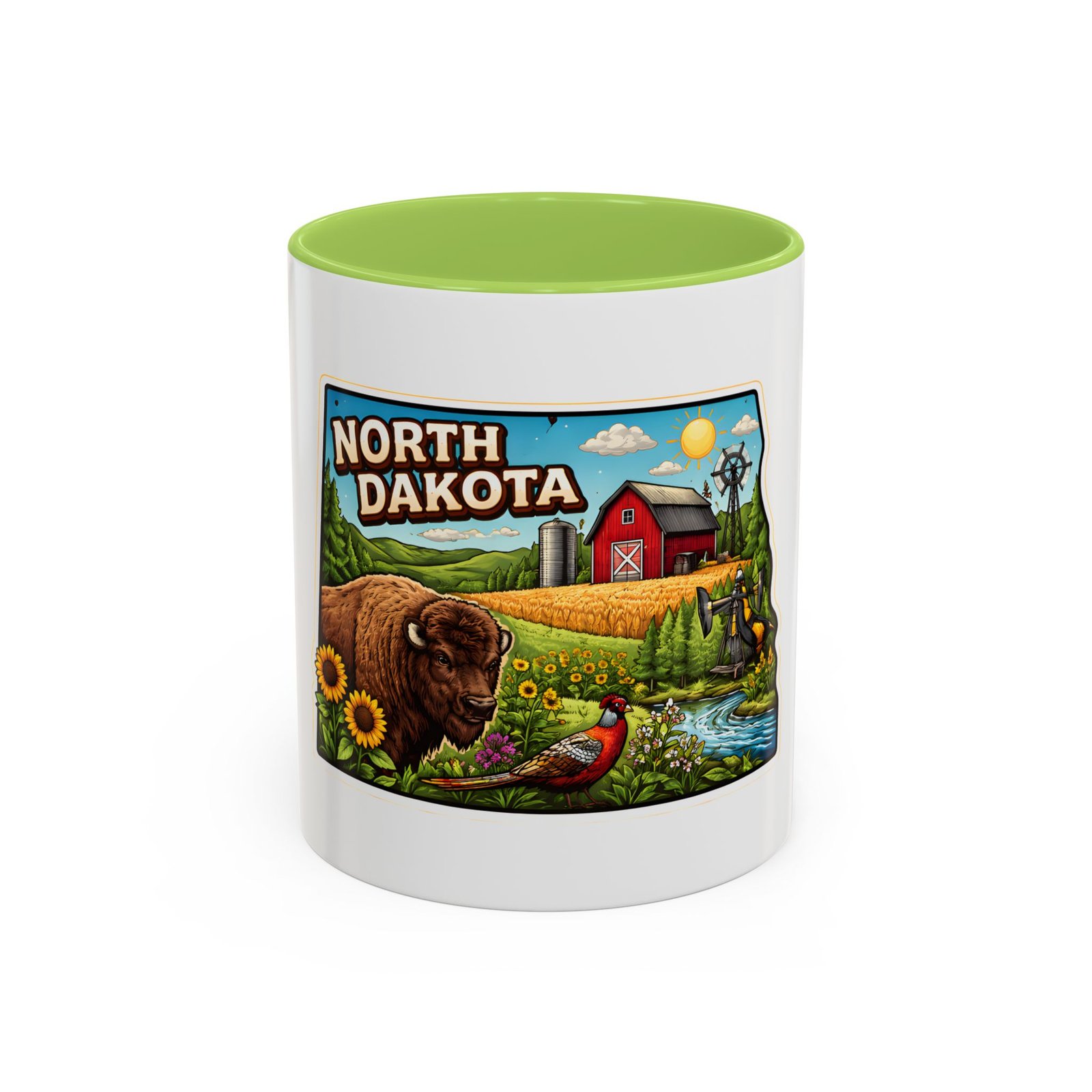 Wake up with a little slice of the Northern Plains in your hands. This ceramic mug wears a lively, colorful illustration of North Dakota — rolling wheat fields, a red barn, a grazing bison, wild sunflowers and a bright sky — all framed like a postcard. It invites slow mornings on the porch, maps spread out on the table, and conversations that start with “remember when.” The contrast of the colored interior and handle gives the artwork room to pop while keeping the feel warm and familiar. Whether it’s the first cup before a day on the land or a cozy evening drink, this mug brings a cheerful, grounded moment that feels like home.