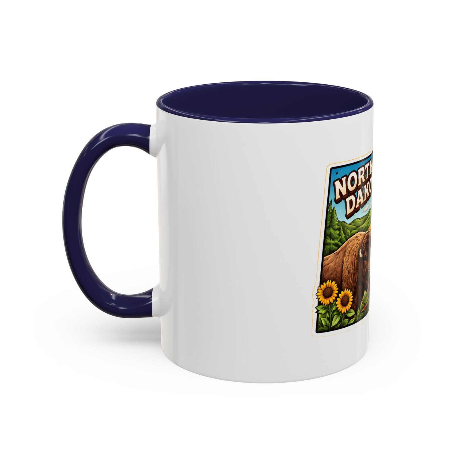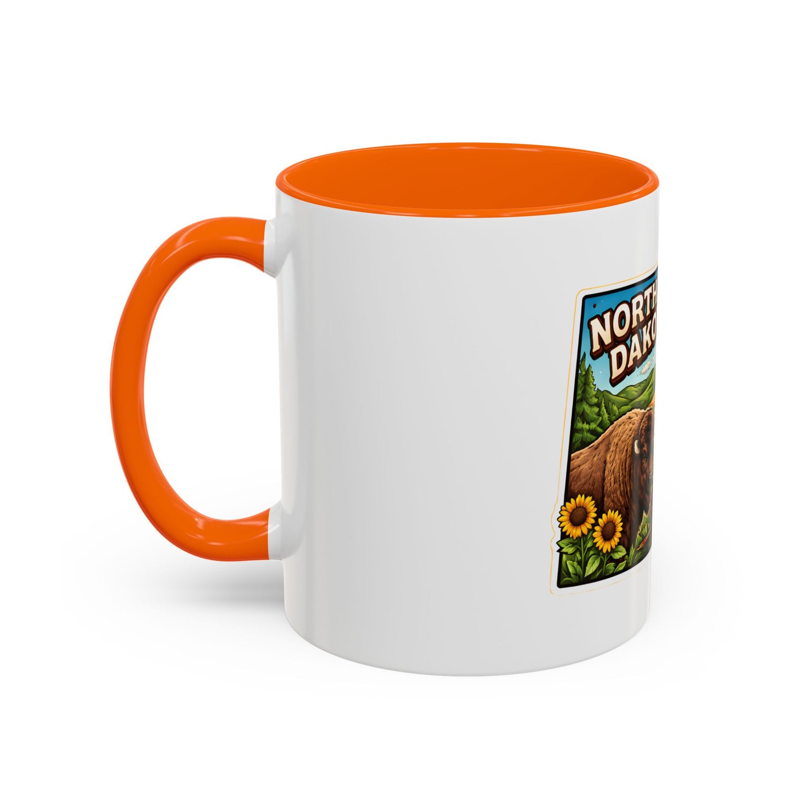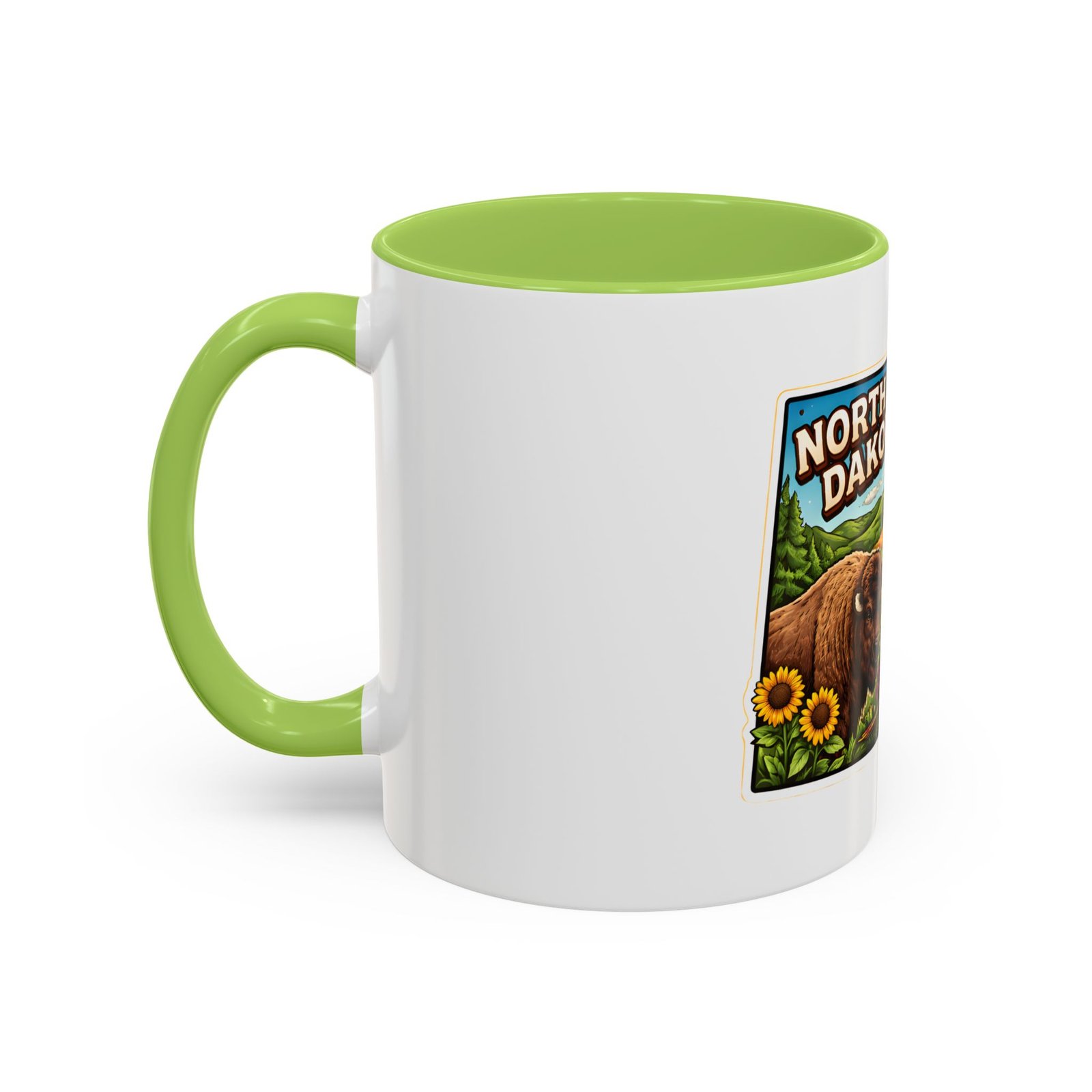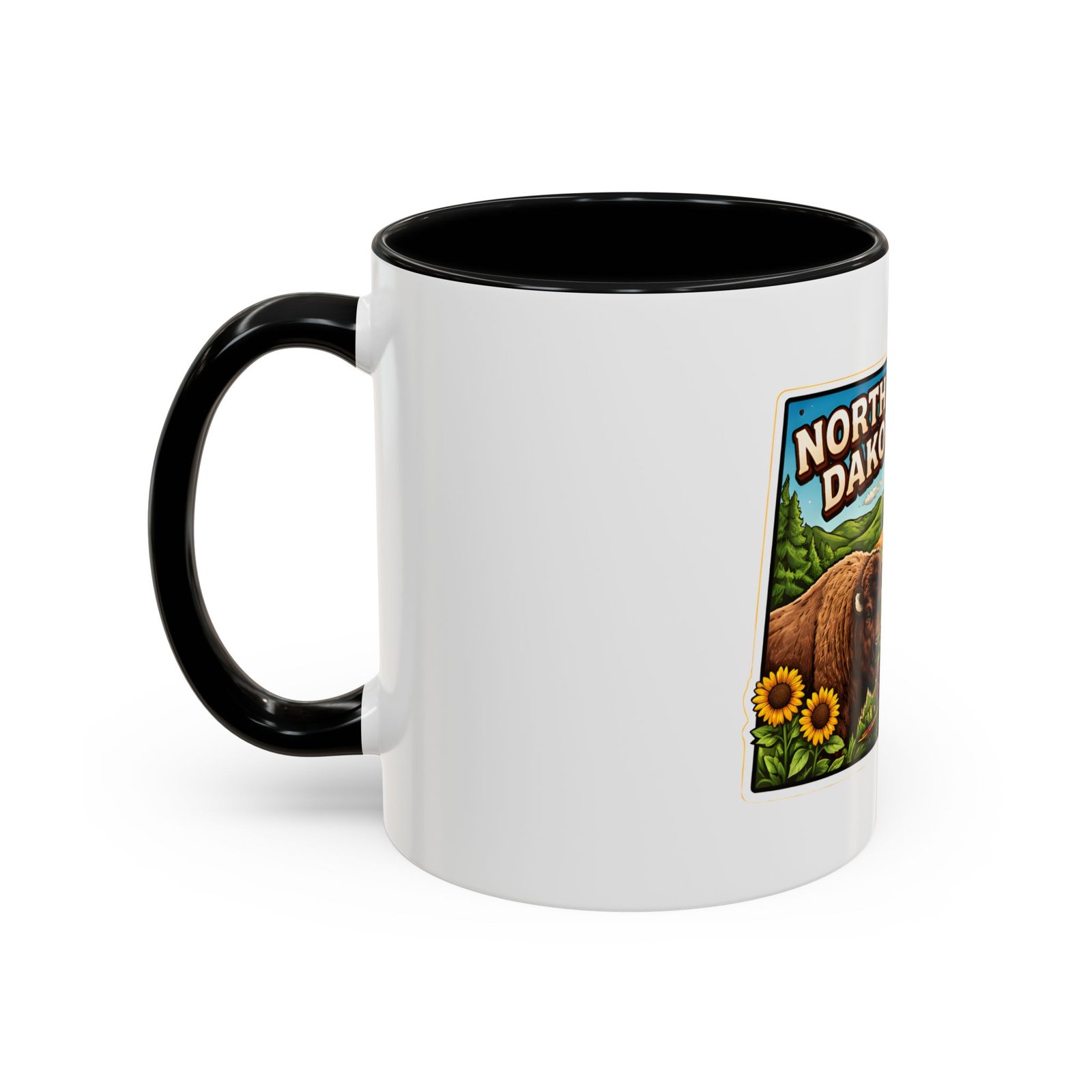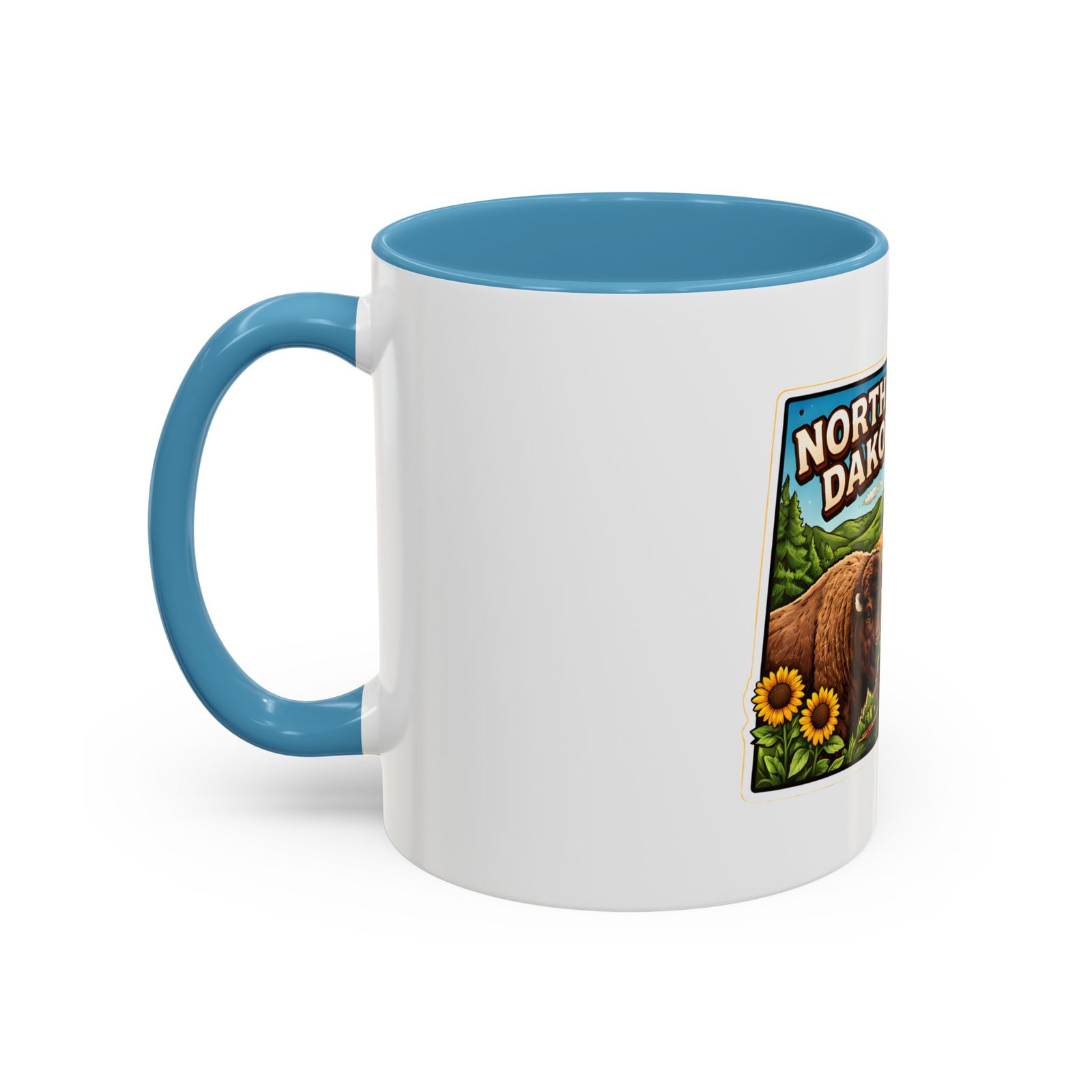 Wake up with a little slice of the Northern Plains in your hands. This ceramic mug wears a lively, colorful illustration of North Dakota — rolling wheat fields, a red barn, a grazing bison, wild sunflowers and a bright sky — all framed like a postcard. It invites slow mornings on the porch, maps spread out on the table, and conversations that start with “remember when.” The contrast of the colored interior and handle gives the artwork room to pop while keeping the feel warm and familiar. Whether it’s the first cup before a day on the land or a cozy evening drink, this mug brings a cheerful, grounded moment that feels like home.
