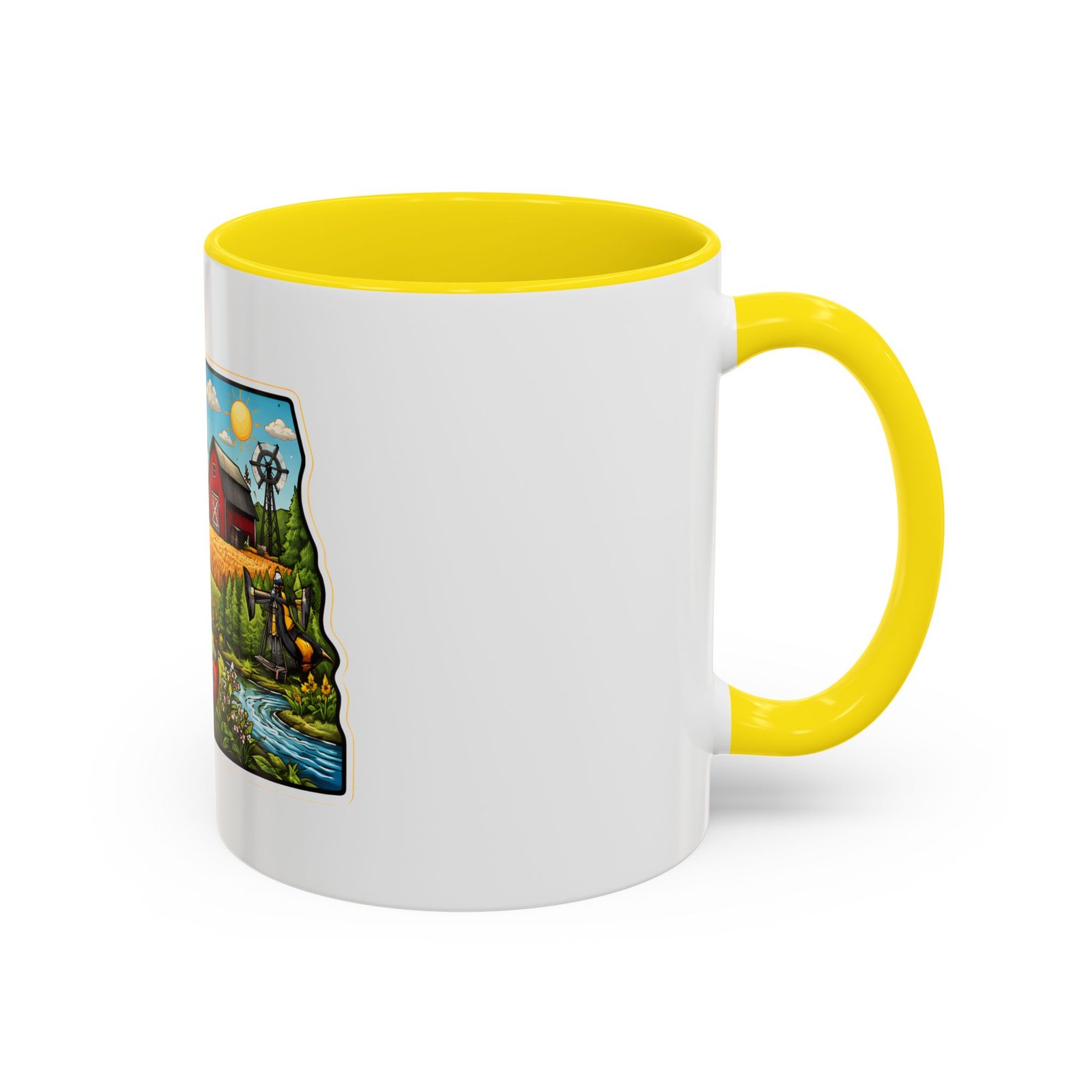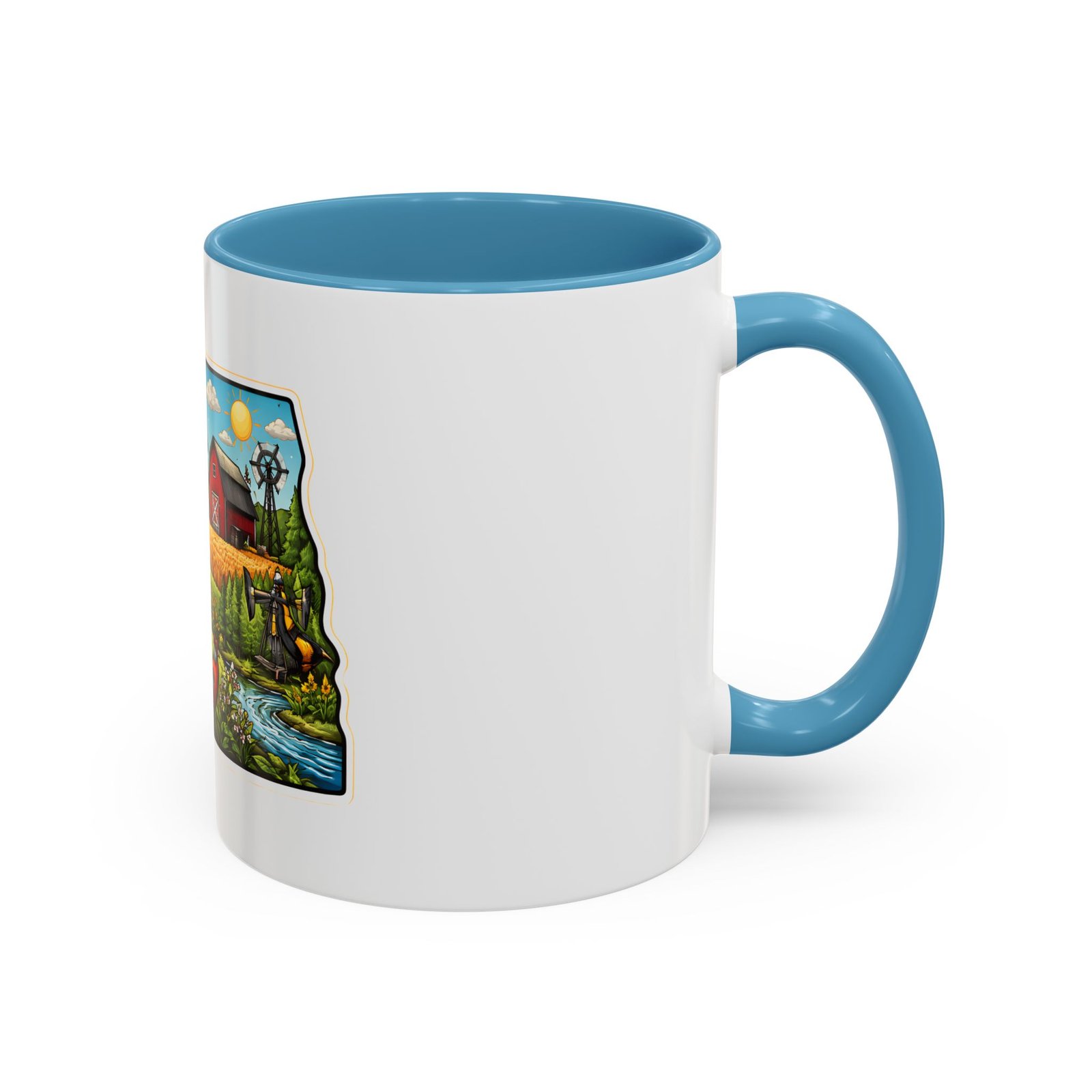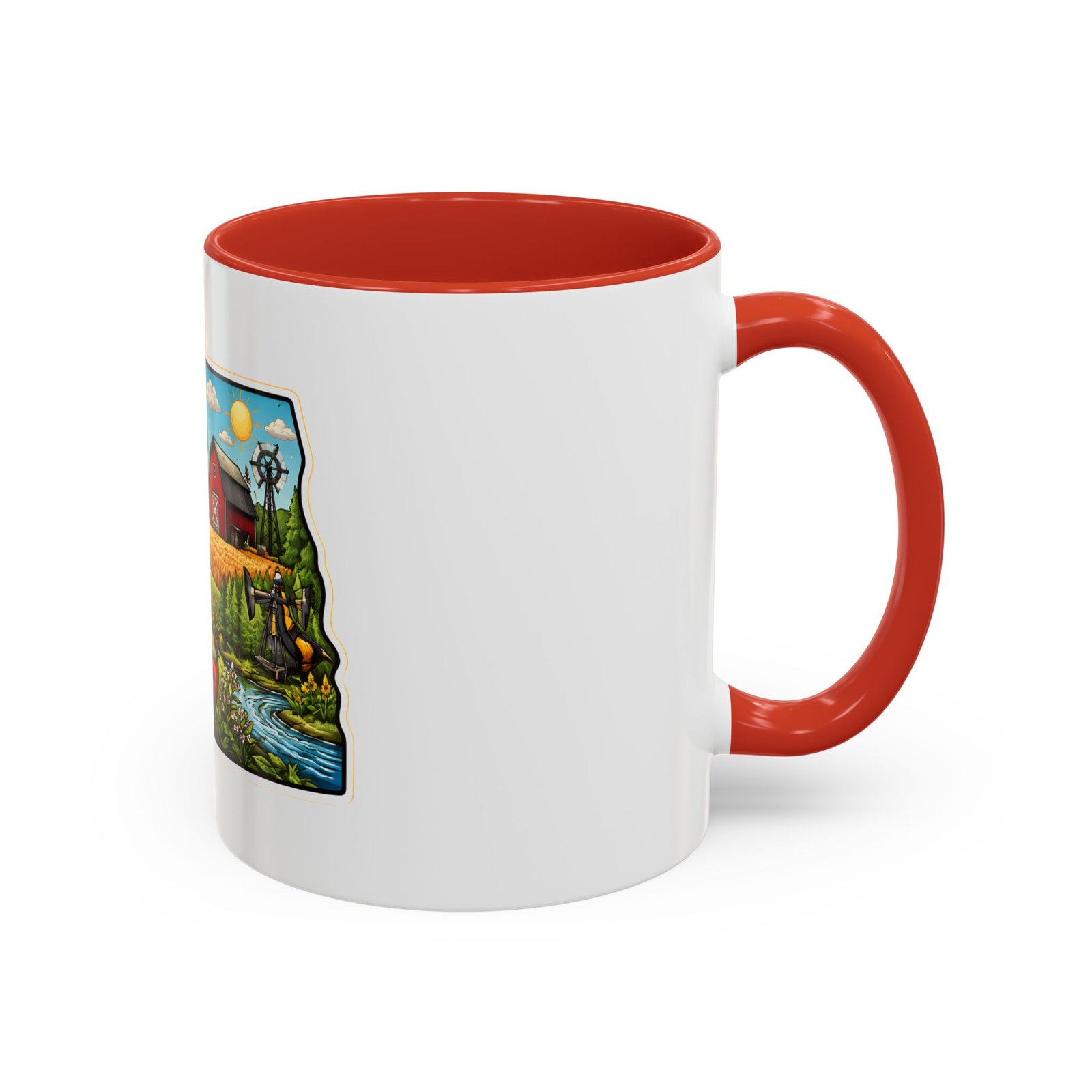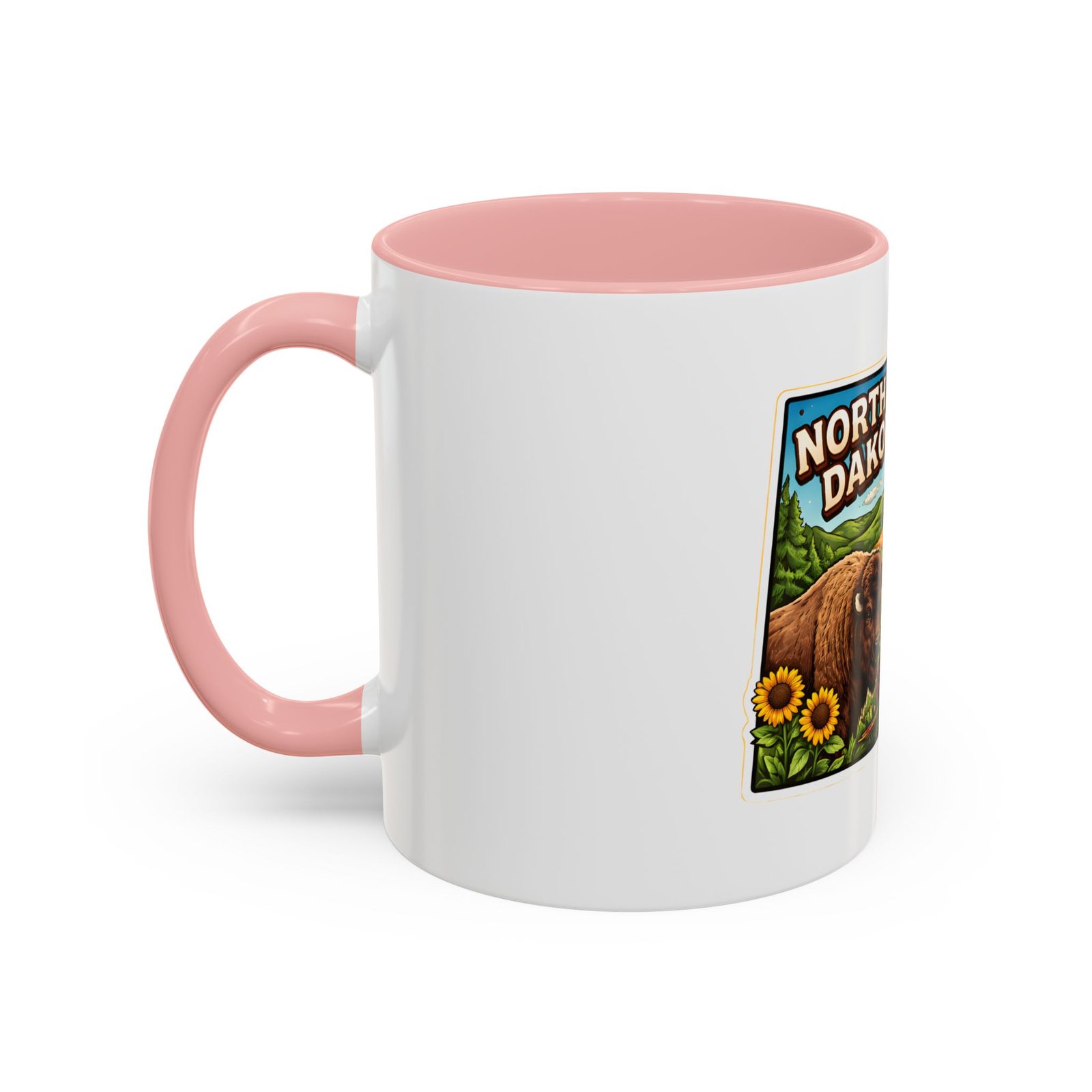 Wake up with a little slice of the Northern Plains in your hands. This ceramic mug wears a lively, colorful illustration of North Dakota — rolling wheat fields, a red barn, a grazing bison, wild sunflowers and a bright sky — all framed like a postcard. It invites slow mornings on the porch, maps spread out on the table, and conversations that start with “remember when.” The contrast of the colored interior and handle gives the artwork room to pop while keeping the feel warm and familiar. Whether it’s the first cup before a day on the land or a cozy evening drink, this mug brings a cheerful, grounded moment that feels like home.