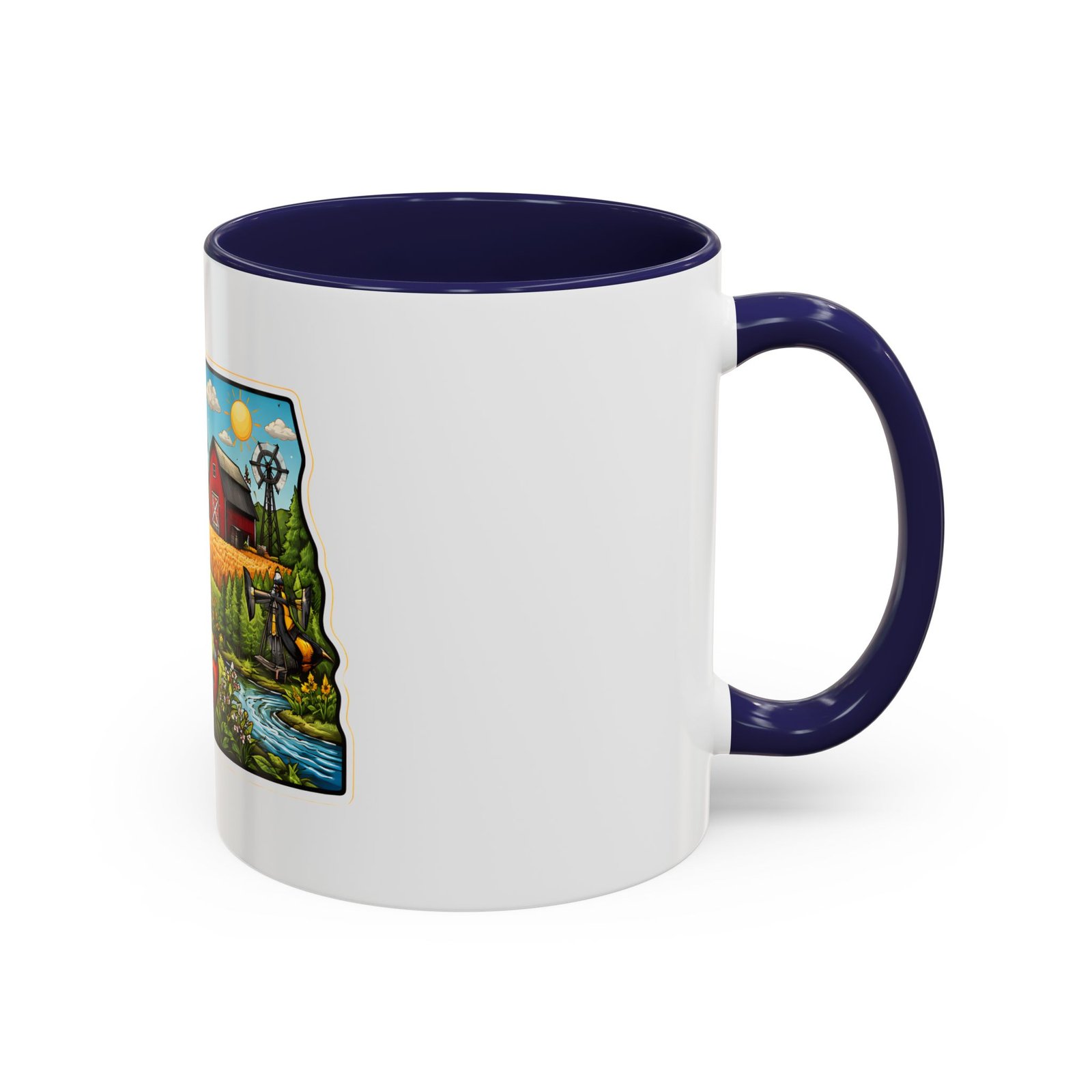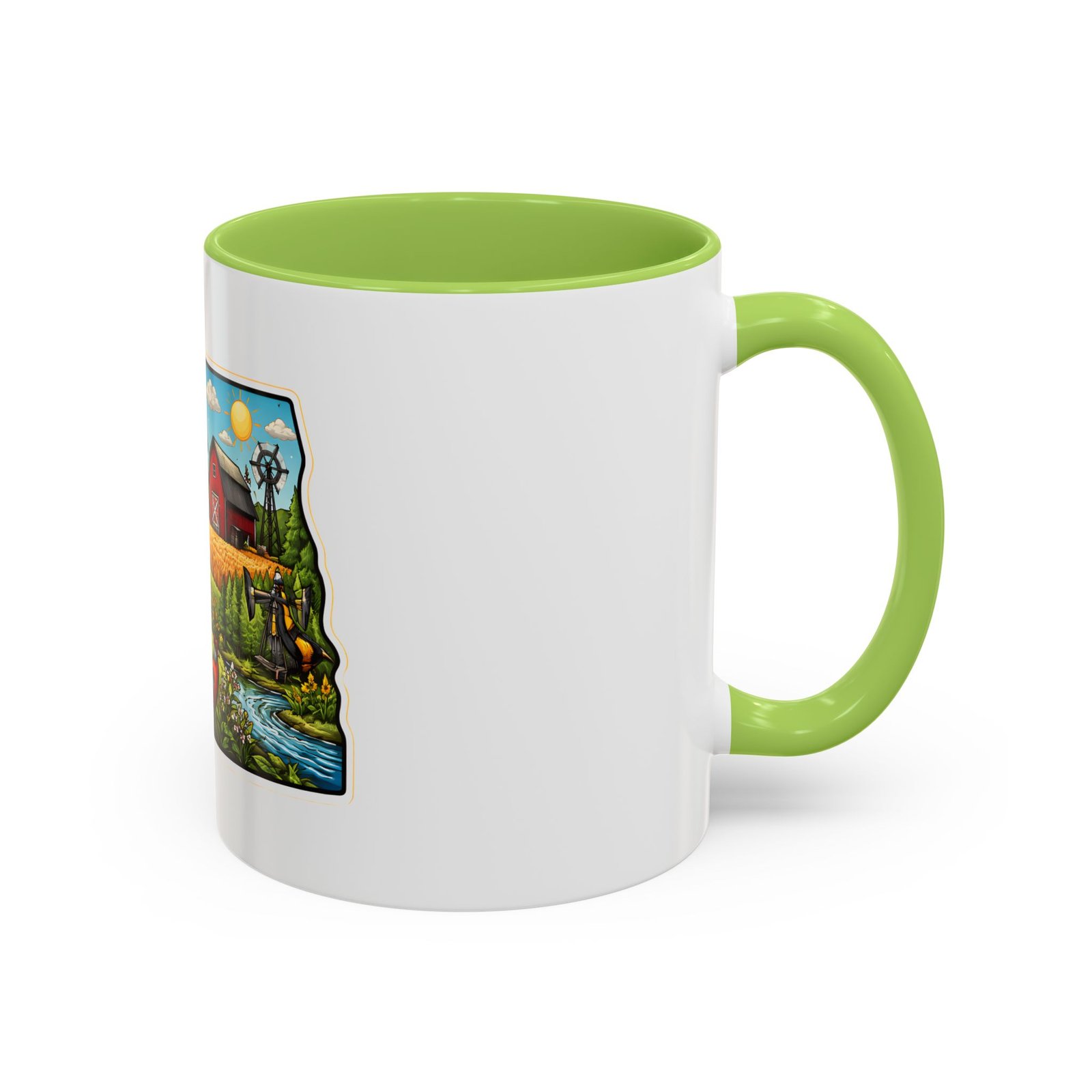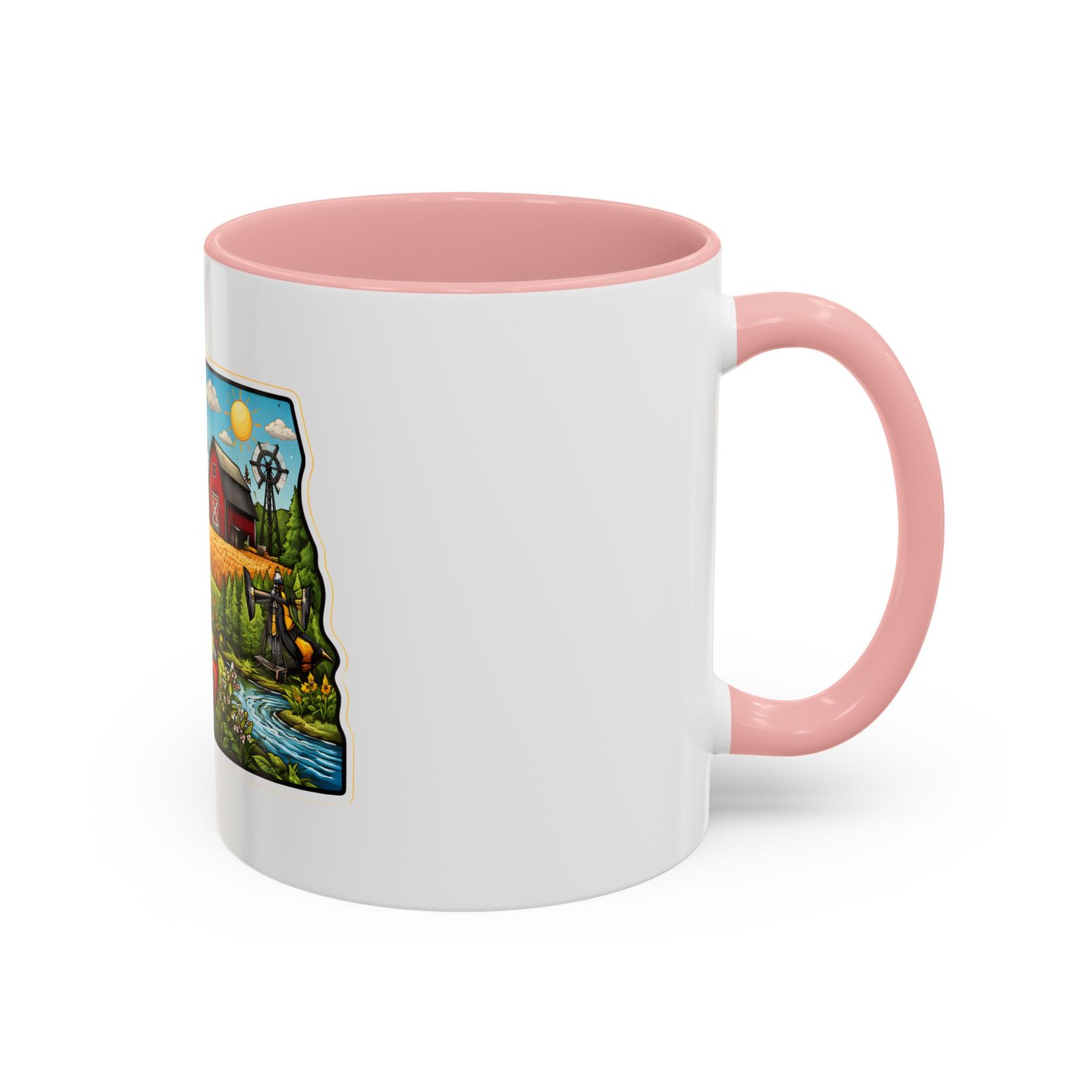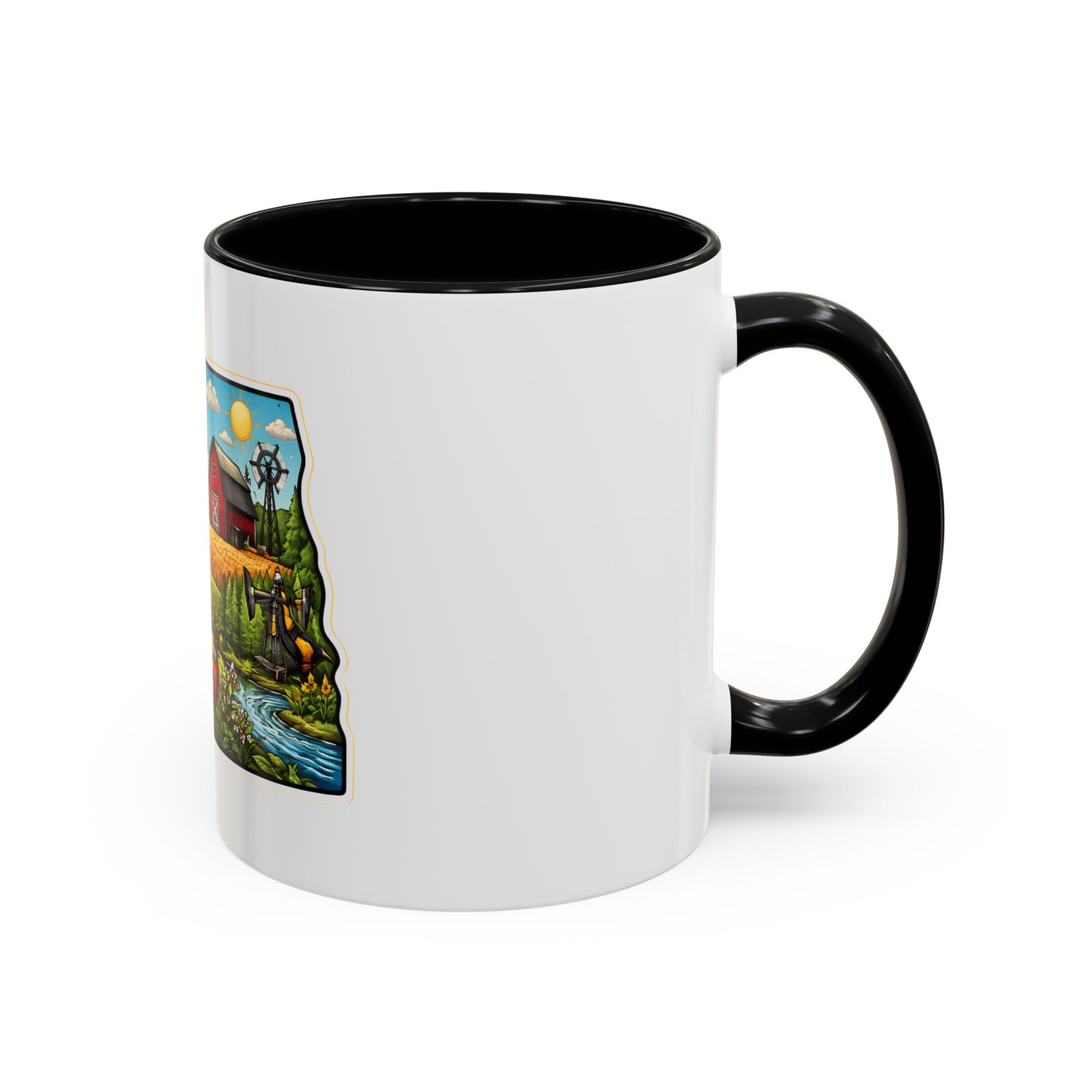 Wake up with a little slice of the Northern Plains in your hands. This ceramic mug wears a lively, colorful illustration of North Dakota — rolling wheat fields, a red barn, a grazing bison, wild sunflowers and a bright sky — all framed like a postcard. It invites slow mornings on the porch, maps spread out on the table, and conversations that start with “remember when.” The contrast of the colored interior and handle gives the artwork room to pop while keeping the feel warm and familiar. Whether it’s the first cup before a day on the land or a cozy evening drink, this mug brings a cheerful, grounded moment that feels like home.