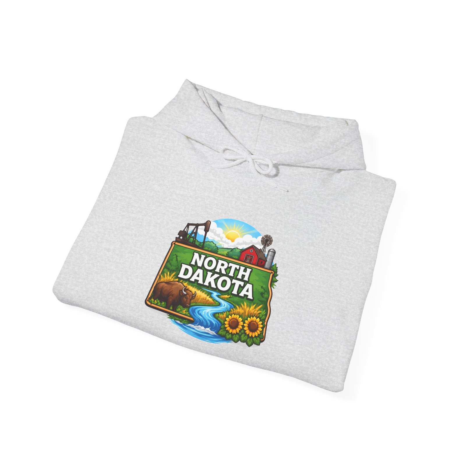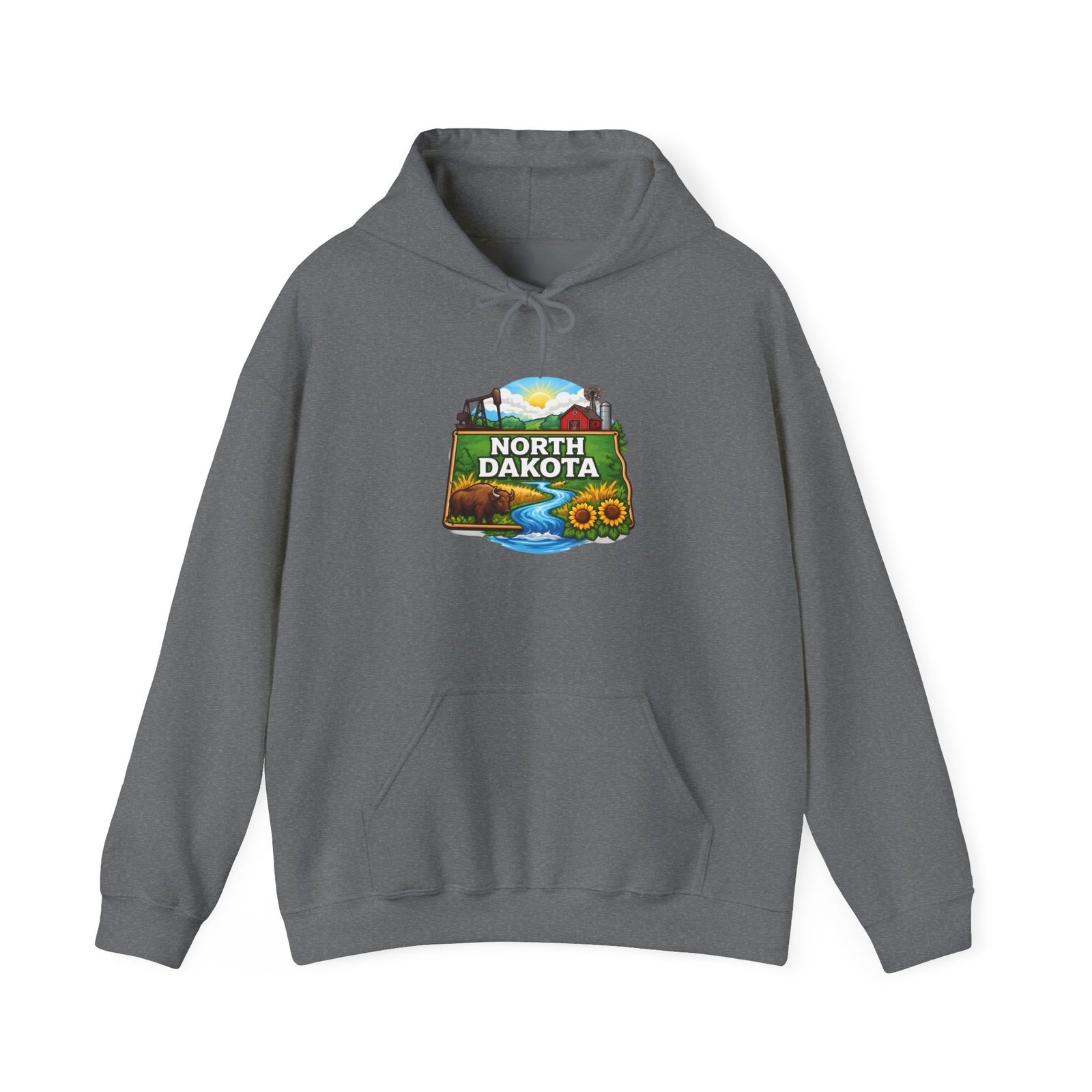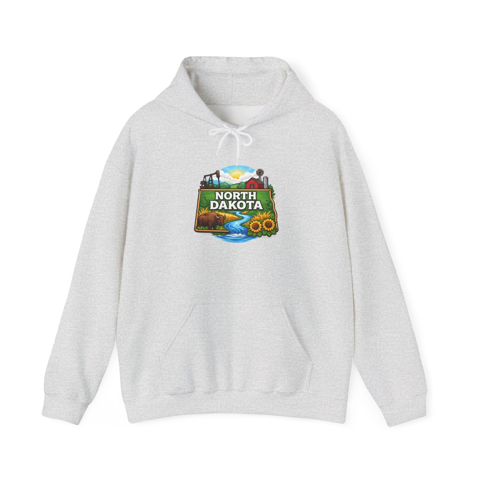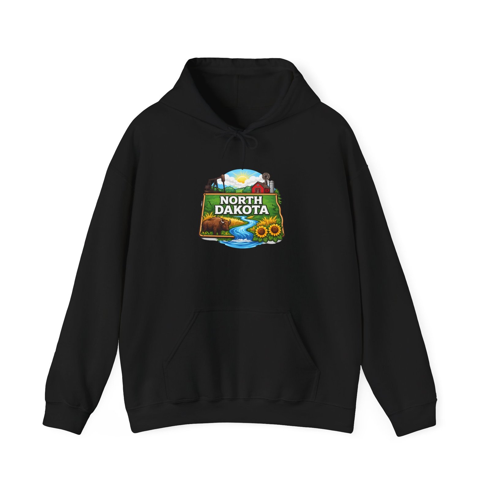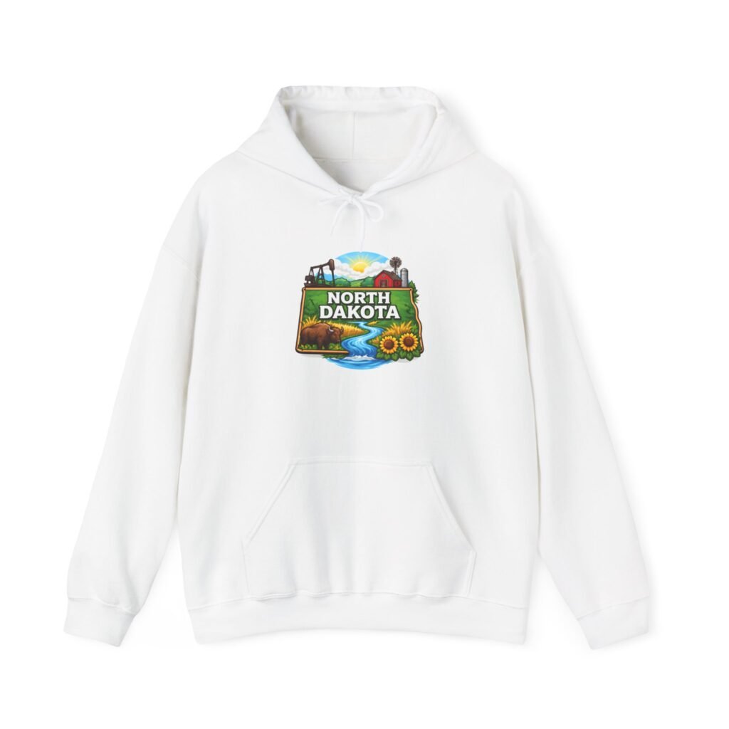 Soft, warm, and quietly bold — this North Dakota hoodie carries the wide-open skies and prairie calm into your everyday. The mid-weight cotton/poly blend feels cozy on cool mornings, while the double-lined hood and color-matched drawcord add a little structure and polish. A vibrant, outdoor-inspired North Dakota emblem sits on the chest—rolling hills, a river bend, and sunlit fields—so you can wear a slice of home or your favorite road-trip memory. Kangaroo pocket keeps hands warm and the relaxed classic fit layers easily over shirts. Durable DTF/DTG printing means the artwork stands up to washes, and embroidery options are available if you want a textured, heirloom touch. For people who love long horizons, quiet drives, and finding calm in wide places, this hoodie feels familiar the moment you pull it on.
