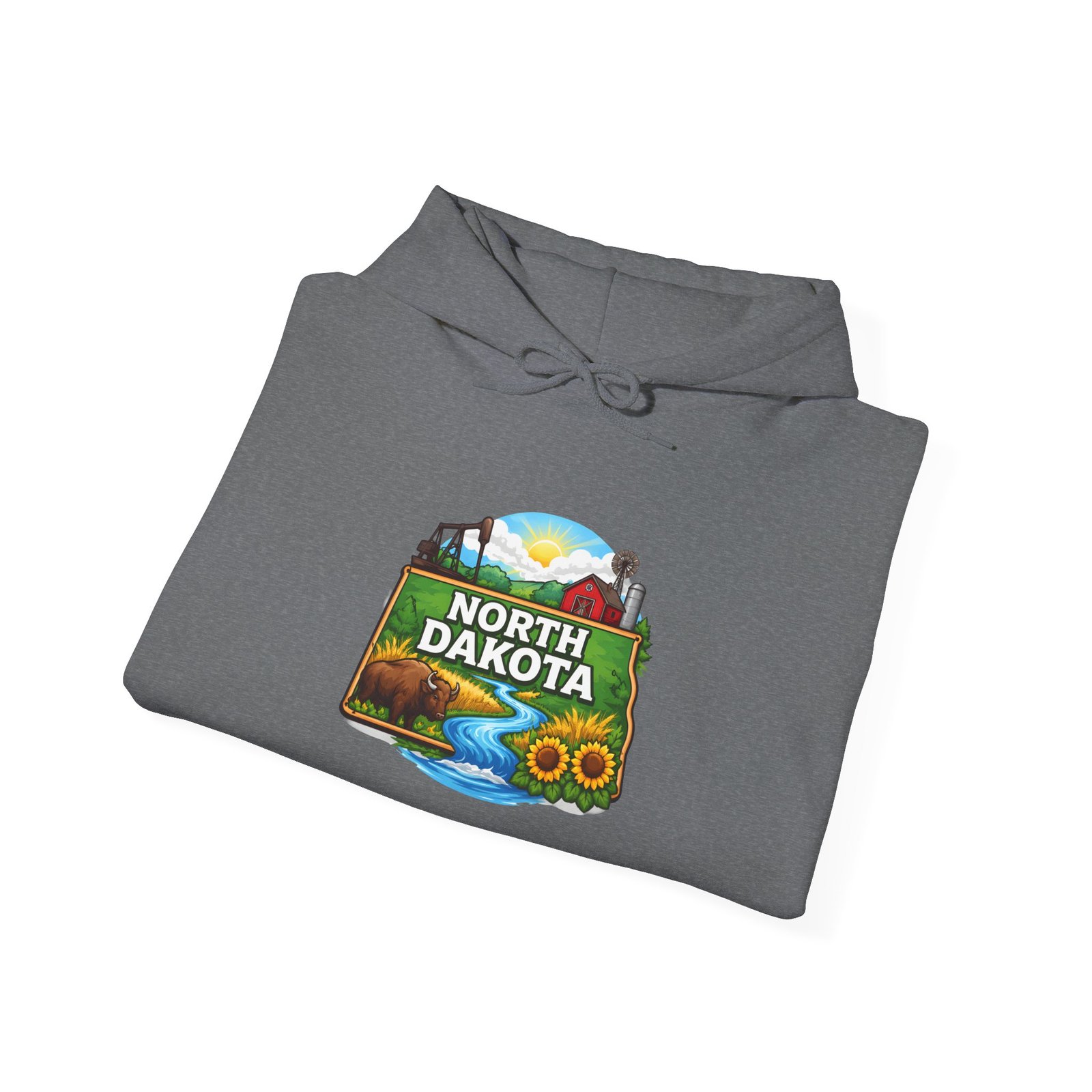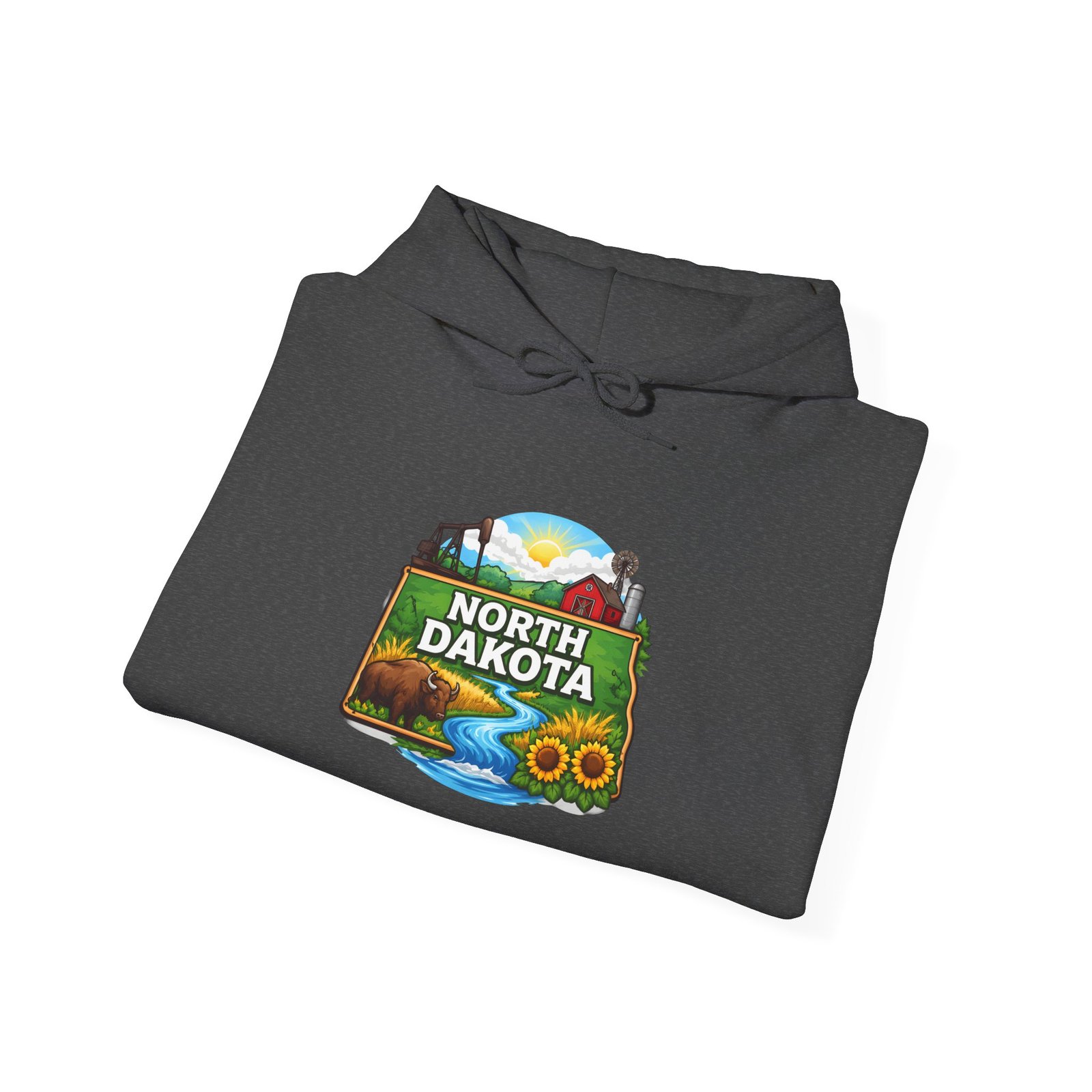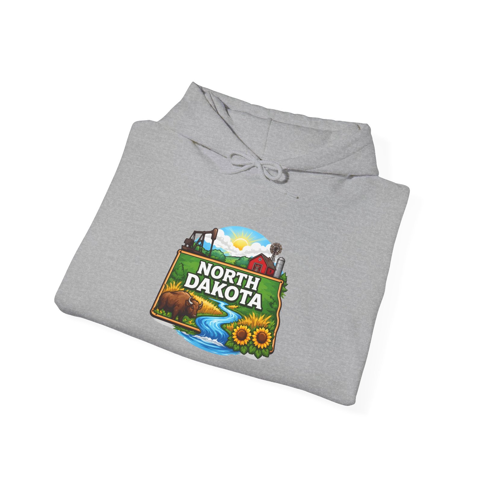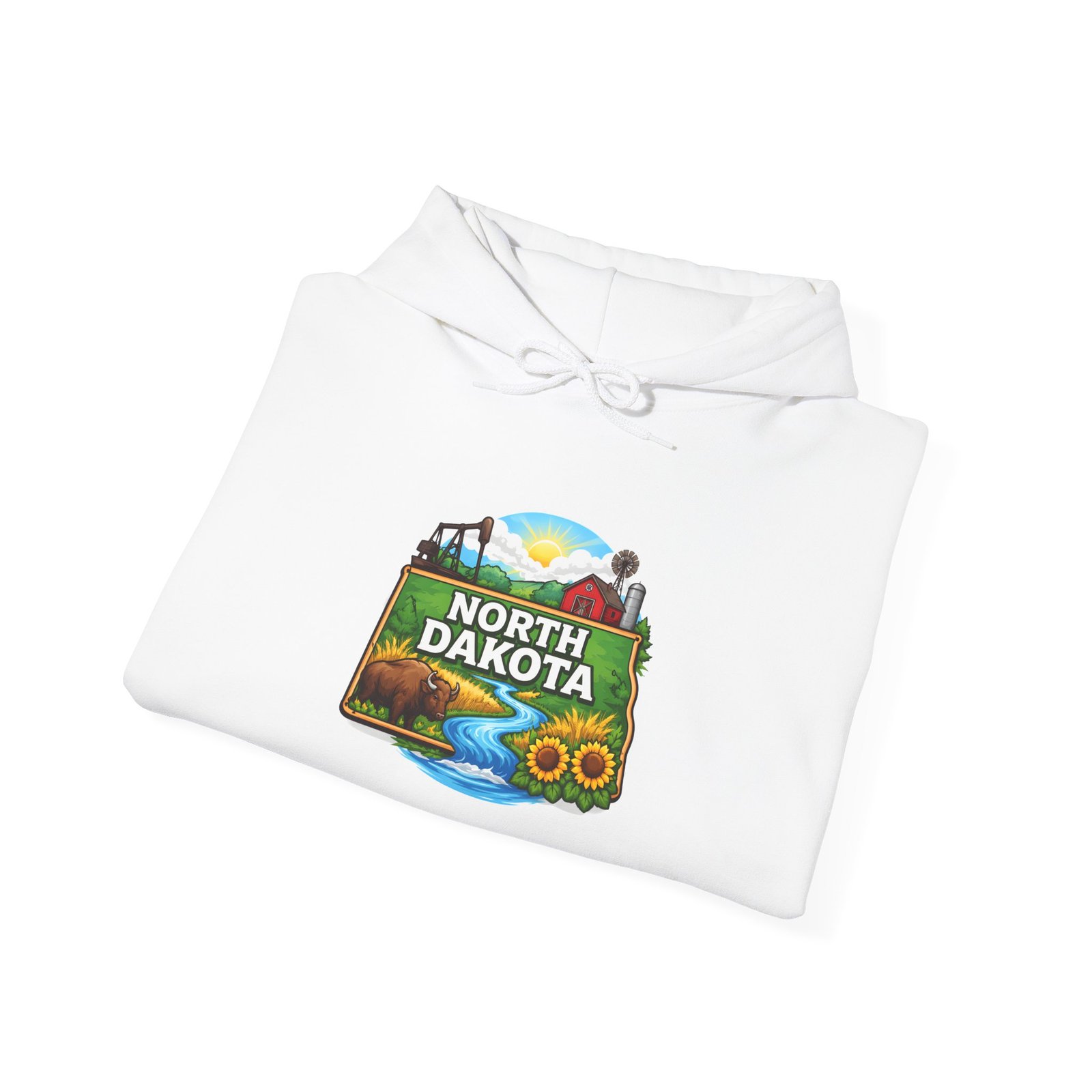 Soft, warm, and quietly bold — this North Dakota hoodie carries the wide-open skies and prairie calm into your everyday. The mid-weight cotton/poly blend feels cozy on cool mornings, while the double-lined hood and color-matched drawcord add a little structure and polish. A vibrant, outdoor-inspired North Dakota emblem sits on the chest—rolling hills, a river bend, and sunlit fields—so you can wear a slice of home or your favorite road-trip memory. Kangaroo pocket keeps hands warm and the relaxed classic fit layers easily over shirts. Durable DTF/DTG printing means the artwork stands up to washes, and embroidery options are available if you want a textured, heirloom touch. For people who love long horizons, quiet drives, and finding calm in wide places, this hoodie feels familiar the moment you pull it on.