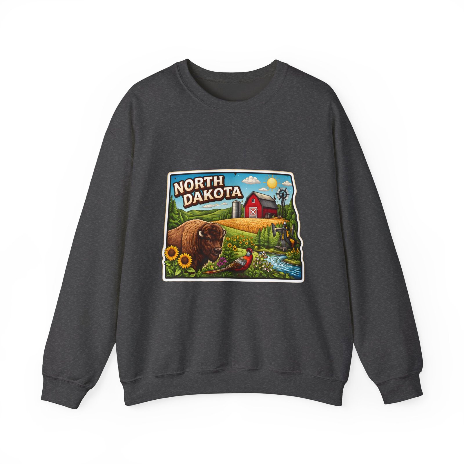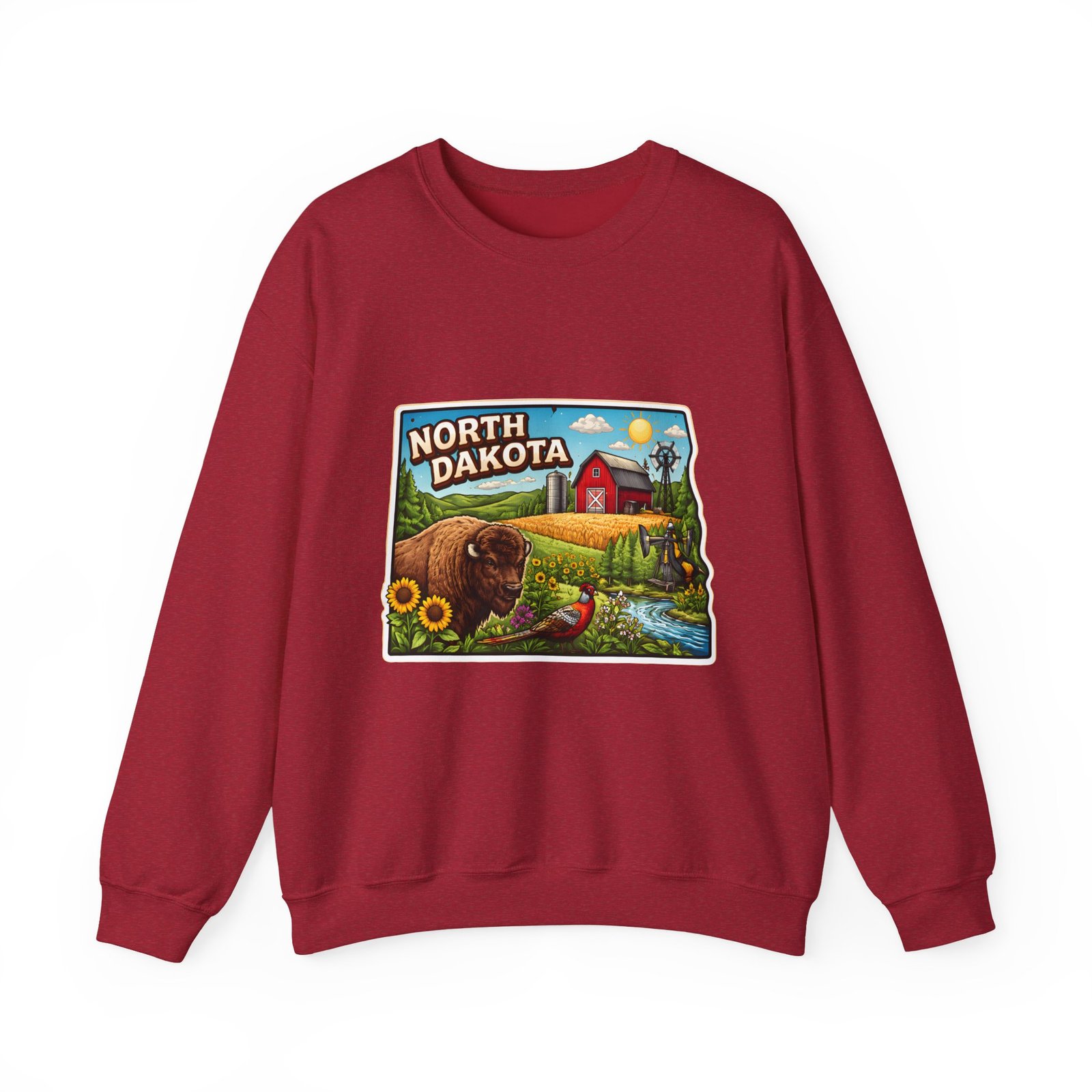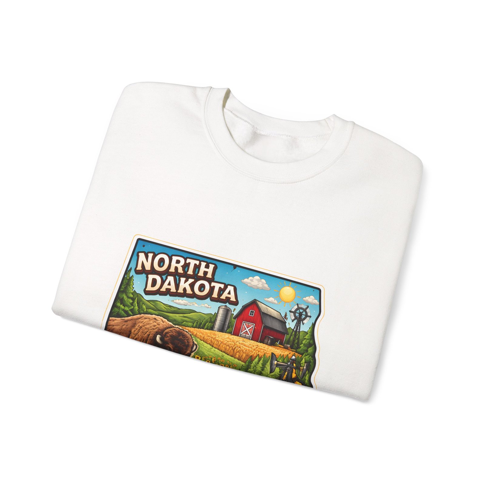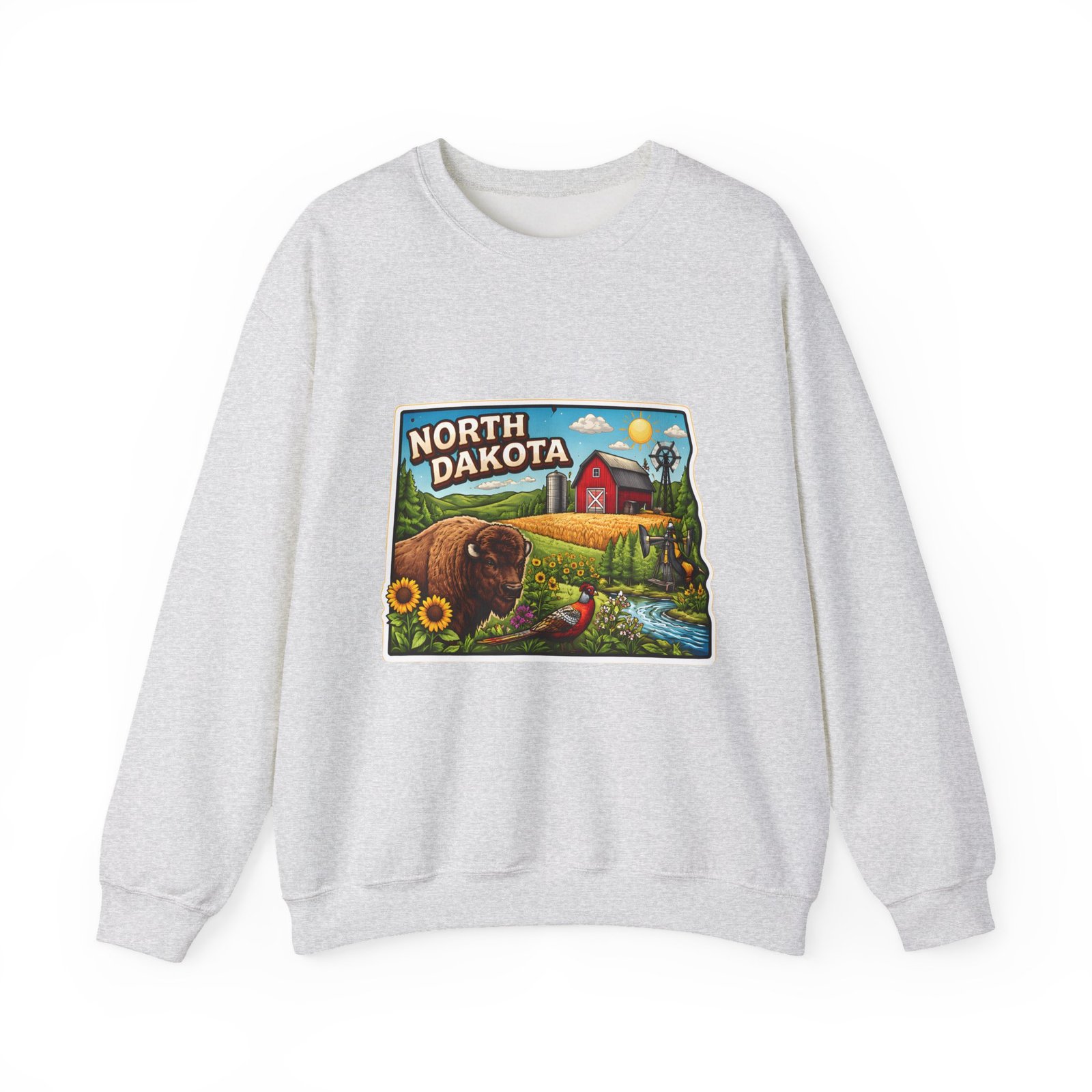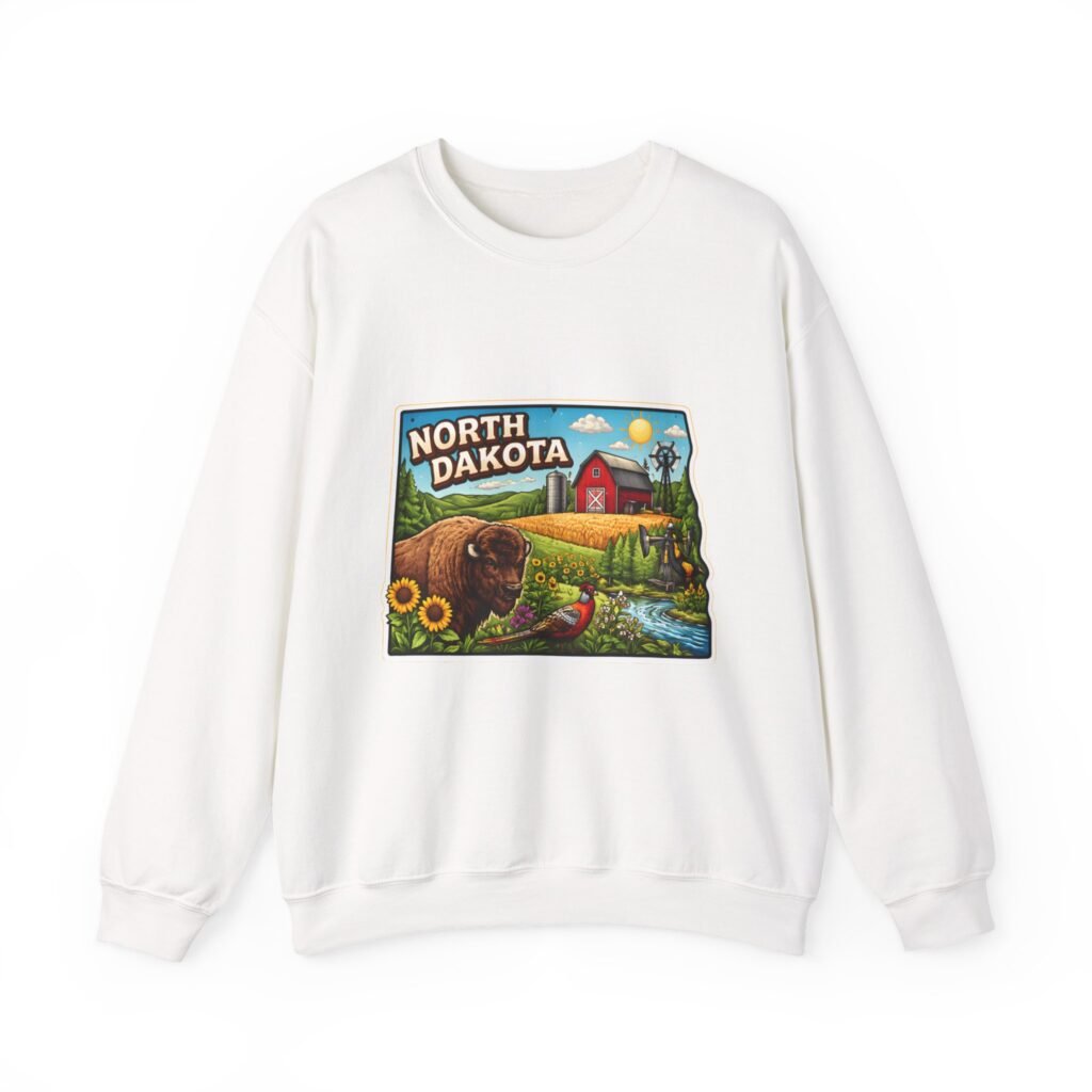 This cozy crew sweatshirt brings a warm, small-town summer to your everyday rotation. The front artwork reads “North Dakota” and unfolds like a postcard: rolling wheat fields, a red barn, sunflowers, a winding river and a bison—rich colors on a clean white background. Wear it when you want a quiet, nostalgic moment—sipping coffee on a chilly morning, driving country roads, or layering for an evening bonfire. The weight and knit give it structure without feeling stiff; the embroidered options and neat ribbed collar keep the look elevated while staying comfortably lived-in. It’s the kind of sweatshirt you reach for when you want to feel grounded in place and memory.
