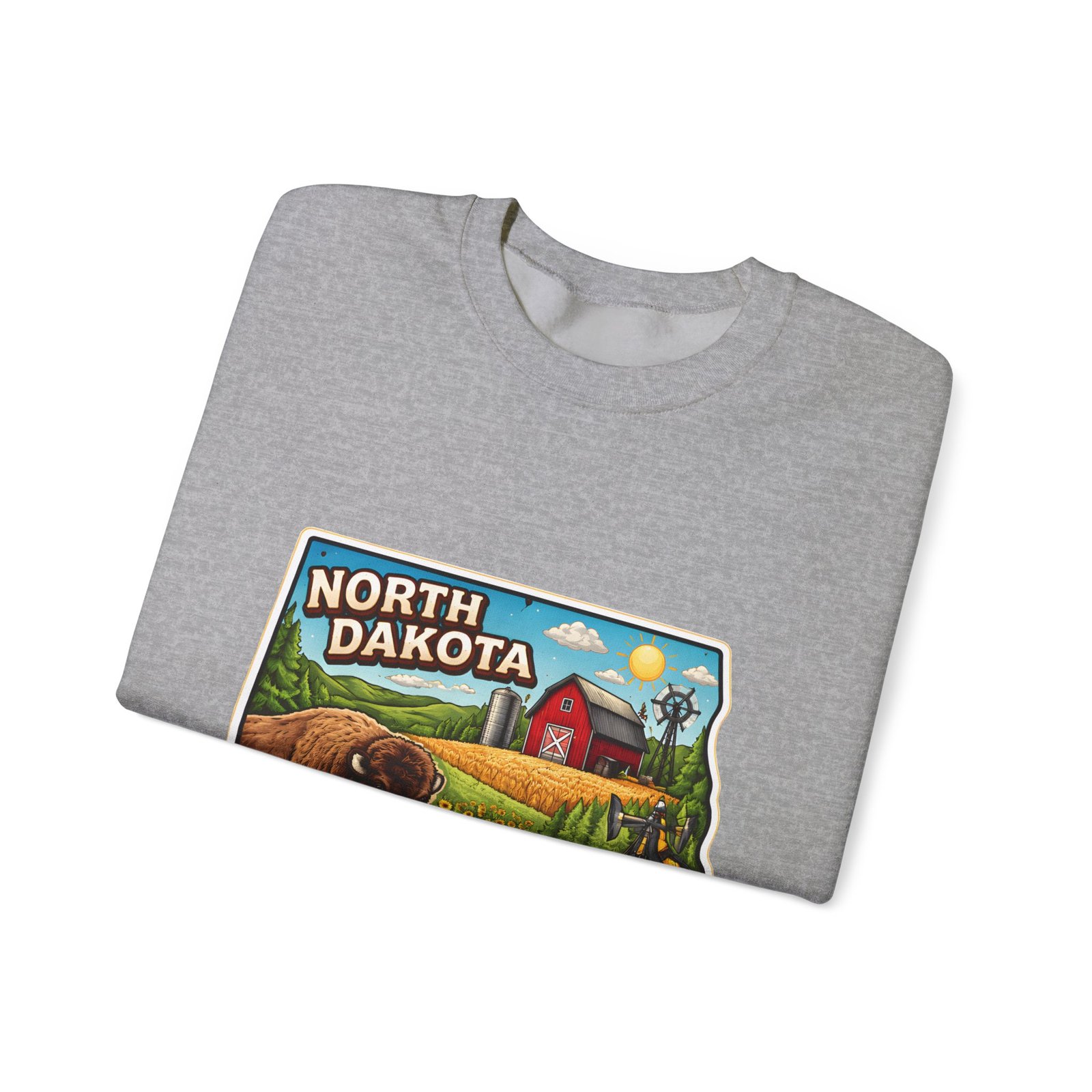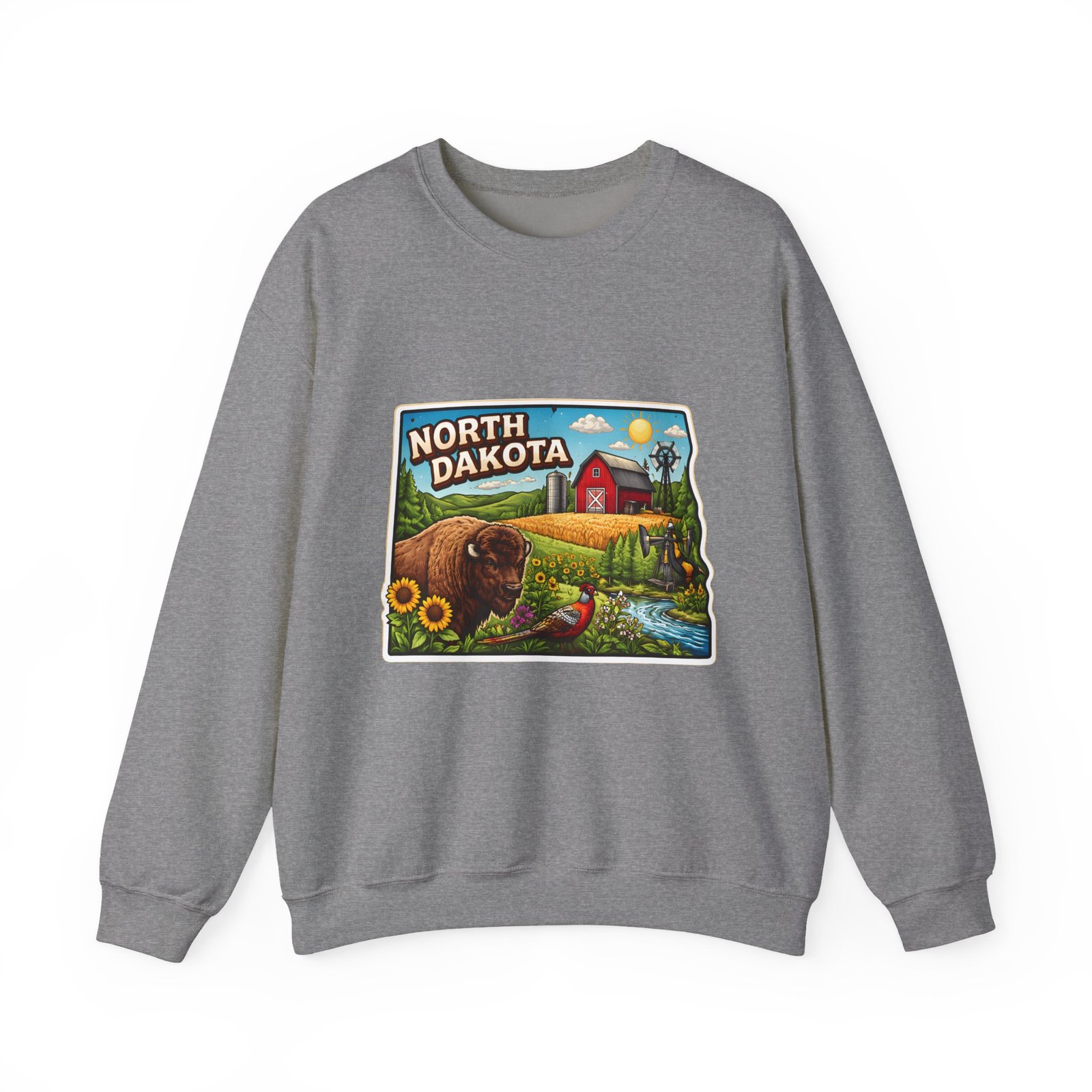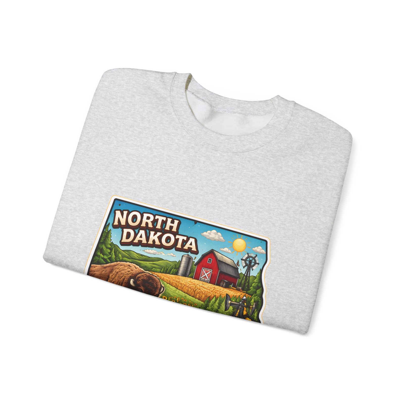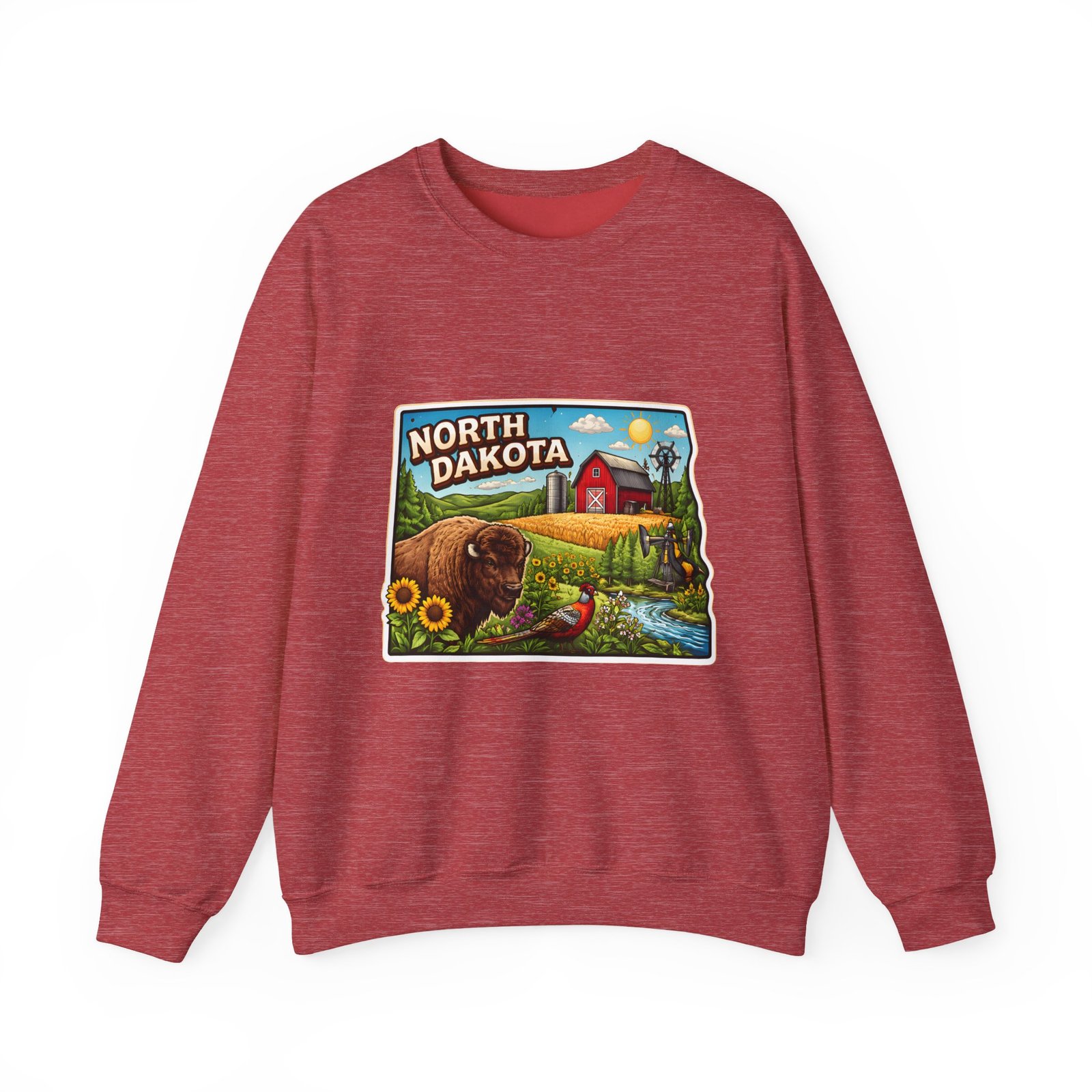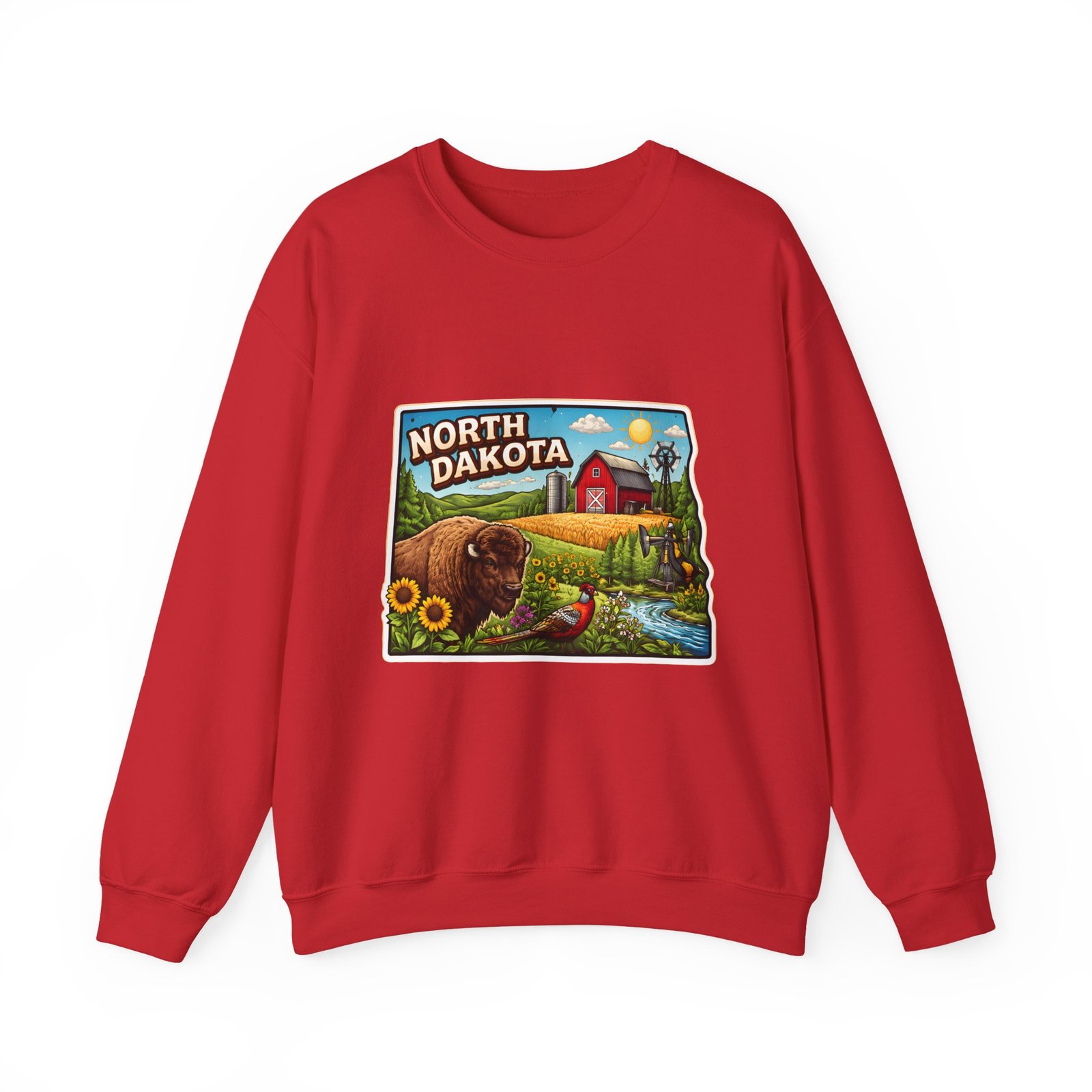 This cozy crew sweatshirt brings a warm, small-town summer to your everyday rotation. The front artwork reads “North Dakota” and unfolds like a postcard: rolling wheat fields, a red barn, sunflowers, a winding river and a bison—rich colors on a clean white background. Wear it when you want a quiet, nostalgic moment—sipping coffee on a chilly morning, driving country roads, or layering for an evening bonfire. The weight and knit give it structure without feeling stiff; the embroidered options and neat ribbed collar keep the look elevated while staying comfortably lived-in. It’s the kind of sweatshirt you reach for when you want to feel grounded in place and memory.