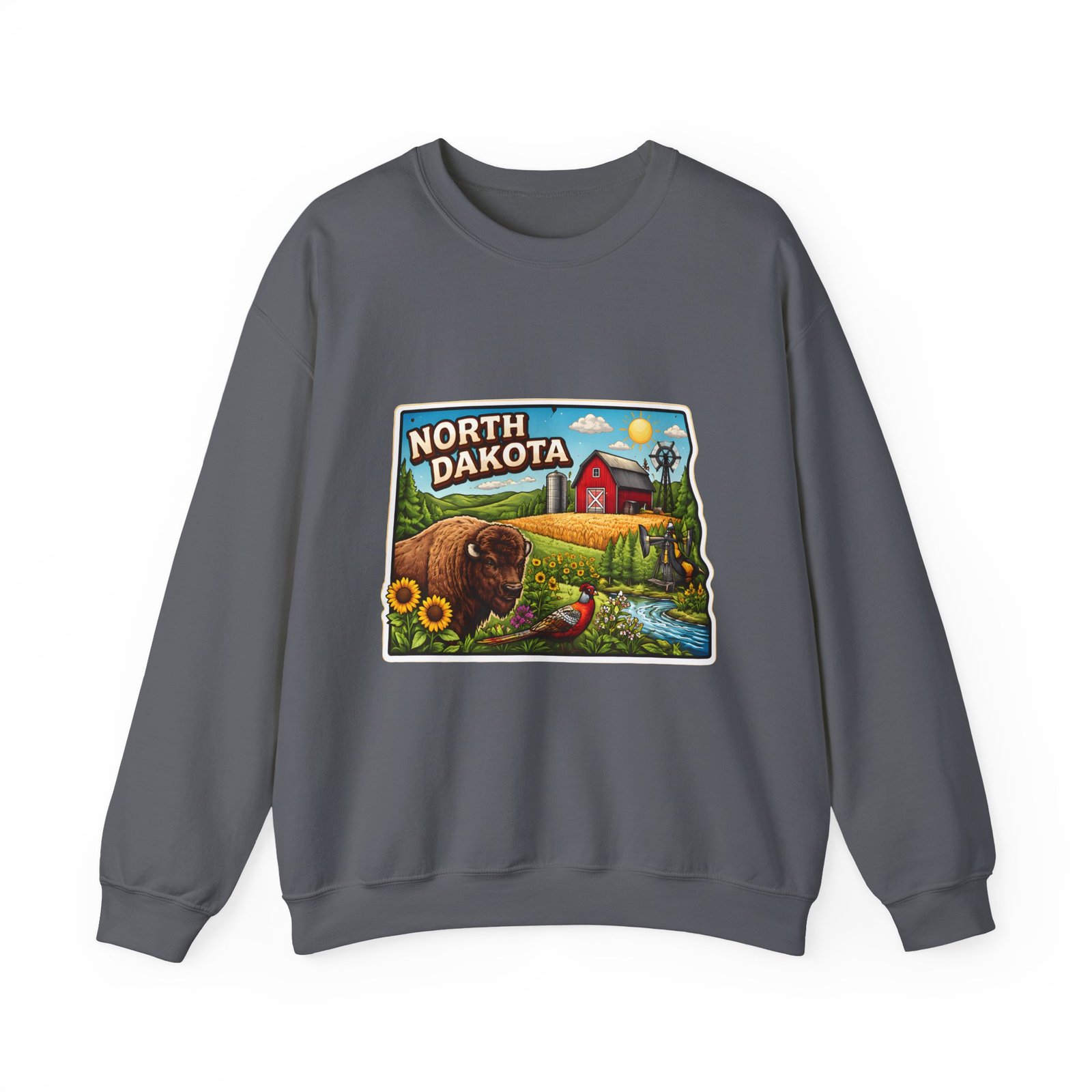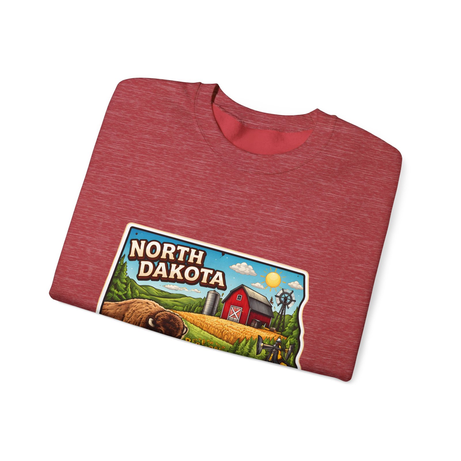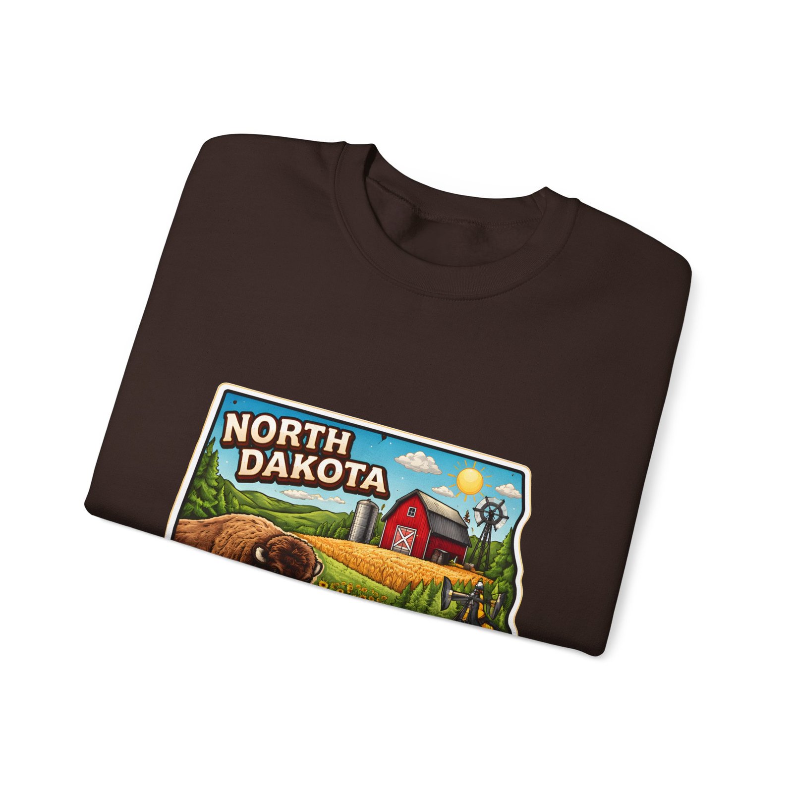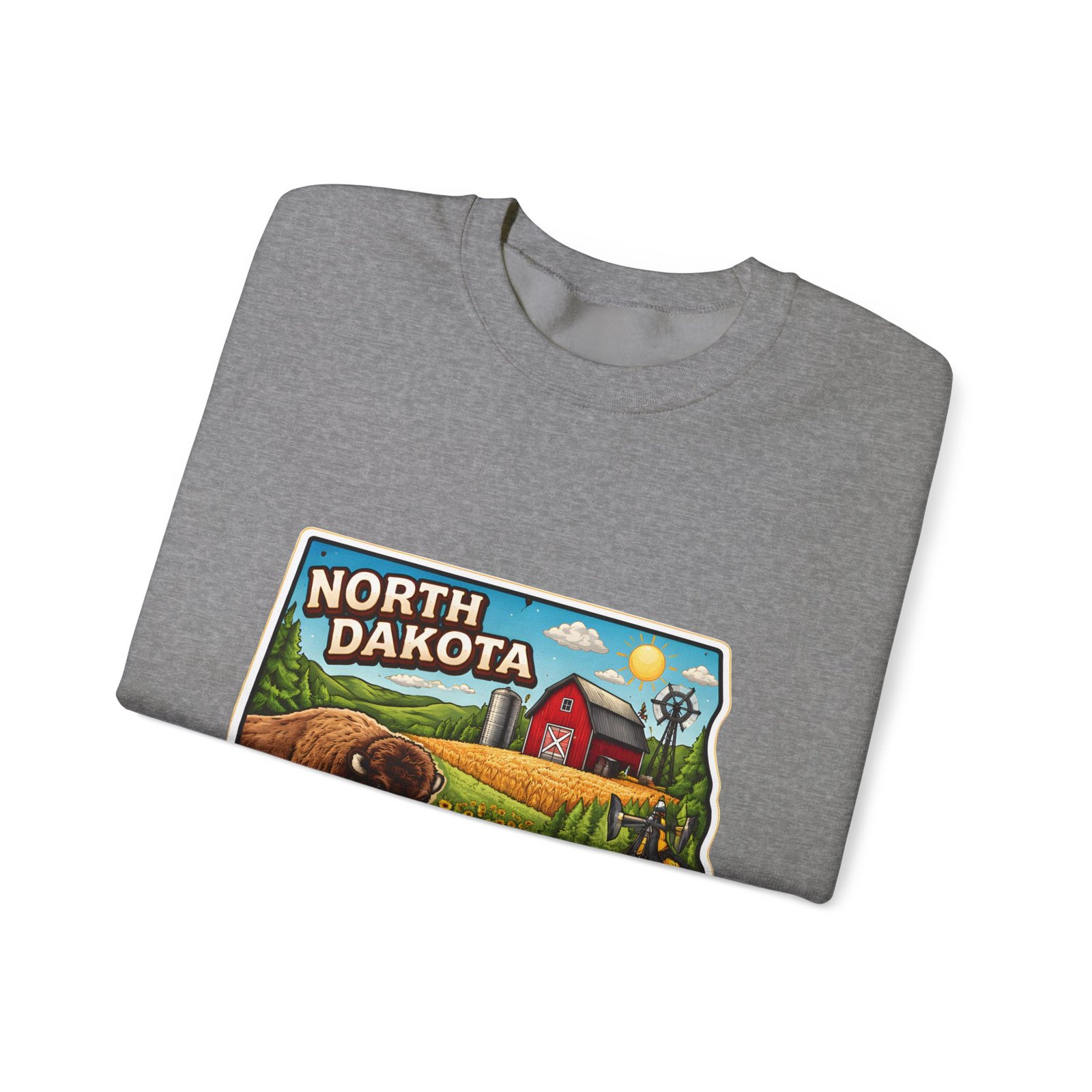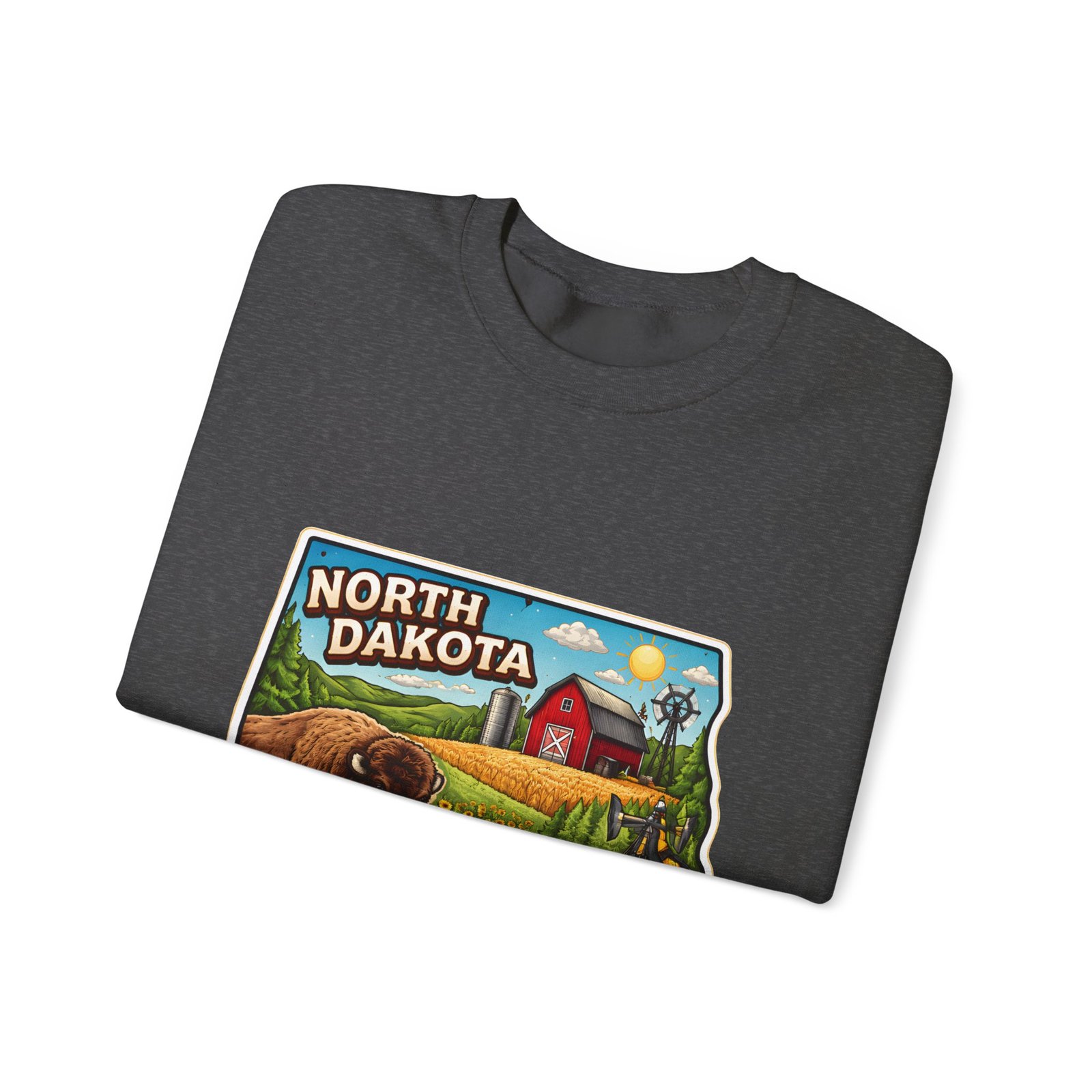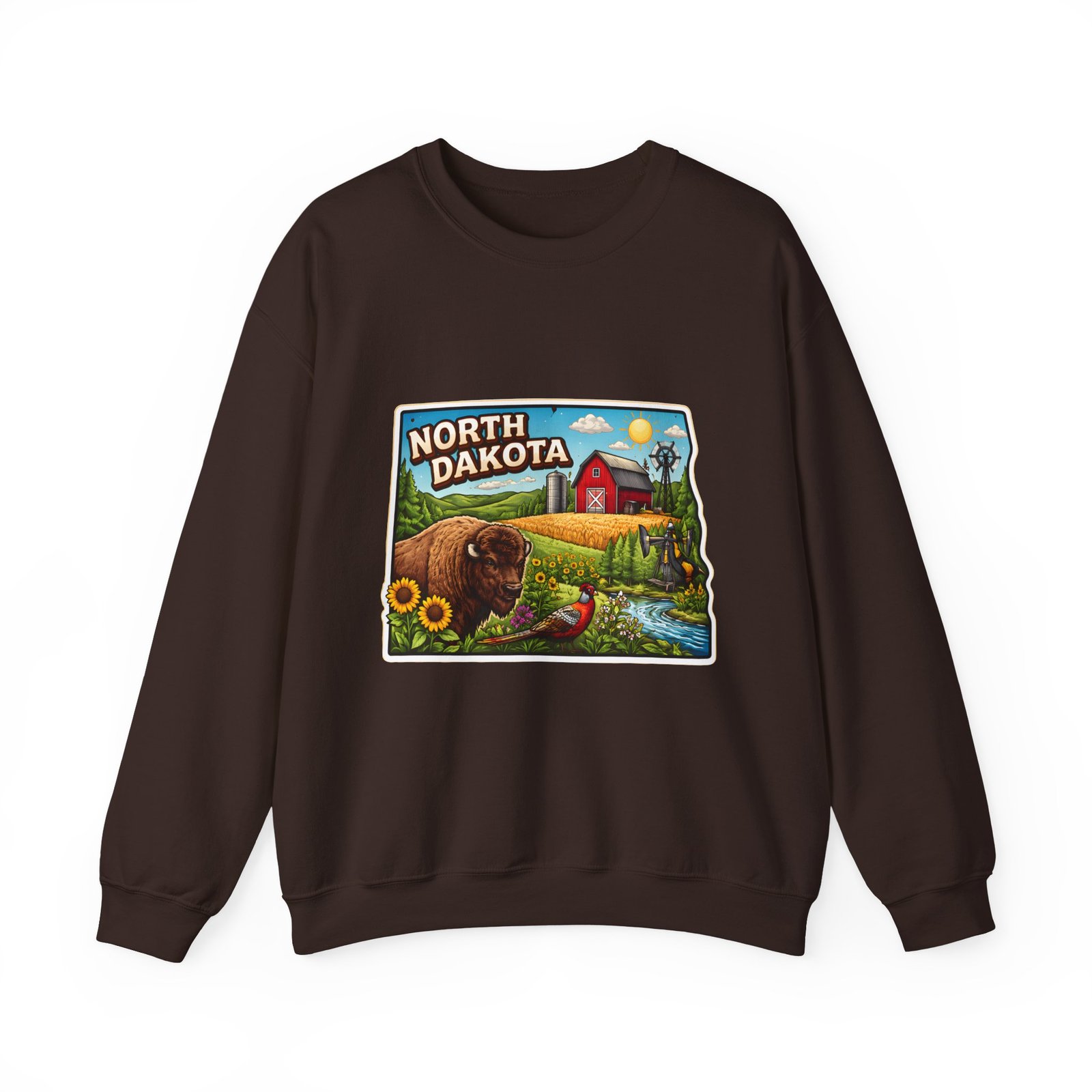 This cozy crew sweatshirt brings a warm, small-town summer to your everyday rotation. The front artwork reads “North Dakota” and unfolds like a postcard: rolling wheat fields, a red barn, sunflowers, a winding river and a bison—rich colors on a clean white background. Wear it when you want a quiet, nostalgic moment—sipping coffee on a chilly morning, driving country roads, or layering for an evening bonfire. The weight and knit give it structure without feeling stiff; the embroidered options and neat ribbed collar keep the look elevated while staying comfortably lived-in. It’s the kind of sweatshirt you reach for when you want to feel grounded in place and memory.