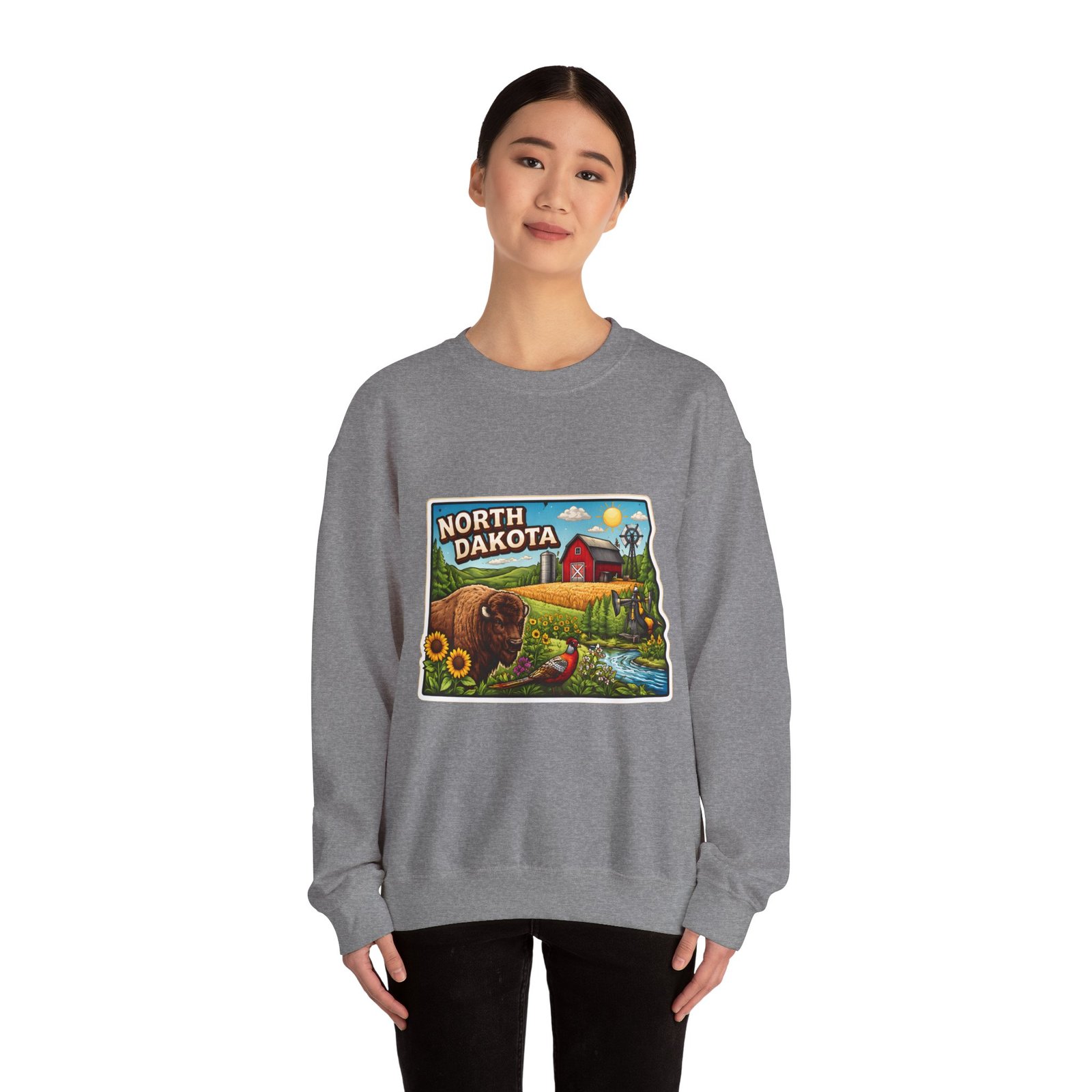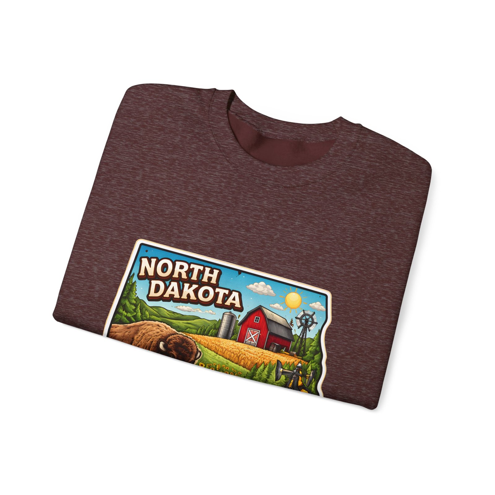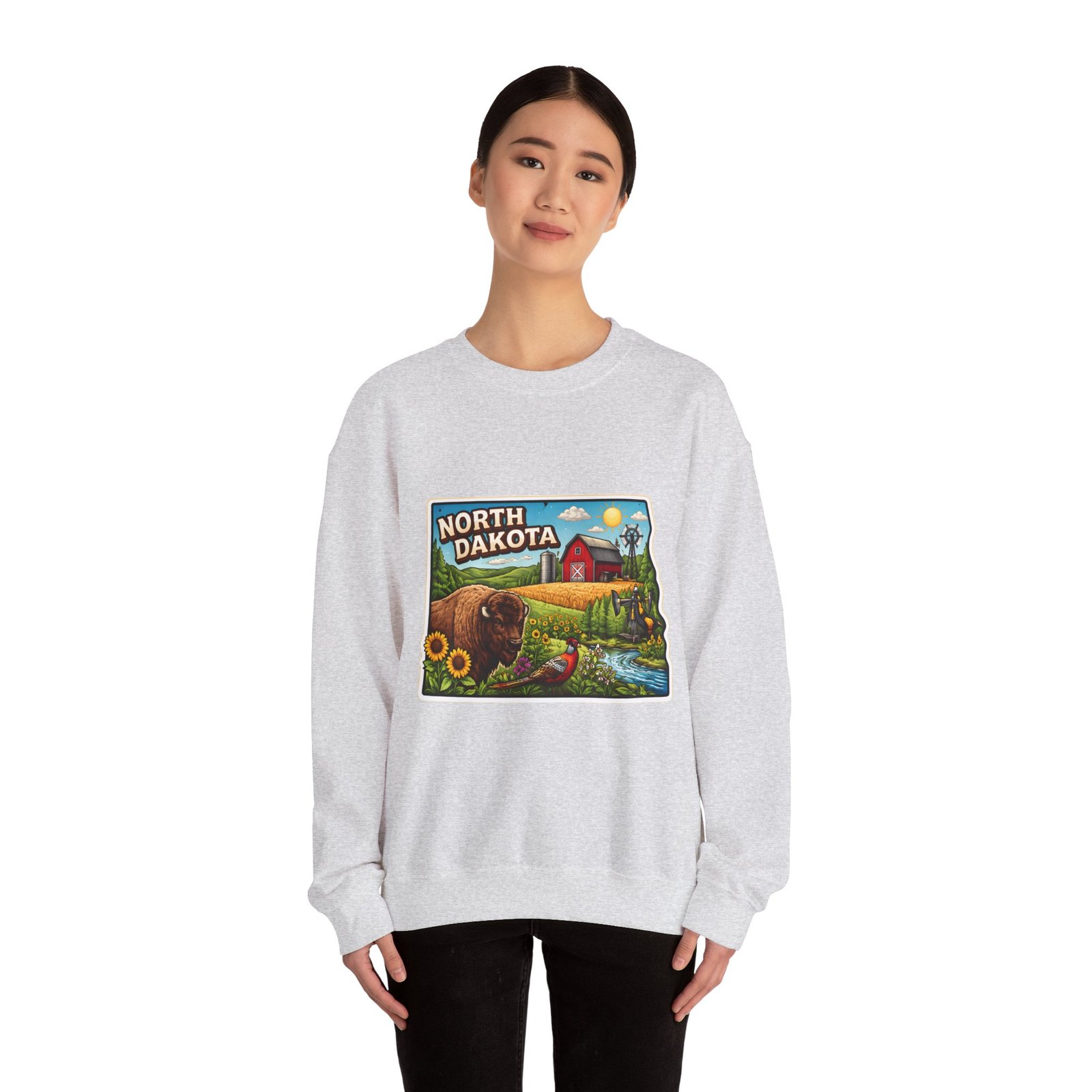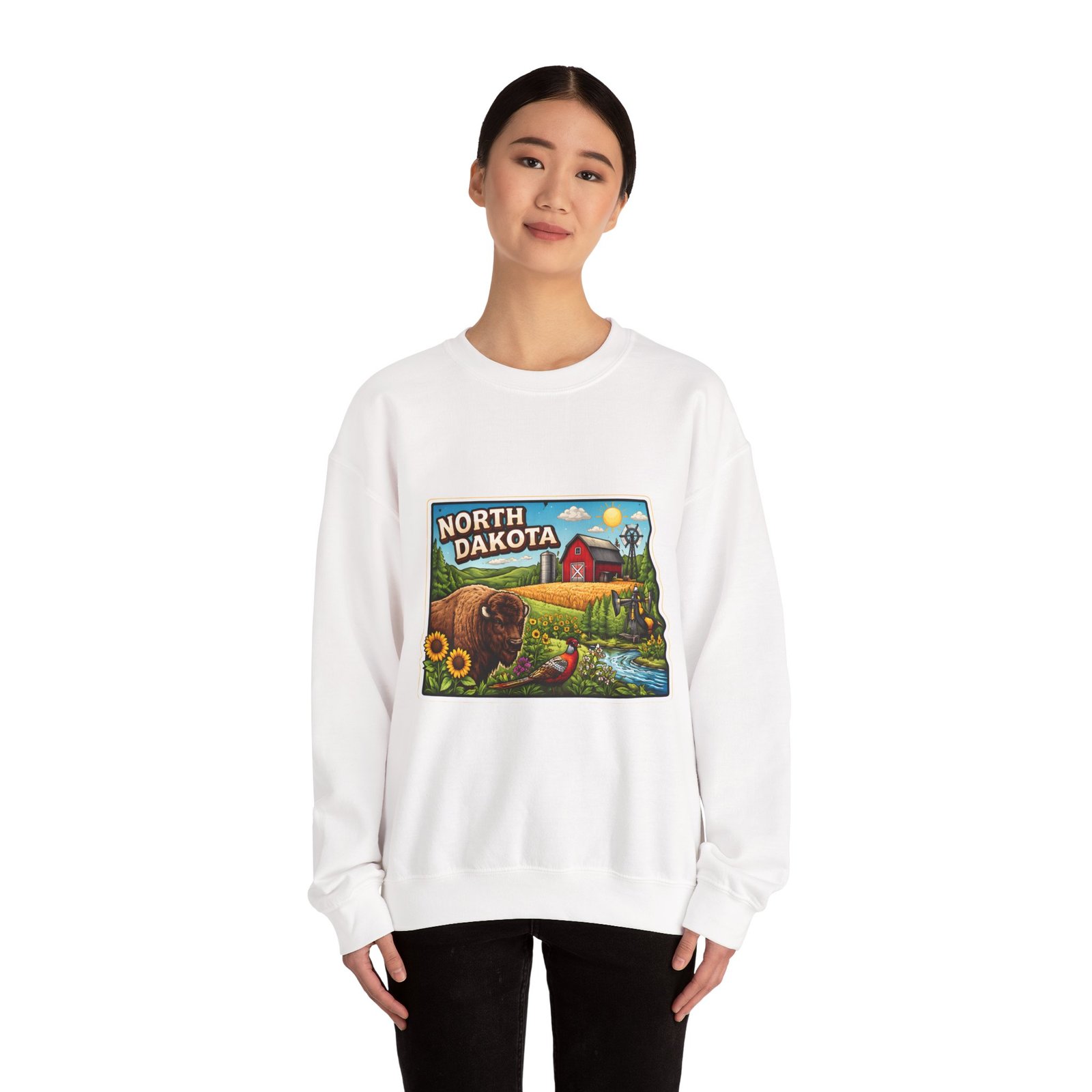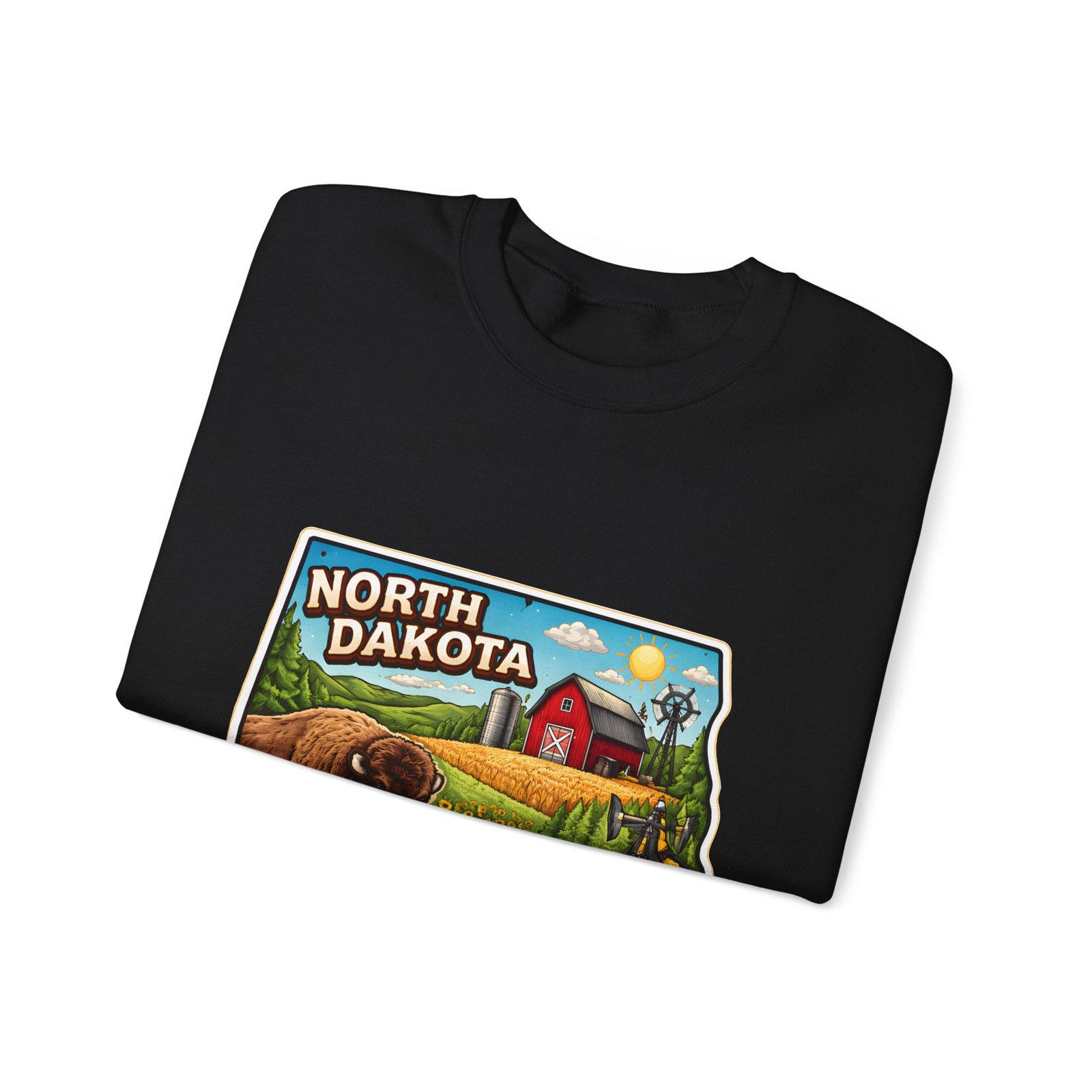 This cozy crew sweatshirt brings a warm, small-town summer to your everyday rotation. The front artwork reads “North Dakota” and unfolds like a postcard: rolling wheat fields, a red barn, sunflowers, a winding river and a bison—rich colors on a clean white background. Wear it when you want a quiet, nostalgic moment—sipping coffee on a chilly morning, driving country roads, or layering for an evening bonfire. The weight and knit give it structure without feeling stiff; the embroidered options and neat ribbed collar keep the look elevated while staying comfortably lived-in. It’s the kind of sweatshirt you reach for when you want to feel grounded in place and memory.