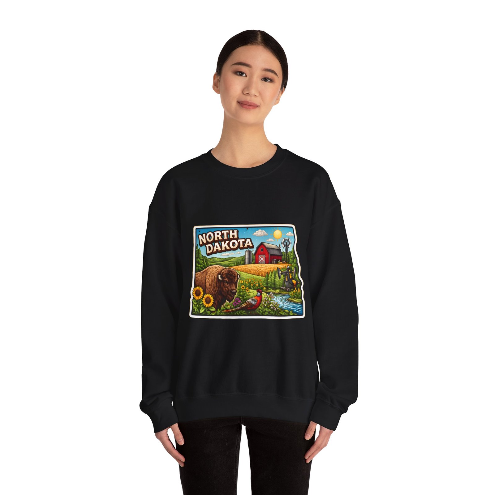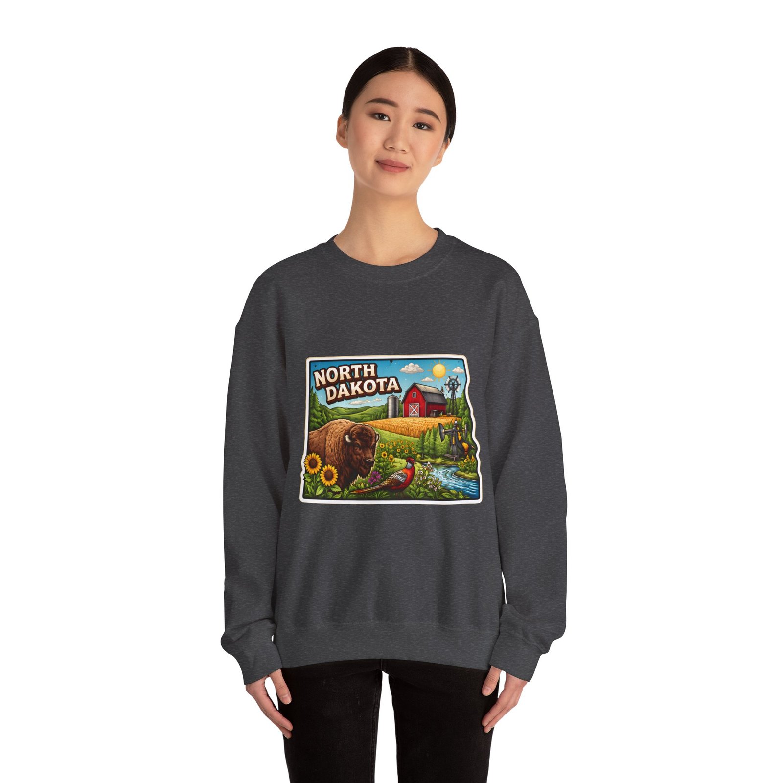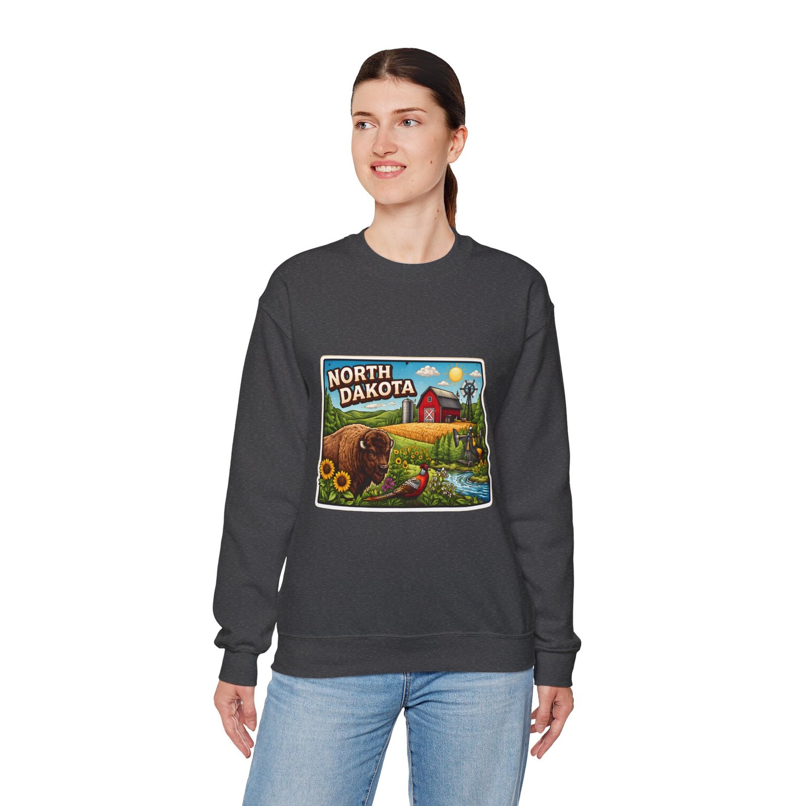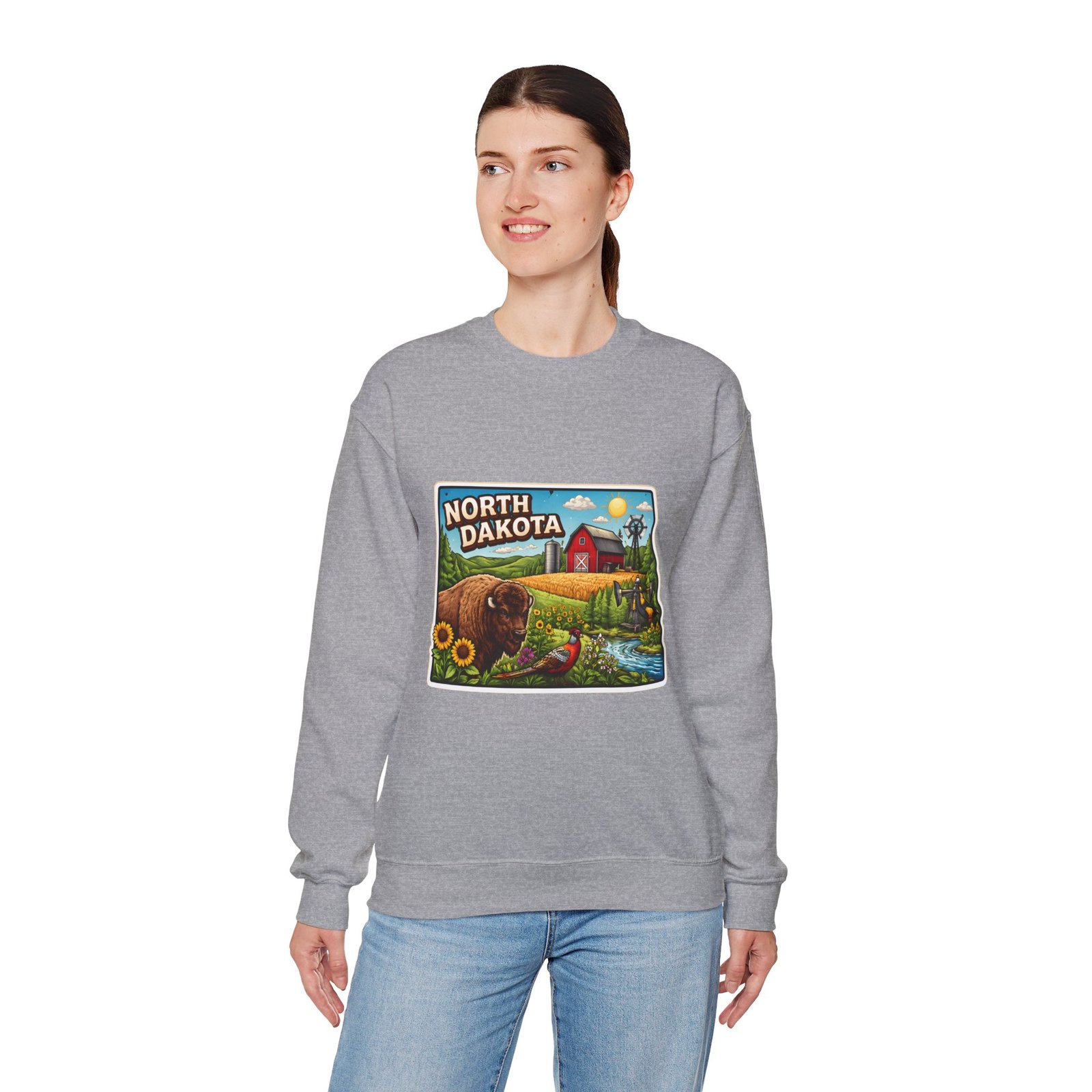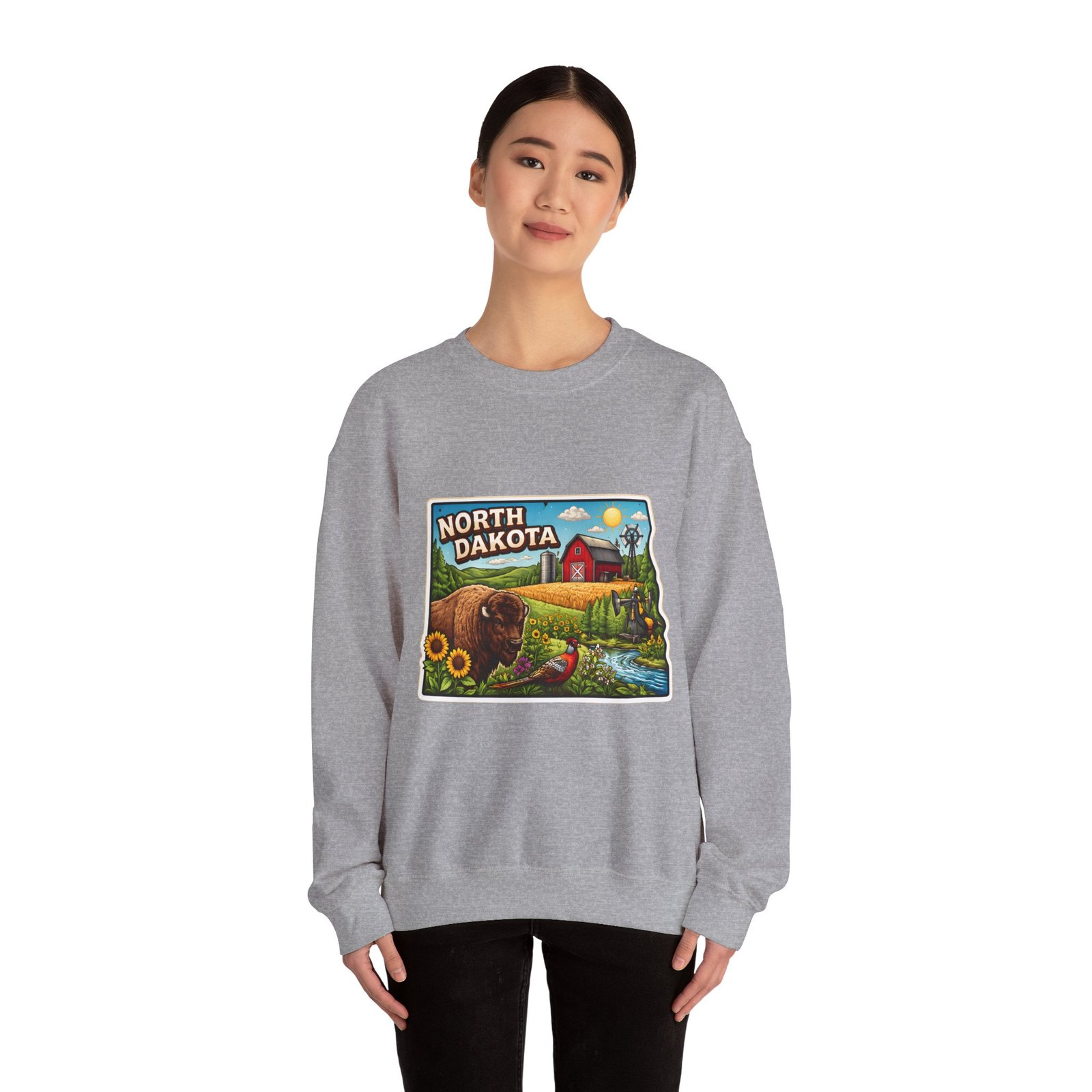This cozy crew sweatshirt brings a warm, small-town summer to your everyday rotation. The front artwork reads “North Dakota” and unfolds like a postcard: rolling wheat fields, a red barn, sunflowers, a winding river and a bison—rich colors on a clean white background. Wear it when you want a quiet, nostalgic moment—sipping coffee on a chilly morning, driving country roads, or layering for an evening bonfire. The weight and knit give it structure without feeling stiff; the embroidered options and neat ribbed collar keep the look elevated while staying comfortably lived-in. It’s the kind of sweatshirt you reach for when you want to feel grounded in place and memory.