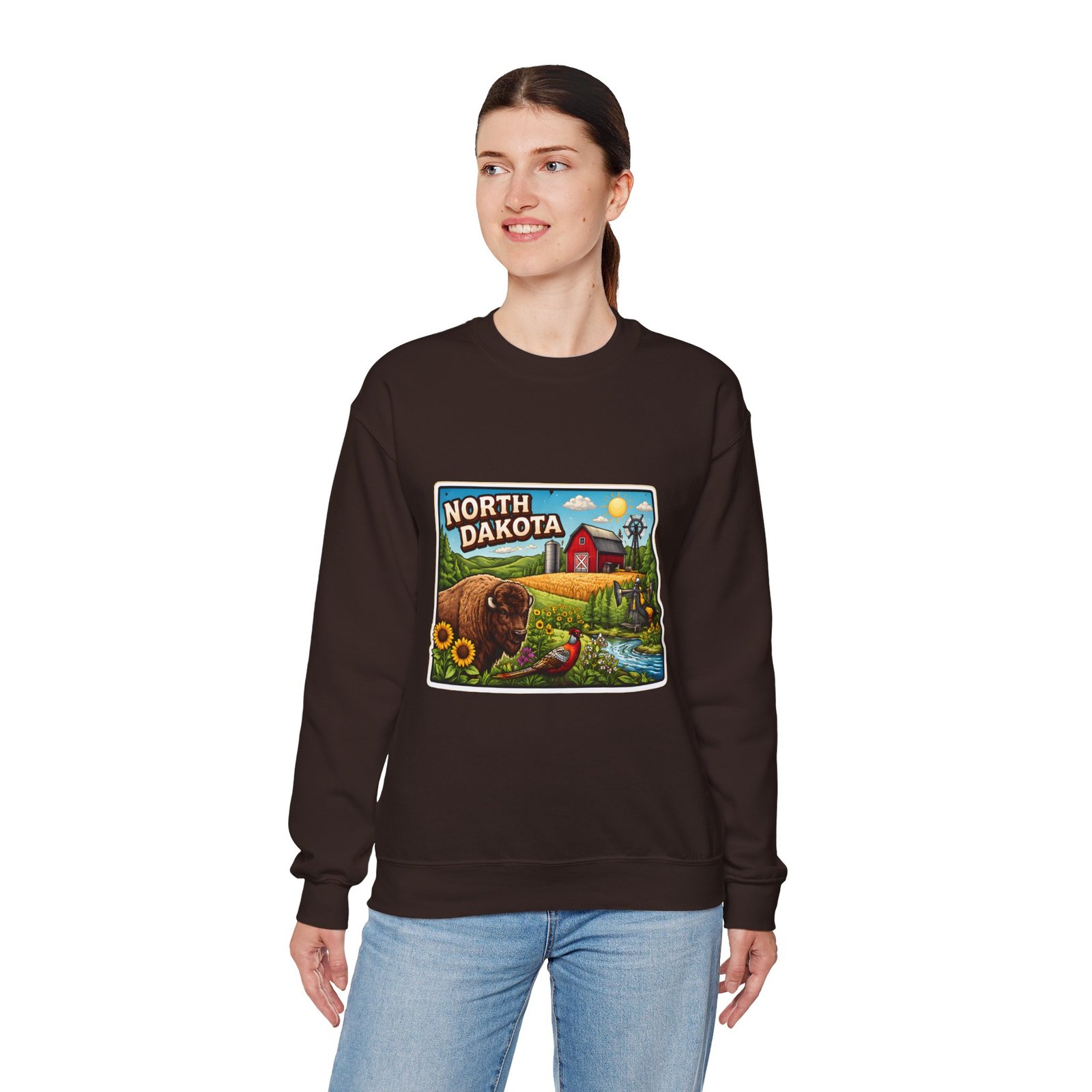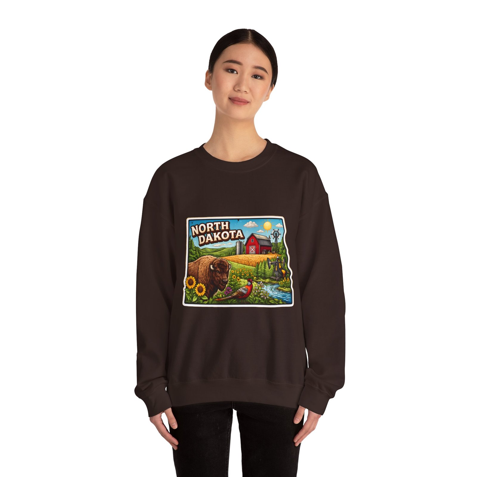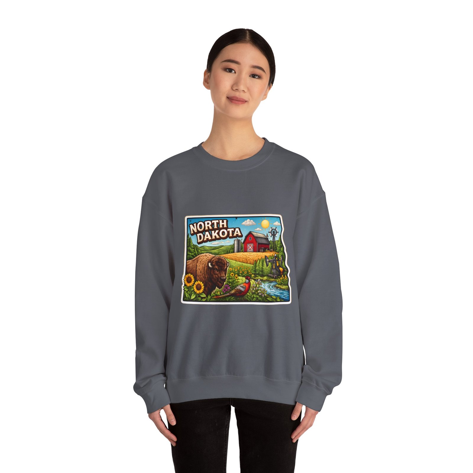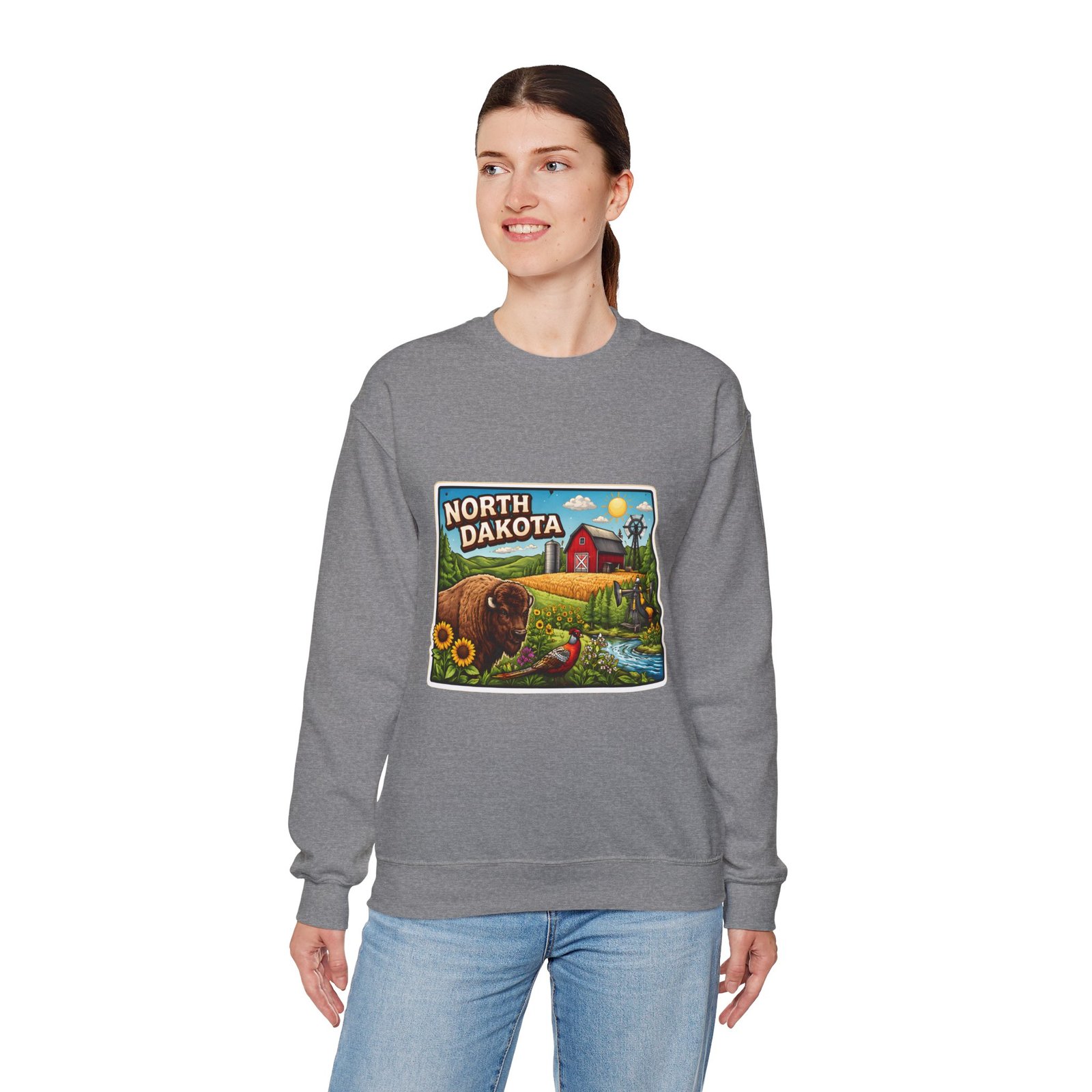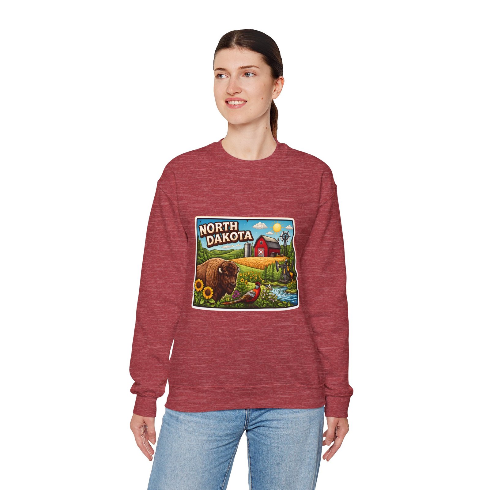 This cozy crew sweatshirt brings a warm, small-town summer to your everyday rotation. The front artwork reads “North Dakota” and unfolds like a postcard: rolling wheat fields, a red barn, sunflowers, a winding river and a bison—rich colors on a clean white background. Wear it when you want a quiet, nostalgic moment—sipping coffee on a chilly morning, driving country roads, or layering for an evening bonfire. The weight and knit give it structure without feeling stiff; the embroidered options and neat ribbed collar keep the look elevated while staying comfortably lived-in. It’s the kind of sweatshirt you reach for when you want to feel grounded in place and memory.